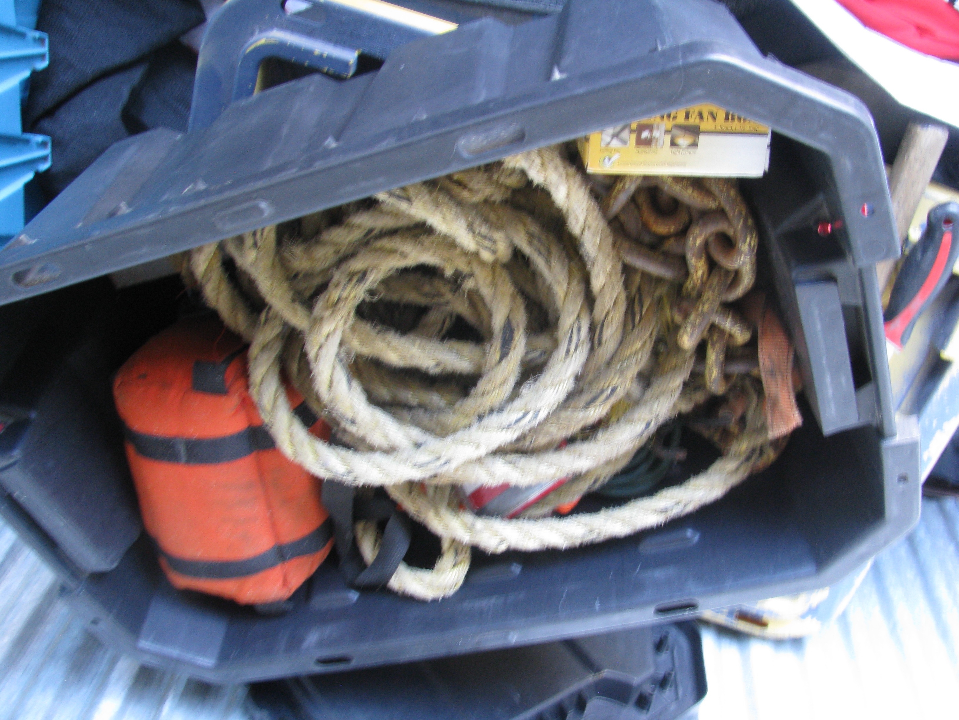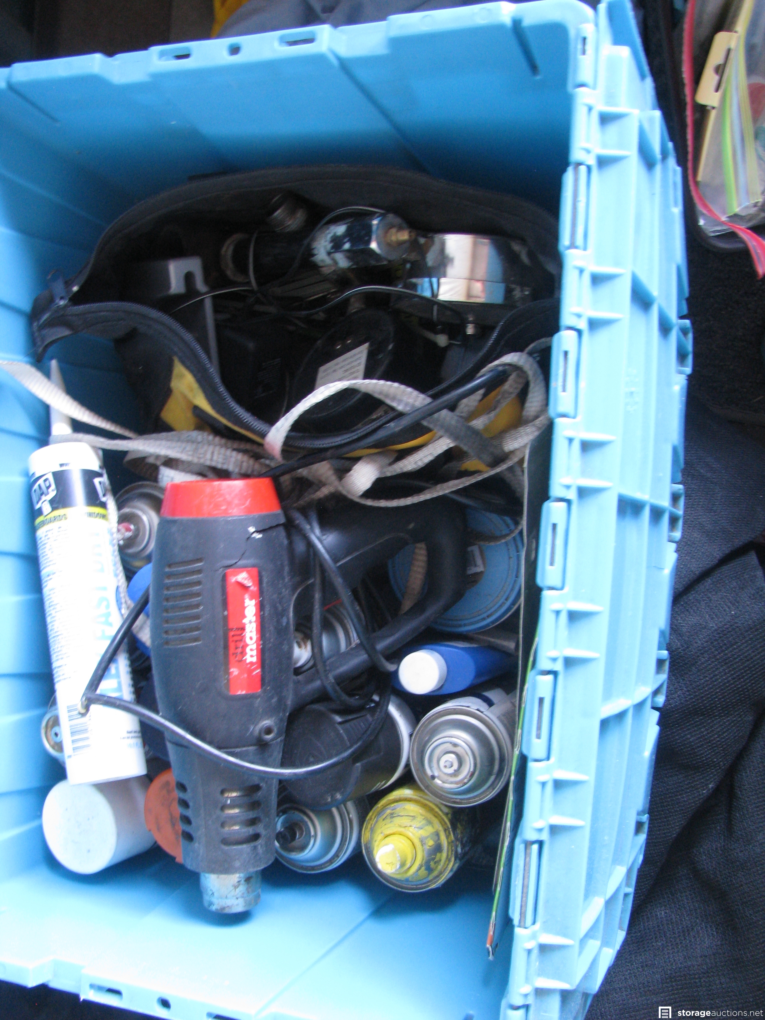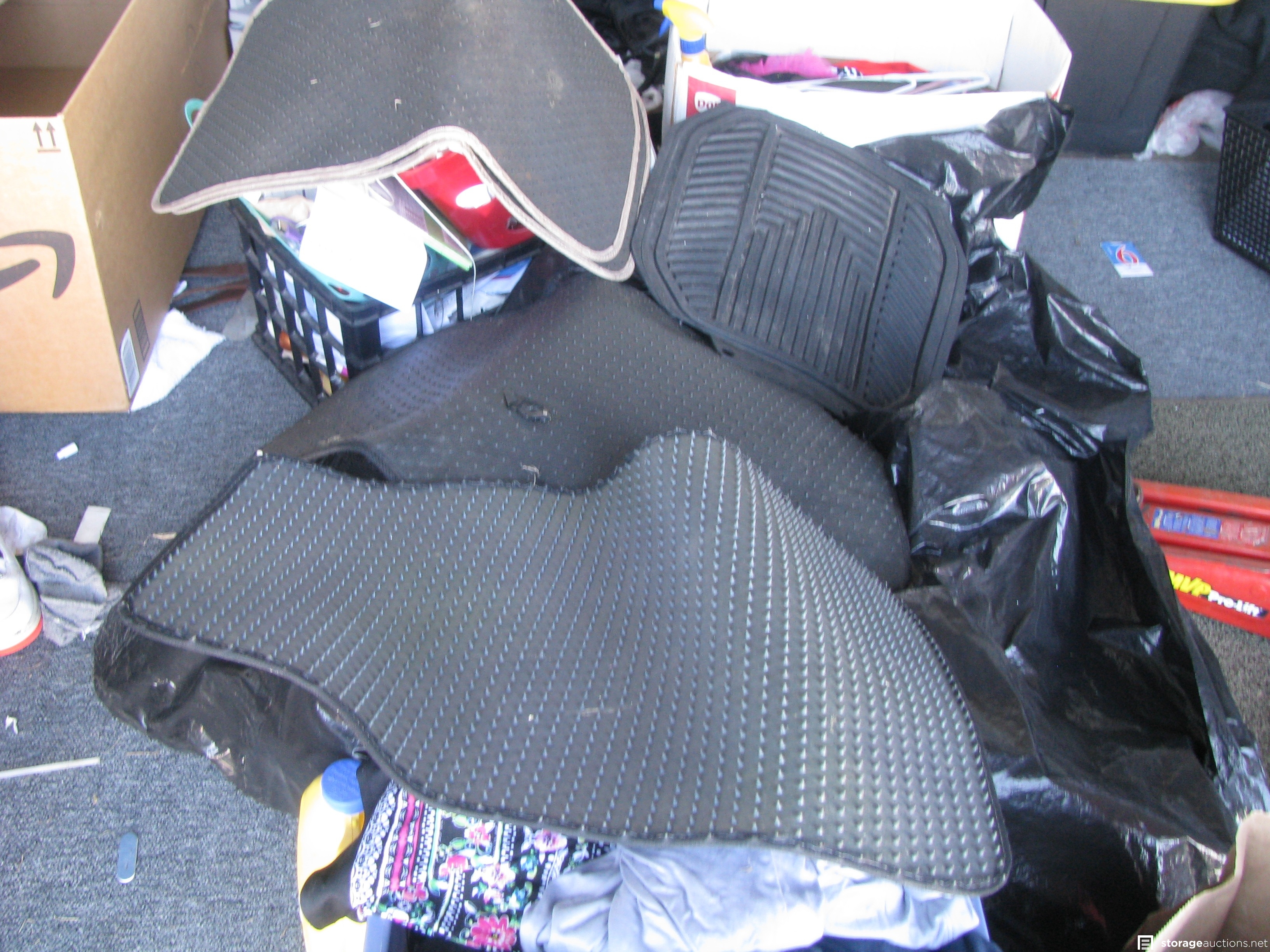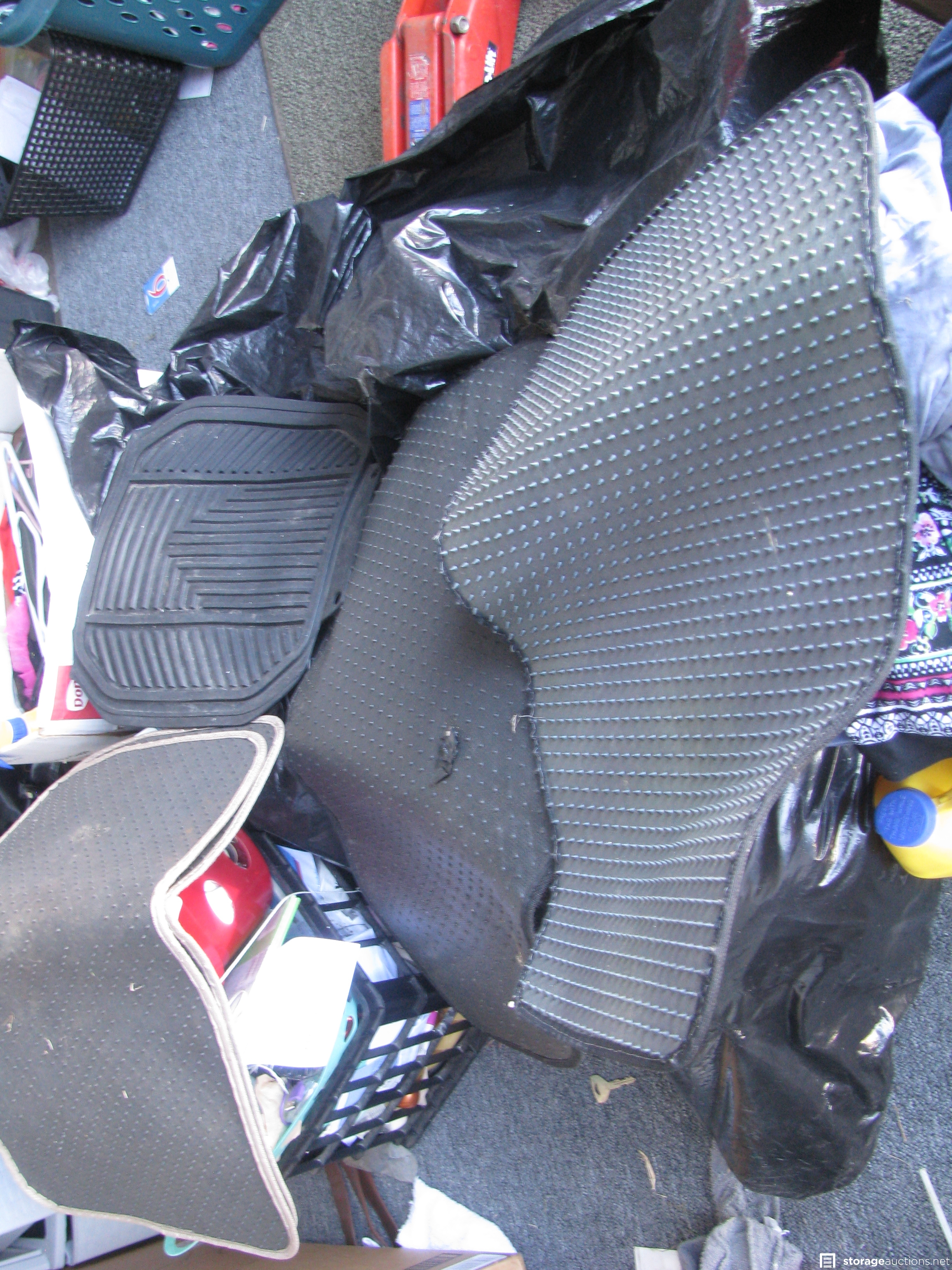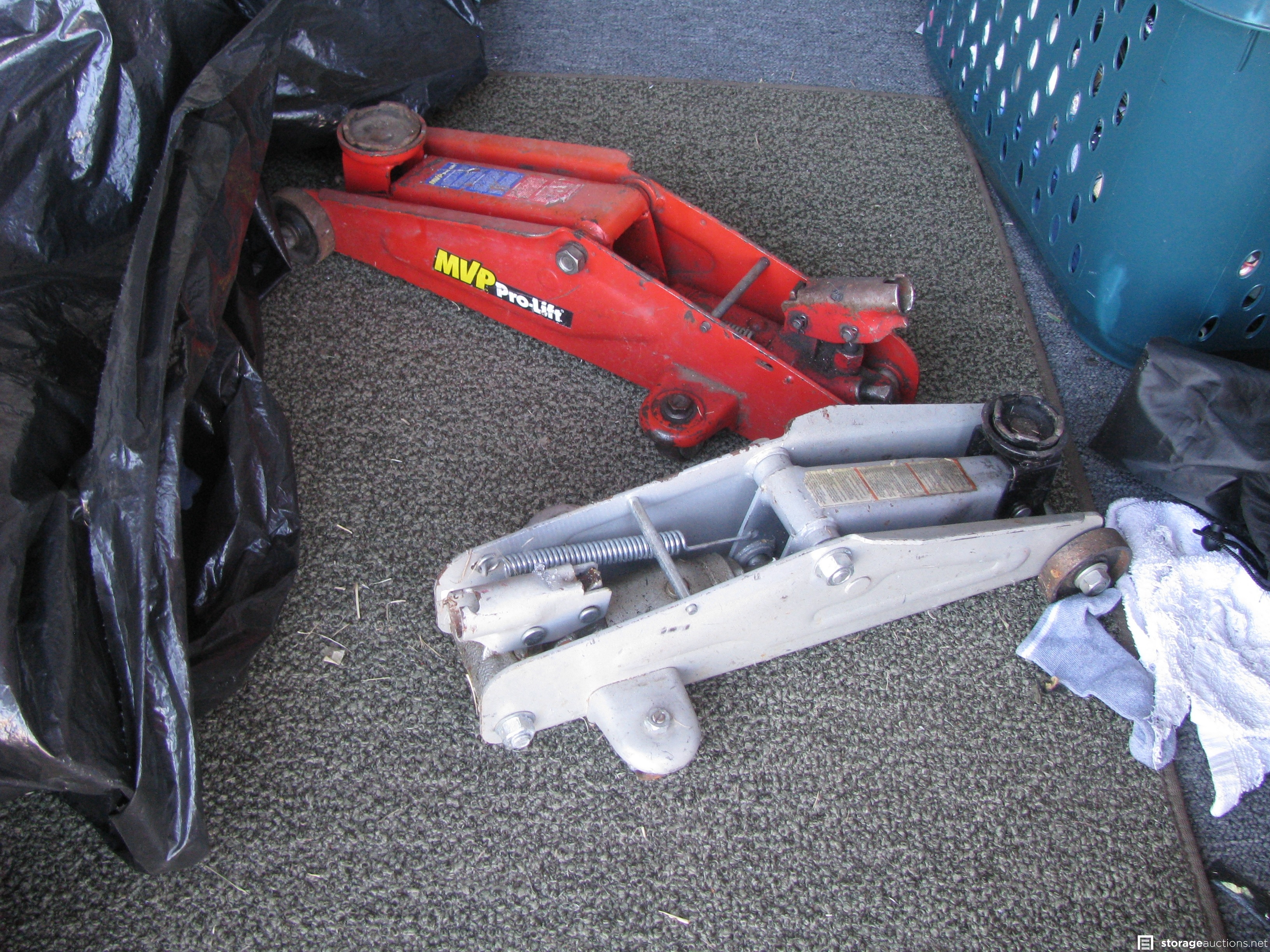 Tow chain, sledge hammer, tools, 2 hydraulic jacks, clothes, towels, auto floor mats, 2 blood pressure monitors.
