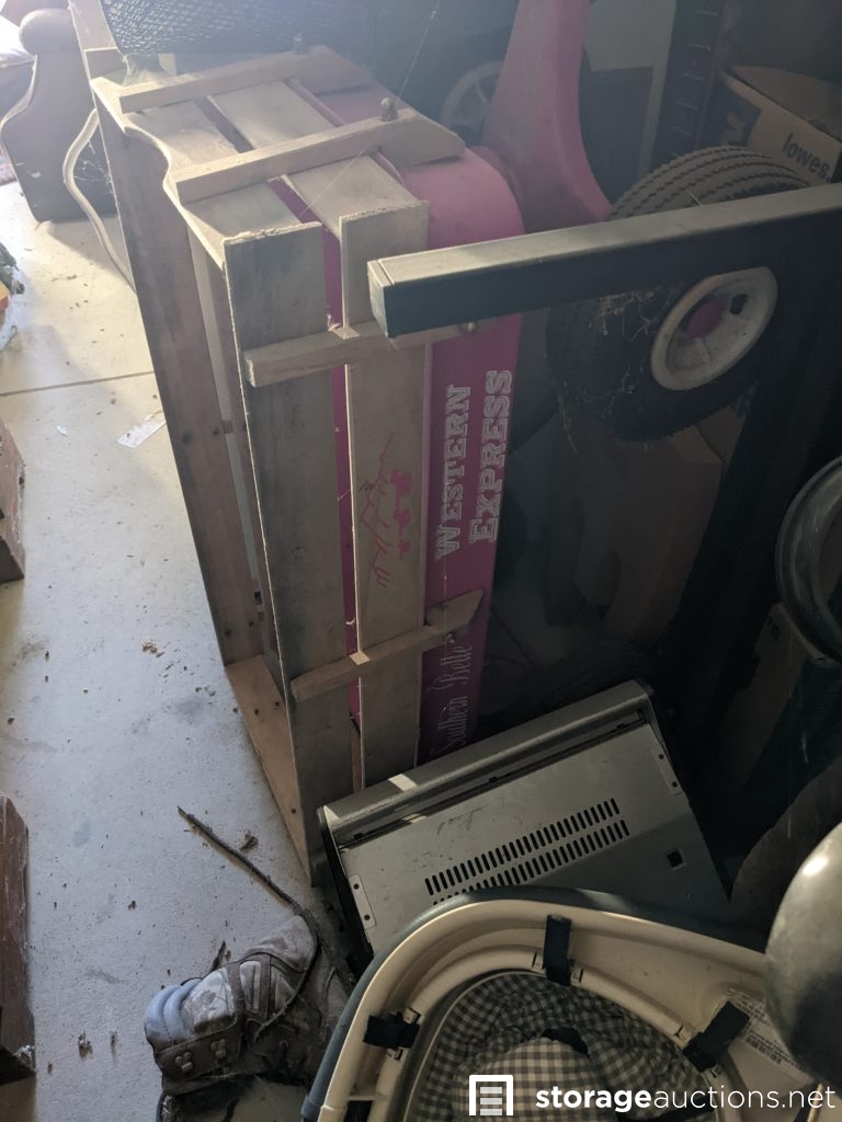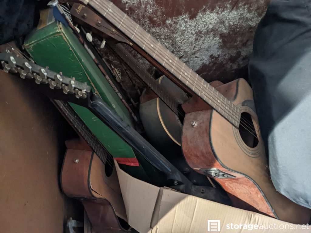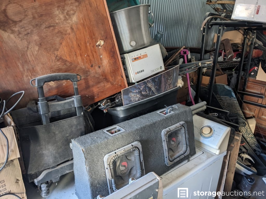 Speakers, xbox, shovel, watering cans, sleds, boxes of household items, wagon, motor bike parts, arrows, guitars, lamp, gun case, entertainment center, bike helmet, washer and dryer, latter. Tag# 7247934