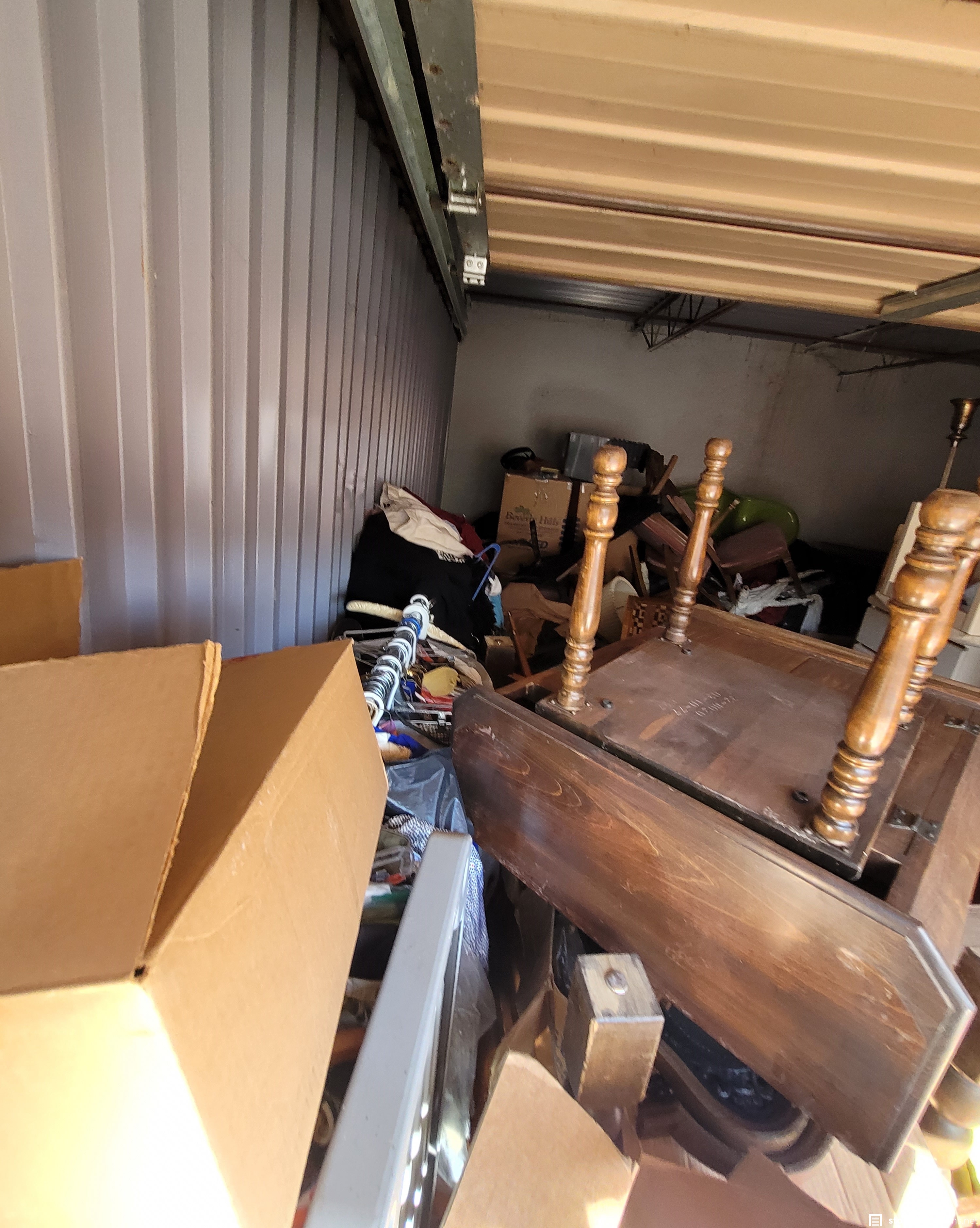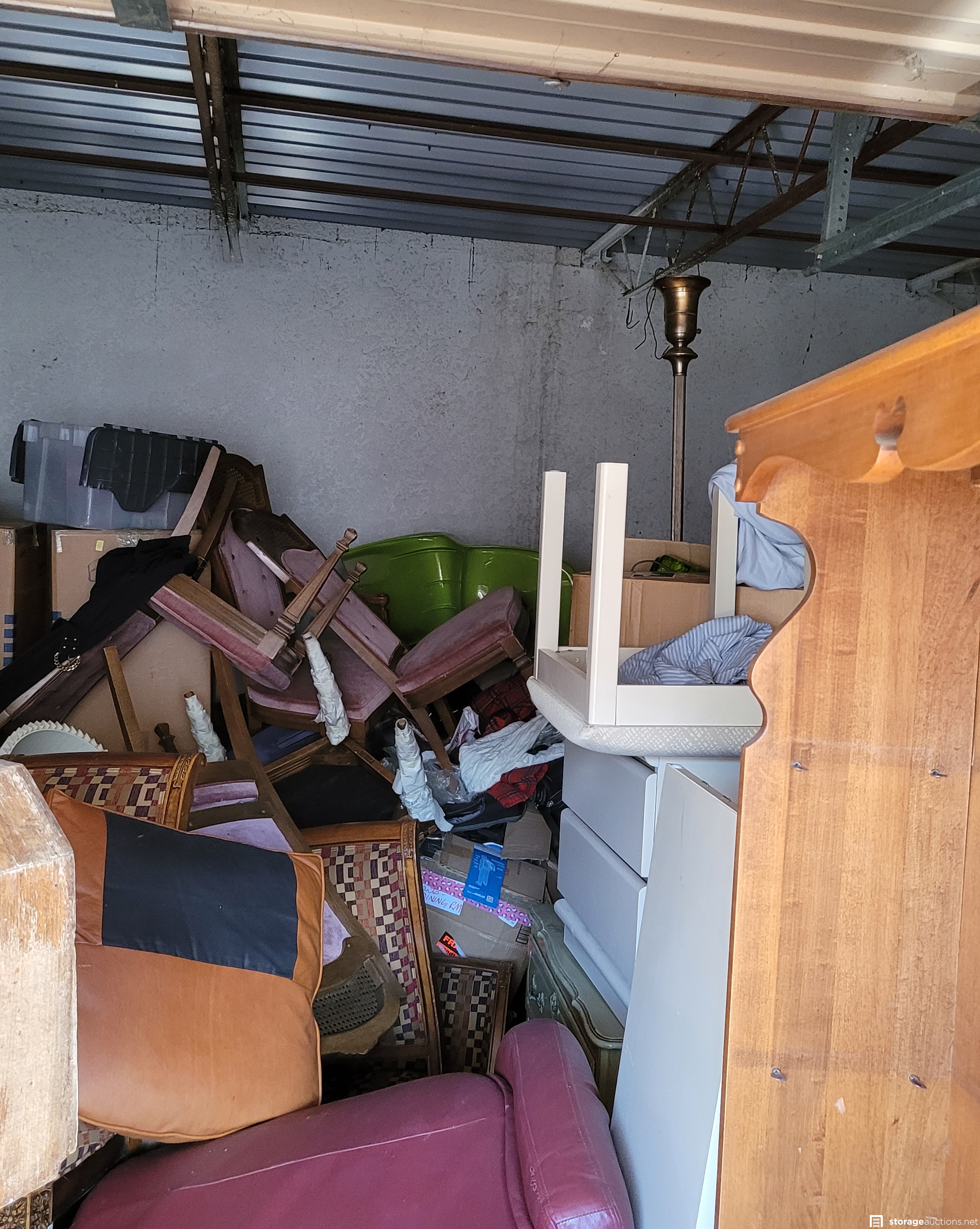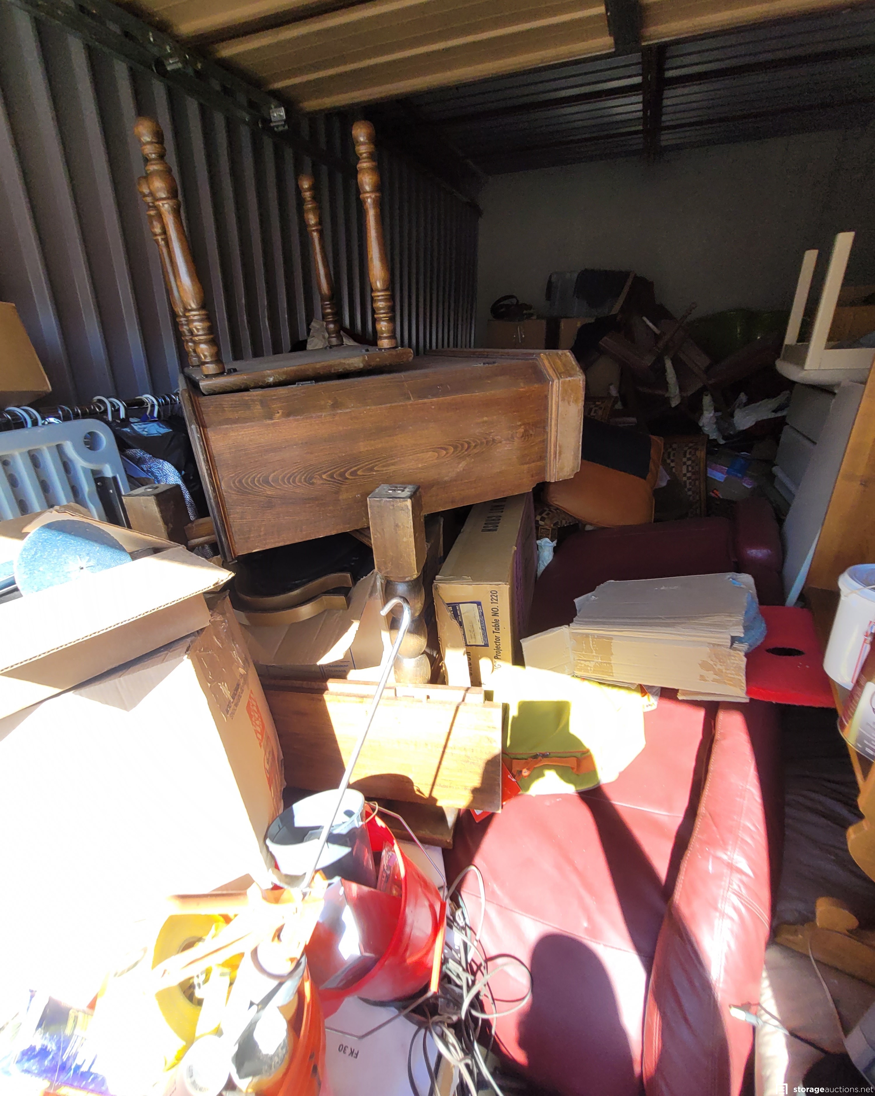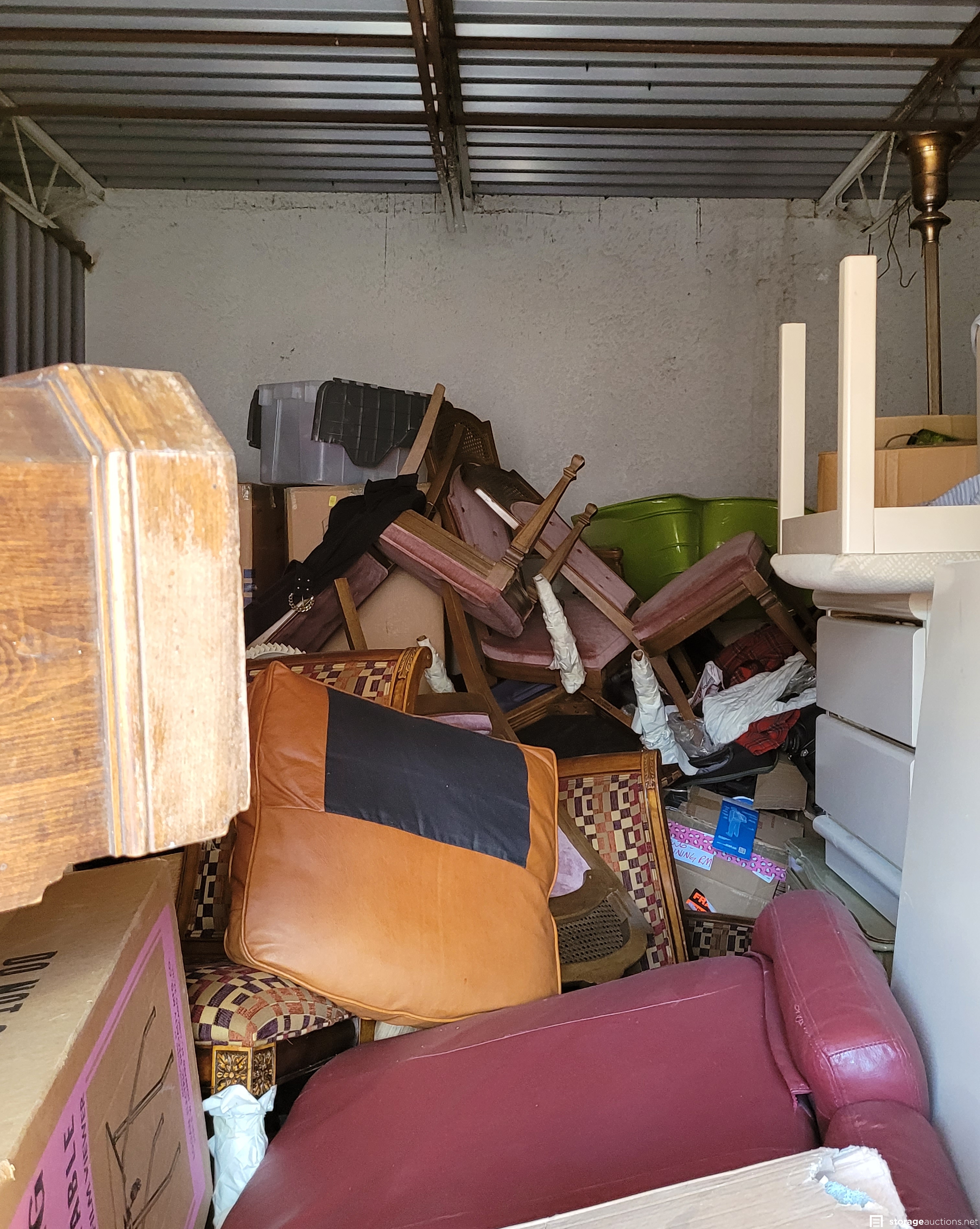 racks of clothing, many unopened tubs, boxes and bags, many suitcases and backpacks, furniture