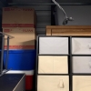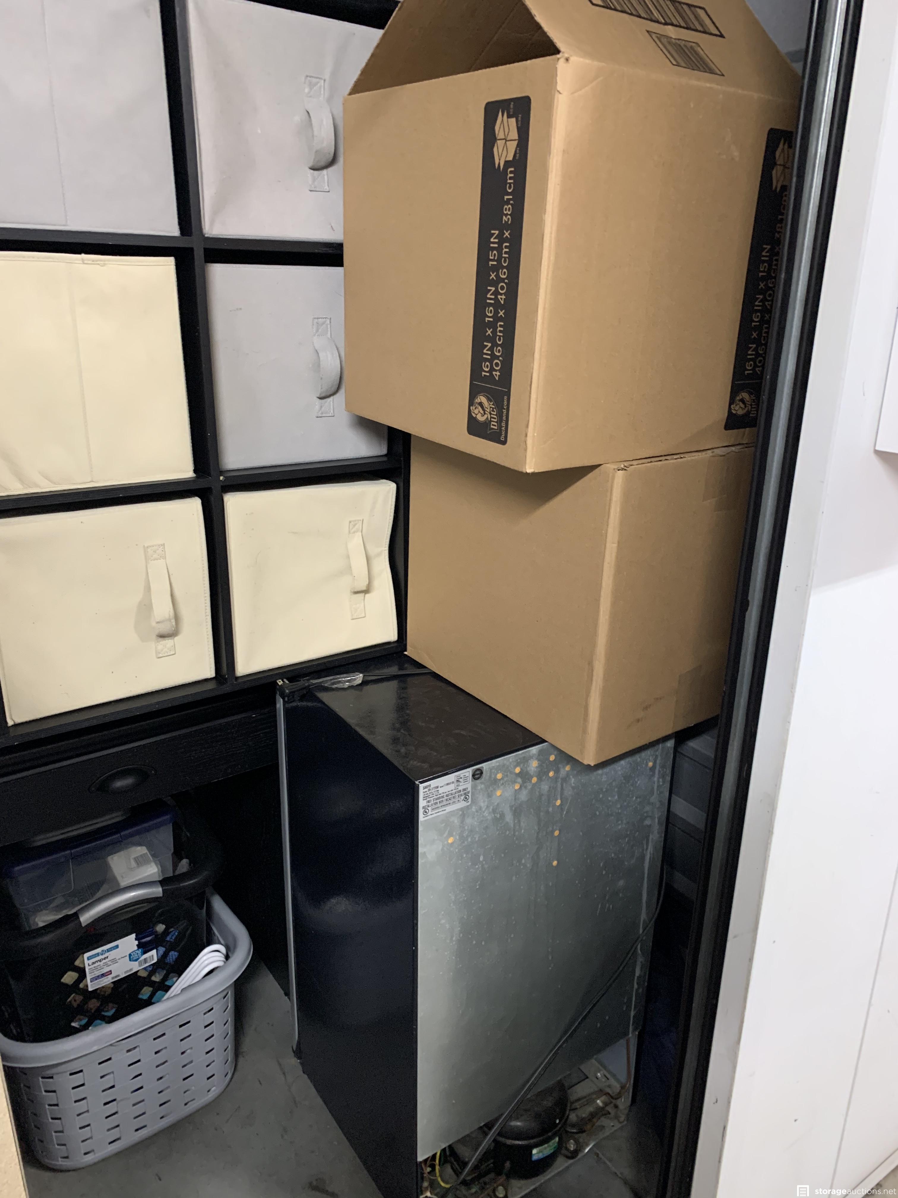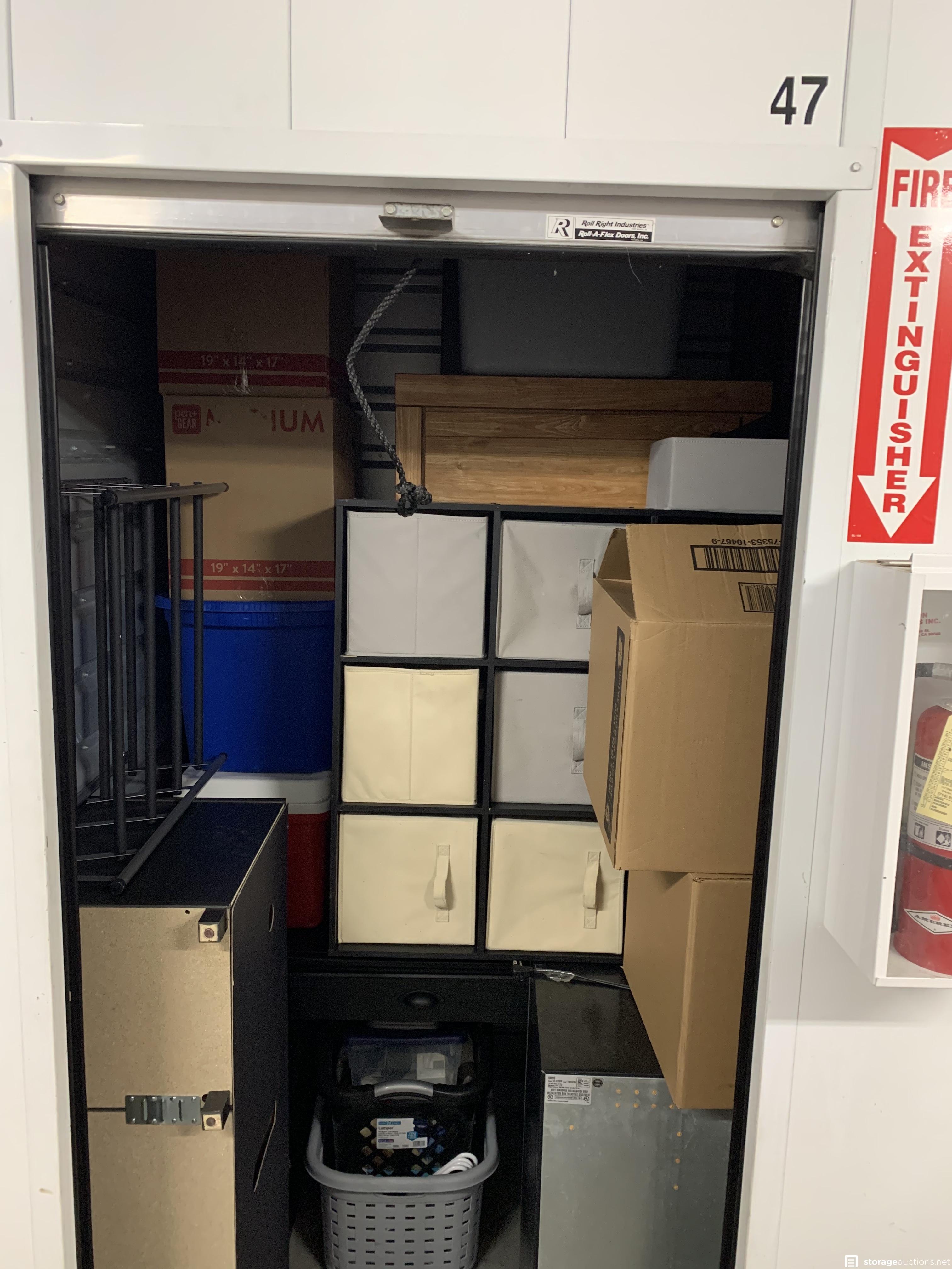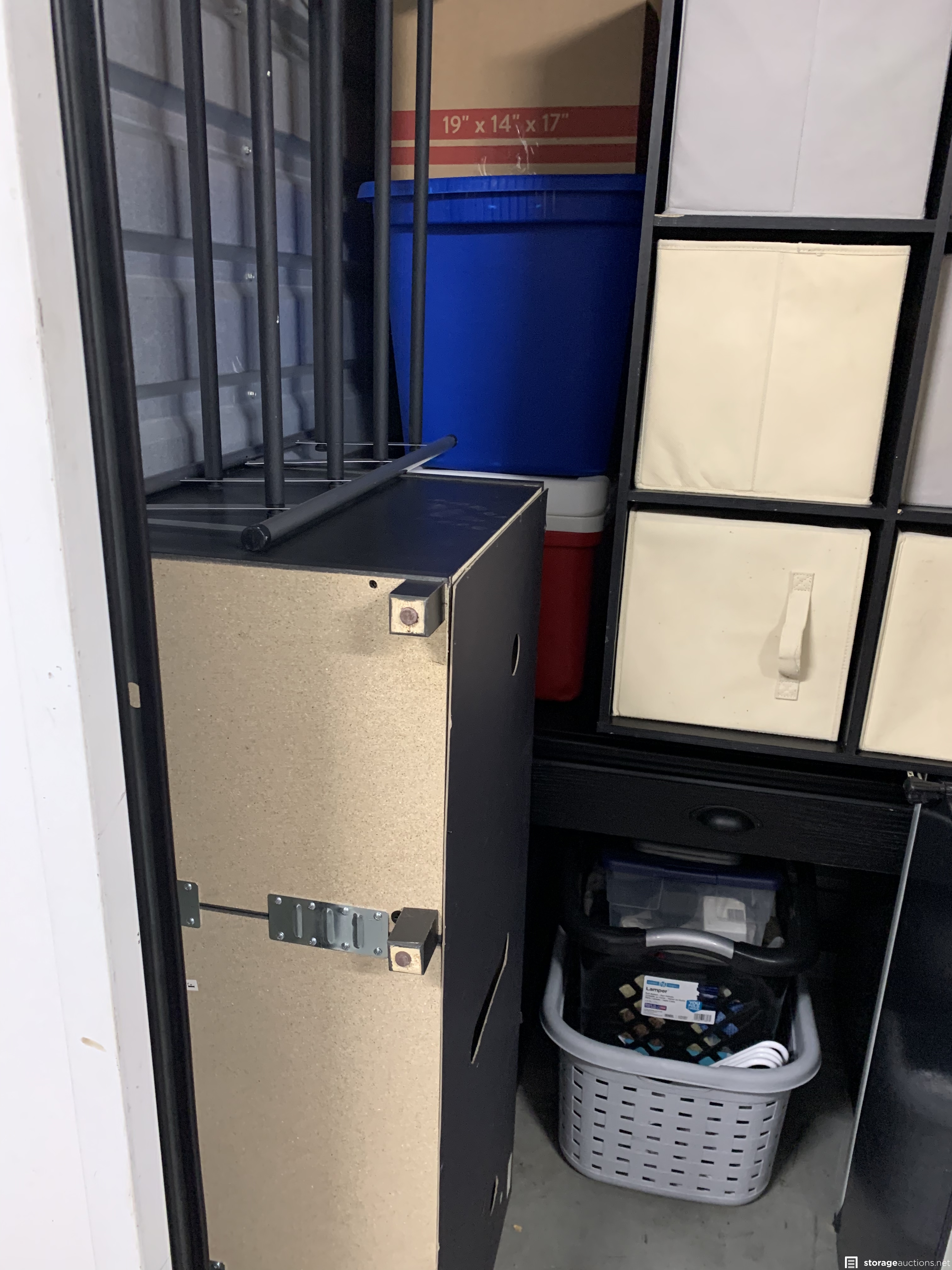 Boxes, plastic crates, storage bins, laundry baskets & cooler contents unknown. Shoe rack, dressers, desk & small fridge.