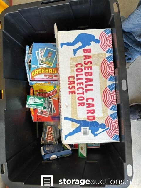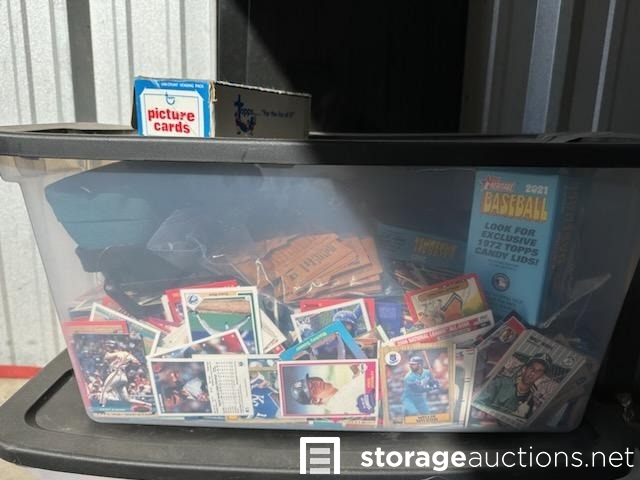 THERE ARE 3 TOTES OF BASEBALL CARDS, A LADDER, AND A TV STAND WITH GLASS SHELVES IN THIS UNIT