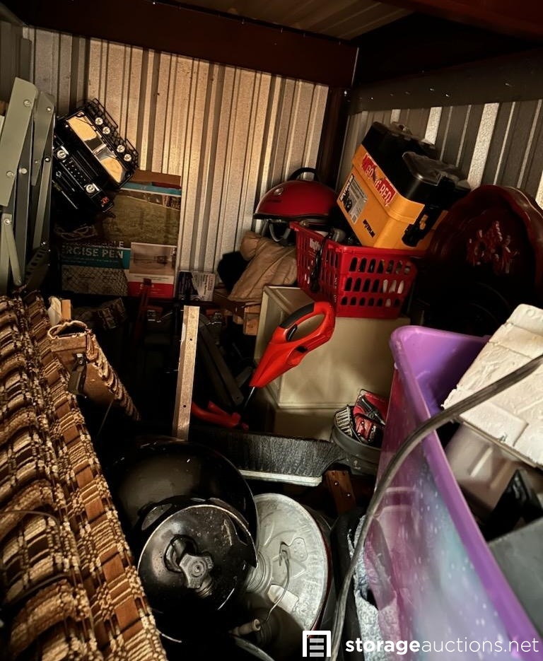 THIS UNIT APPEARS TO HAVE LOTS OF TOOLS, SHELF, AIR COMPRESSOR AND TOTES