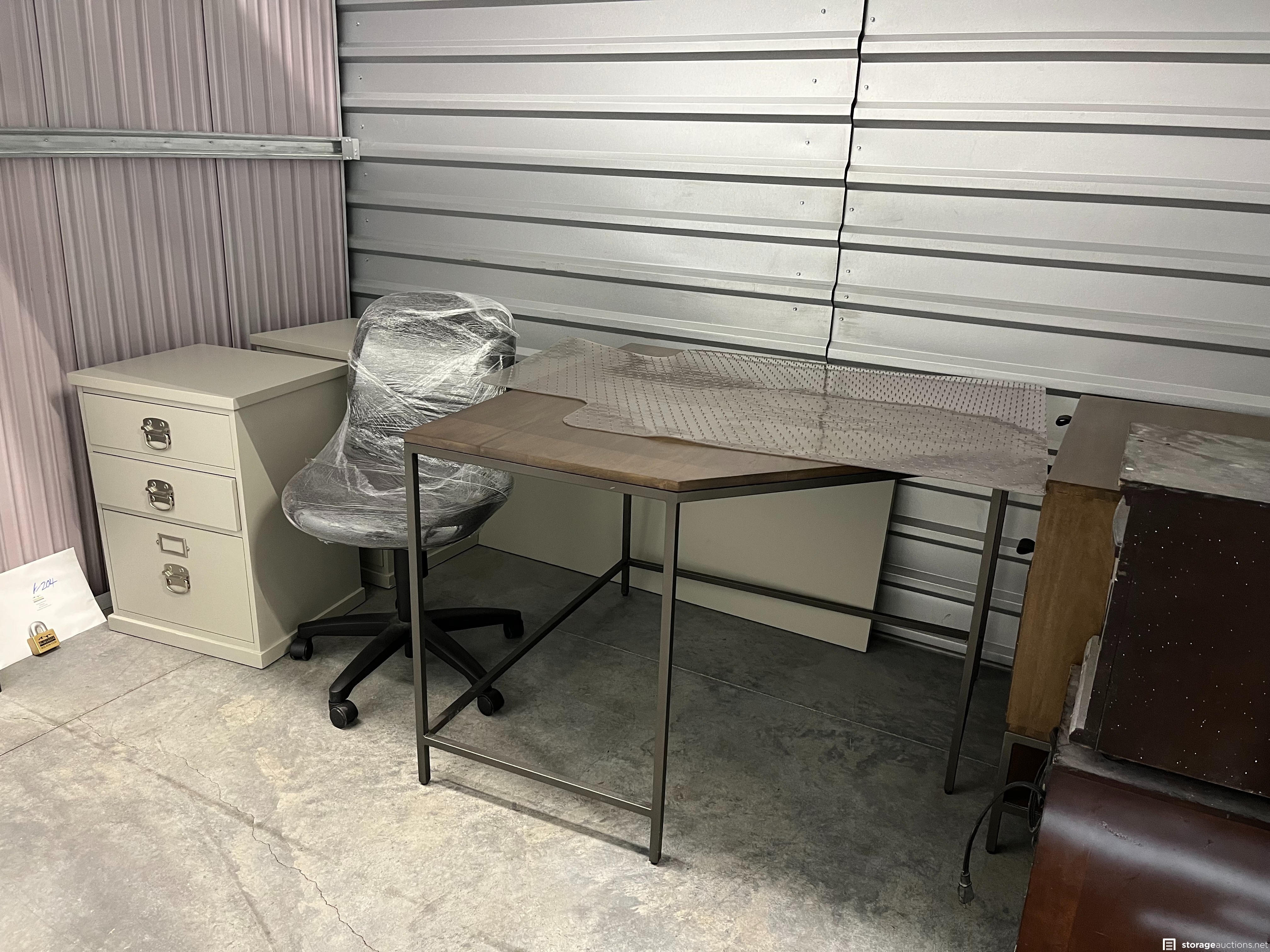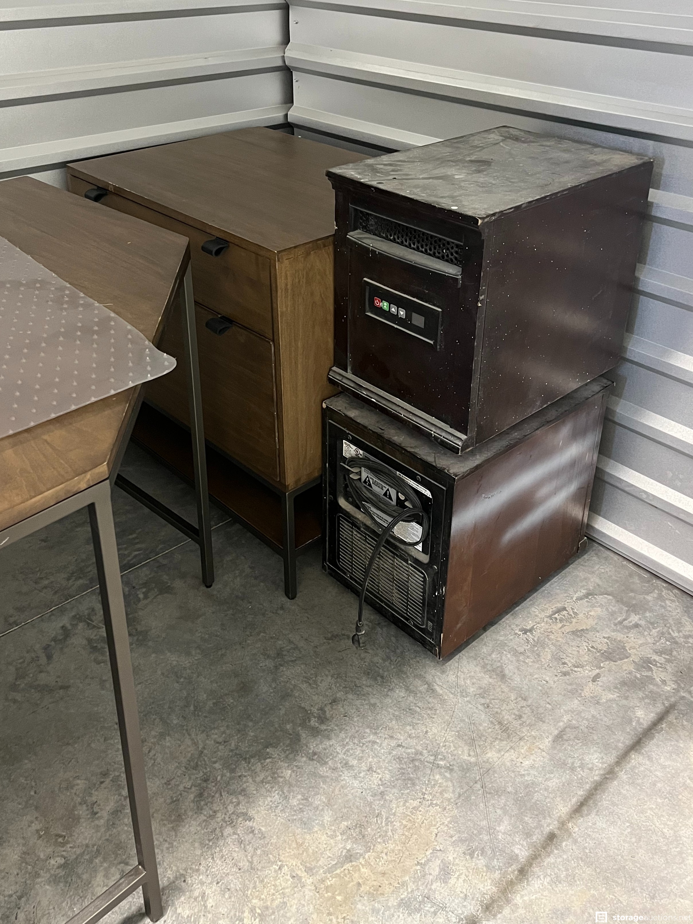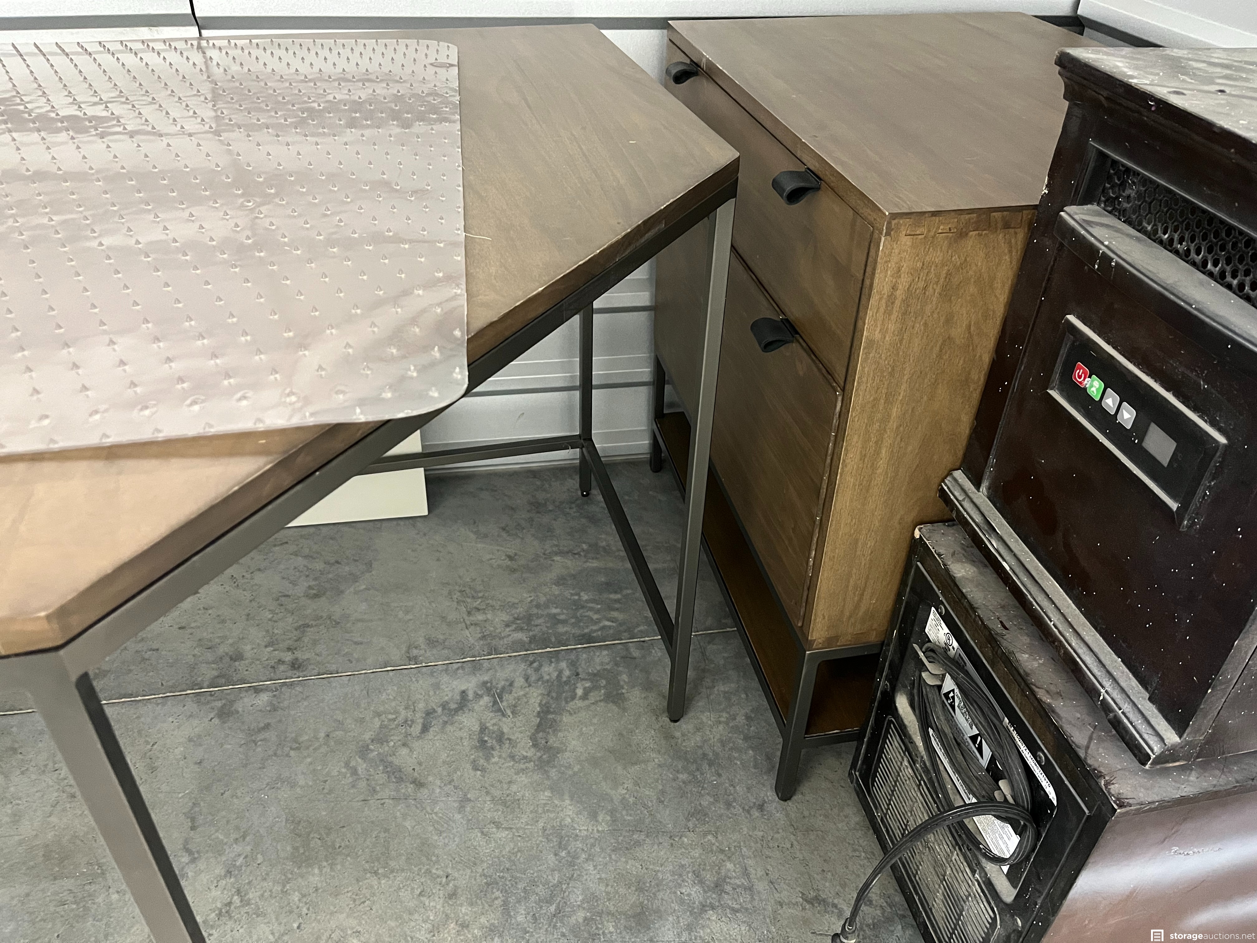 Office desk with file cabinet and drawers (cream), office desk with drawers (brown), office chair, floor mat, 2 commercial heaters. This is a donation unit and 100% of the proceeds will be donated to a local charity.