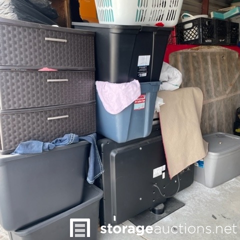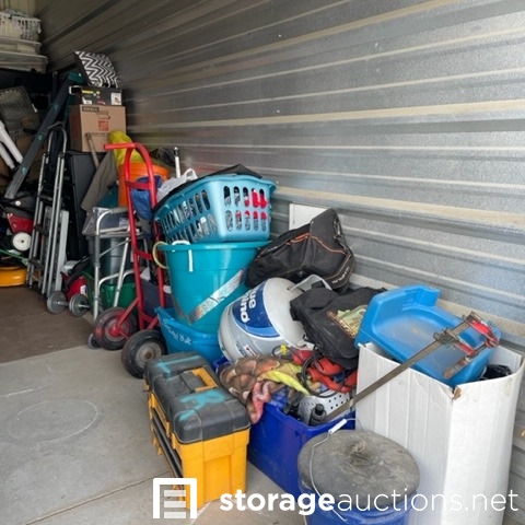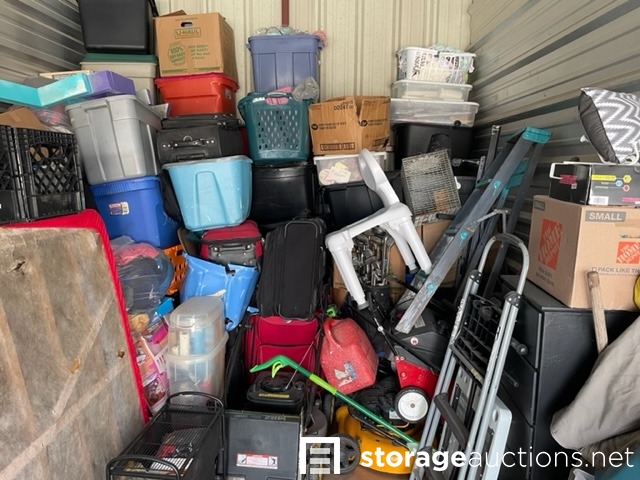THIS UNIT HAS LADDERS, LAWN MOWERS, GOLF CLUBS, SUITCASES, QUEEN BED AND HEADBOARD, SHOWER CHAIR, FILING CABINET, FLAT SCREEN TV'S, WOODEN SHELF, TOOLS, AND LOTS OF TOTES AND BOXES!