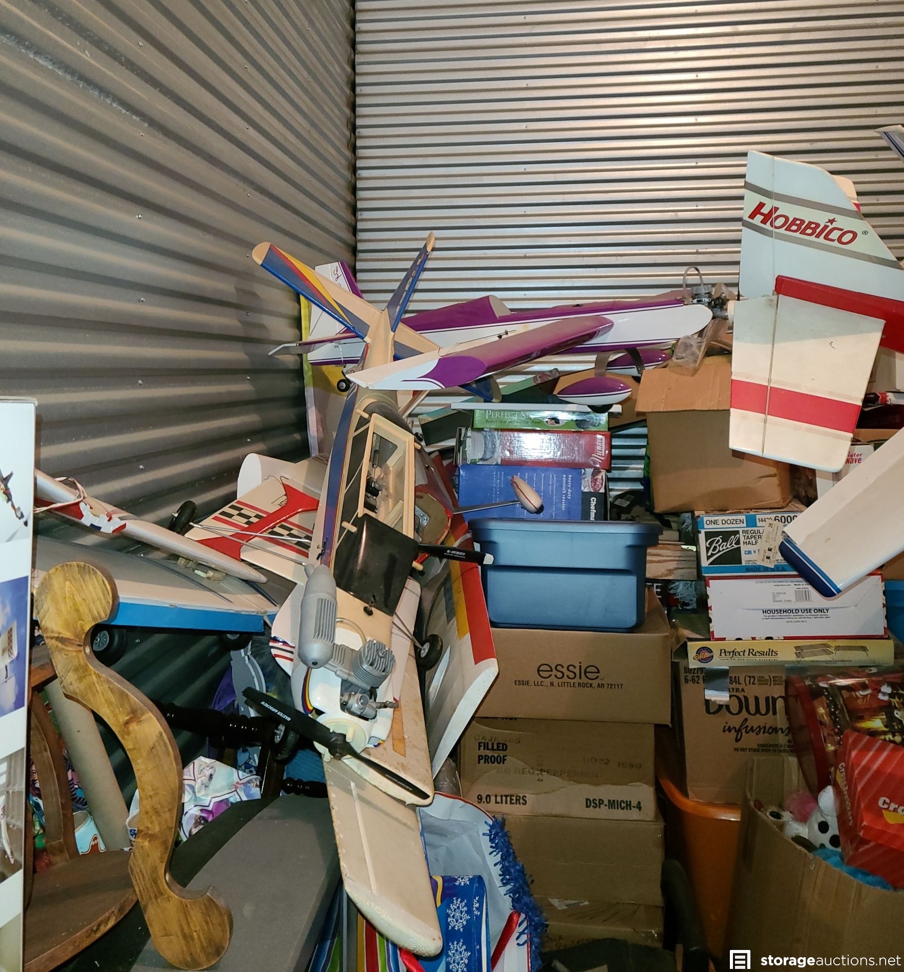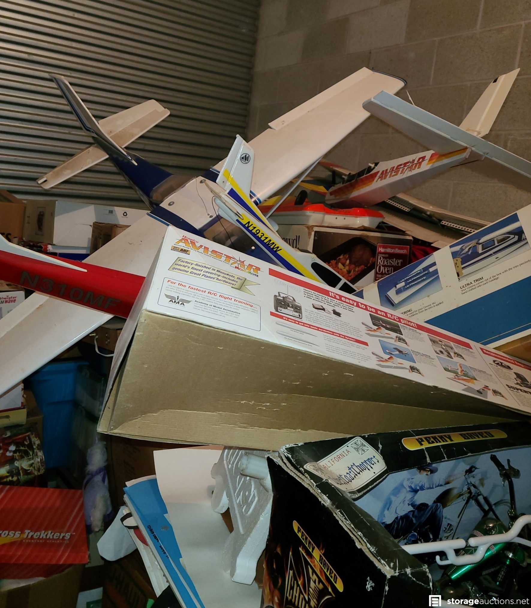 Flying model planes, model motorcycles, TV, bookshelves, desk, refrigerator, microwave, miscellaneous household items.