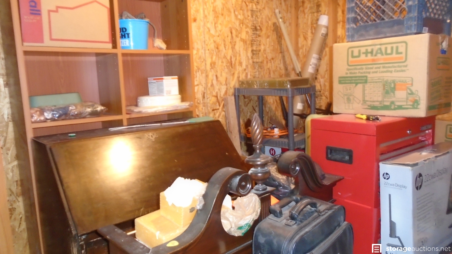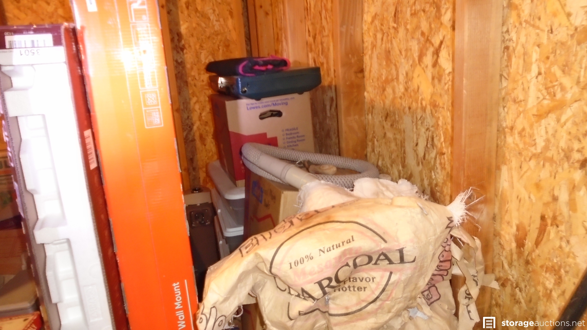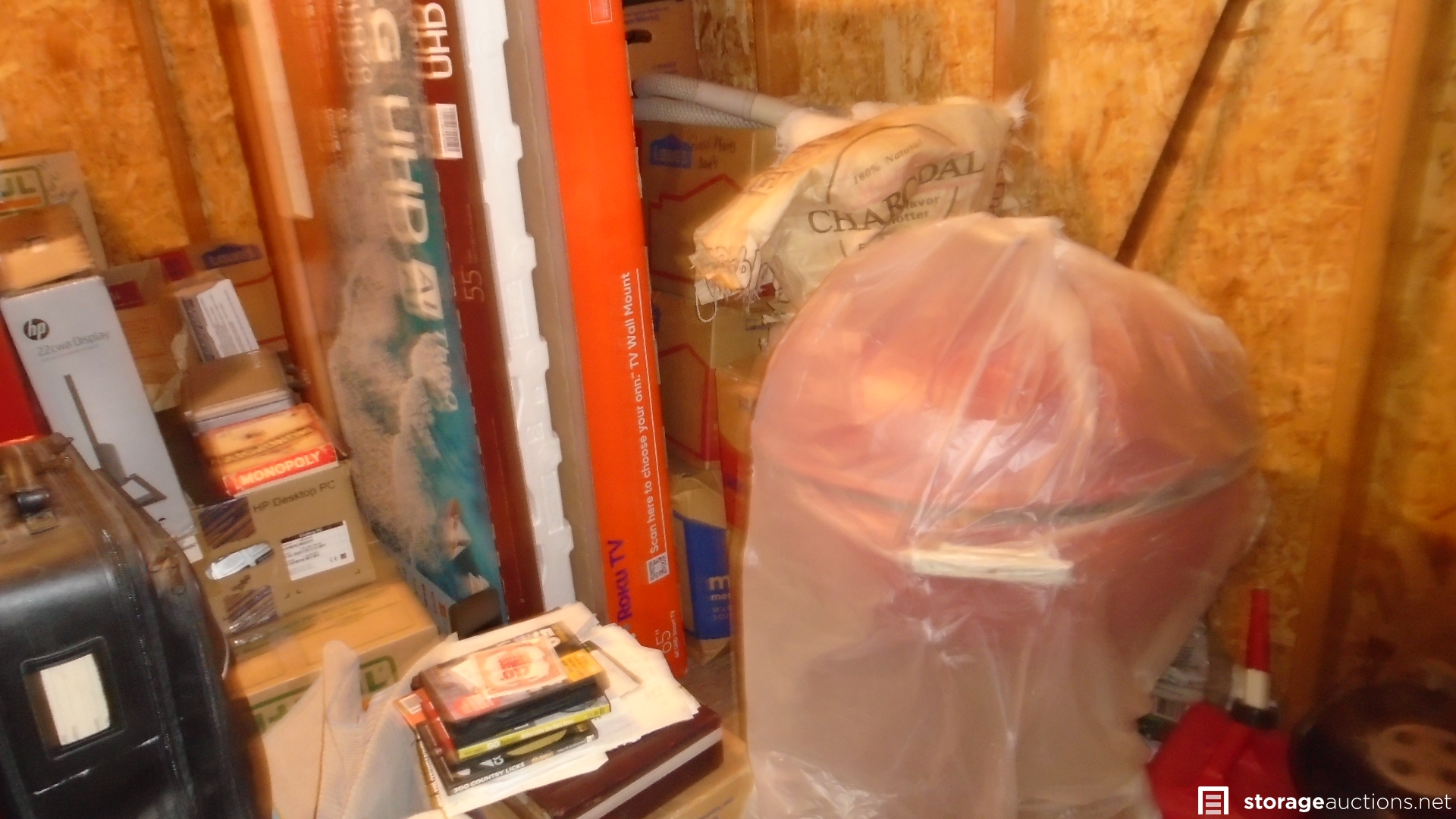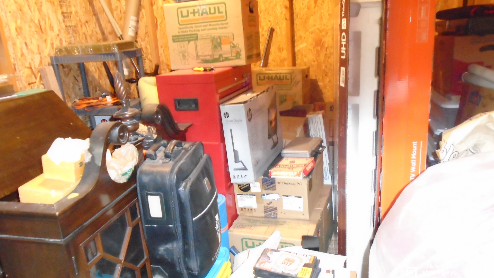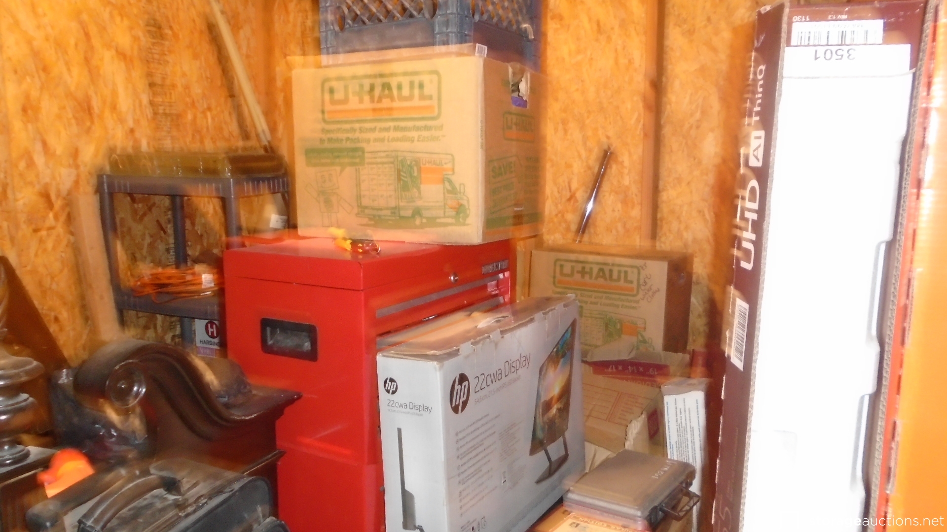 Unit apears to contain: Craftsman tool box, TVs, BBQs, China Hutch, shelves, vacuum, suitcase, gas cans, boxes