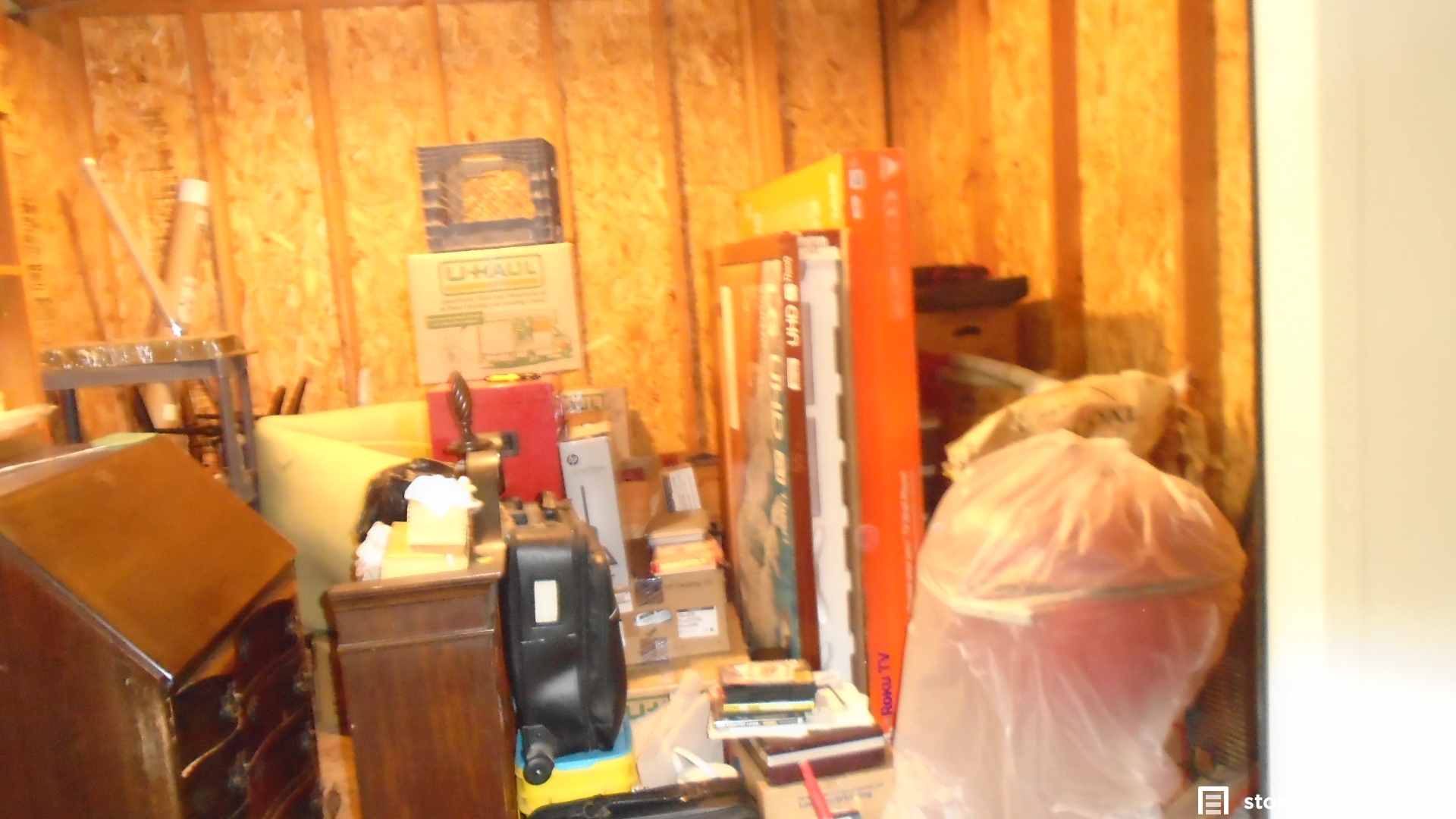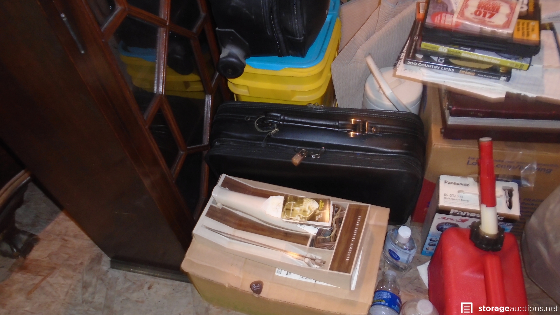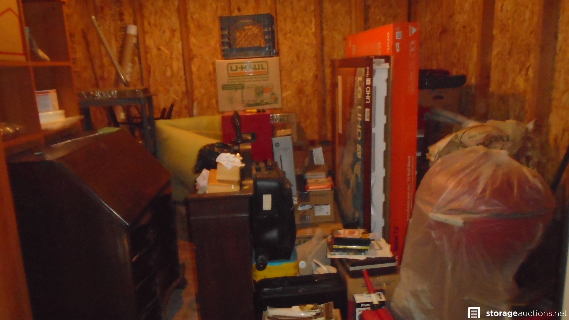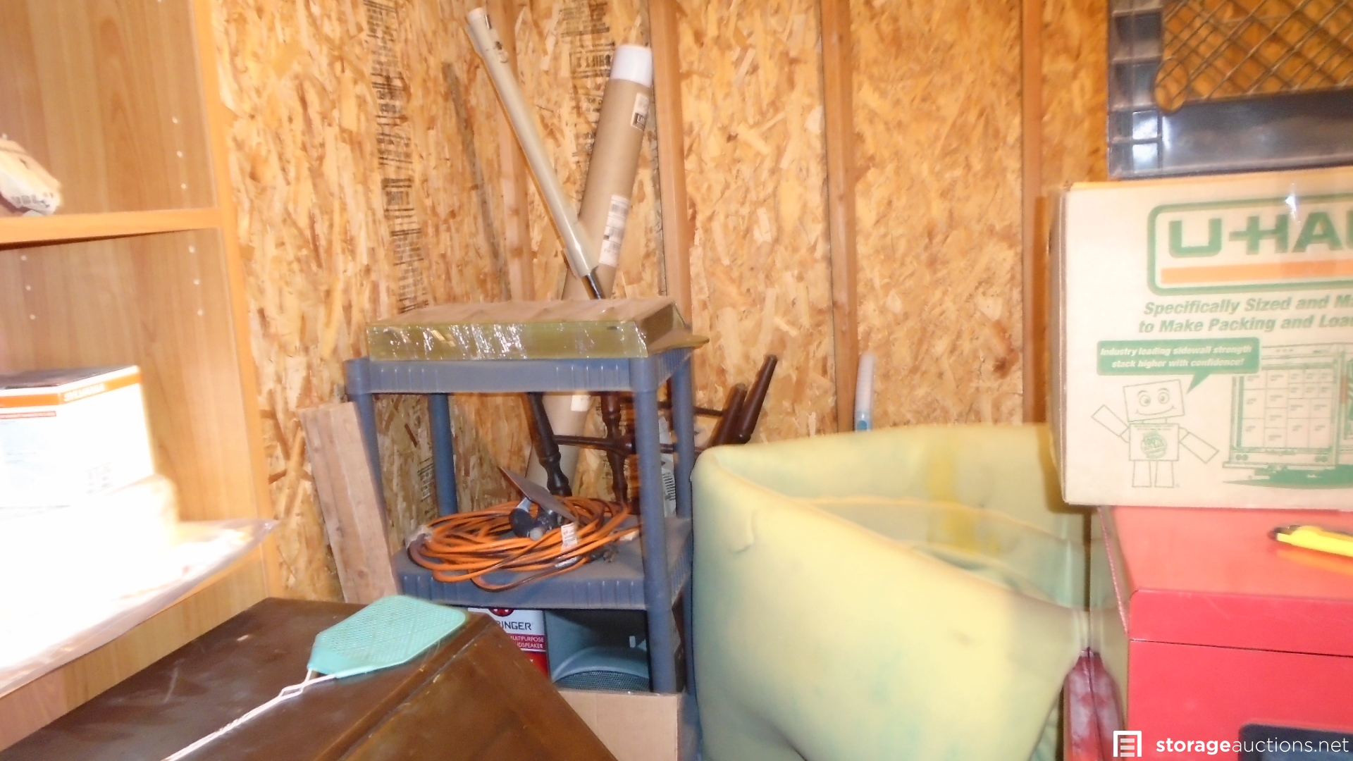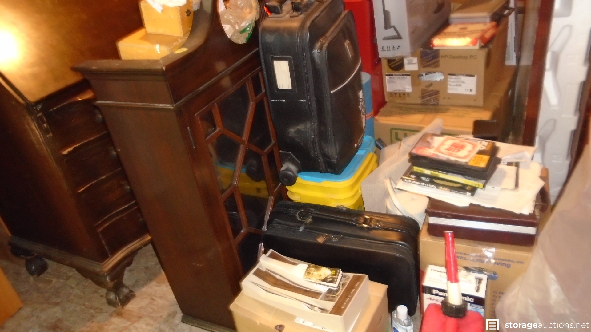 Unit apears to contain: Craftsman tool box, TVs, BBQs, China Hutch, shelves, vacuum, suitcase, gas cans, boxes