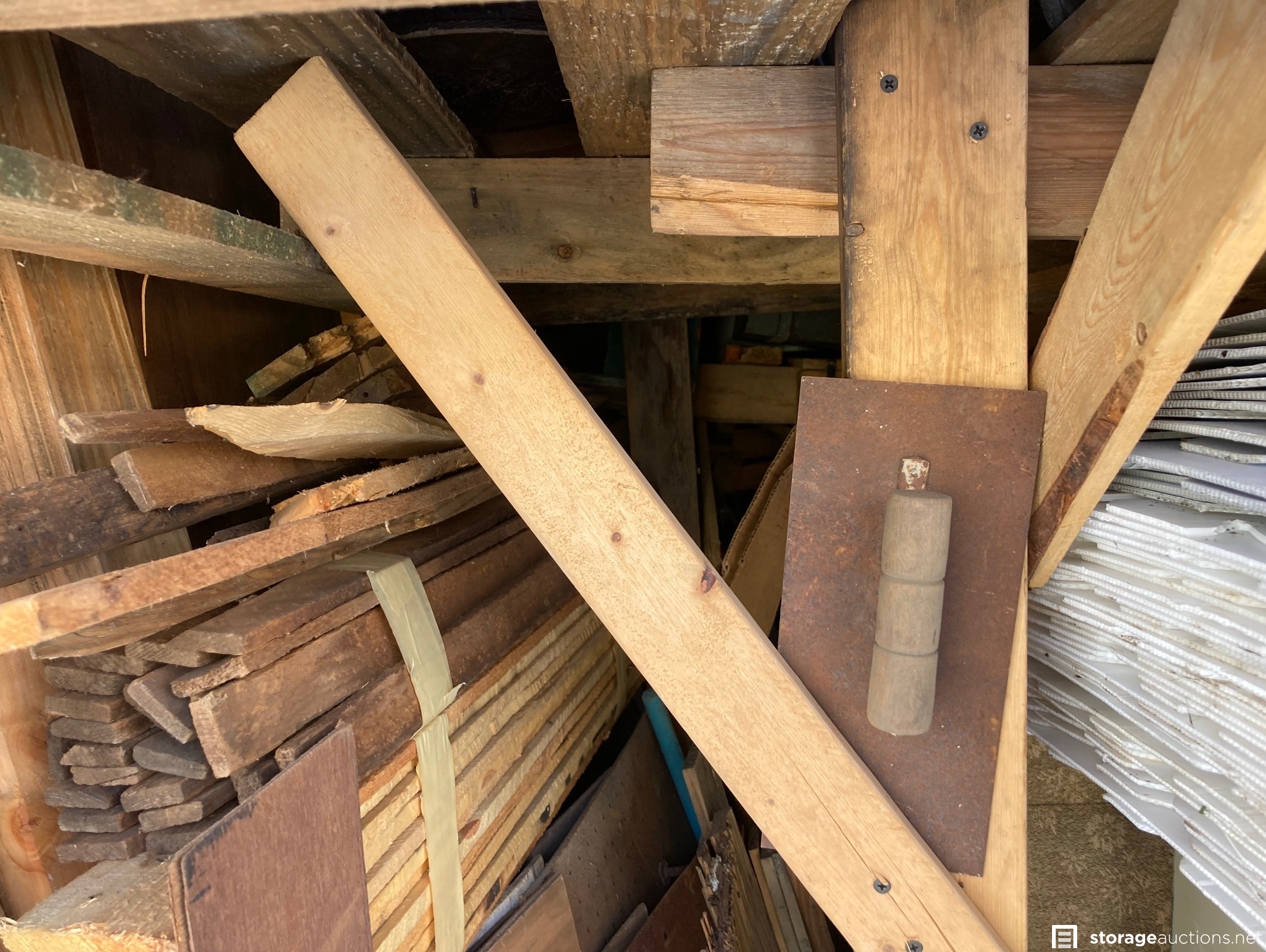 household items, office items, furniture, lumber, steel, file cabinets, foldable plastic totes, artificial plants, window blinds, and kitchen sink