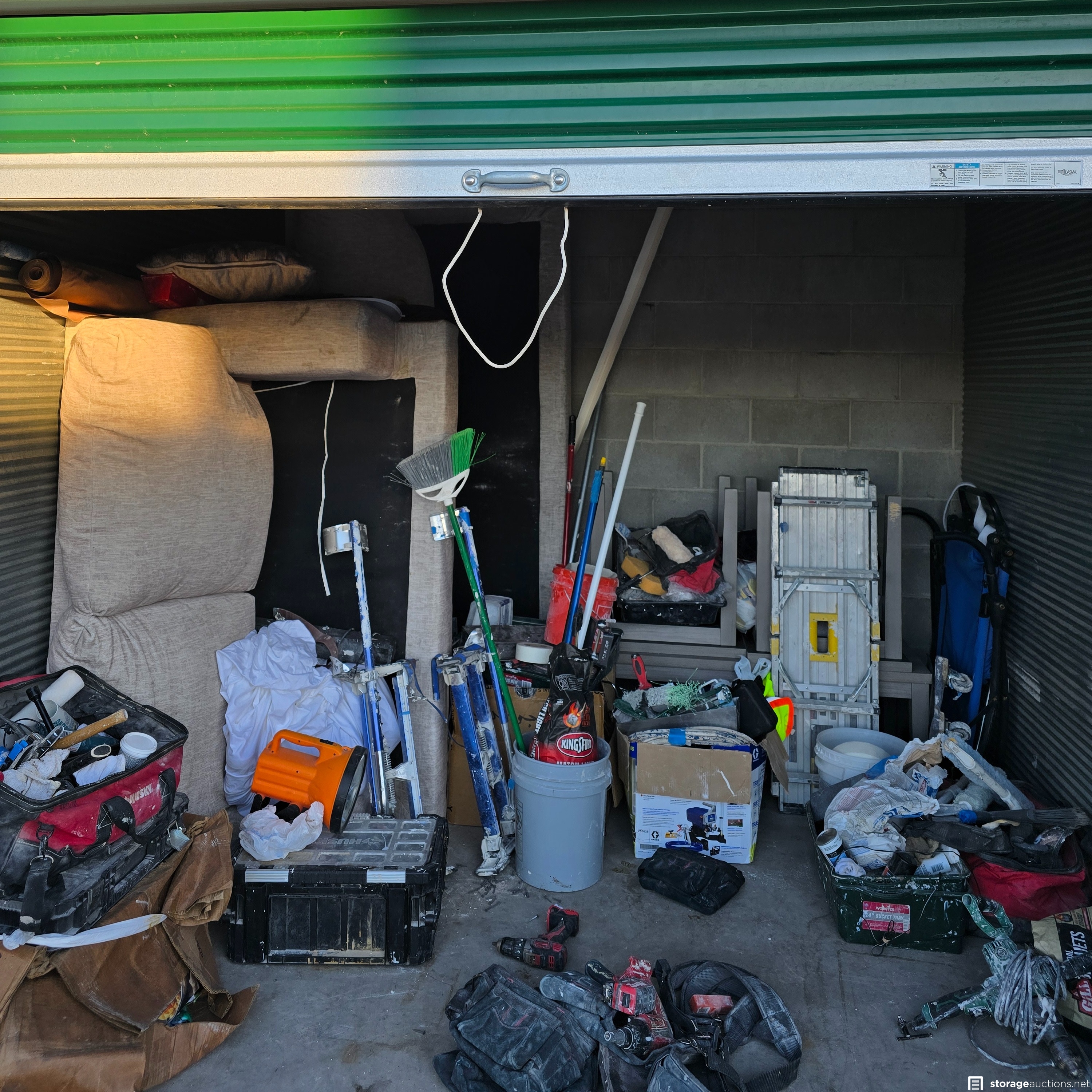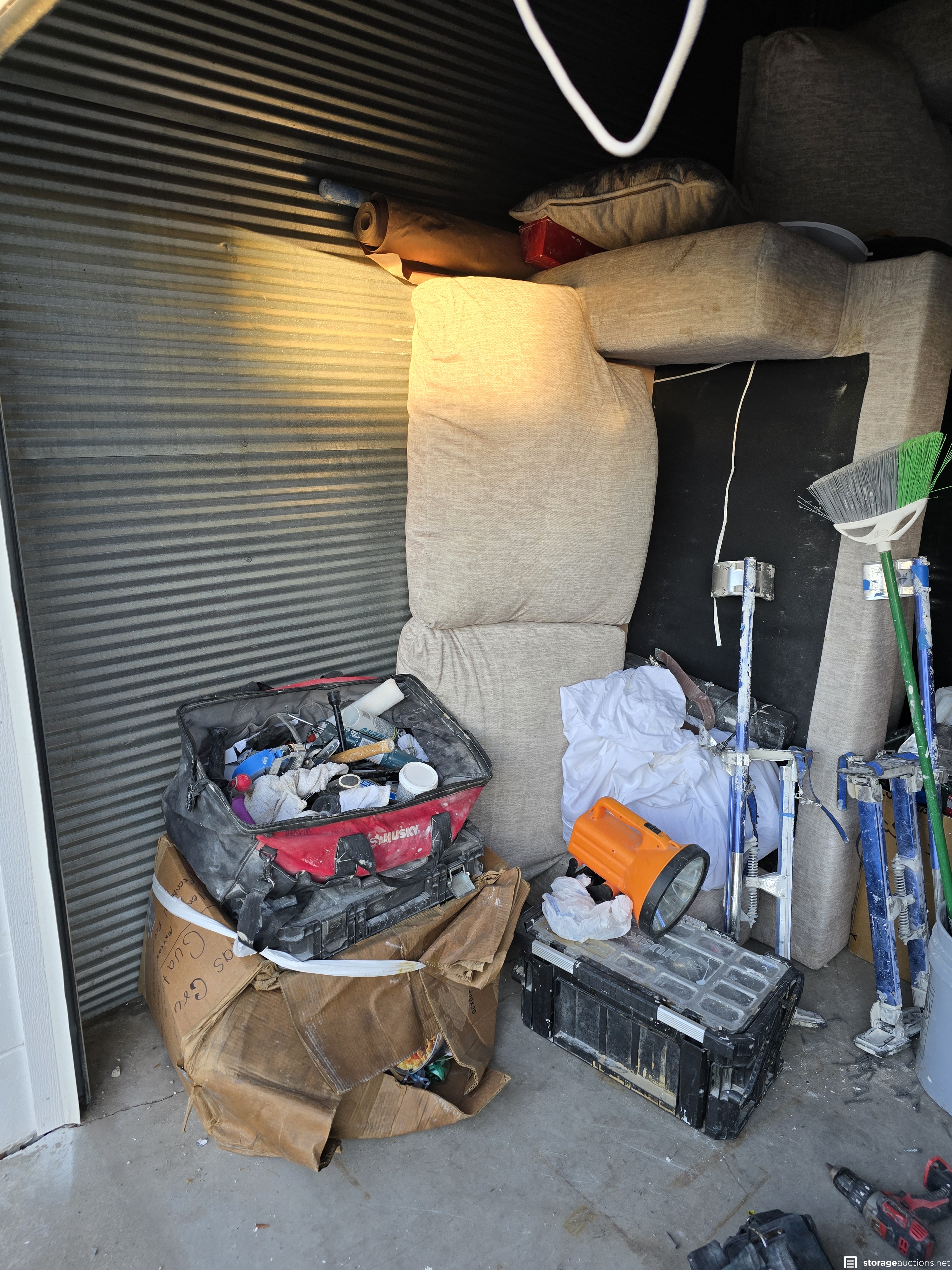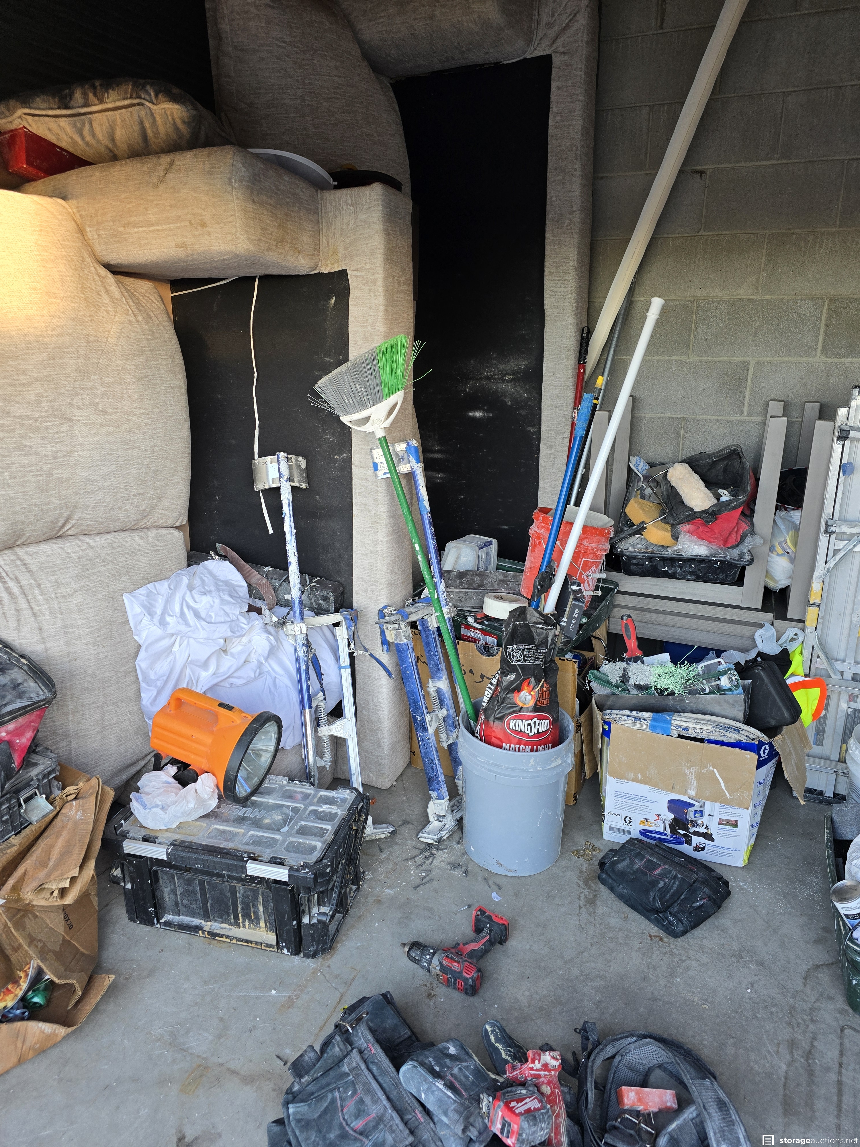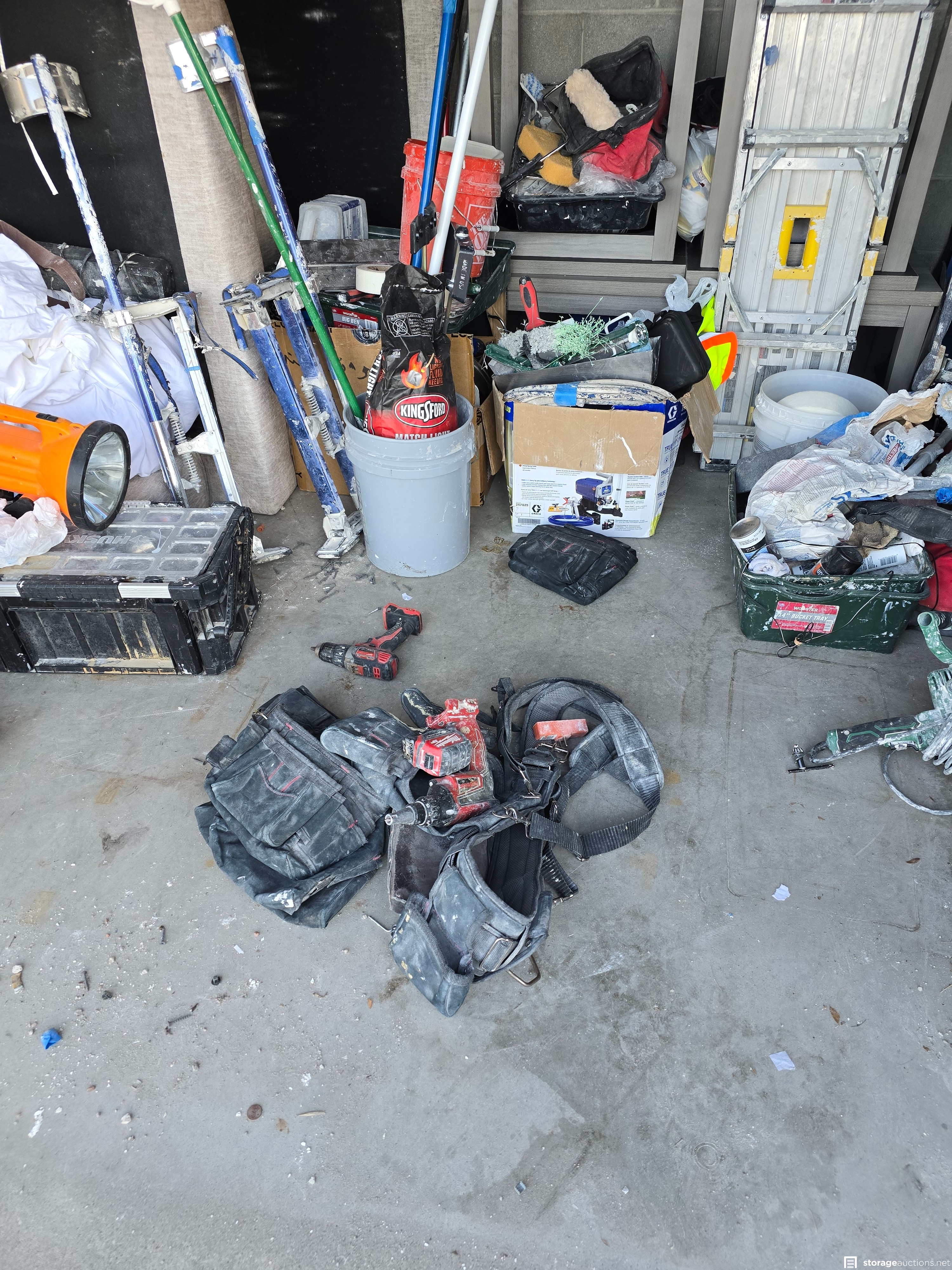 Loaded with what looks like contractor tools. Milwaukee tools, Husky tools and tool boxes, drywall and painting tools and supplies, adjustable drywall stilts, spot light, wide step stool, some furniture.