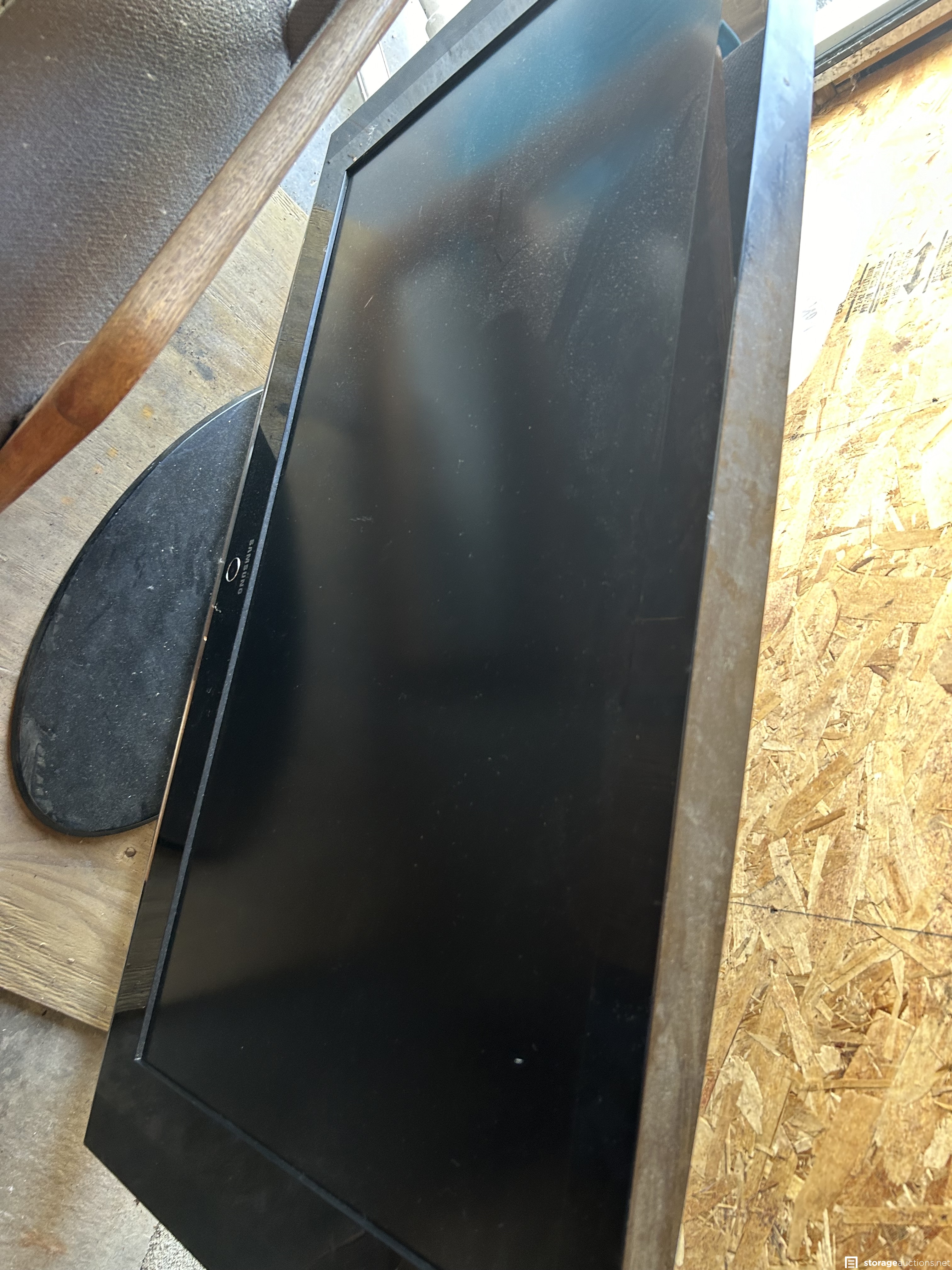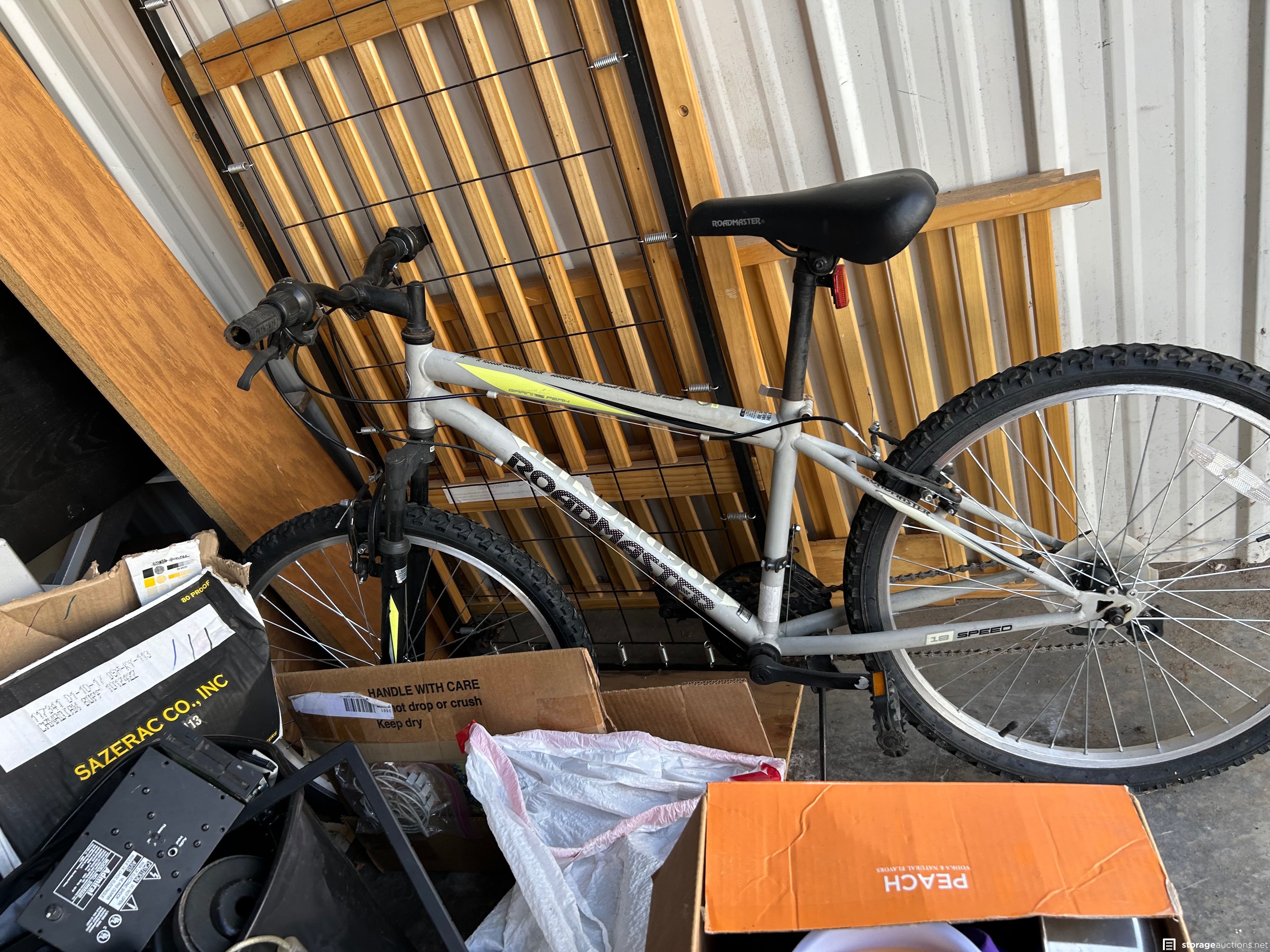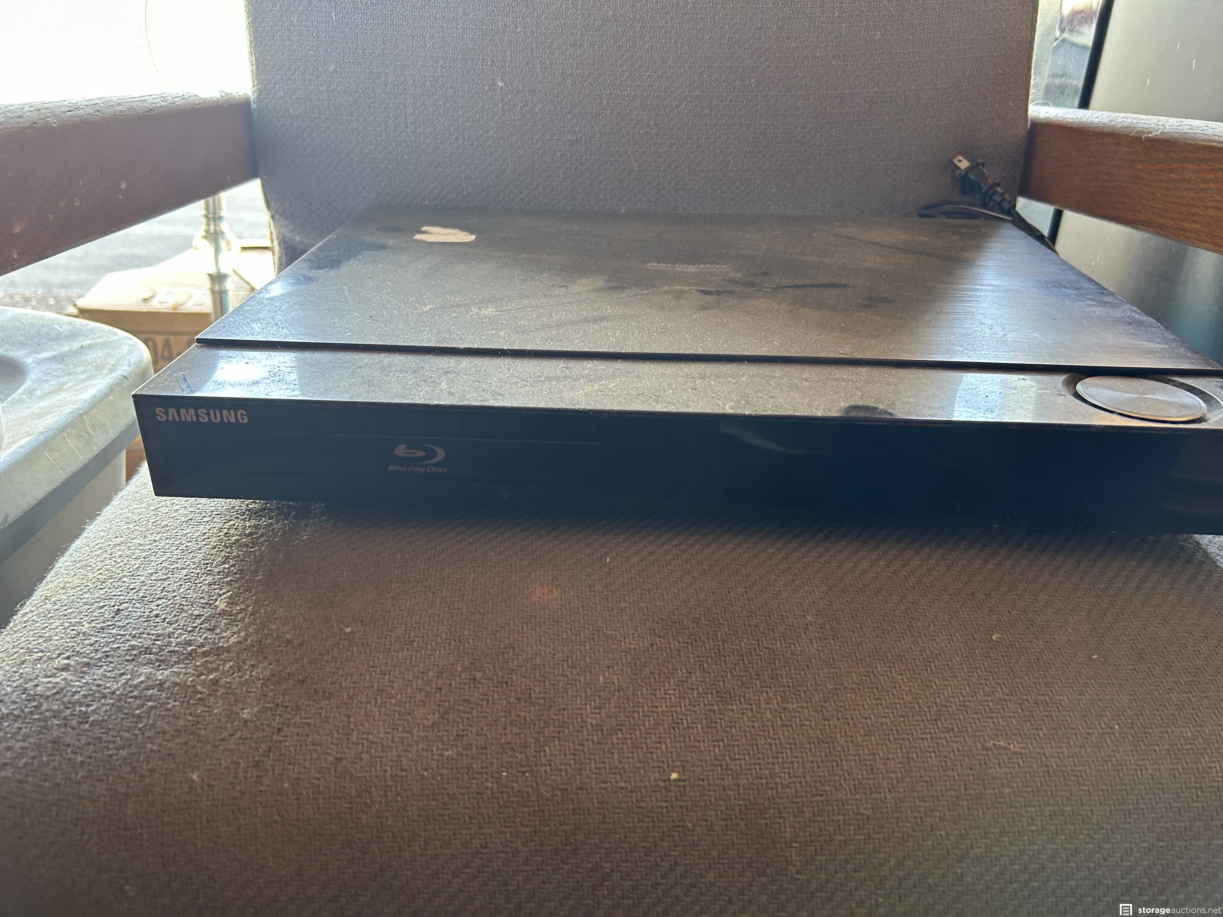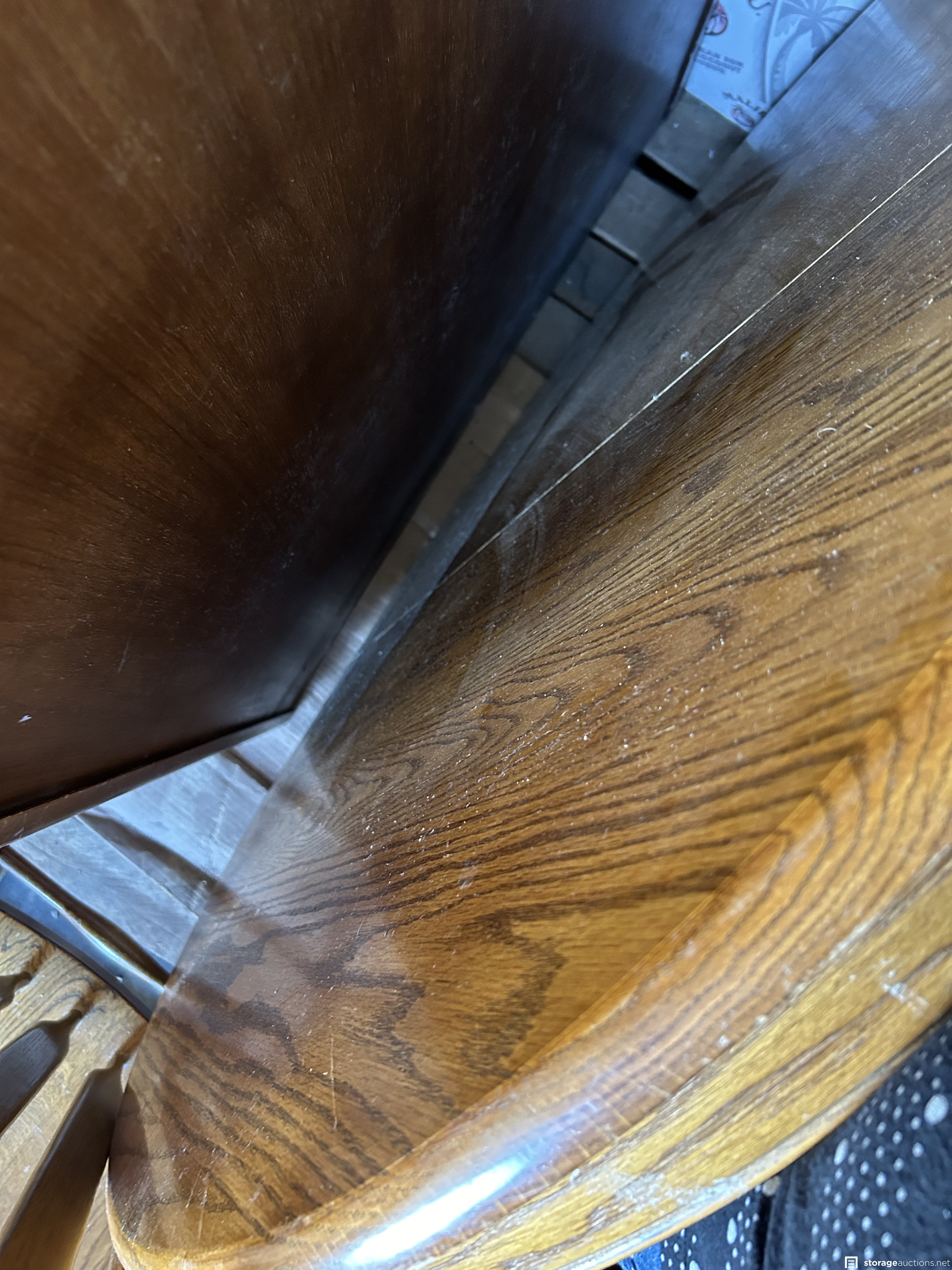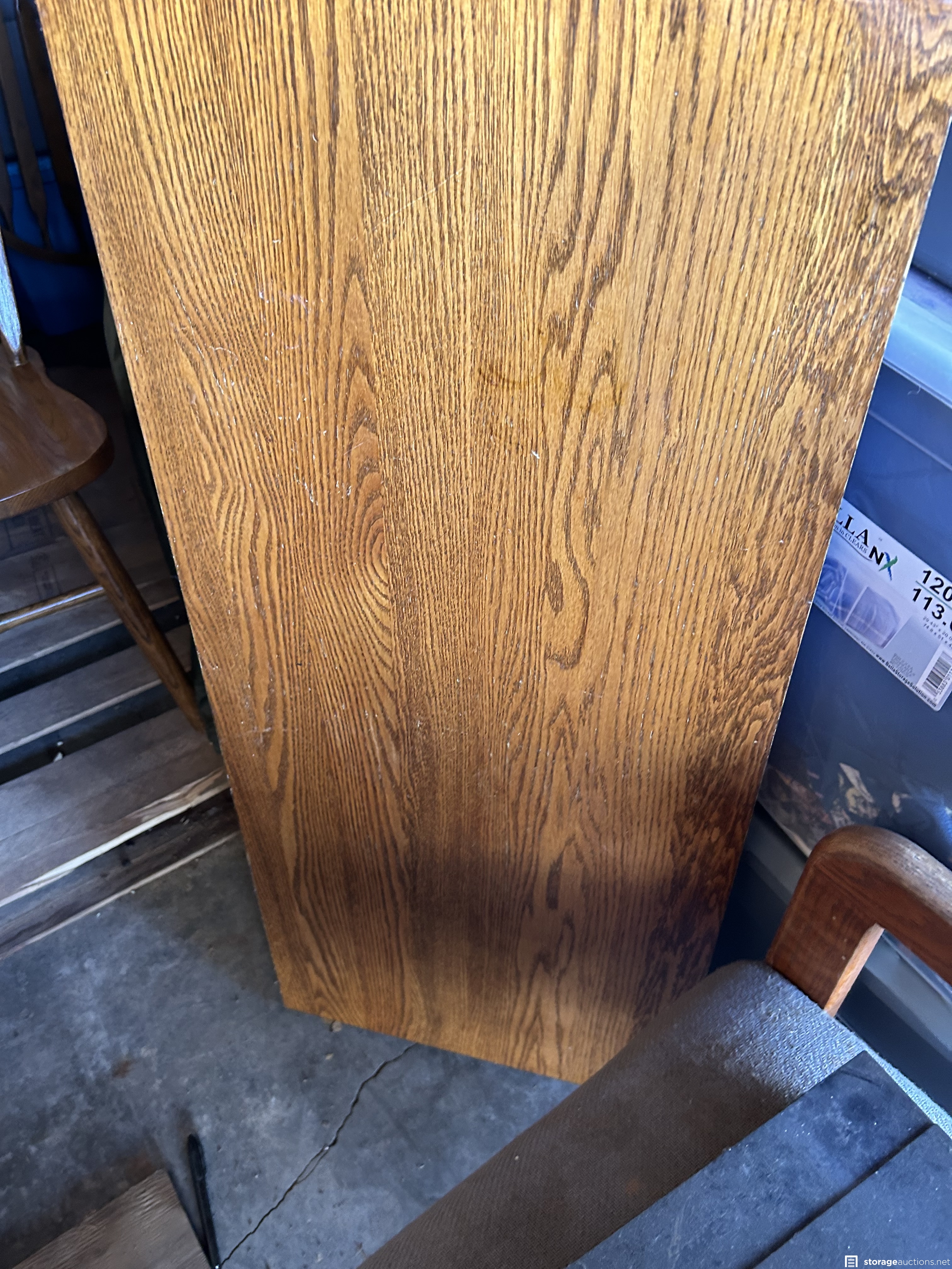 This unit appears to contain flat screen tv, DVD player, cabinet, boxes unknown, oak round table with extension, end table, pack-n-play, crib, bike