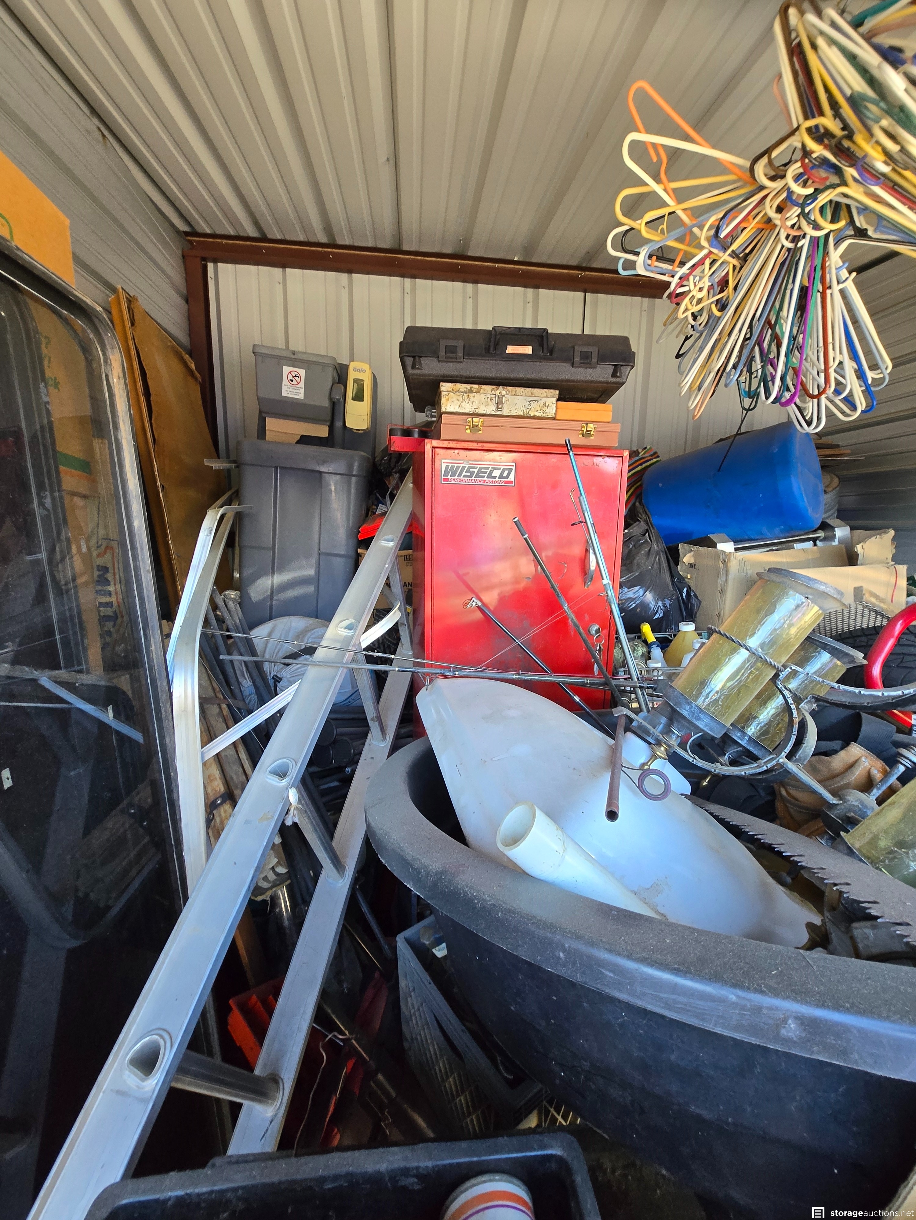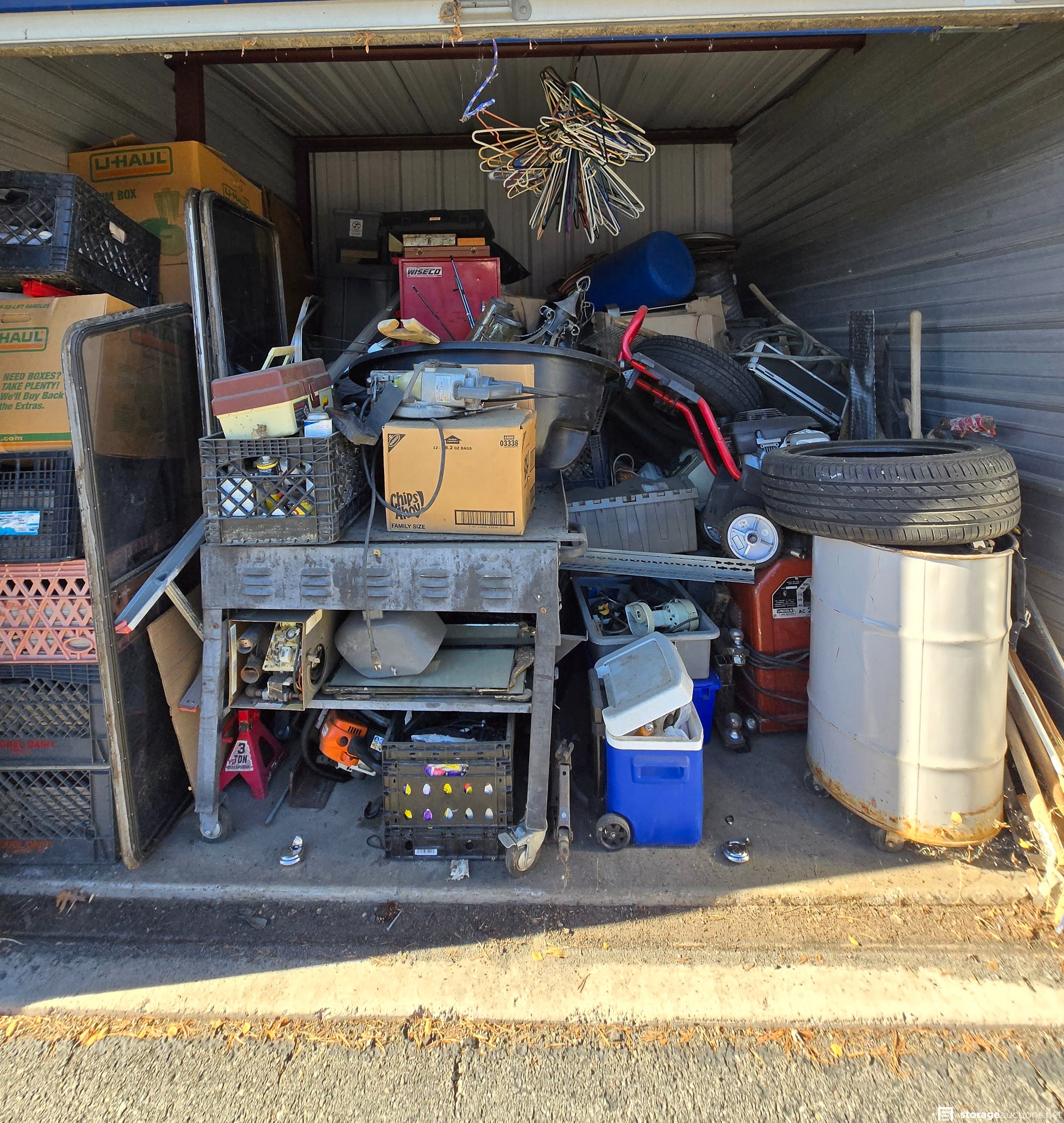 This downstairs unit appears to contain: Tools, Tool Boxes, Totes, Ladder, Arc Welder, Honda Pump.