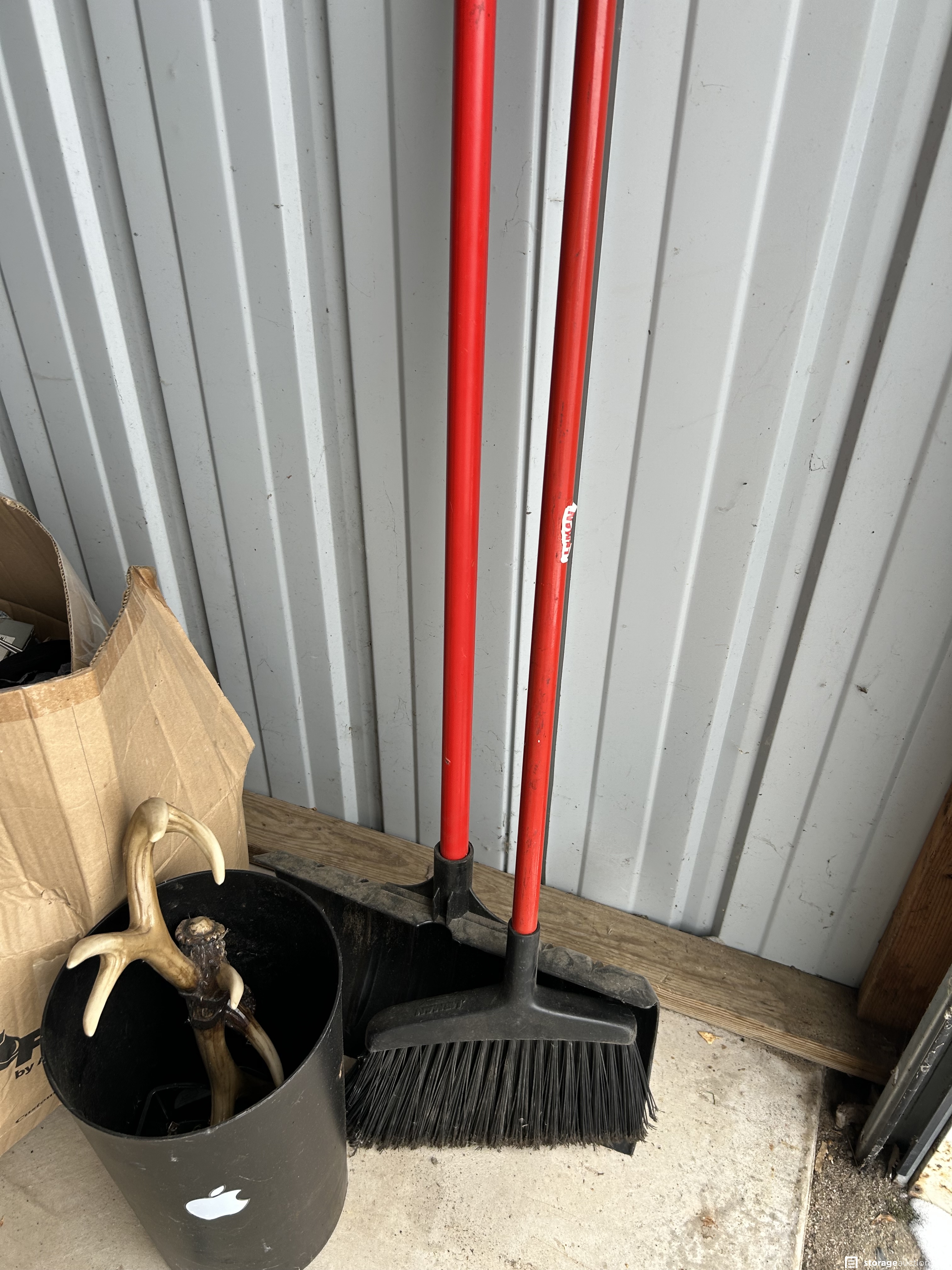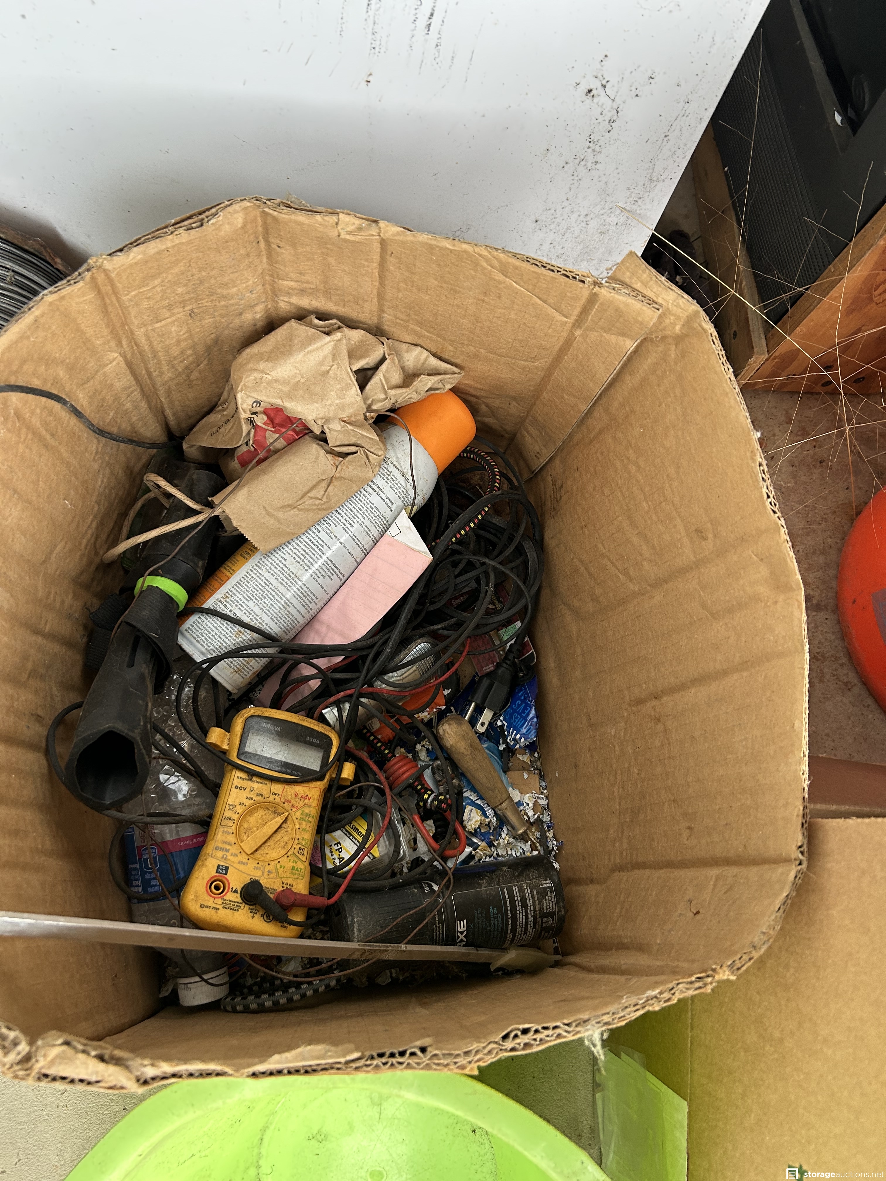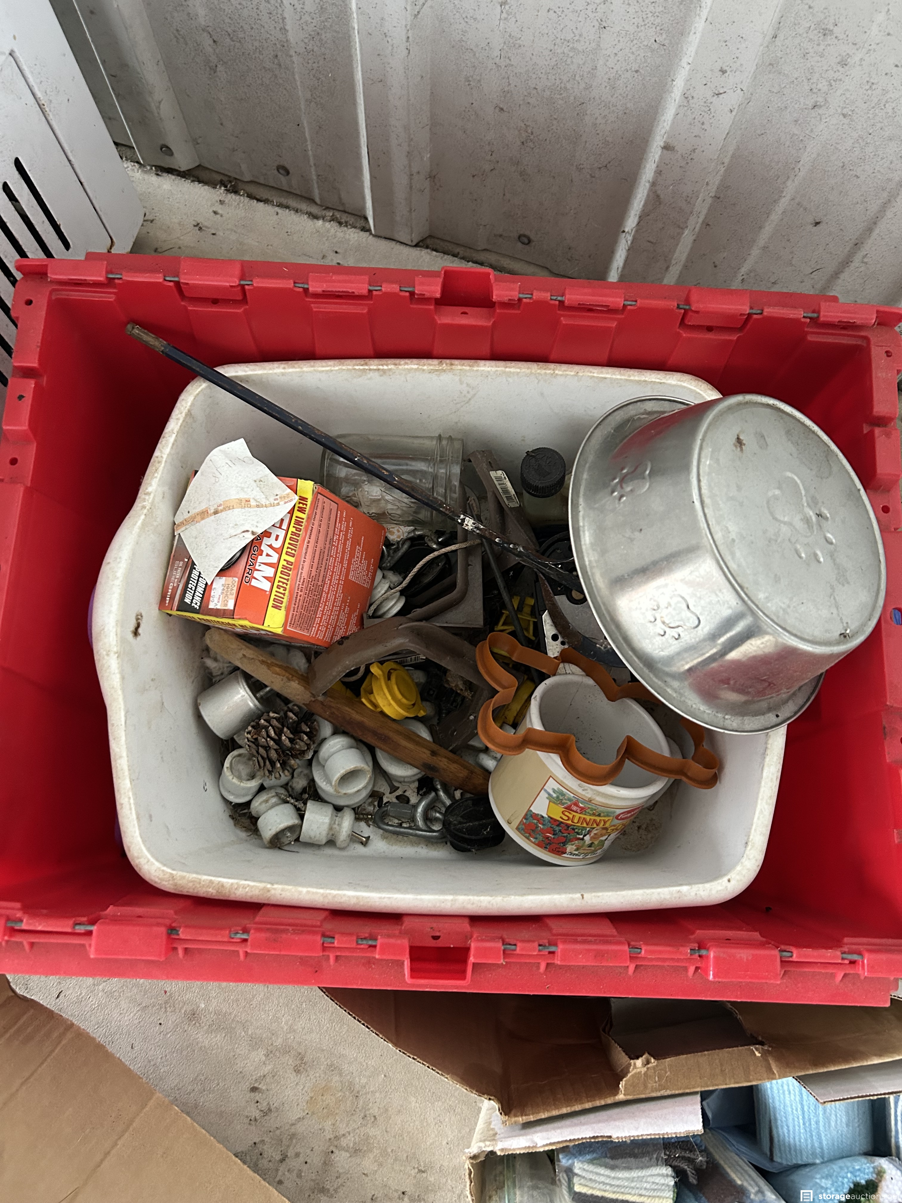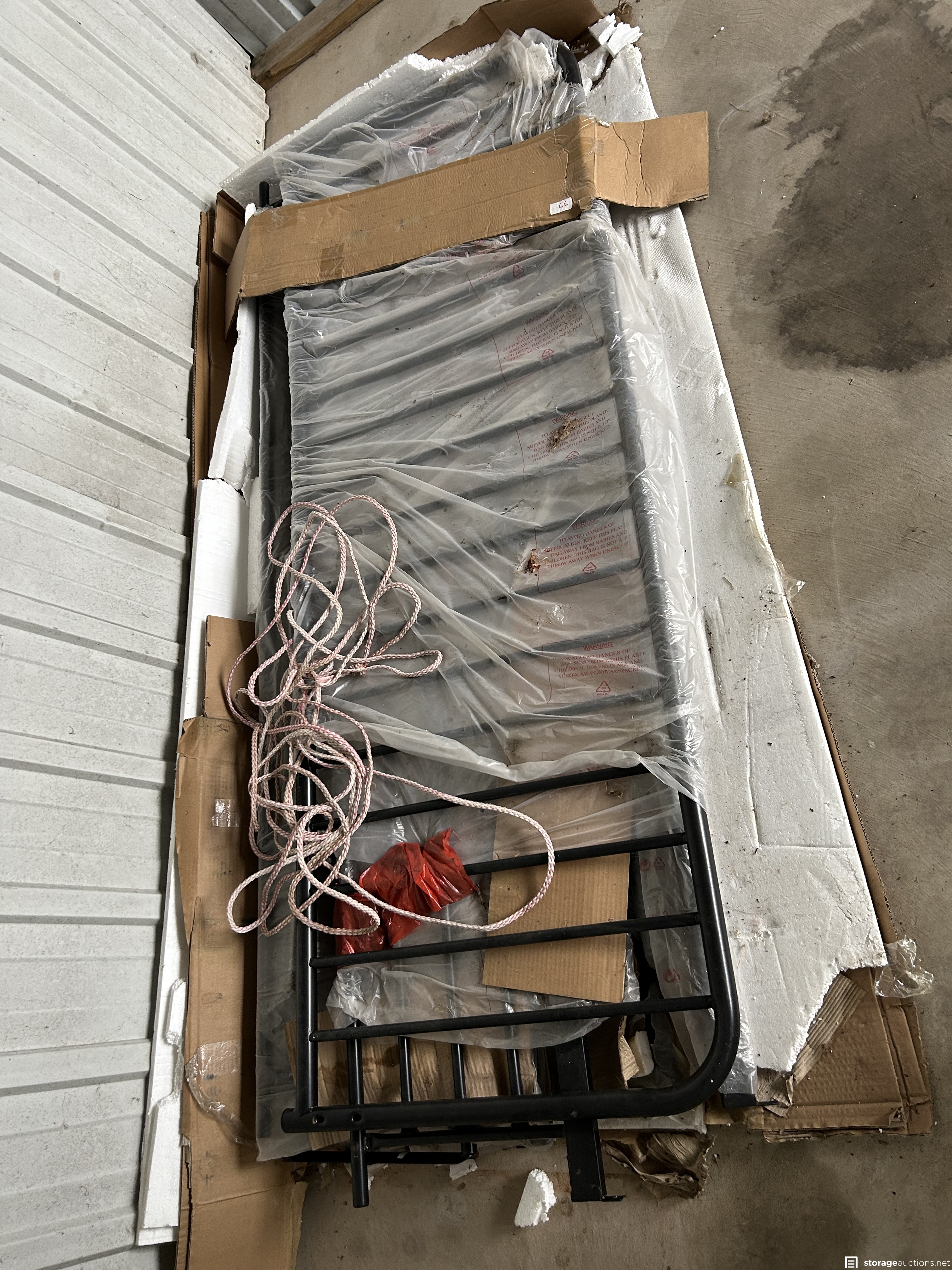 New in box bed frame, broom, shovel, rake, chest freezer, clothing, lamp, joint compound, Dry Lock paint, mugs, hook and loop craft, Polaris jacket, pillow and miscellaneous