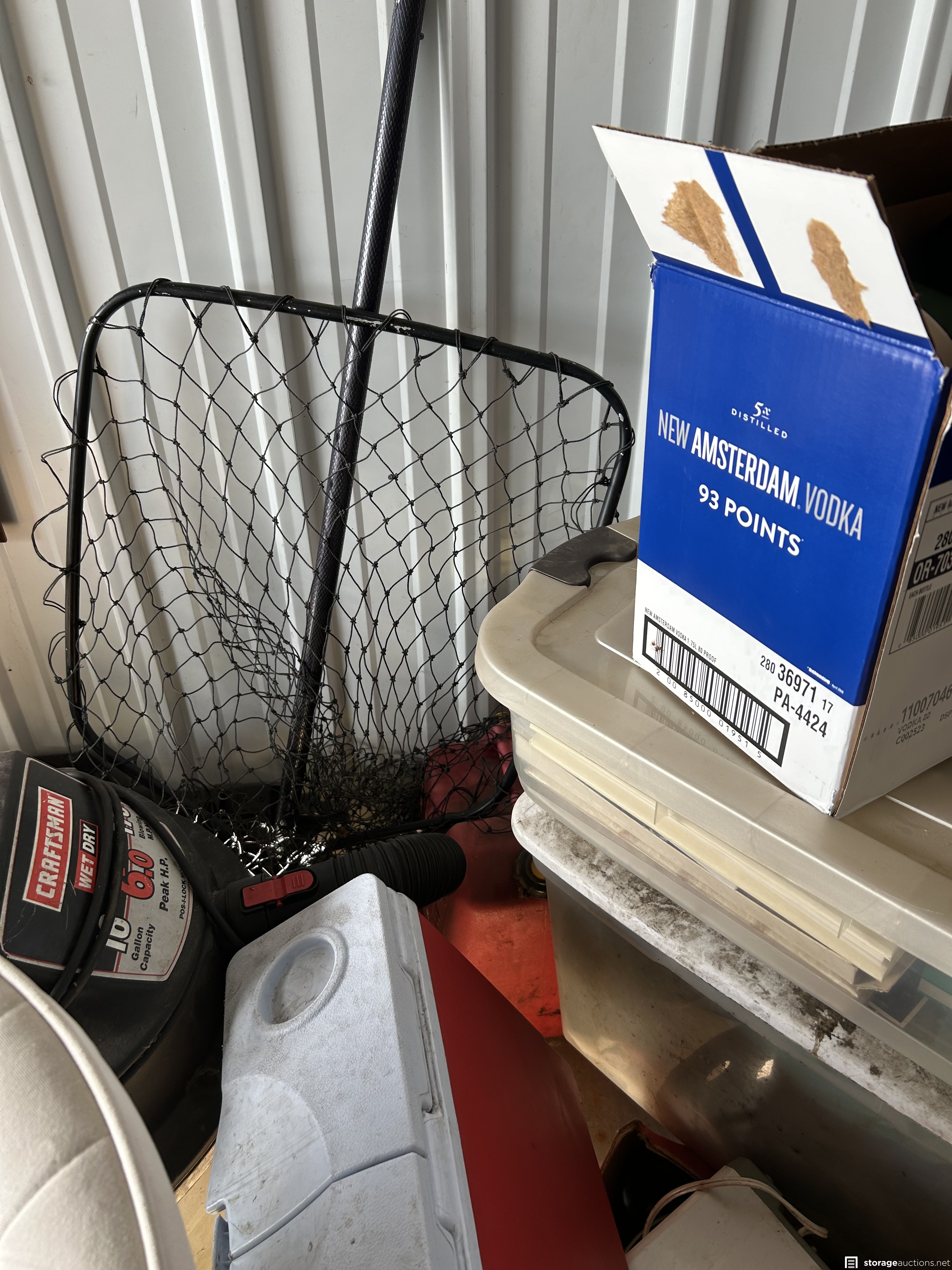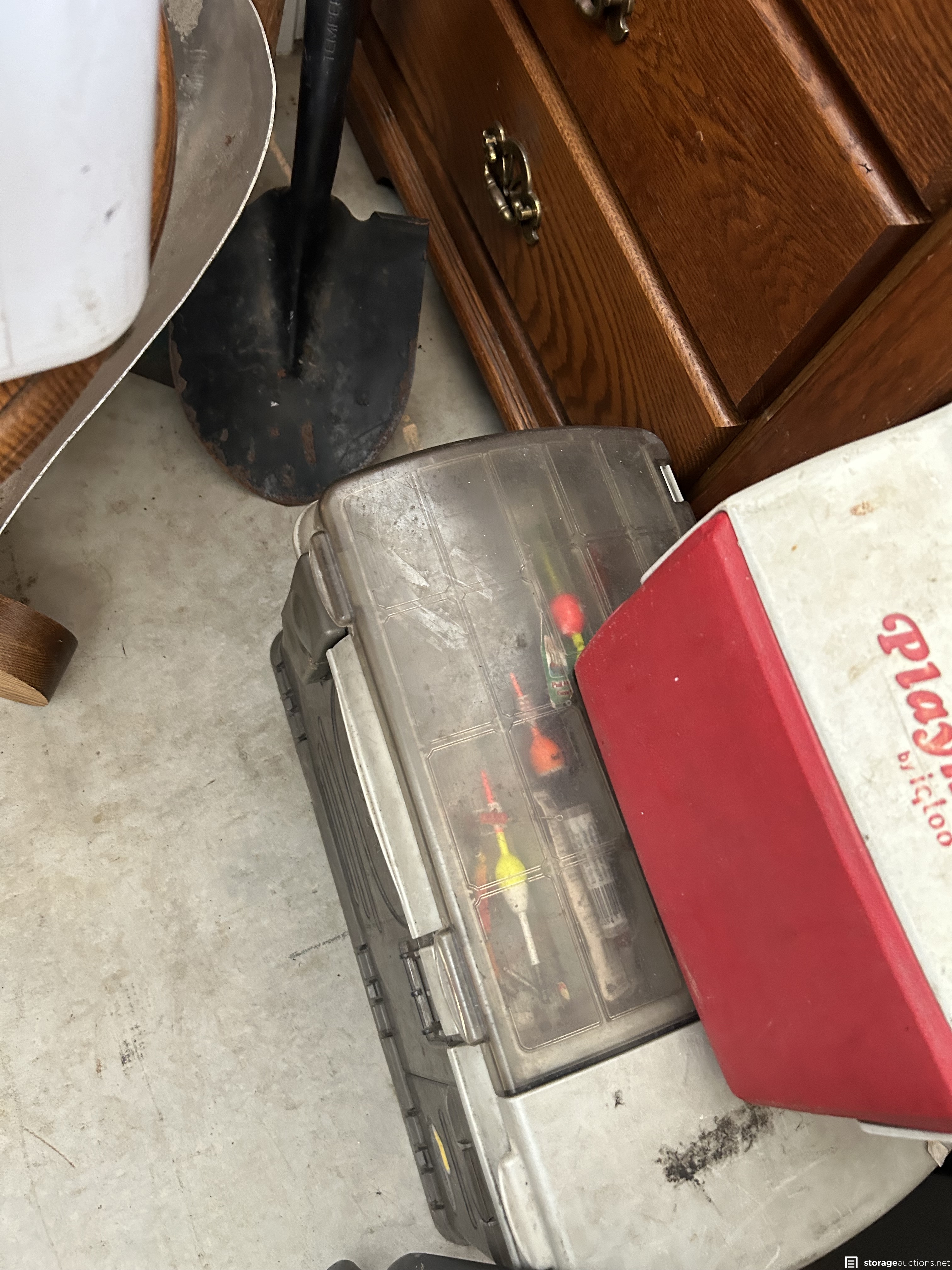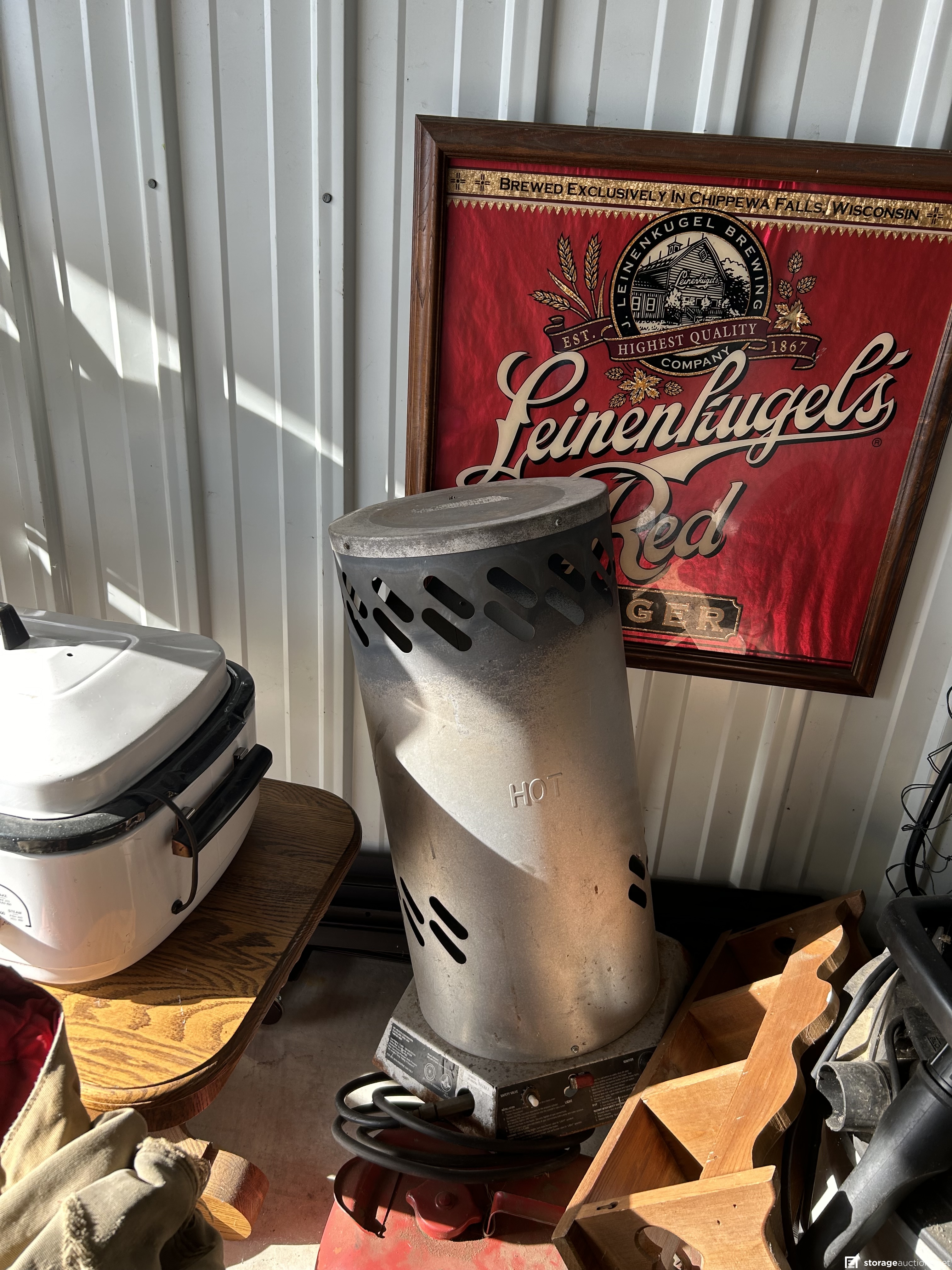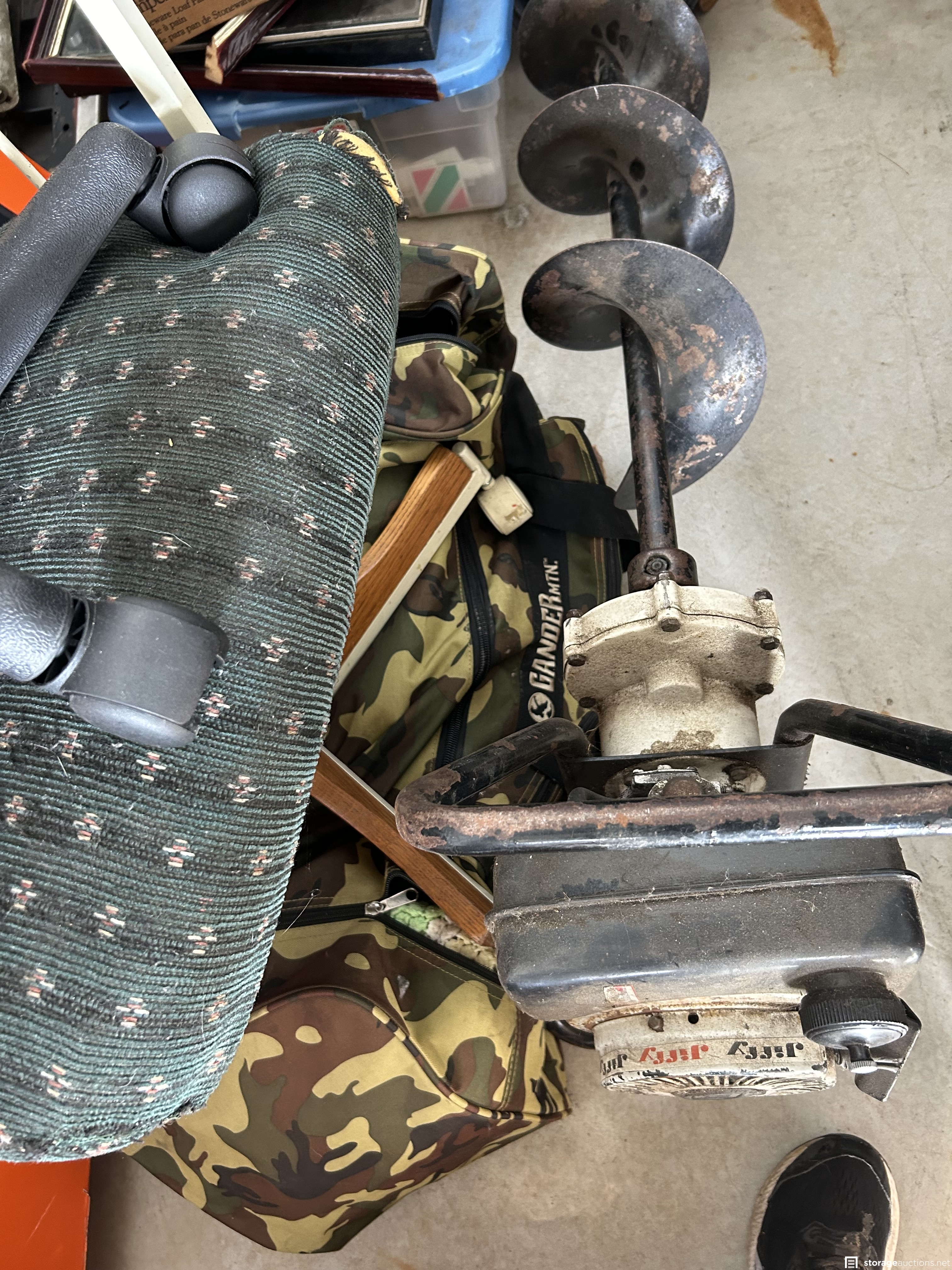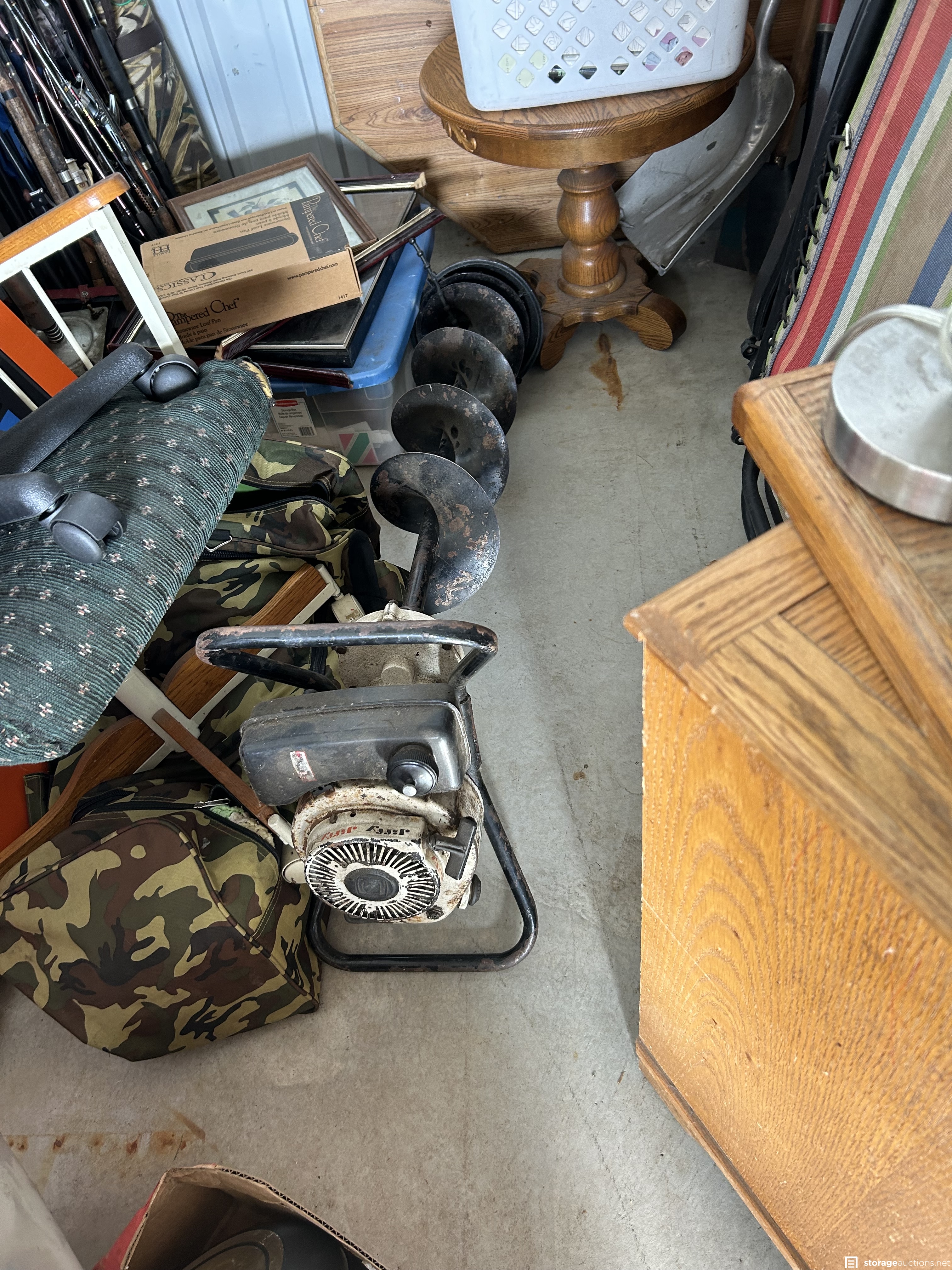 Roku TV, Ducks Unlimited Gear, pampered chef, ice auger, scooter, skateboard, hockey skates, oak dresser, fishing gear, tackle box, shovels, jewelry dresser, tv stand, cornhole game, pool cue in travel bag, Budweiser signs, propane heater, large shop vac, desk, desk white, basketballs, coffees table, kitchen chairs and table, tools,roaster, boat gas tank, battery charger, lamp, net, and more