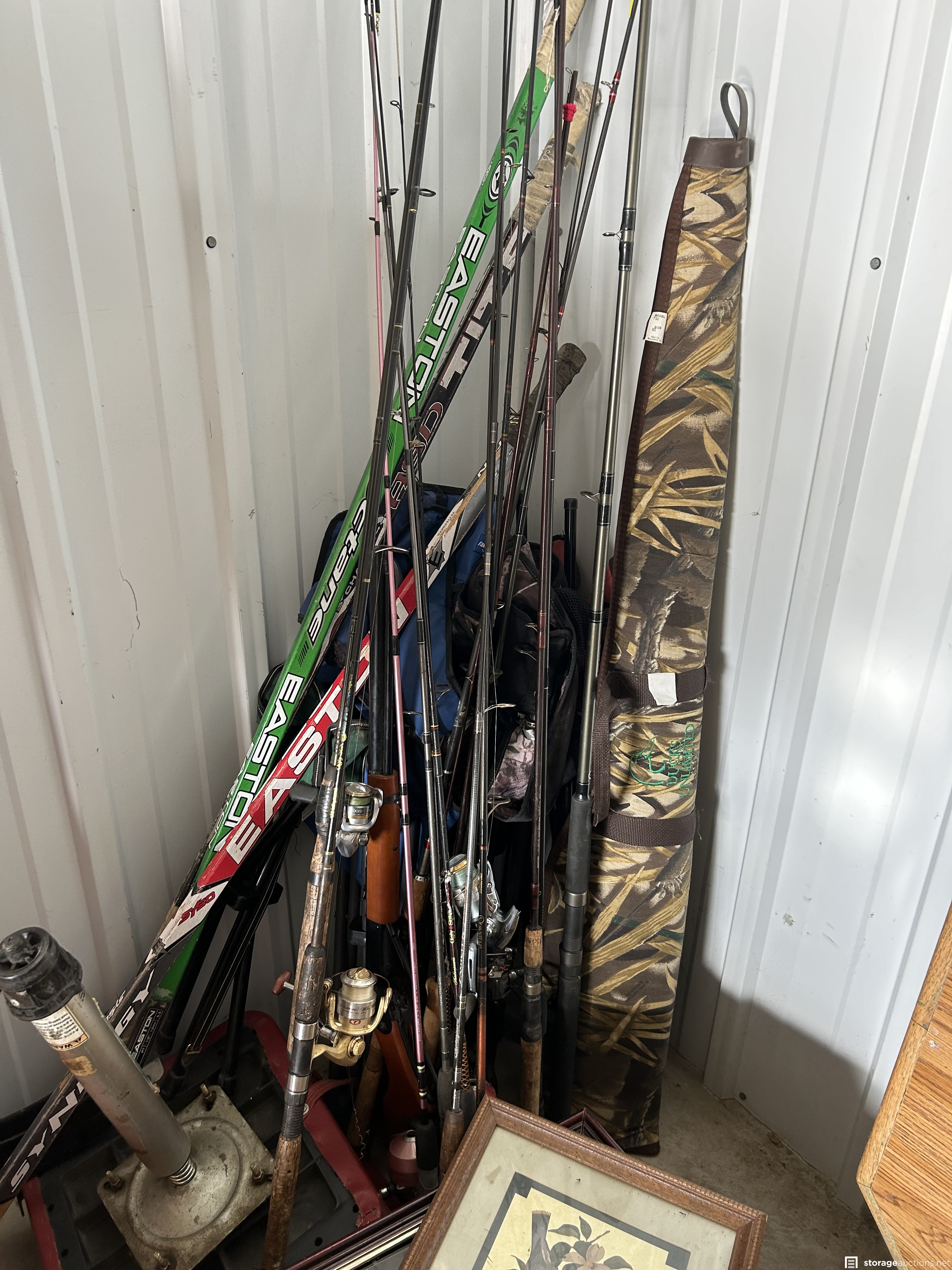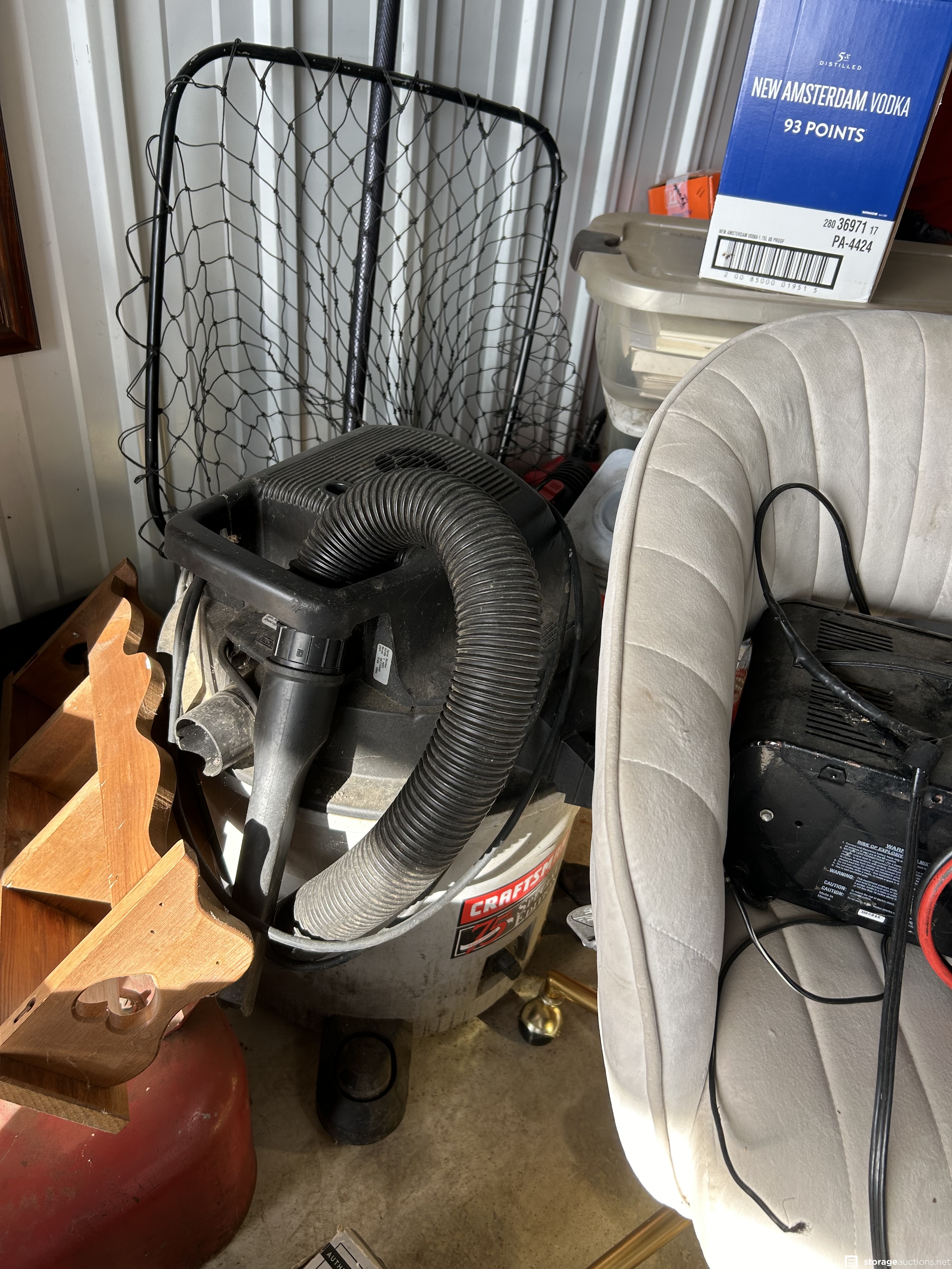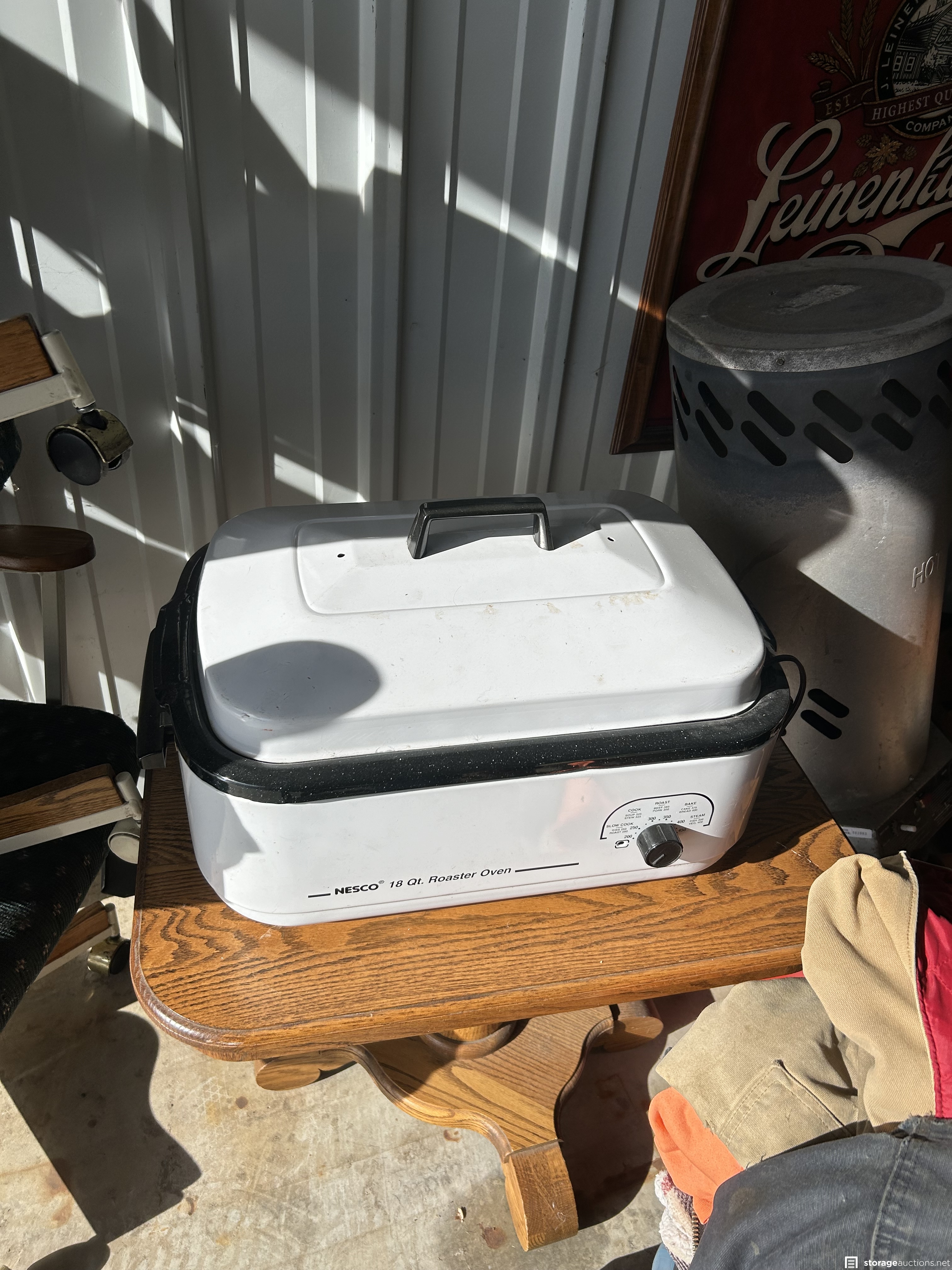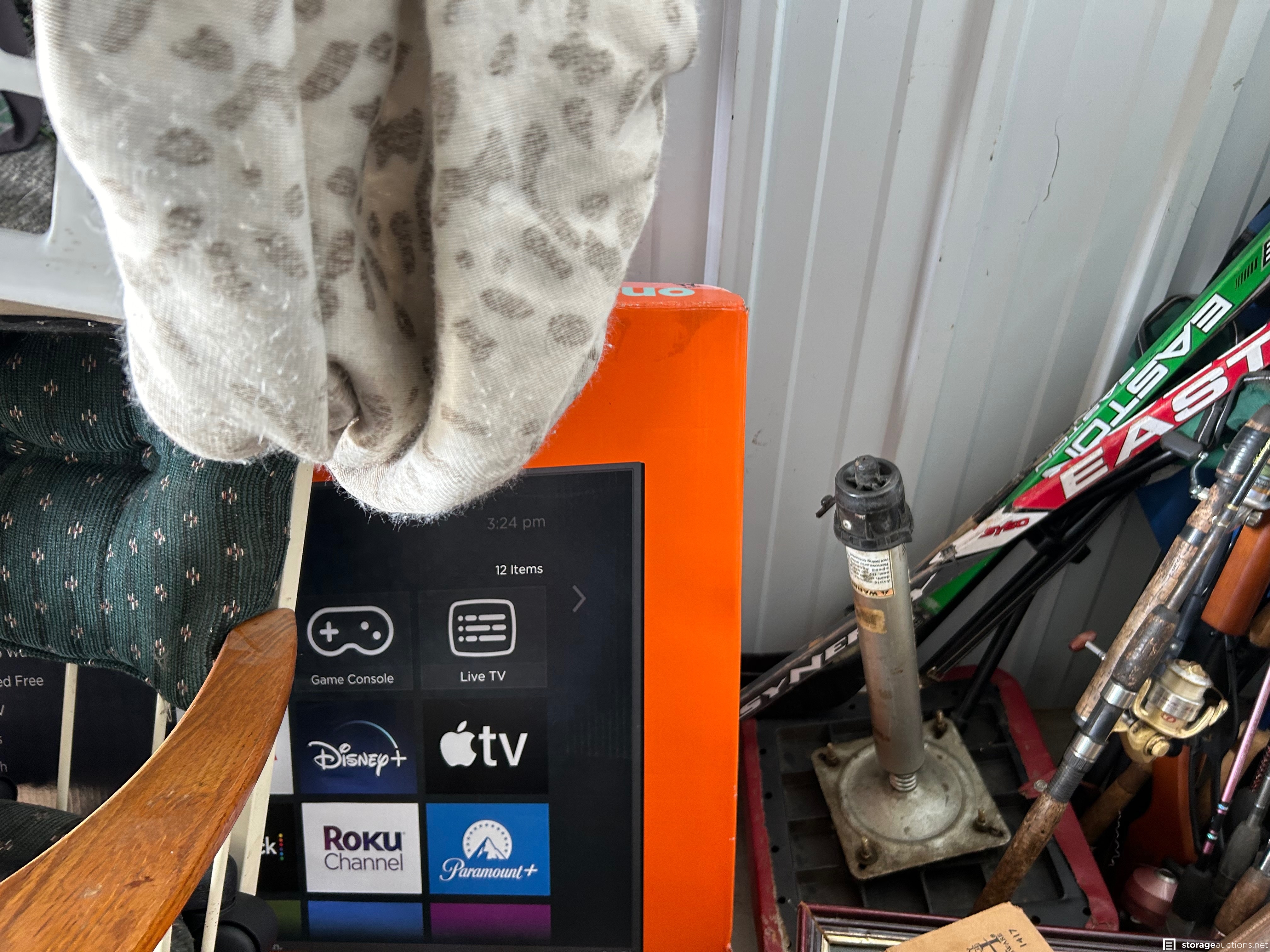 Roku TV, Ducks Unlimited Gear, pampered chef, ice auger, scooter, skateboard, hockey skates, oak dresser, fishing gear, tackle box, shovels, jewelry dresser, tv stand, cornhole game, pool cue in travel bag, Budweiser signs, propane heater, large shop vac, desk, desk white, basketballs, coffees table, kitchen chairs and table, tools,roaster, boat gas tank, battery charger, lamp, net, and more