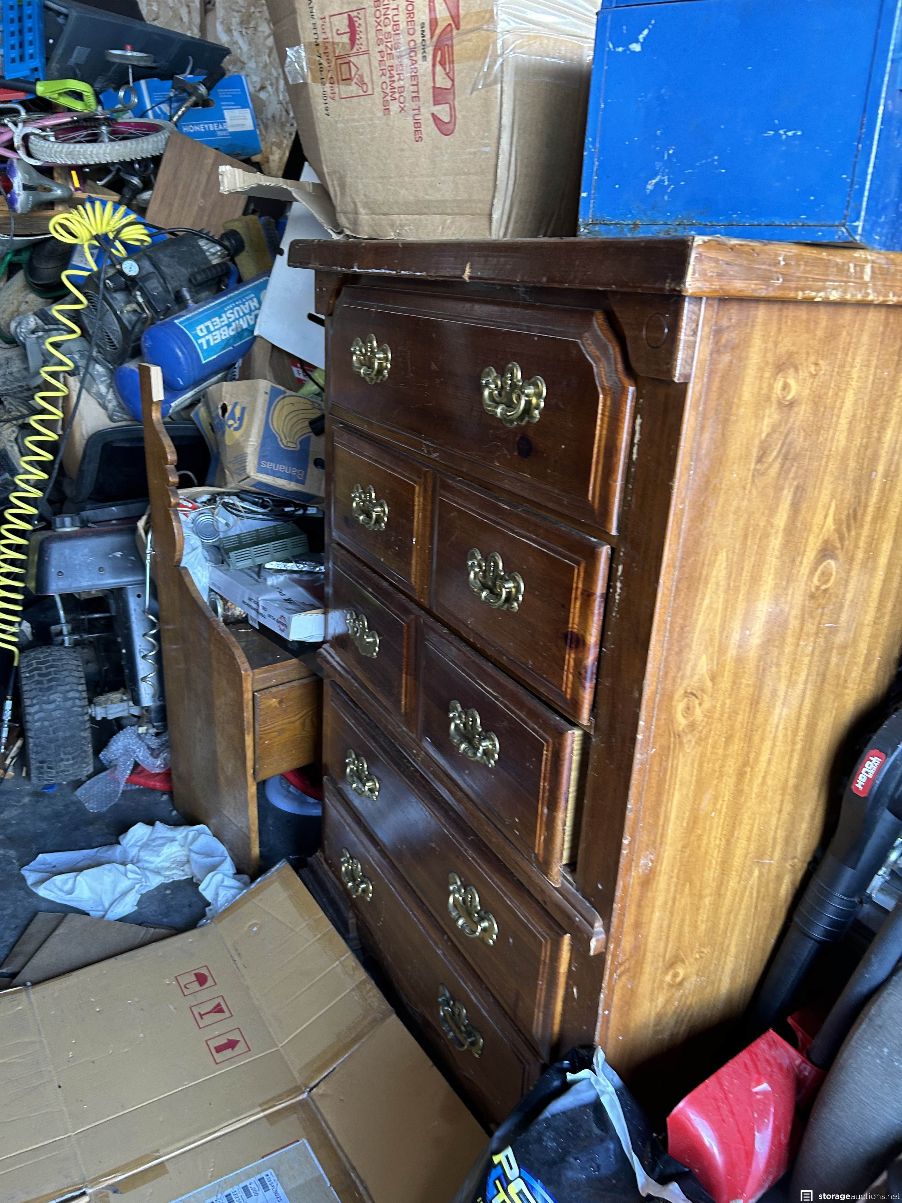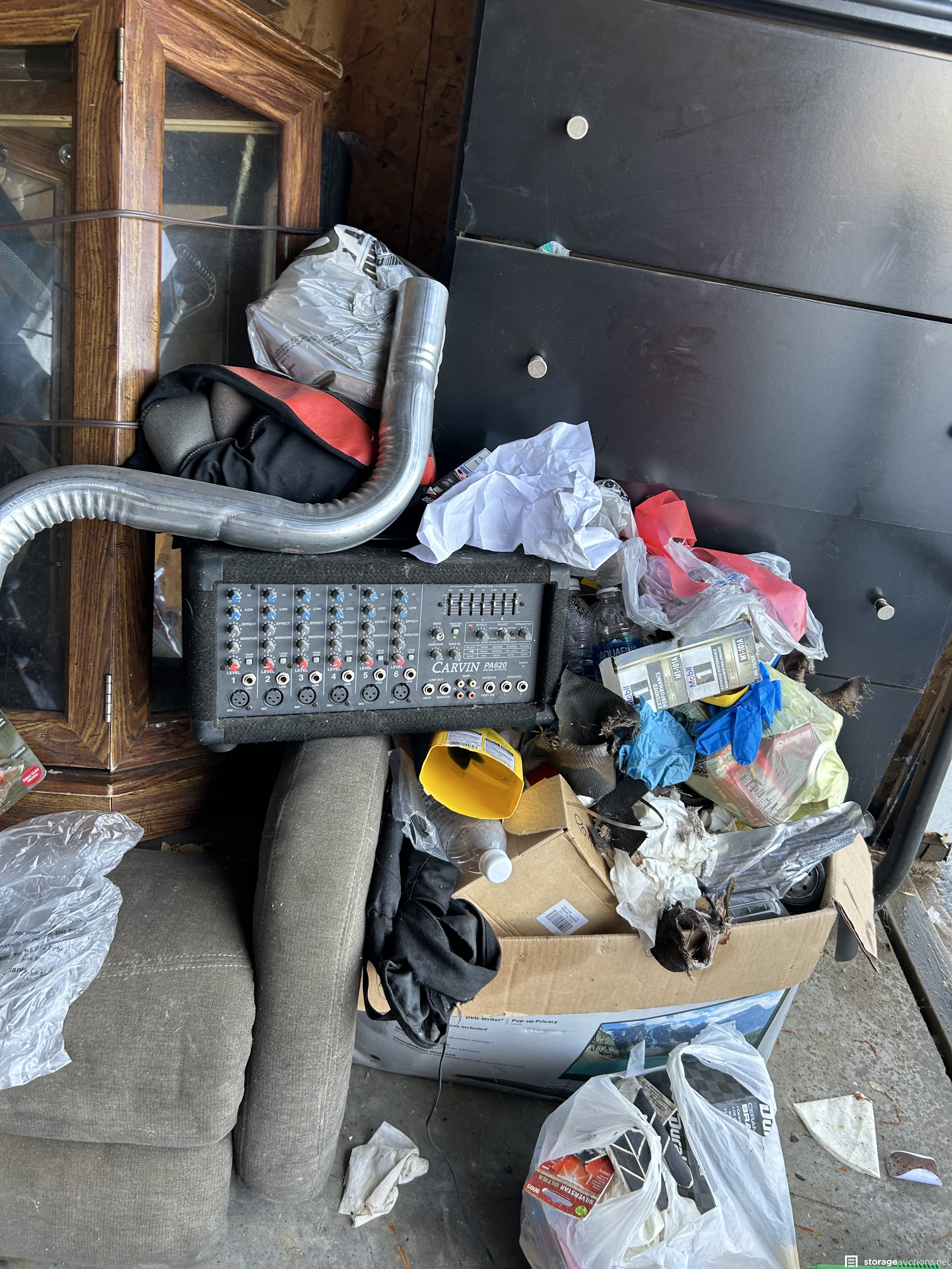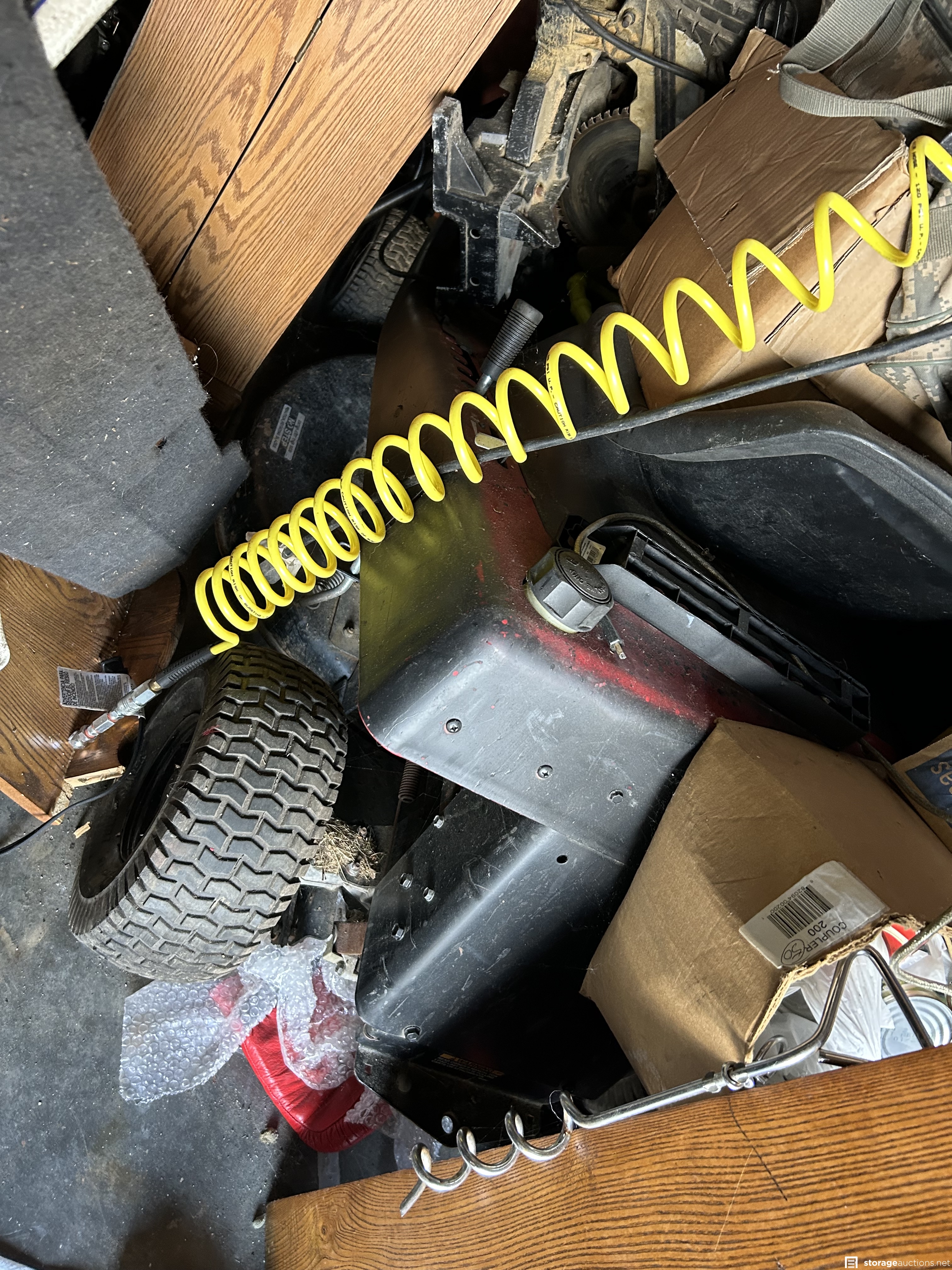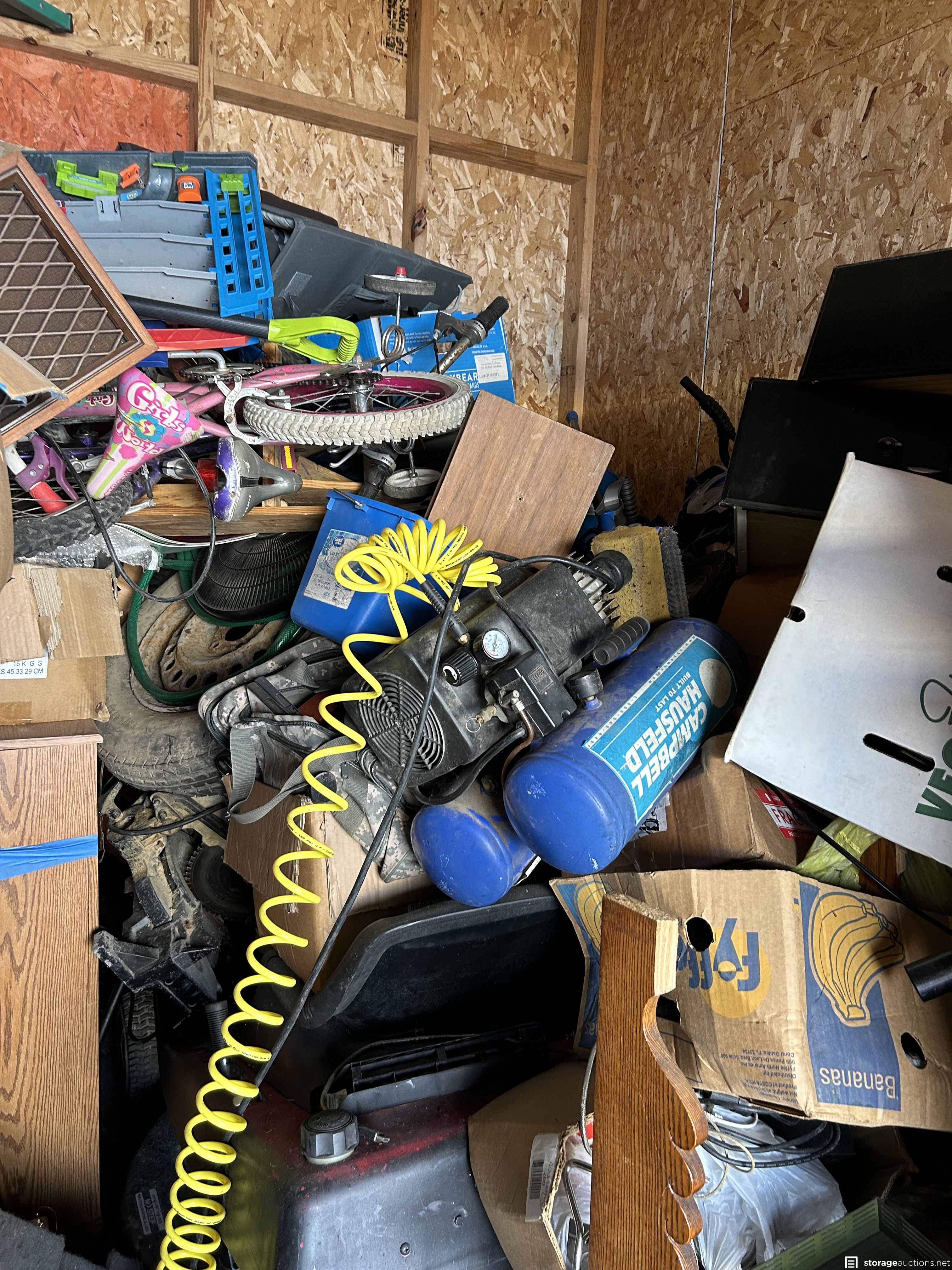 This unit appears to contain Rider lawnmower, large concert speakers, treadmill, pine dresser, kids bike, bench, light-up bean bag toss, toys, black dresser, tool cabinet, tools blower, ladder, and more