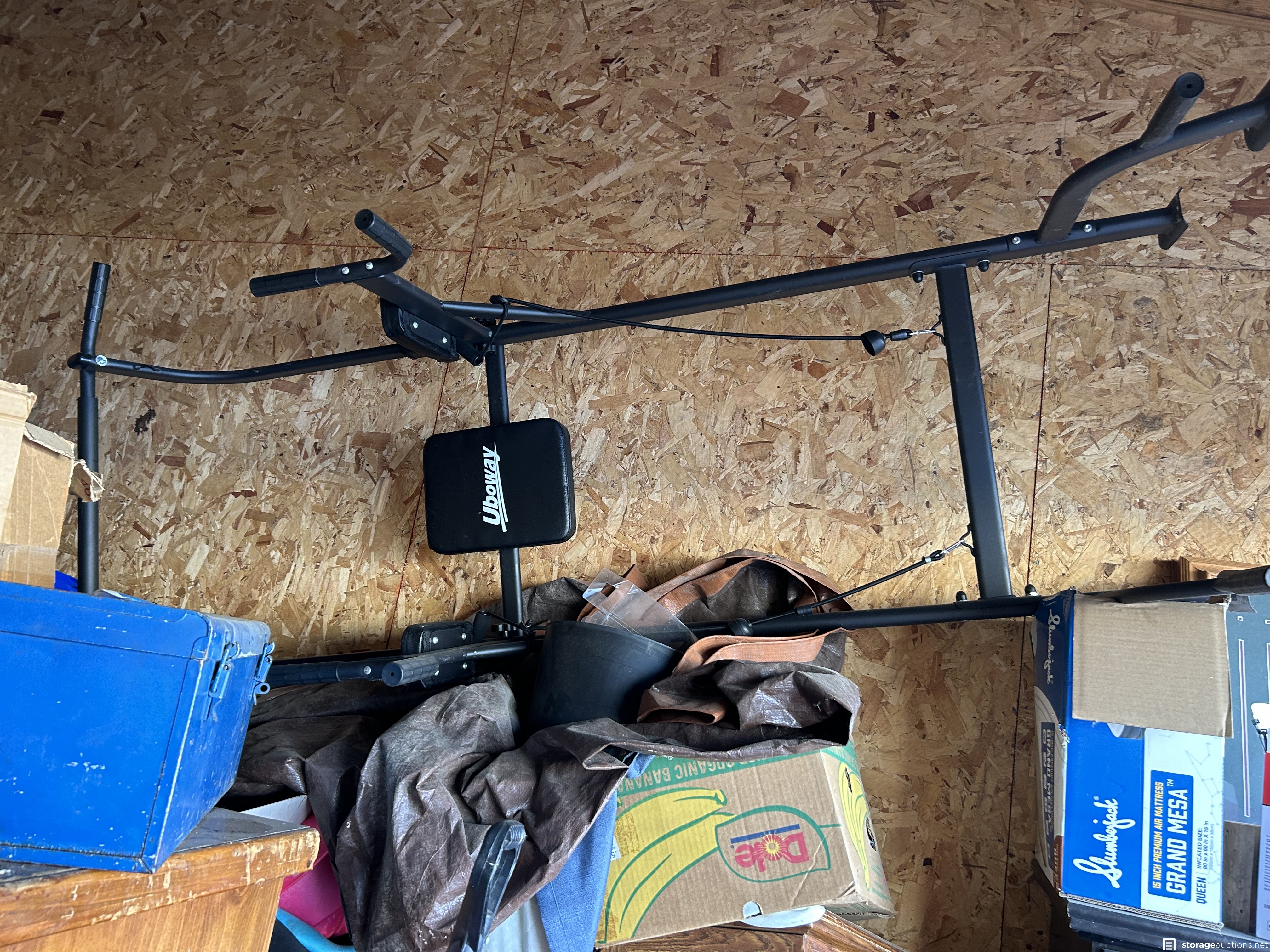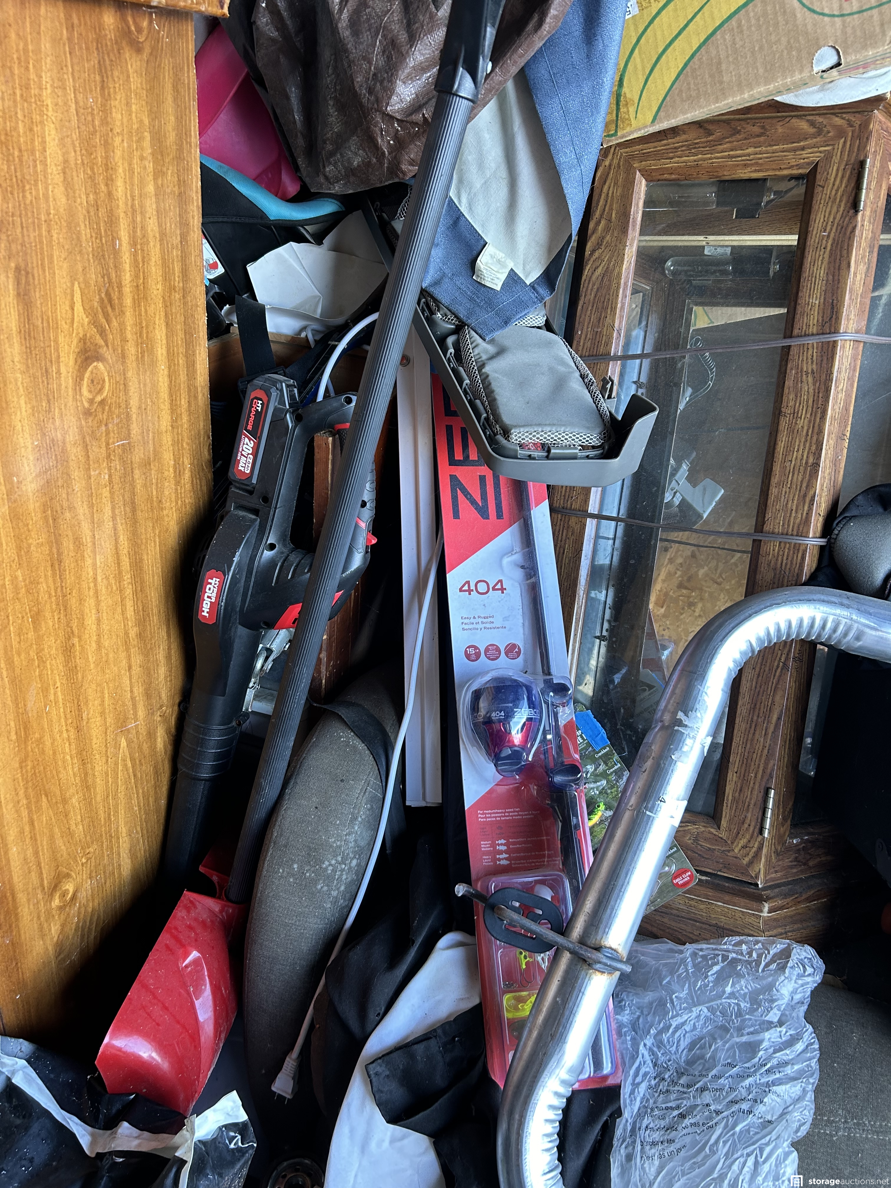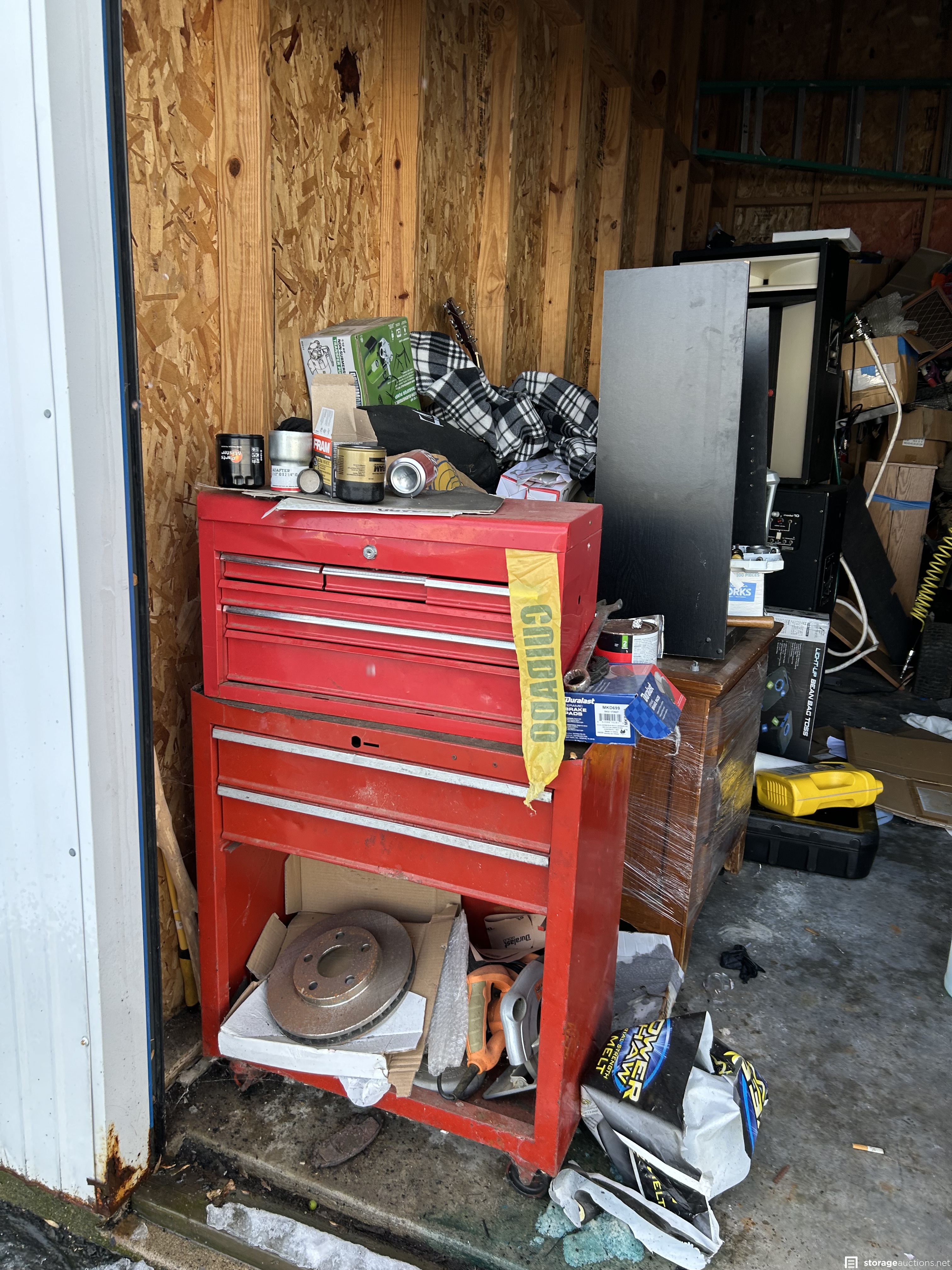 This unit appears to contain Rider lawnmower, large concert speakers, treadmill, pine dresser, kids bike, bench, light-up bean bag toss, toys, black dresser, tool cabinet, tools blower, ladder, and more