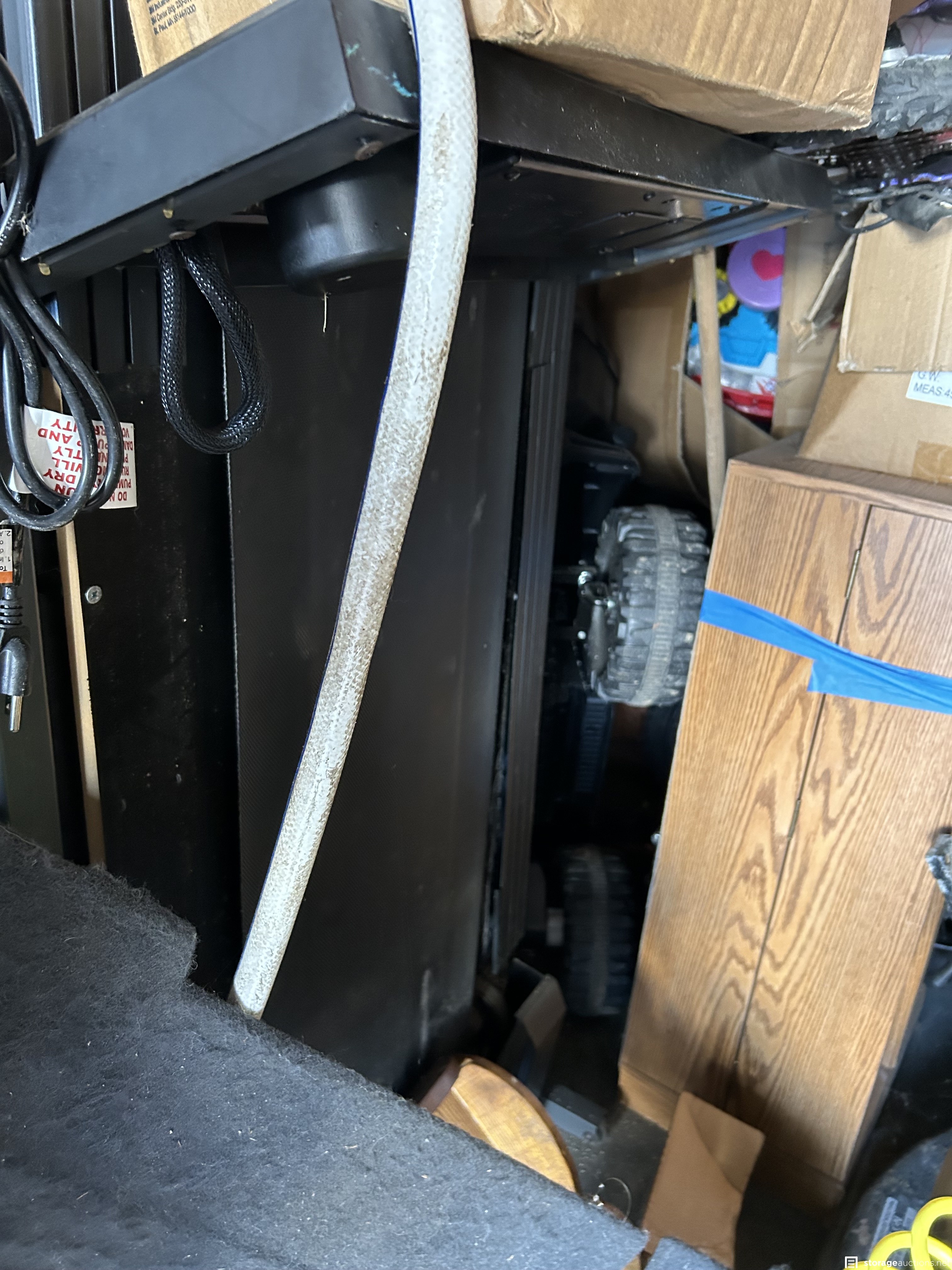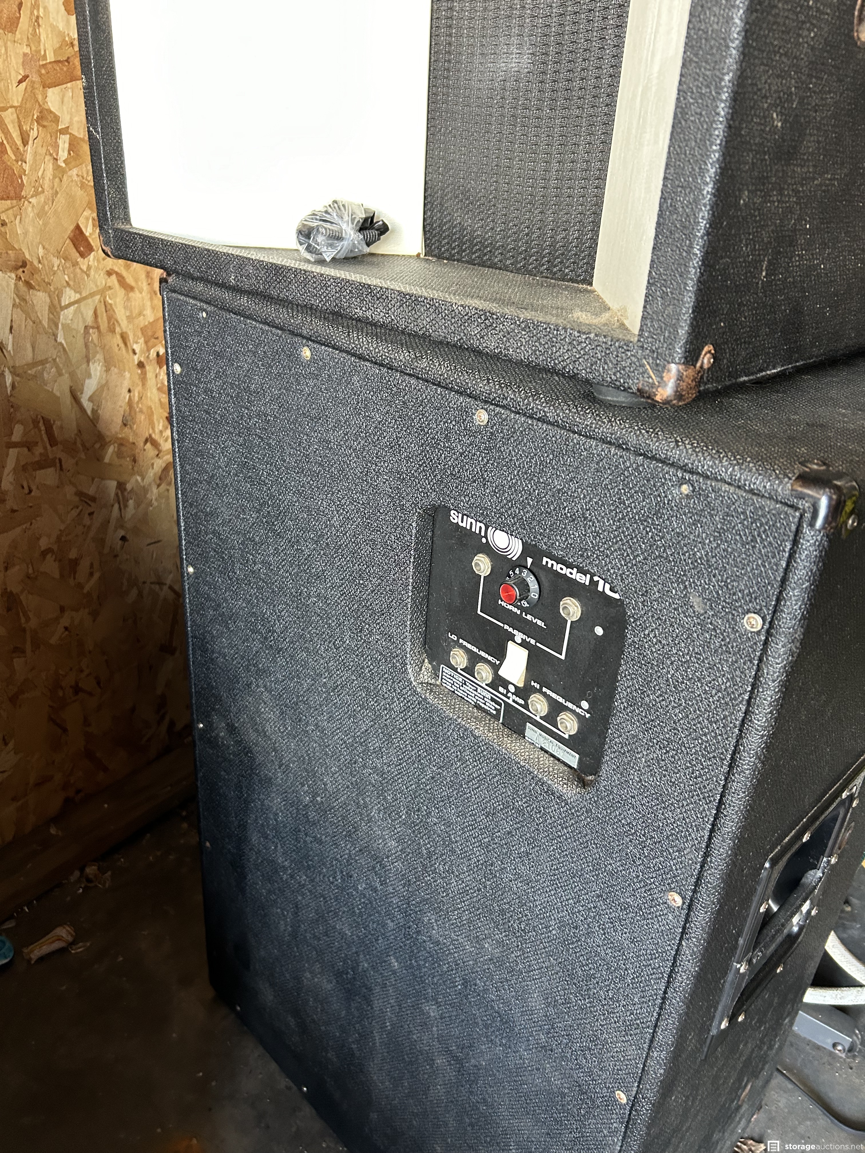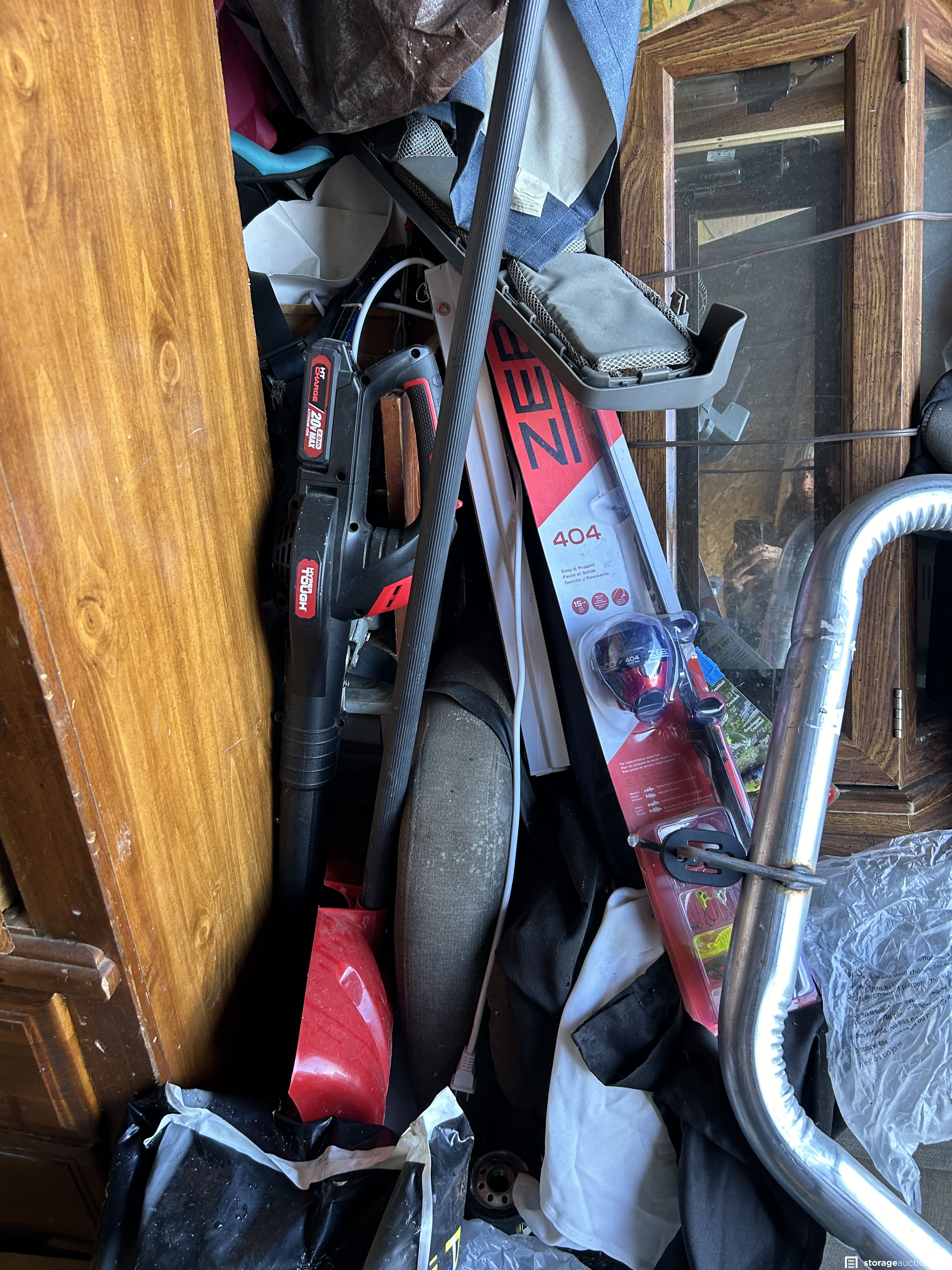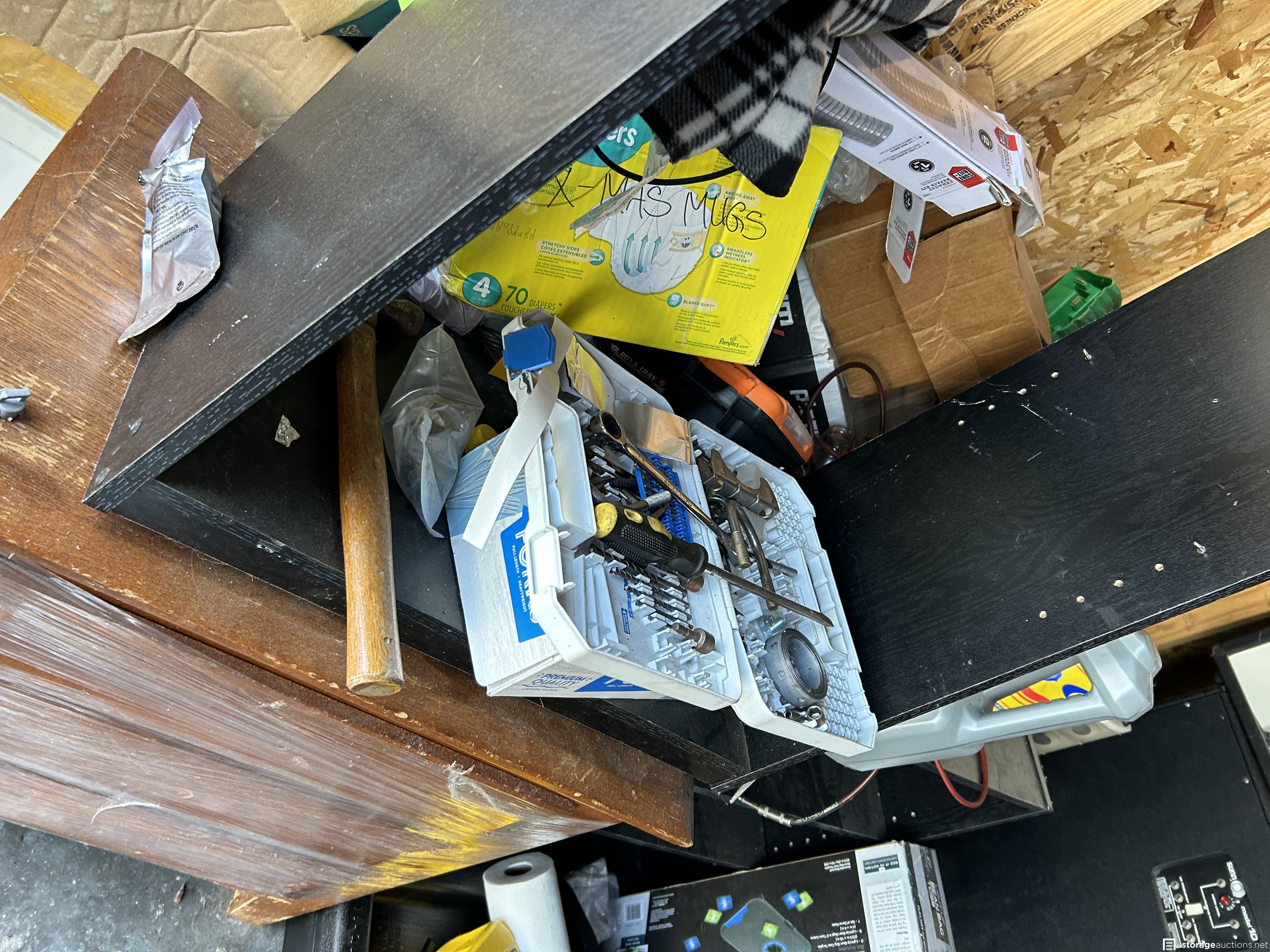 This unit appears to contain Rider lawnmower, large concert speakers, treadmill, pine dresser, kids bike, bench, light-up bean bag toss, toys, black dresser, tool cabinet, tools blower, ladder, and more
