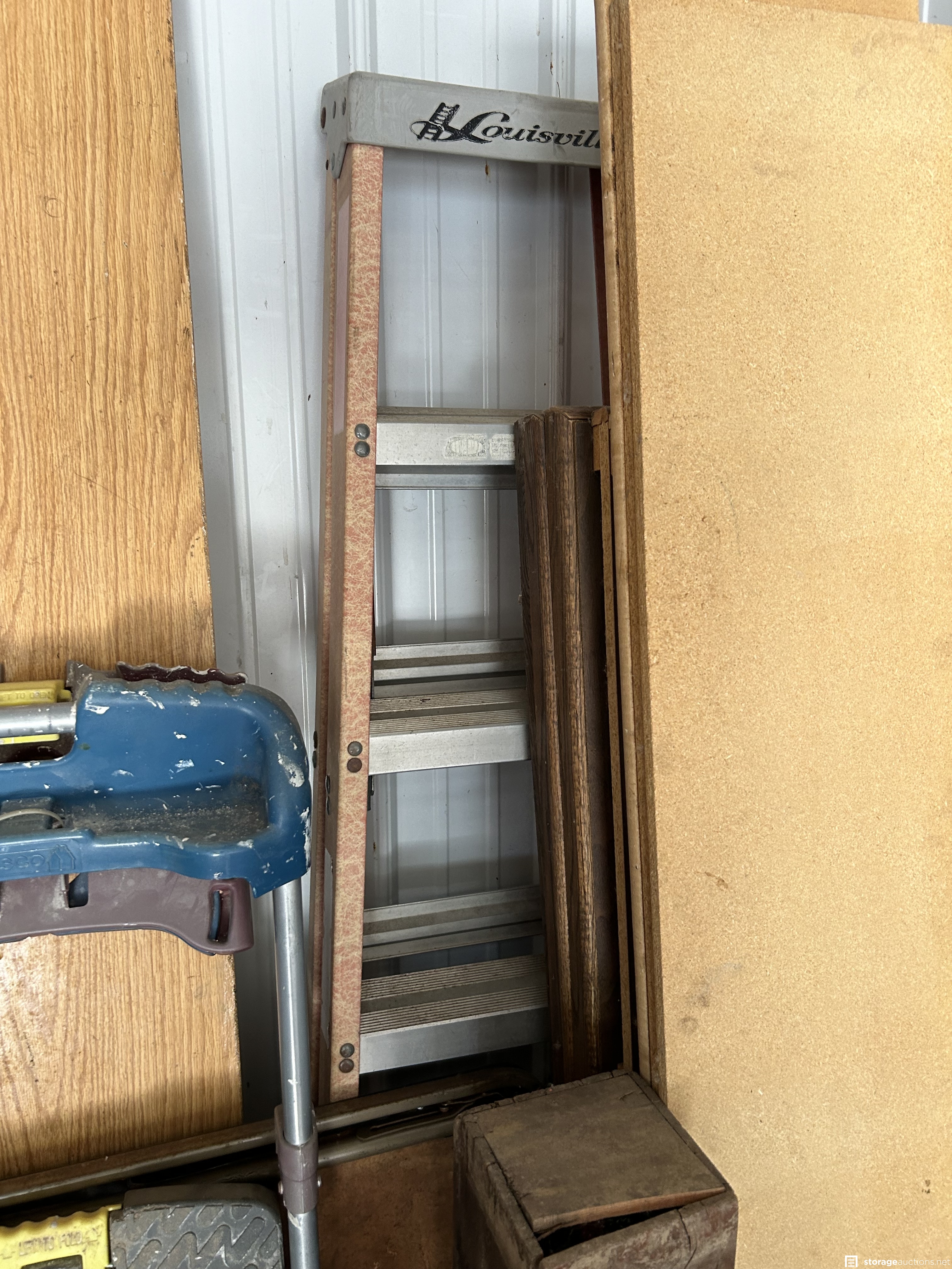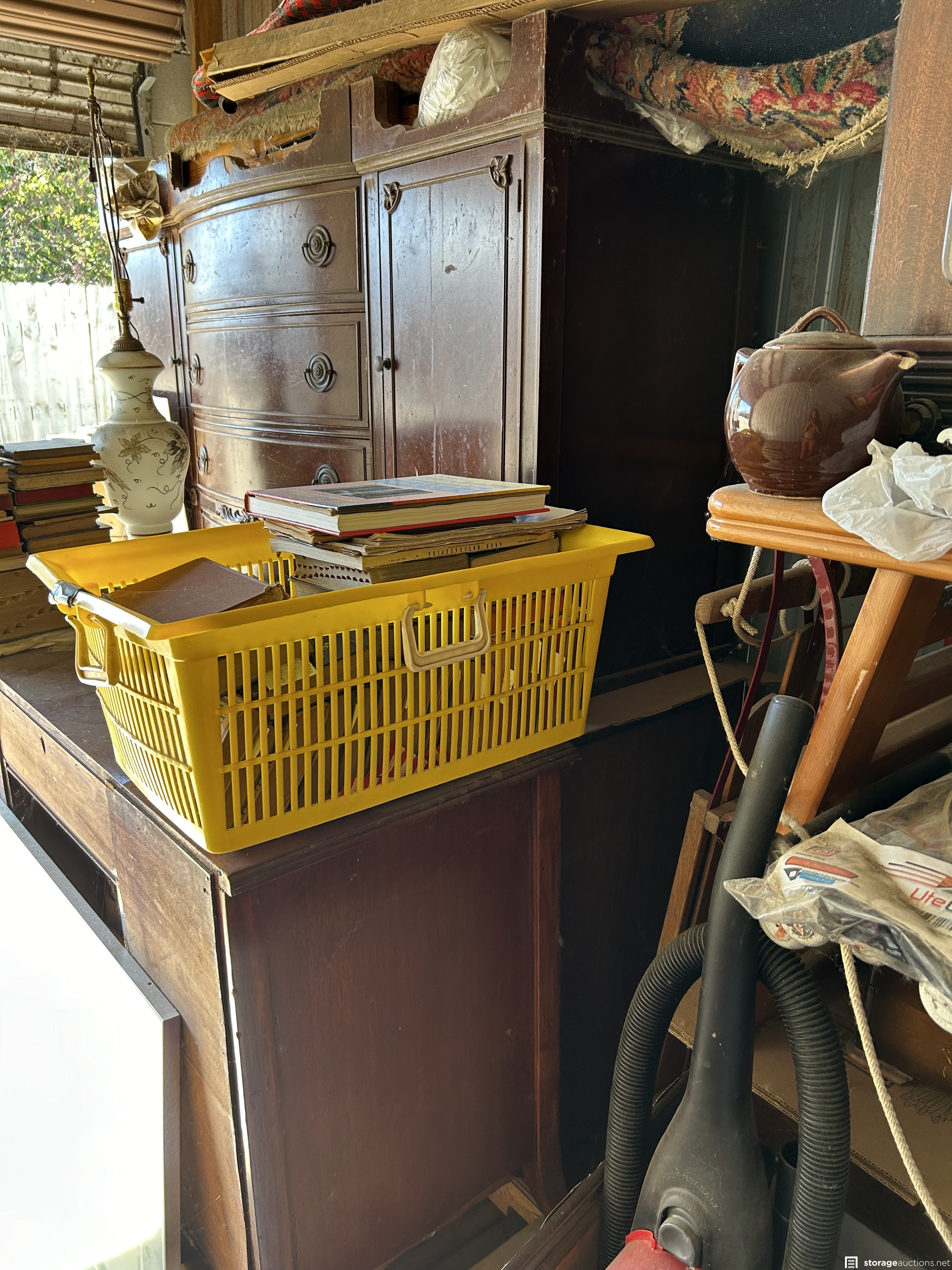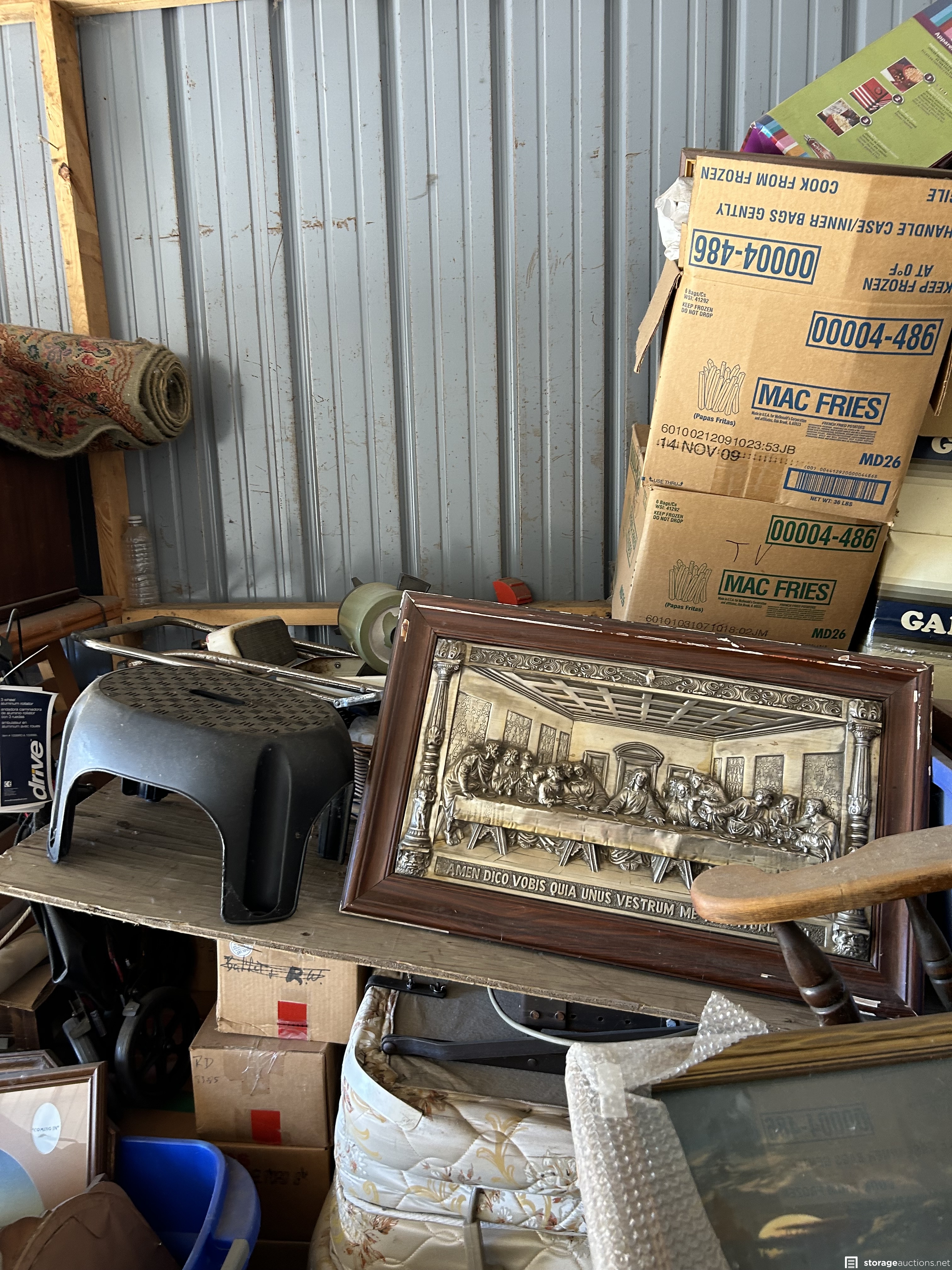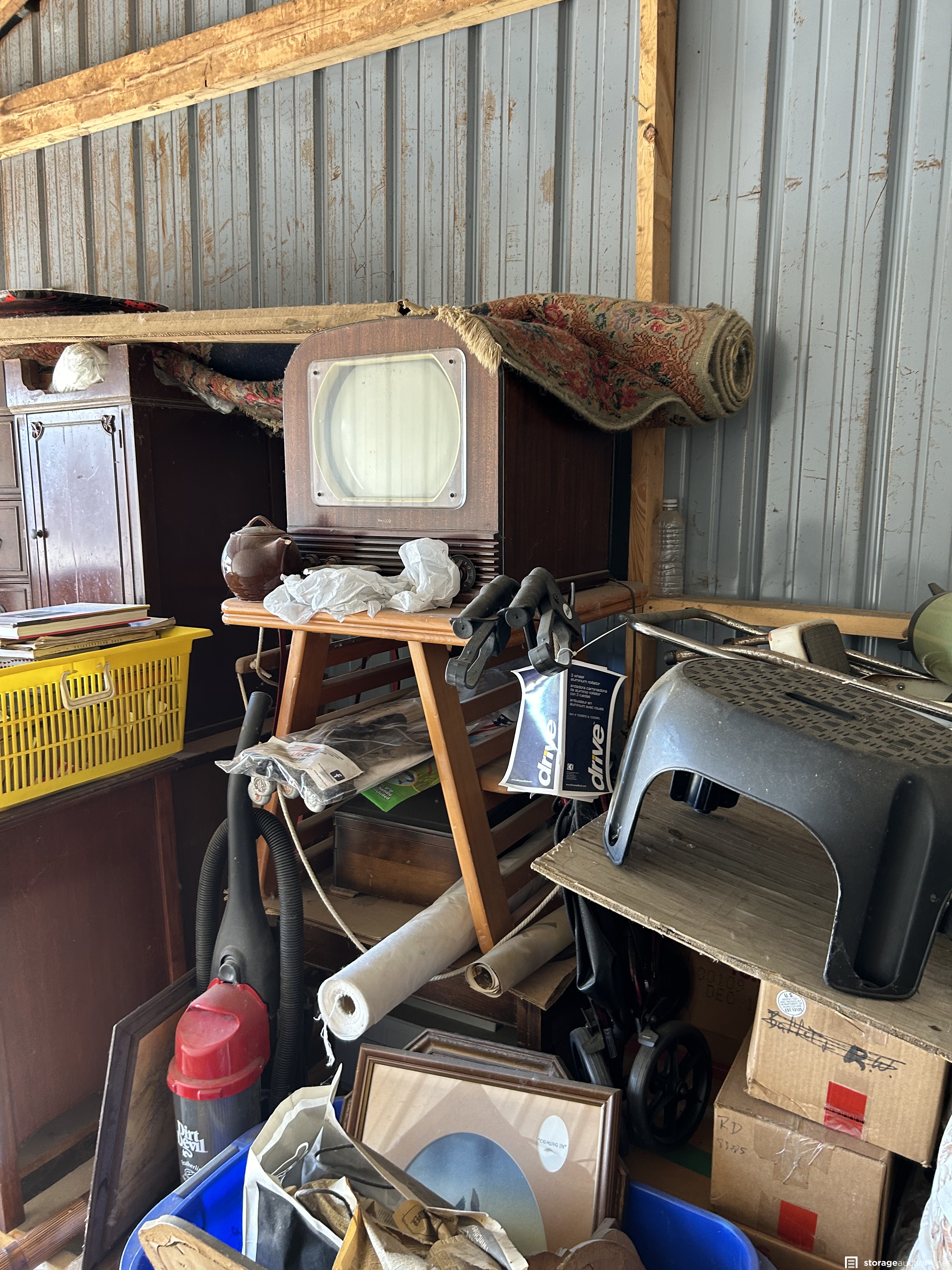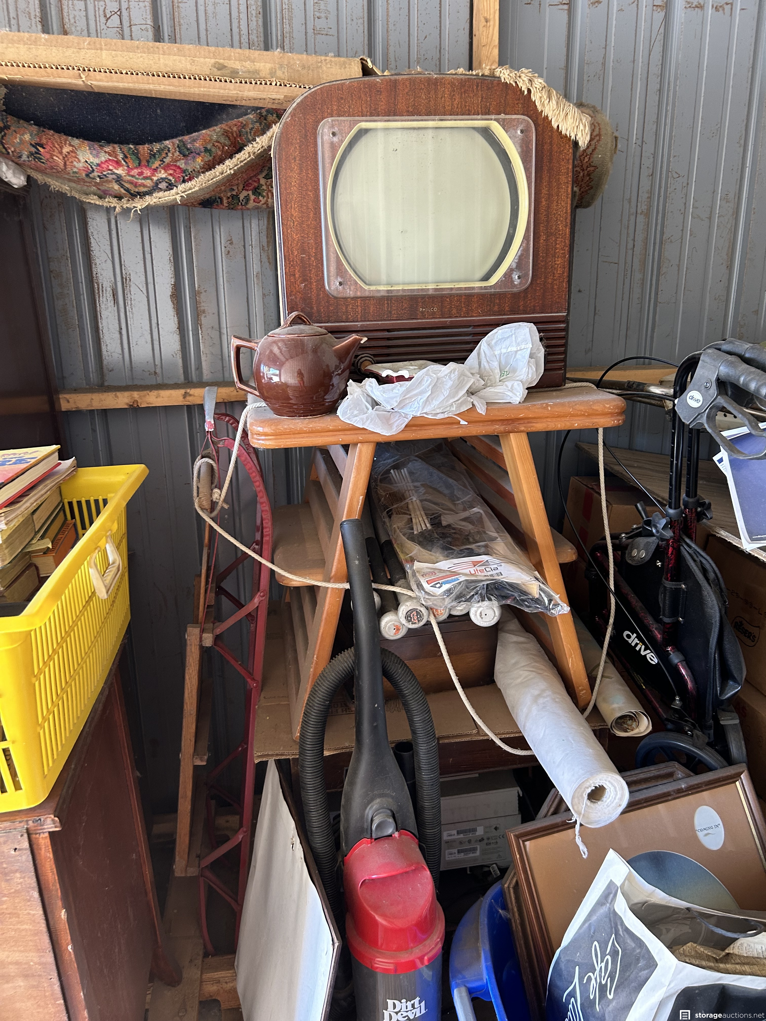 This unit appears to contain Wood desk, wood buffet, small table, Dirt Devil, antique Philco television, 2 toboggans, large Redwing pottery crocks , Last Supper, folding table, silver silverware, 6’ fiberglass ladder, step stool, generator, paper cutter