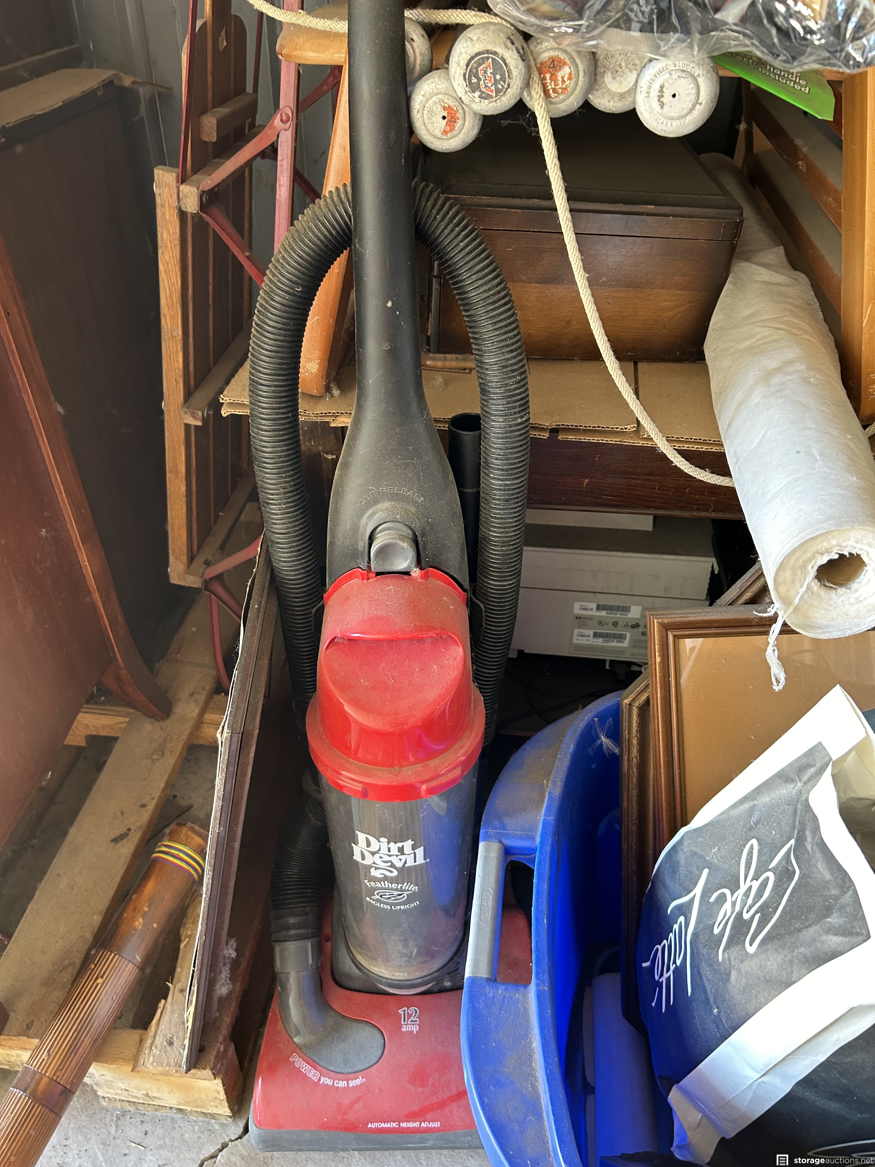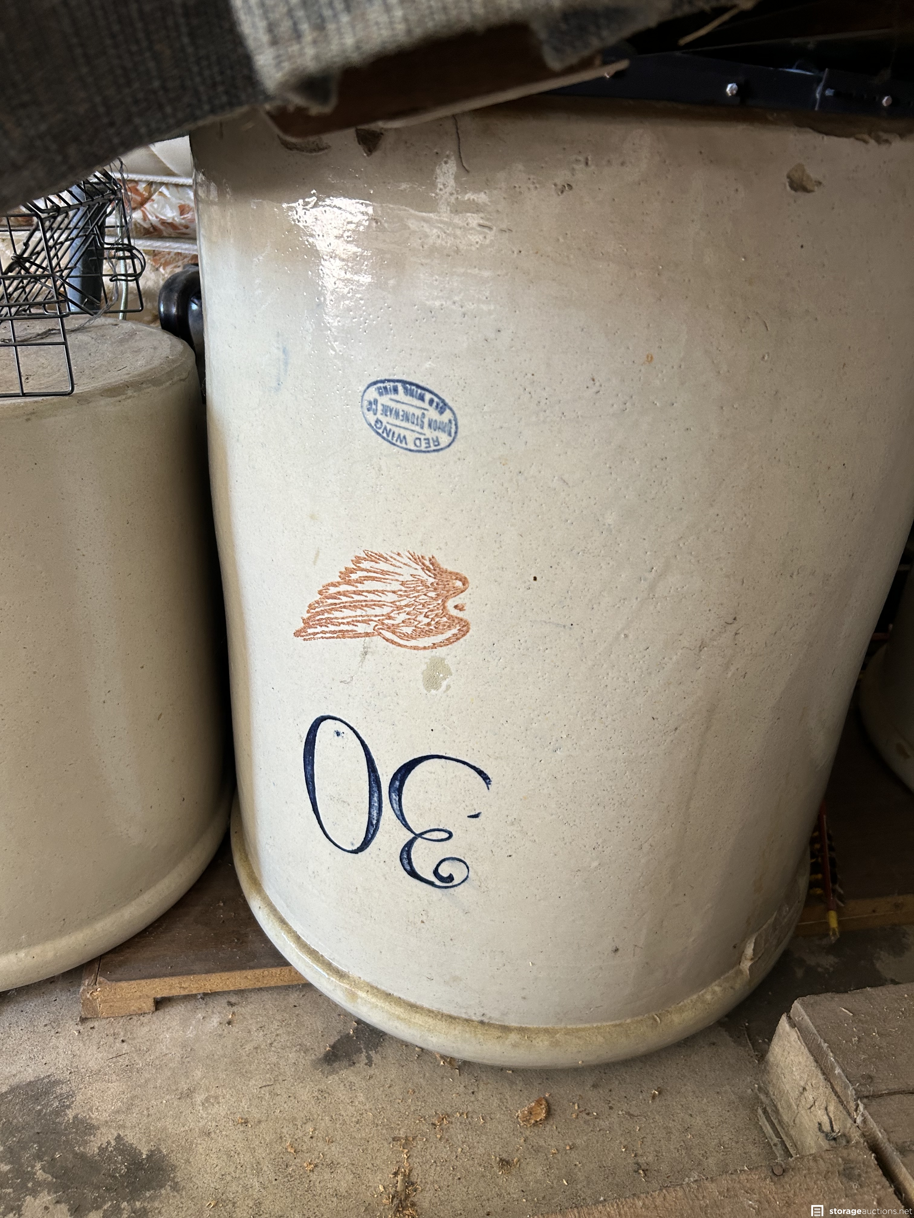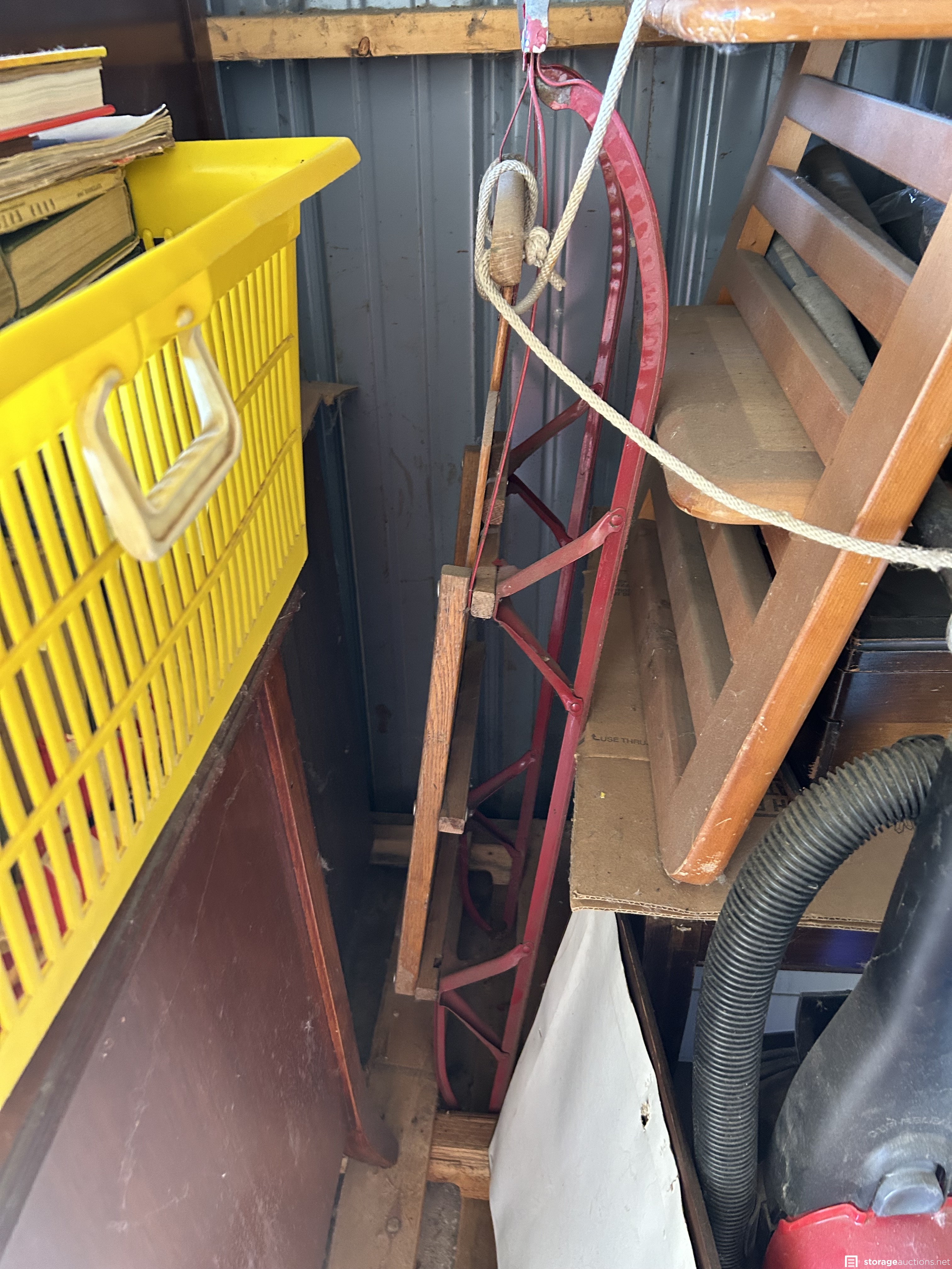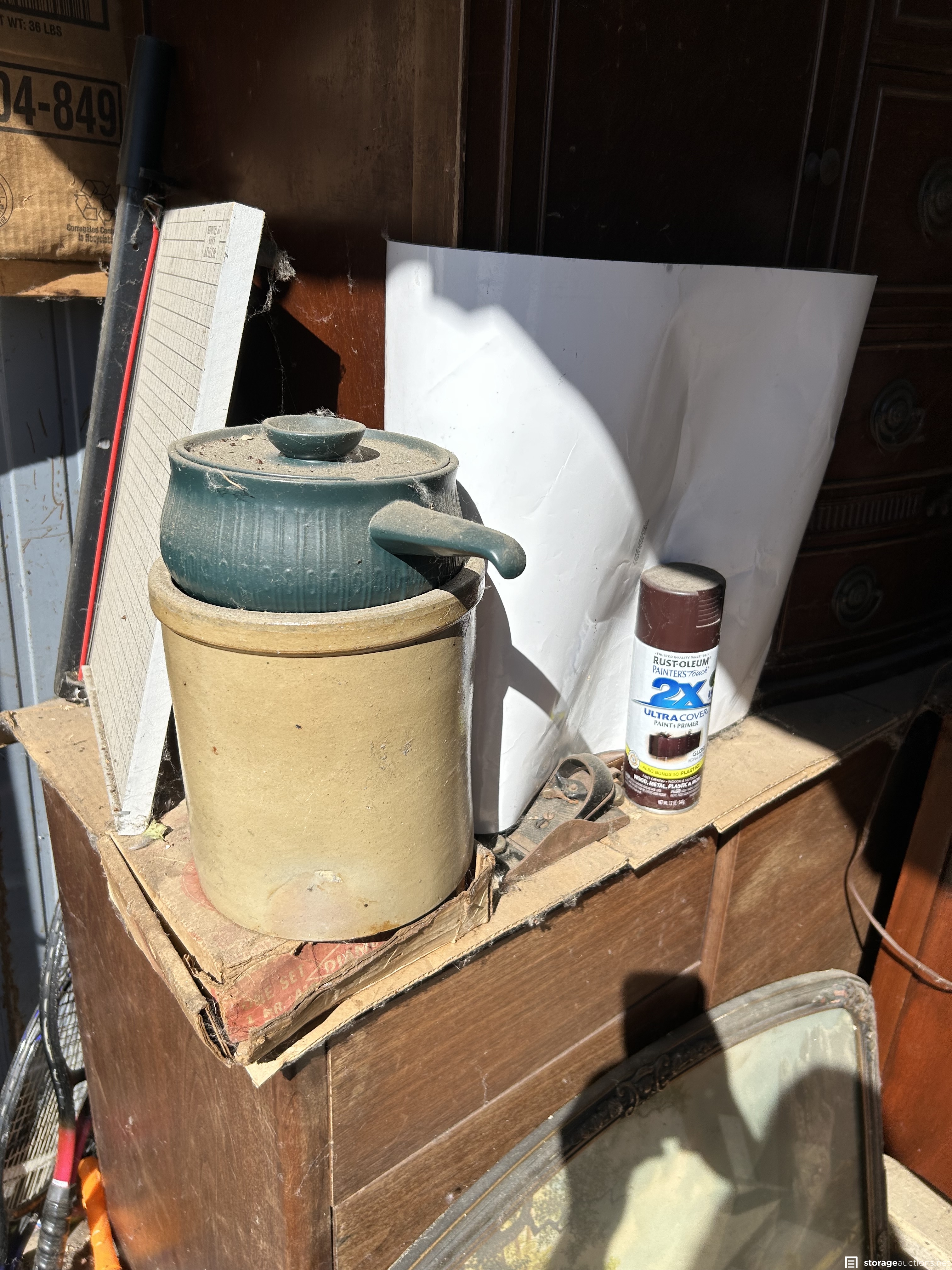 This unit appears to contain Wood desk, wood buffet, small table, Dirt Devil, antique Philco television, 2 toboggans, large Redwing pottery crocks , Last Supper, folding table, silver silverware, 6’ fiberglass ladder, step stool, generator, paper cutter