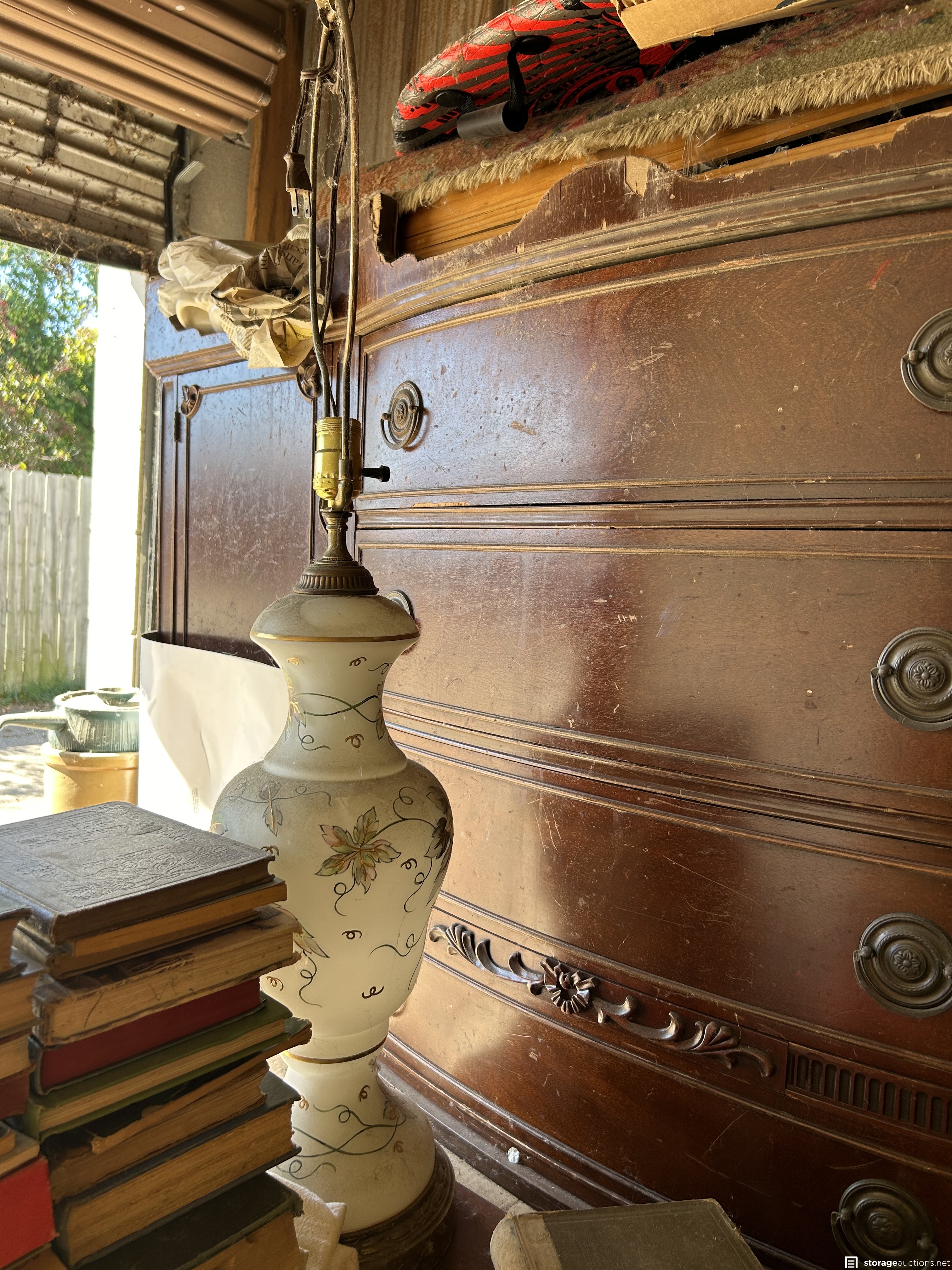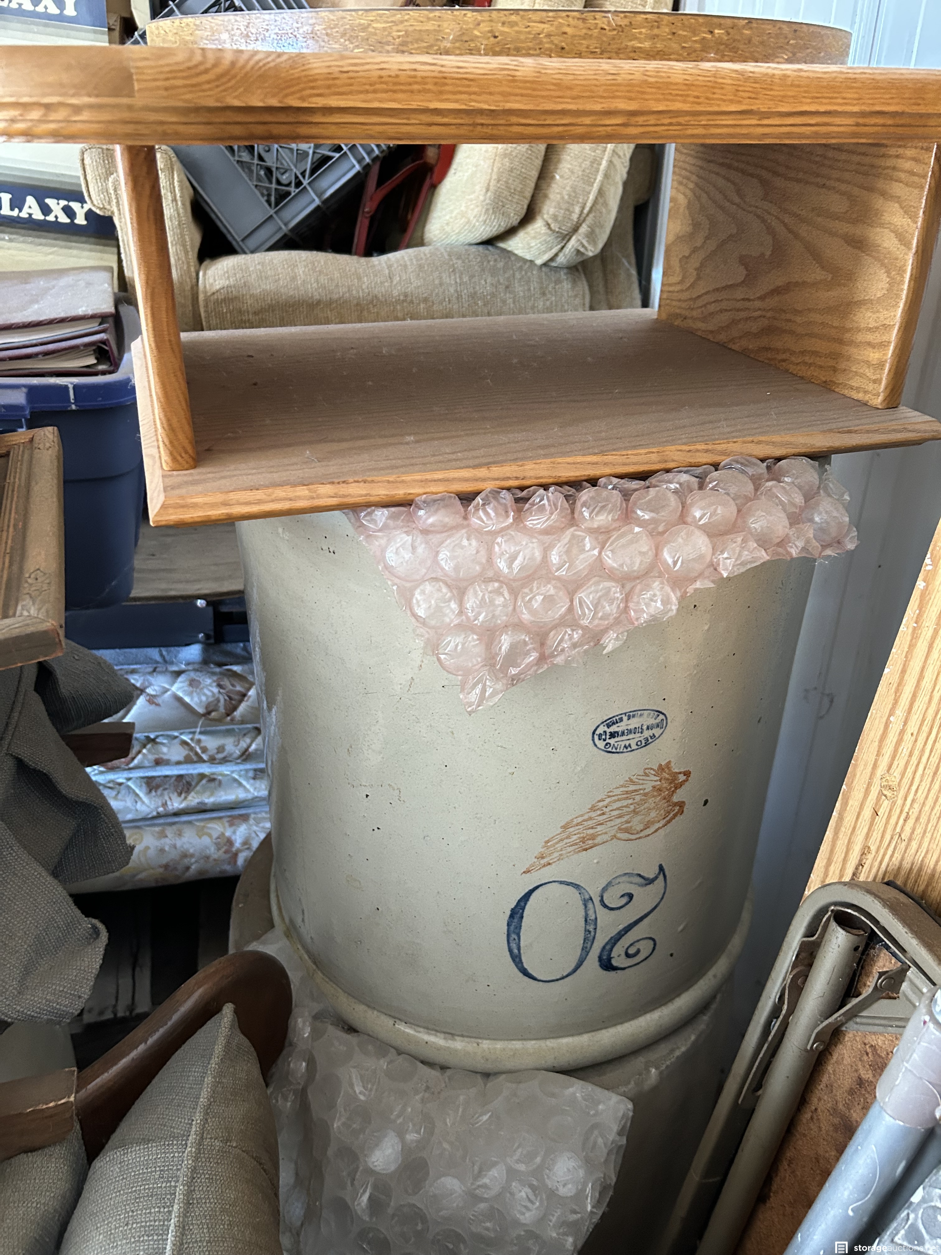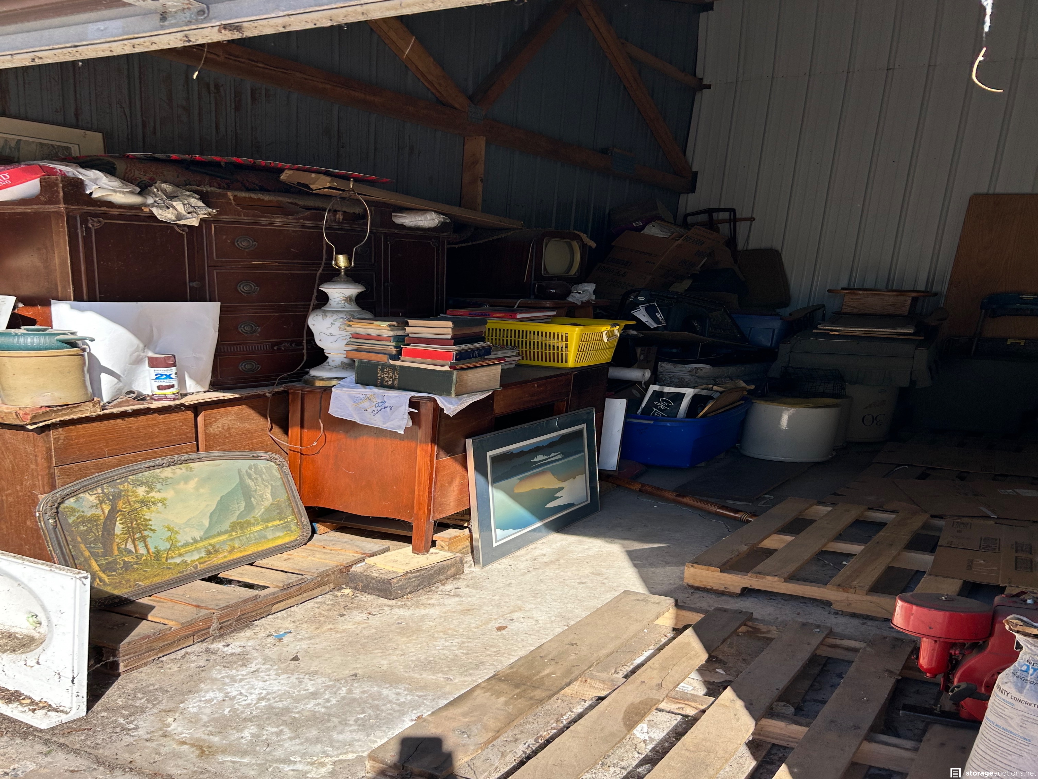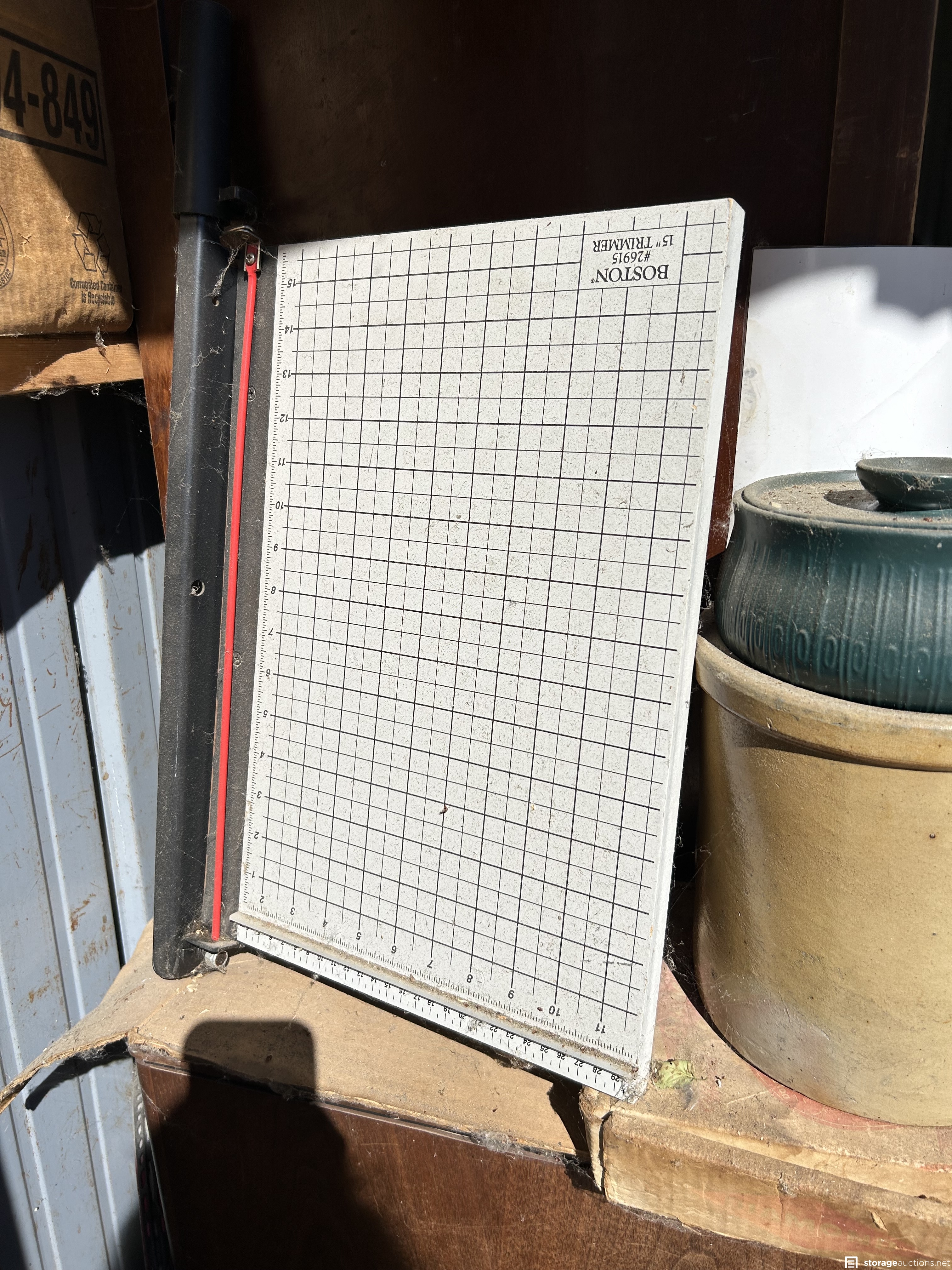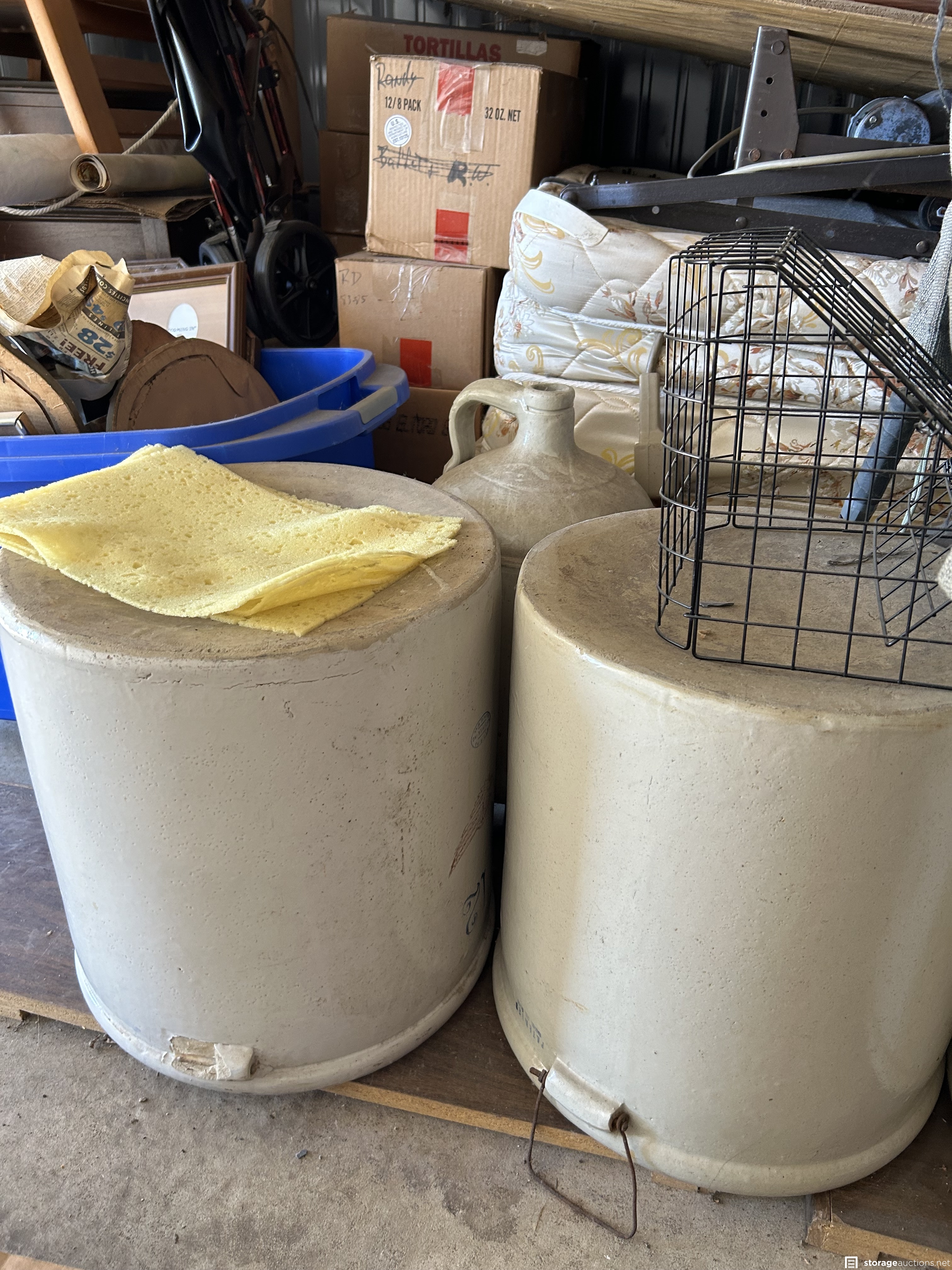 This unit appears to contain Wood desk, wood buffet, small table, Dirt Devil, antique Philco television, 2 toboggans, large Redwing pottery crocks , Last Supper, folding table, silver silverware, 6’ fiberglass ladder, step stool, generator, paper cutter