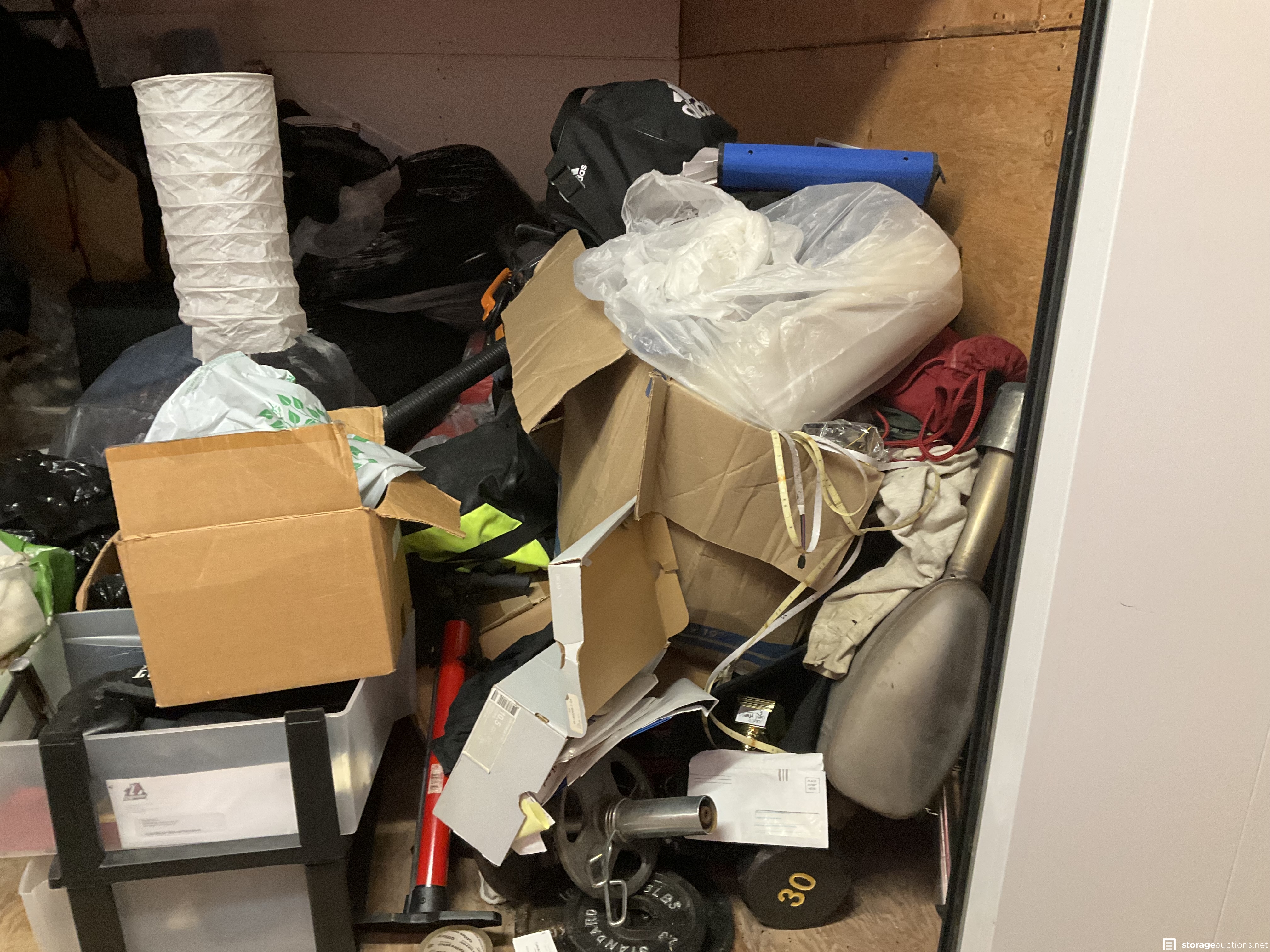 weights, light, football pads, lounge chairs, misc boxes, misc bags, light, vacuum