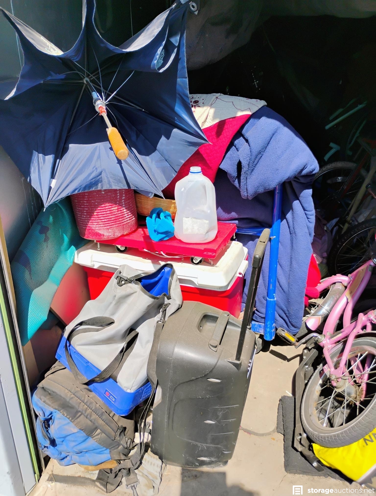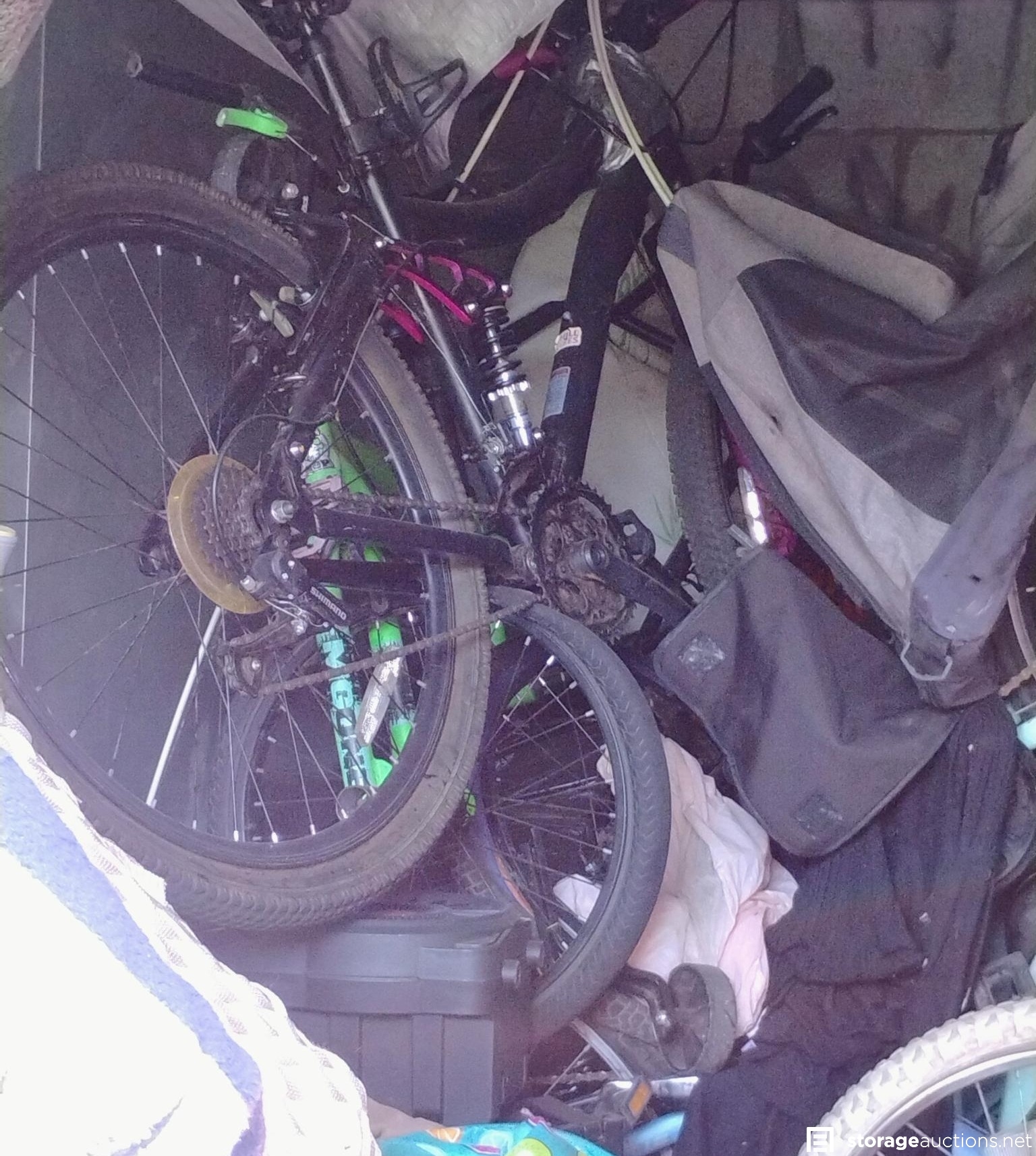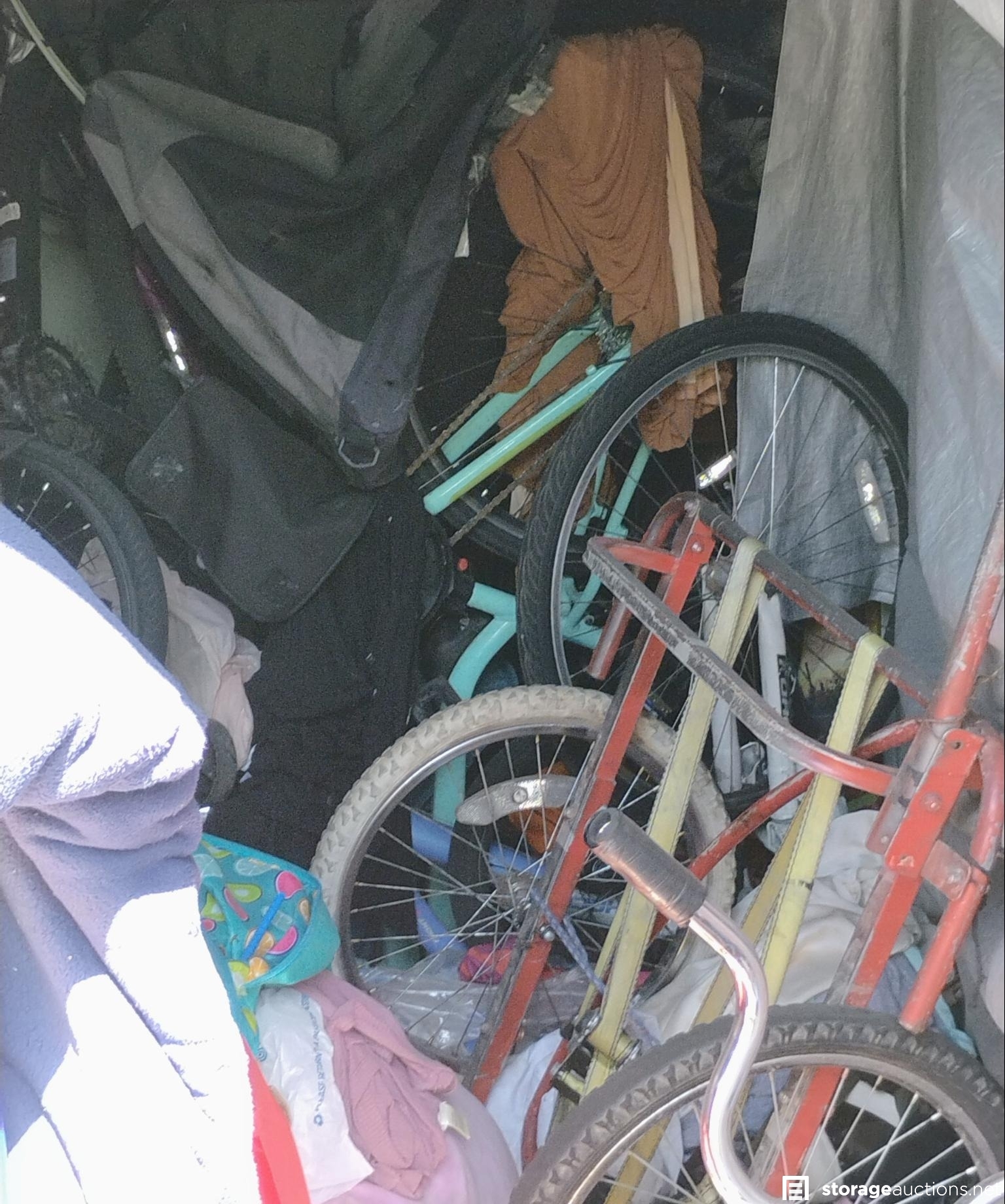 Bicycles, bins, backpacks, clothes and miscellaneous items.