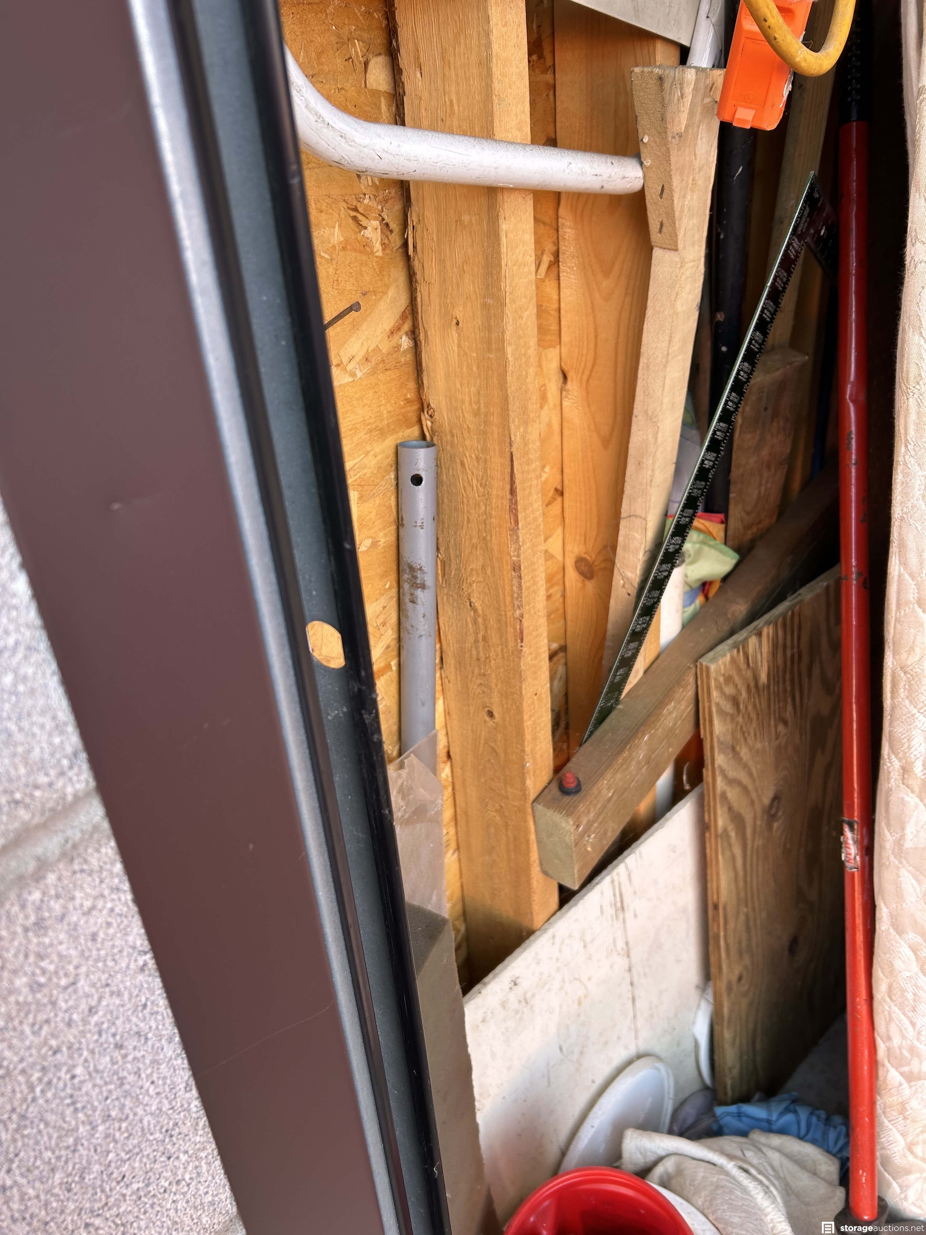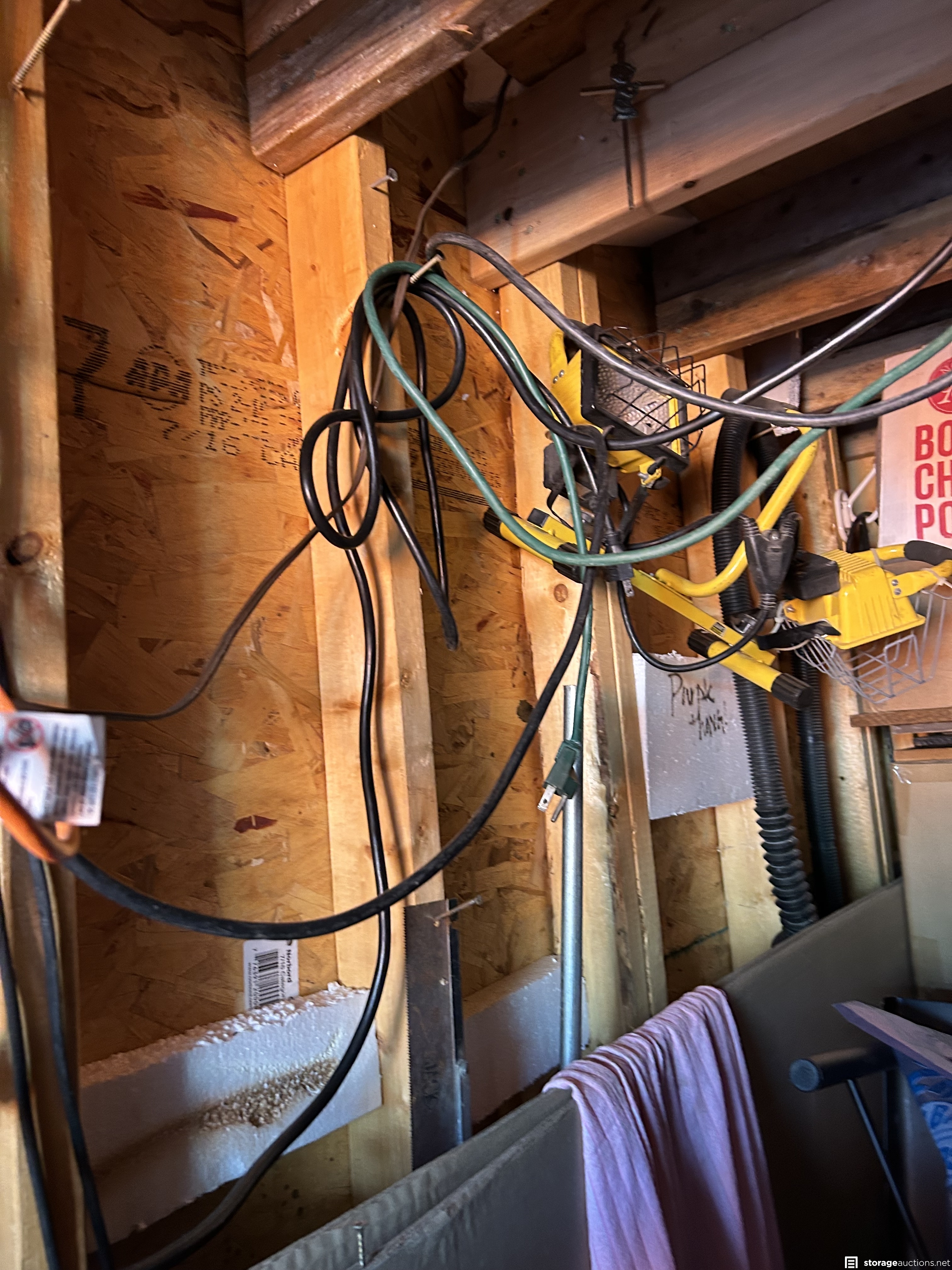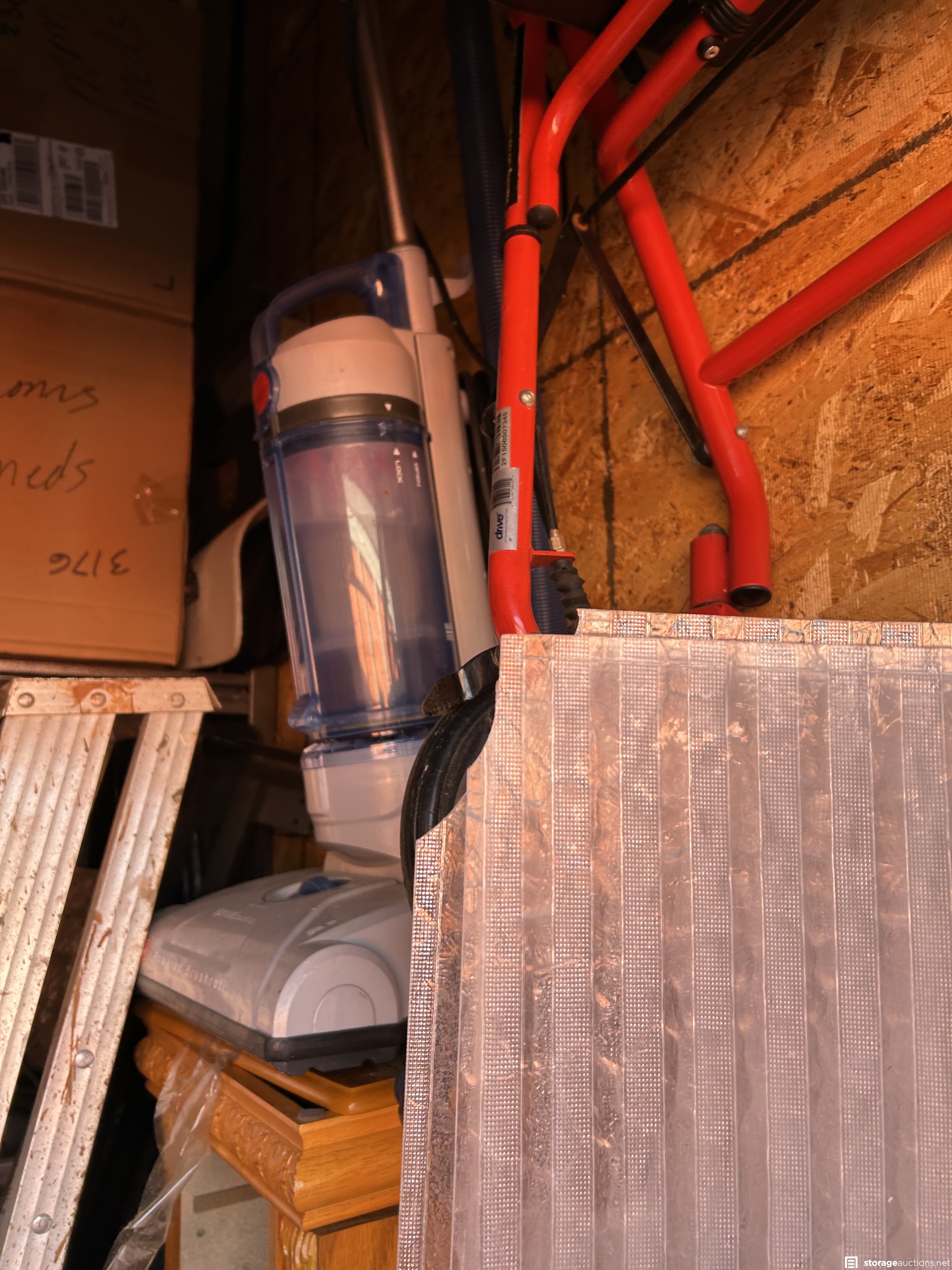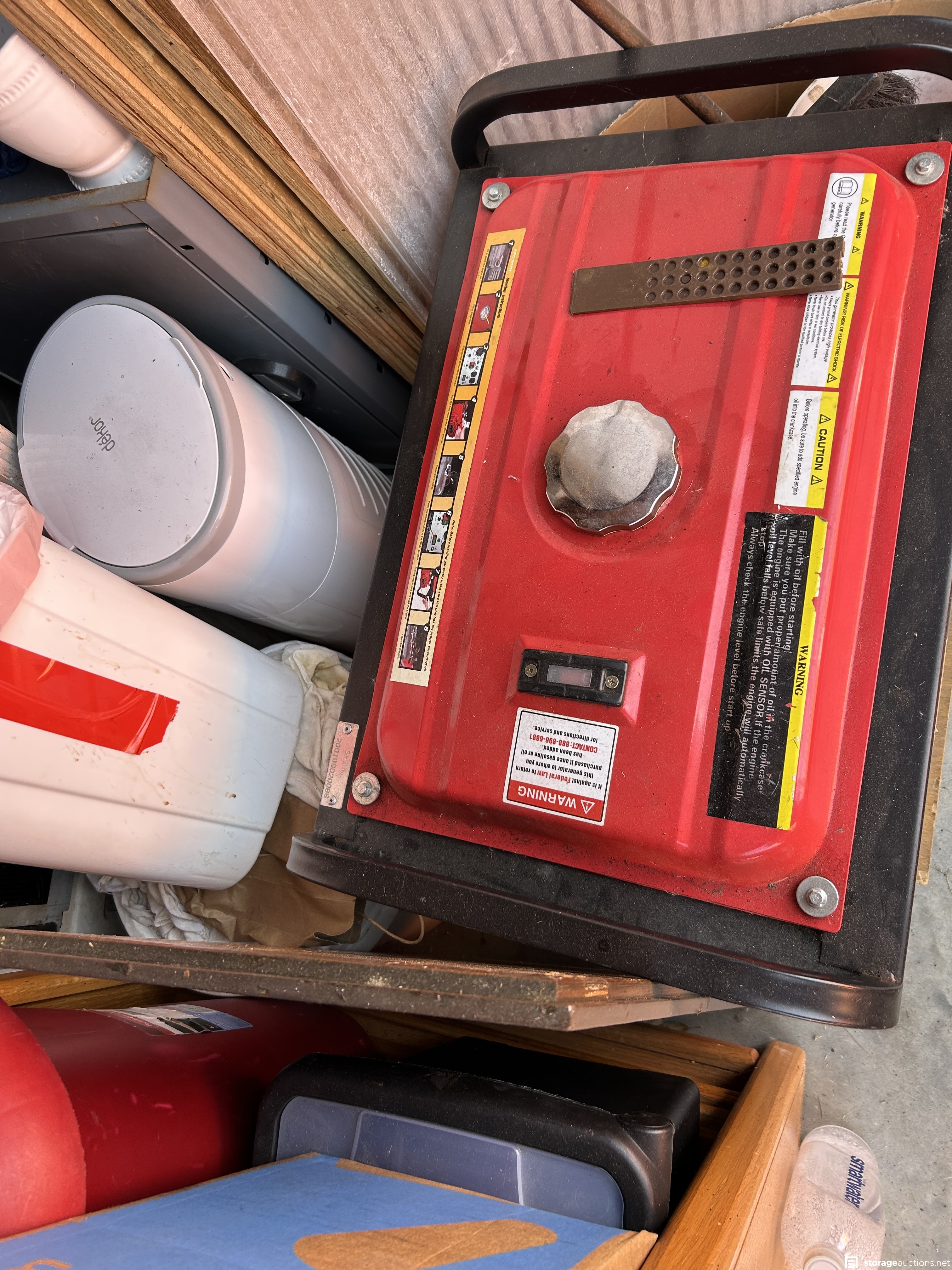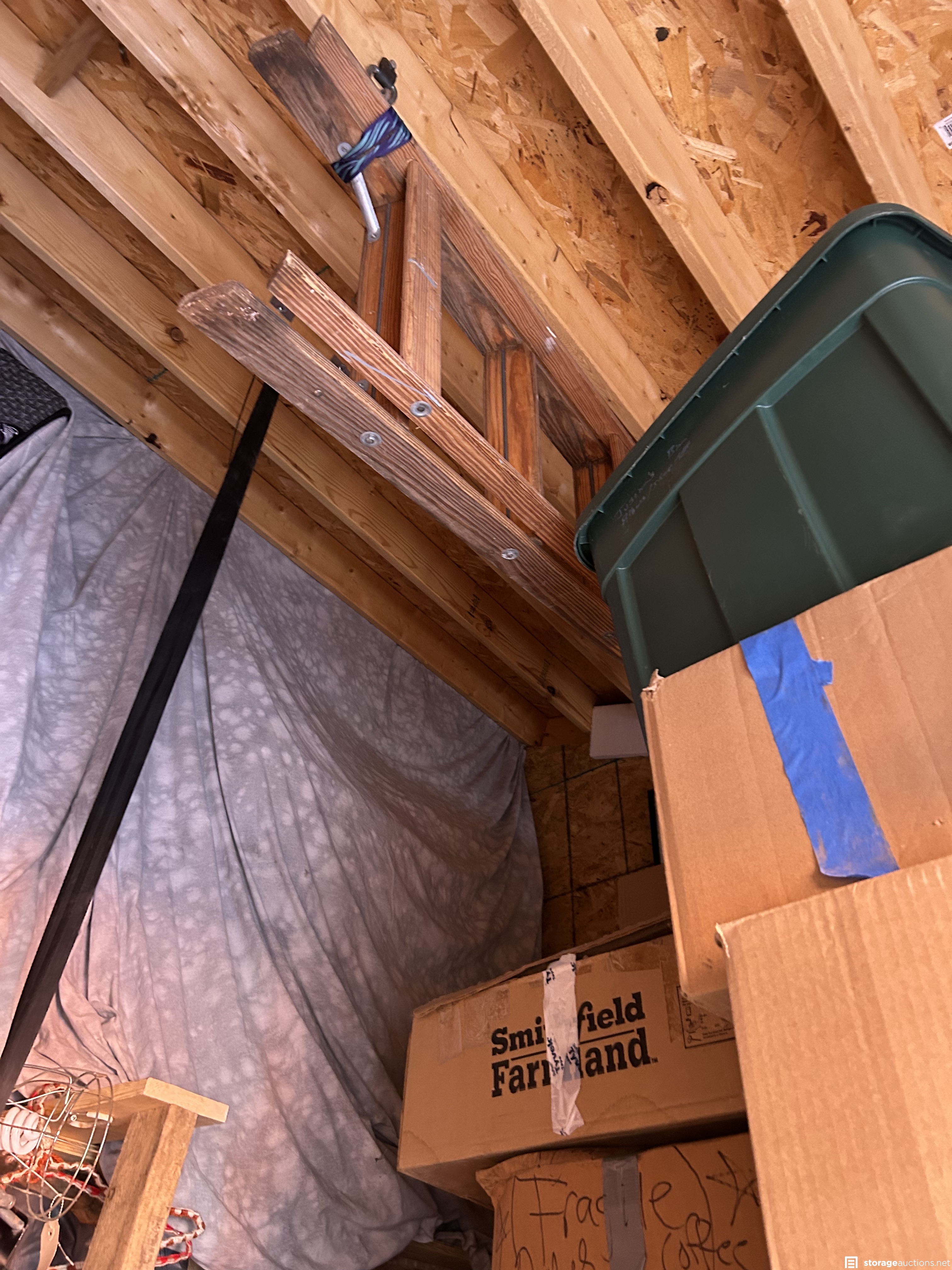 Luggage, generator, wood ladder, work light, flat screen tv, safe, clothing, coffee table, wood dresser, boxes unknown, aluminum ladder, walker, metal shelving, Hoover vacuum, shovels