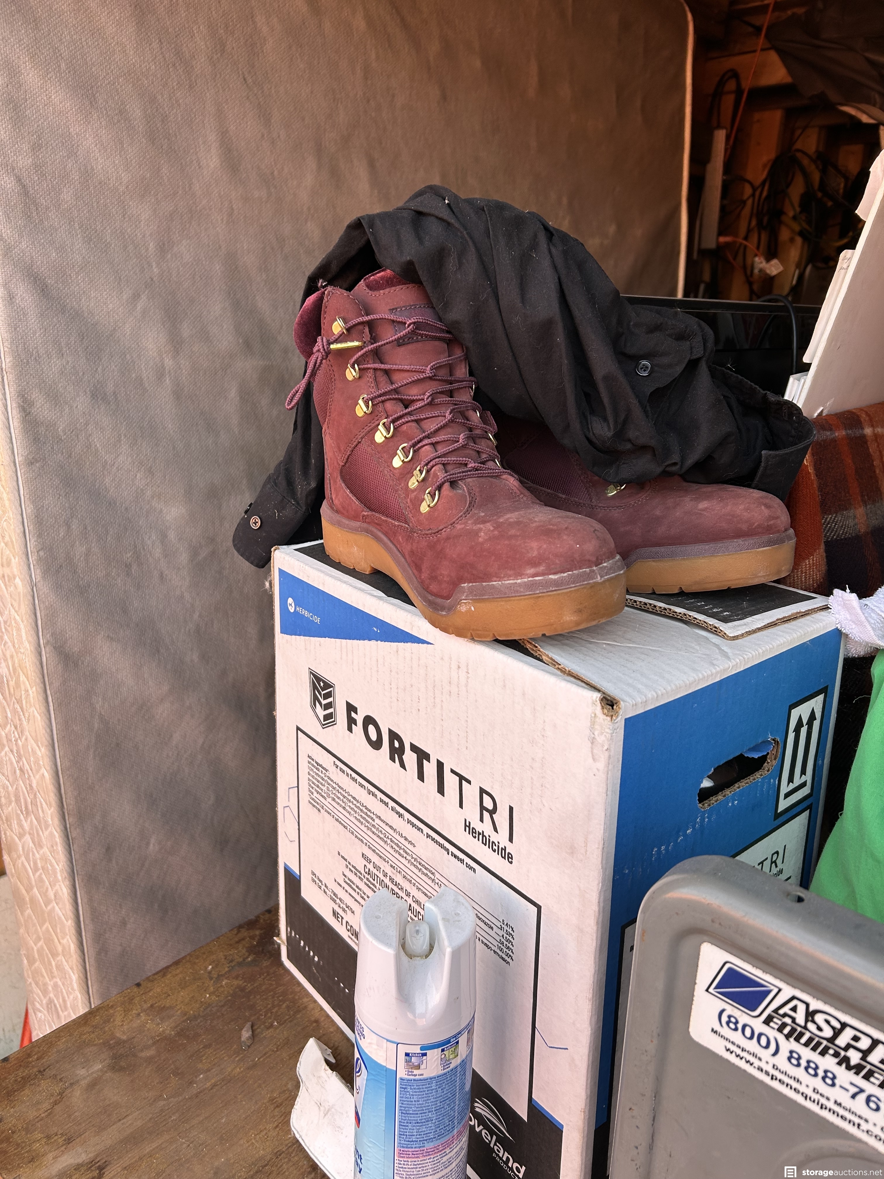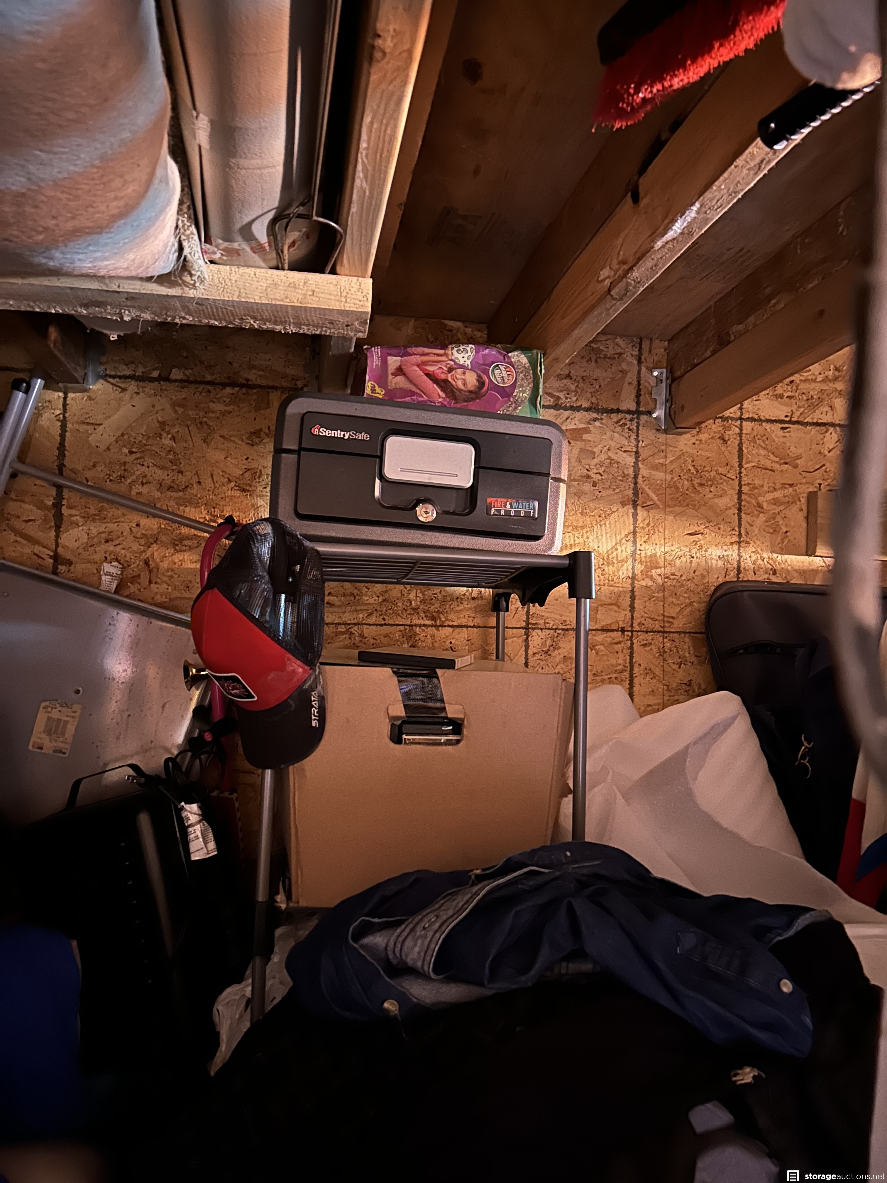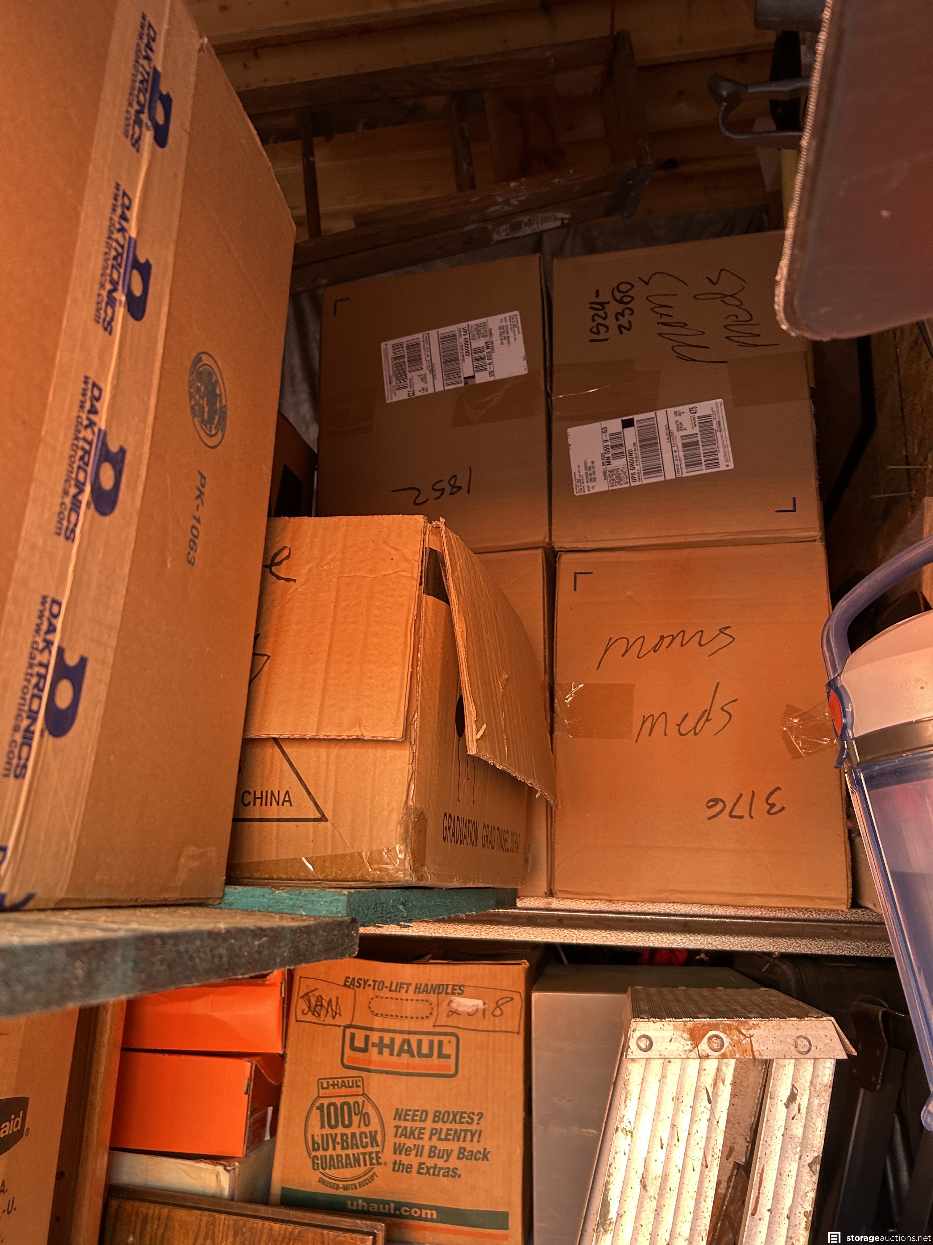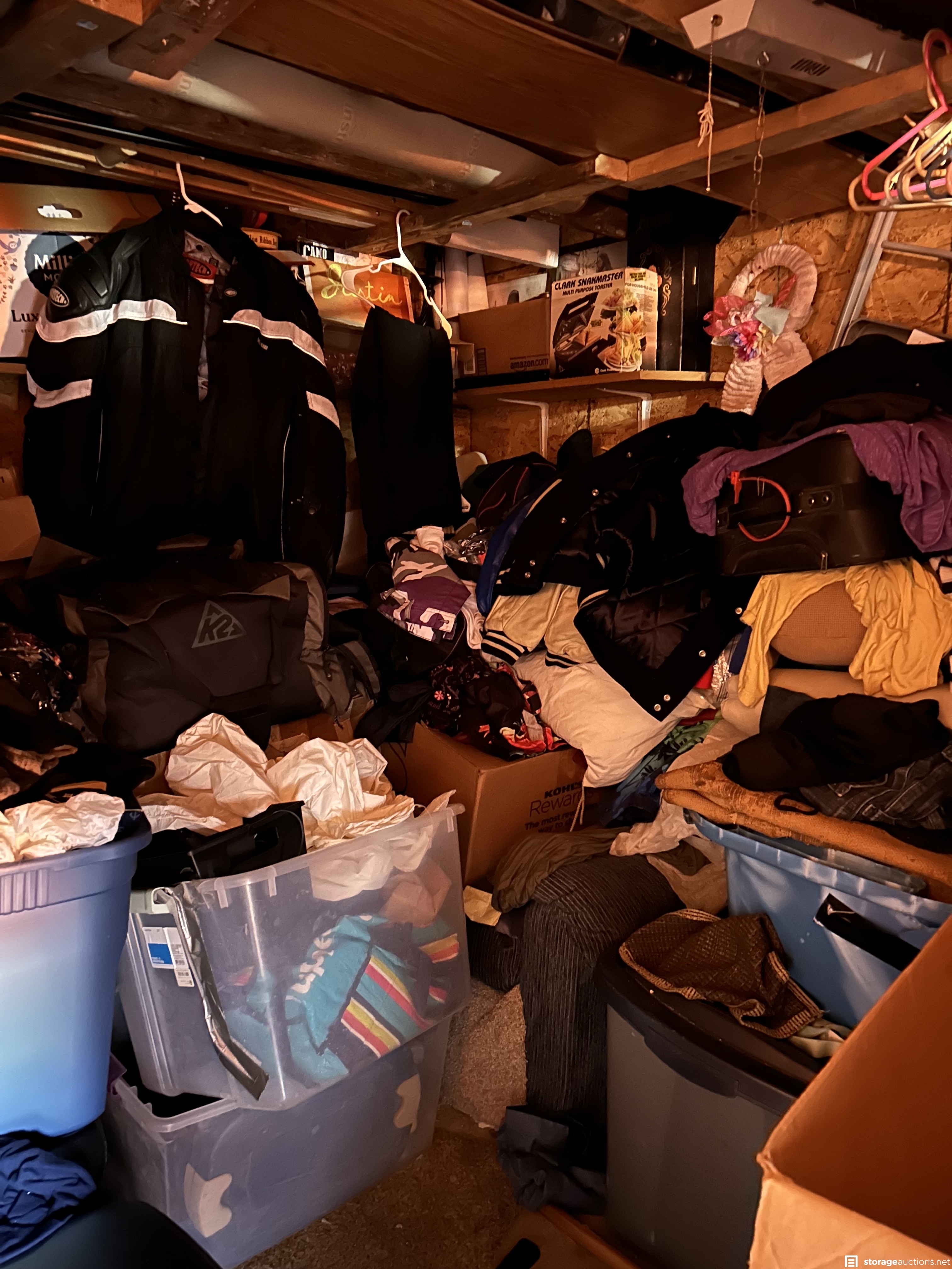 Luggage, generator, wood ladder, work light, flat screen tv, safe, clothing, coffee table, wood dresser, boxes unknown, aluminum ladder, walker, metal shelving, Hoover vacuum, shovels