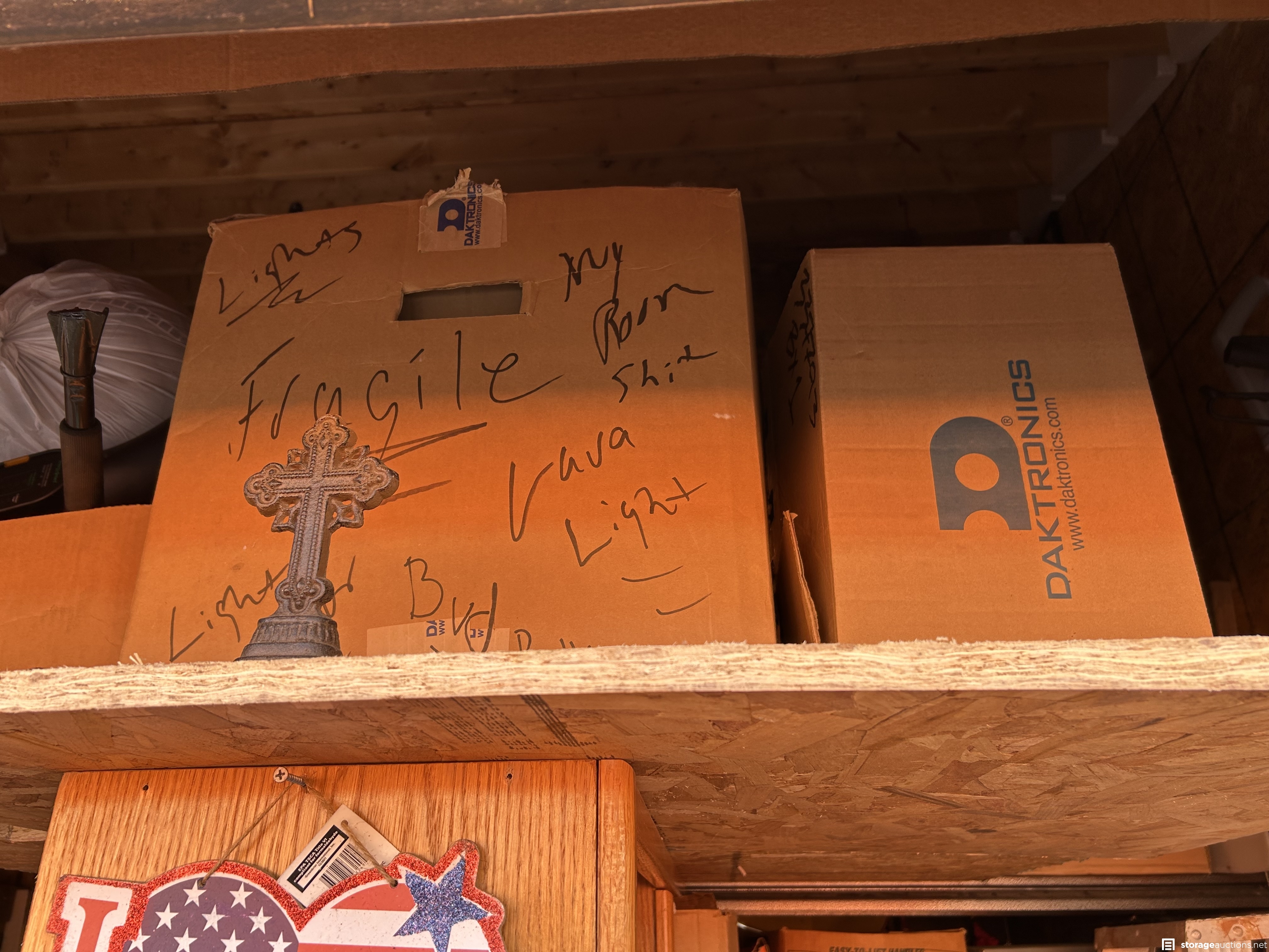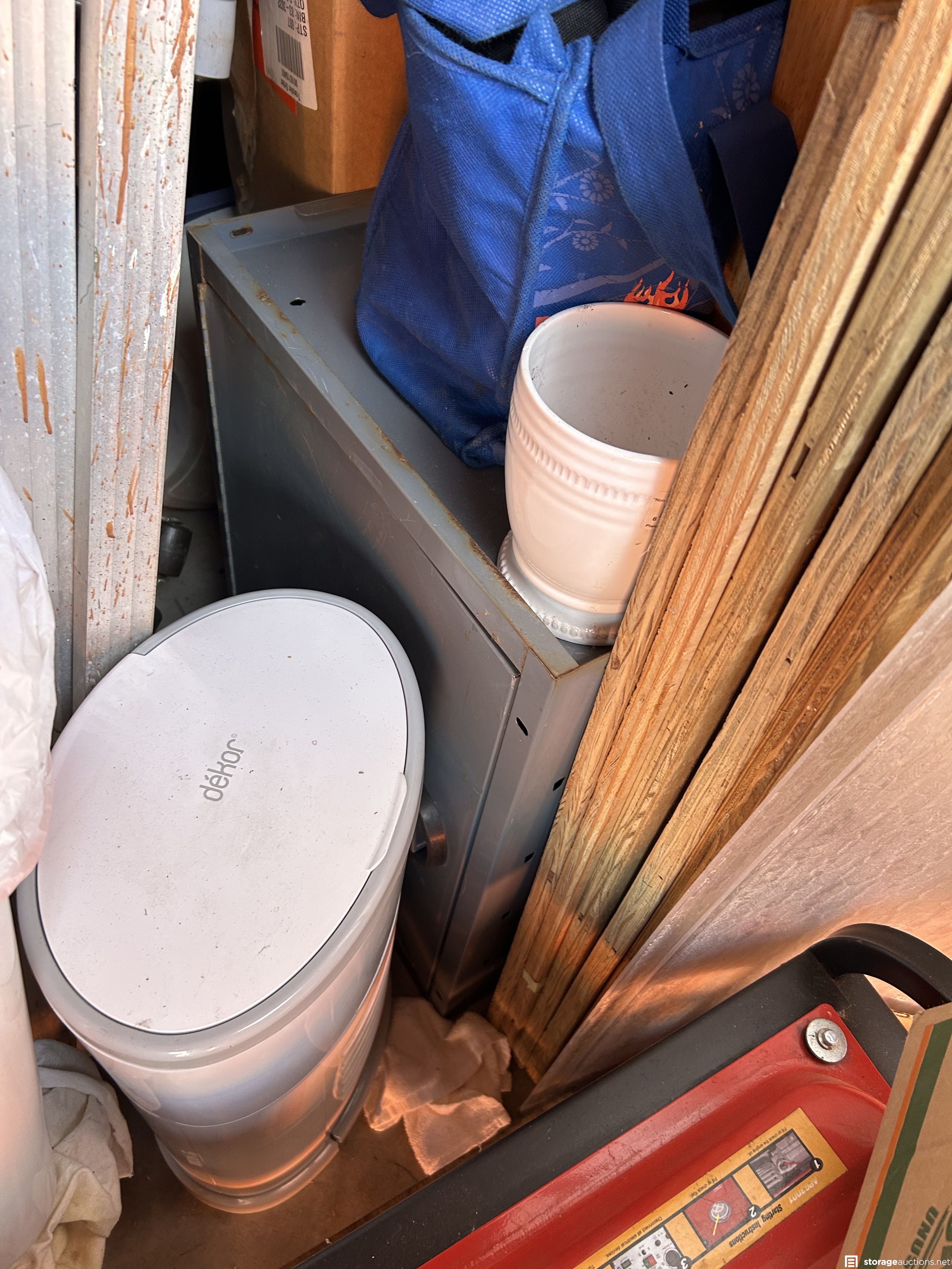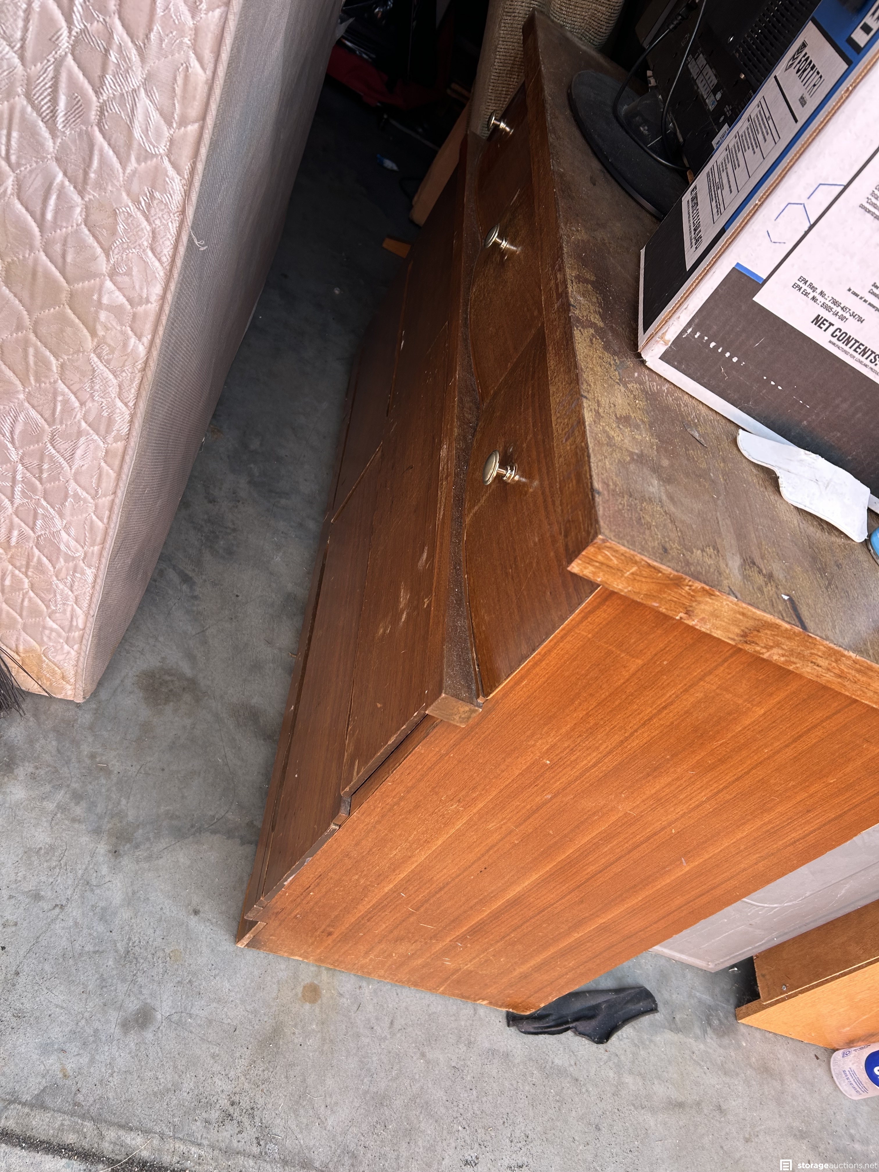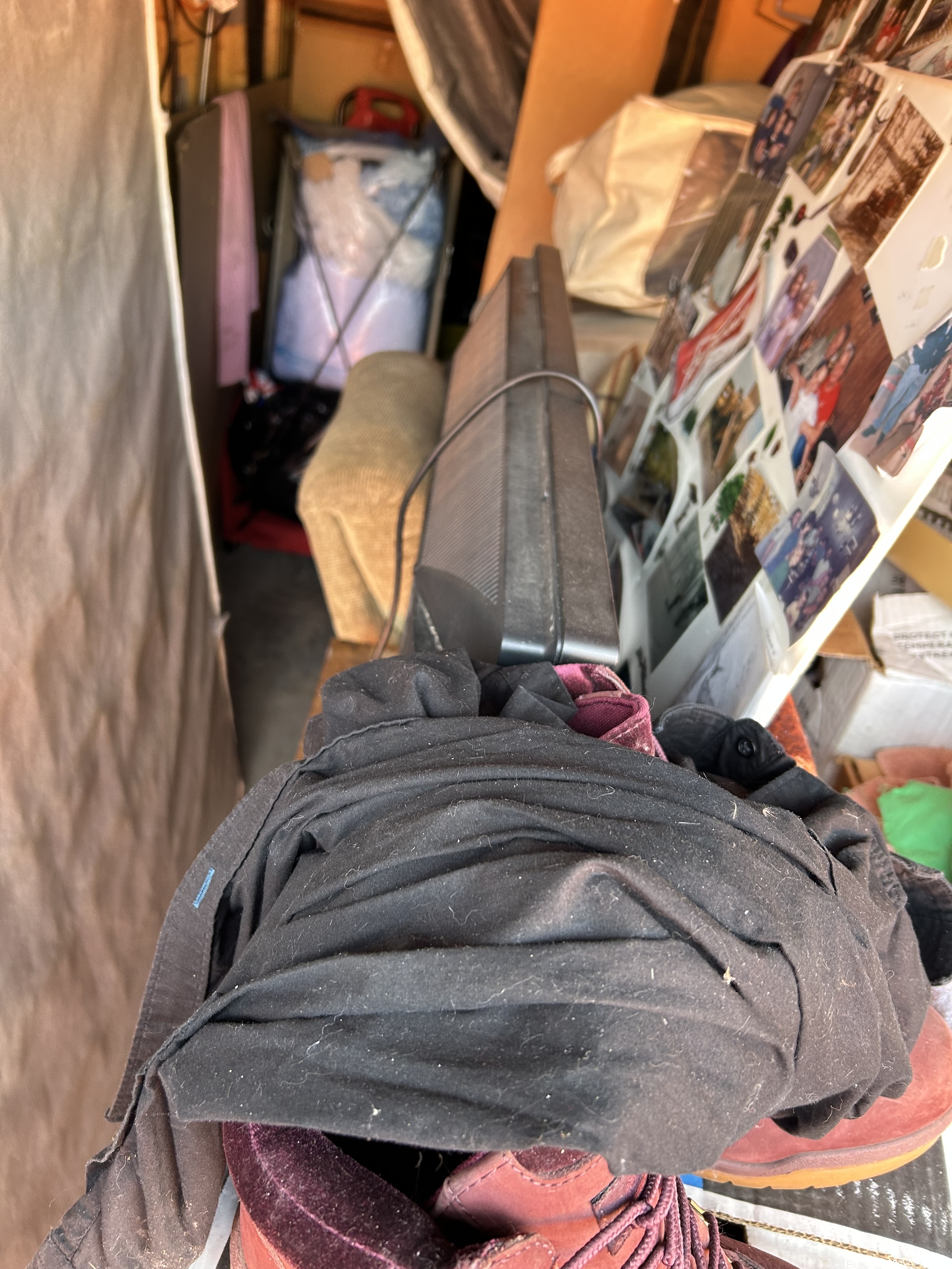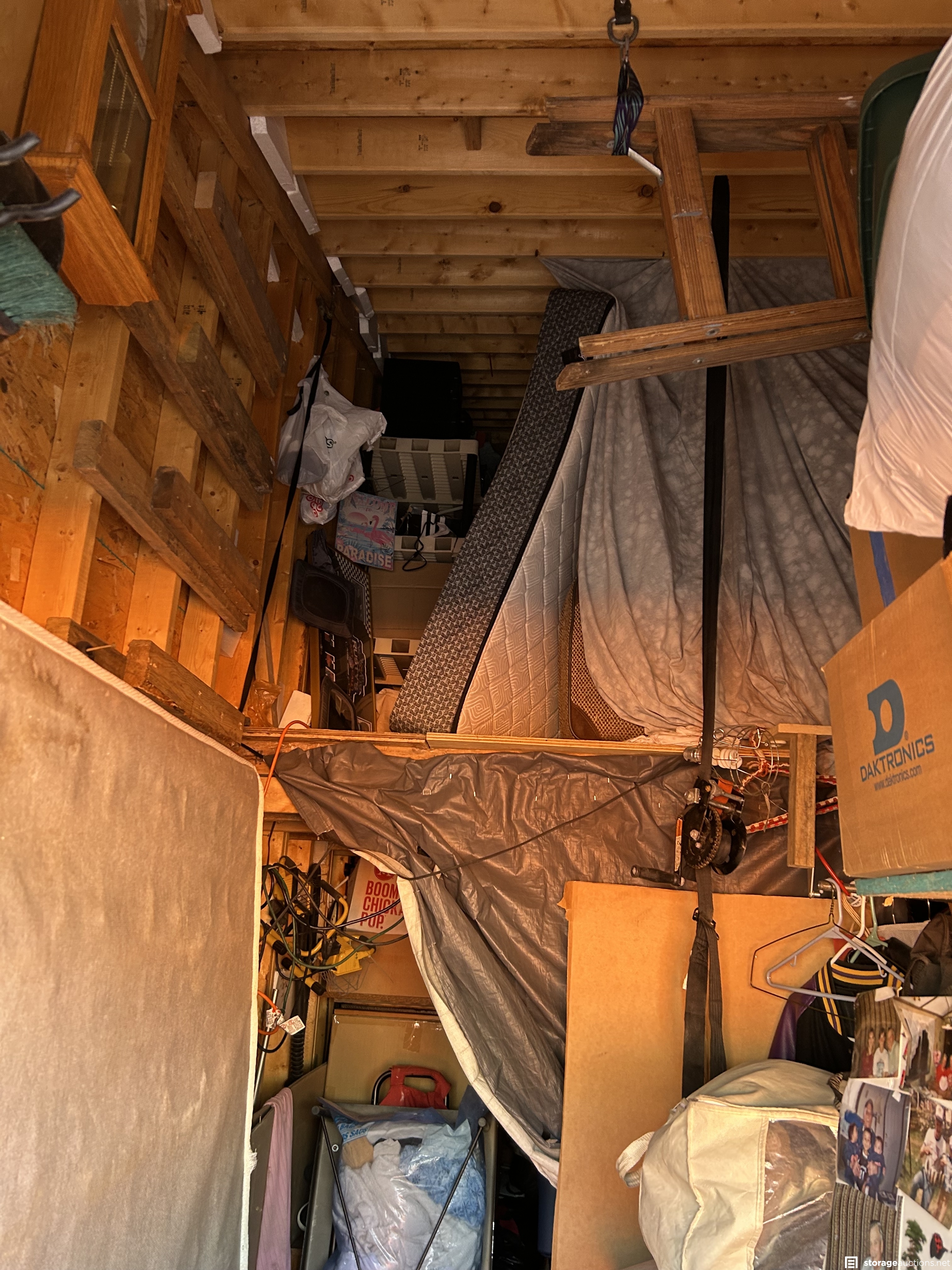 Luggage, generator, wood ladder, work light, flat screen tv, safe, clothing, coffee table, wood dresser, boxes unknown, aluminum ladder, walker, metal shelving, Hoover vacuum, shovels