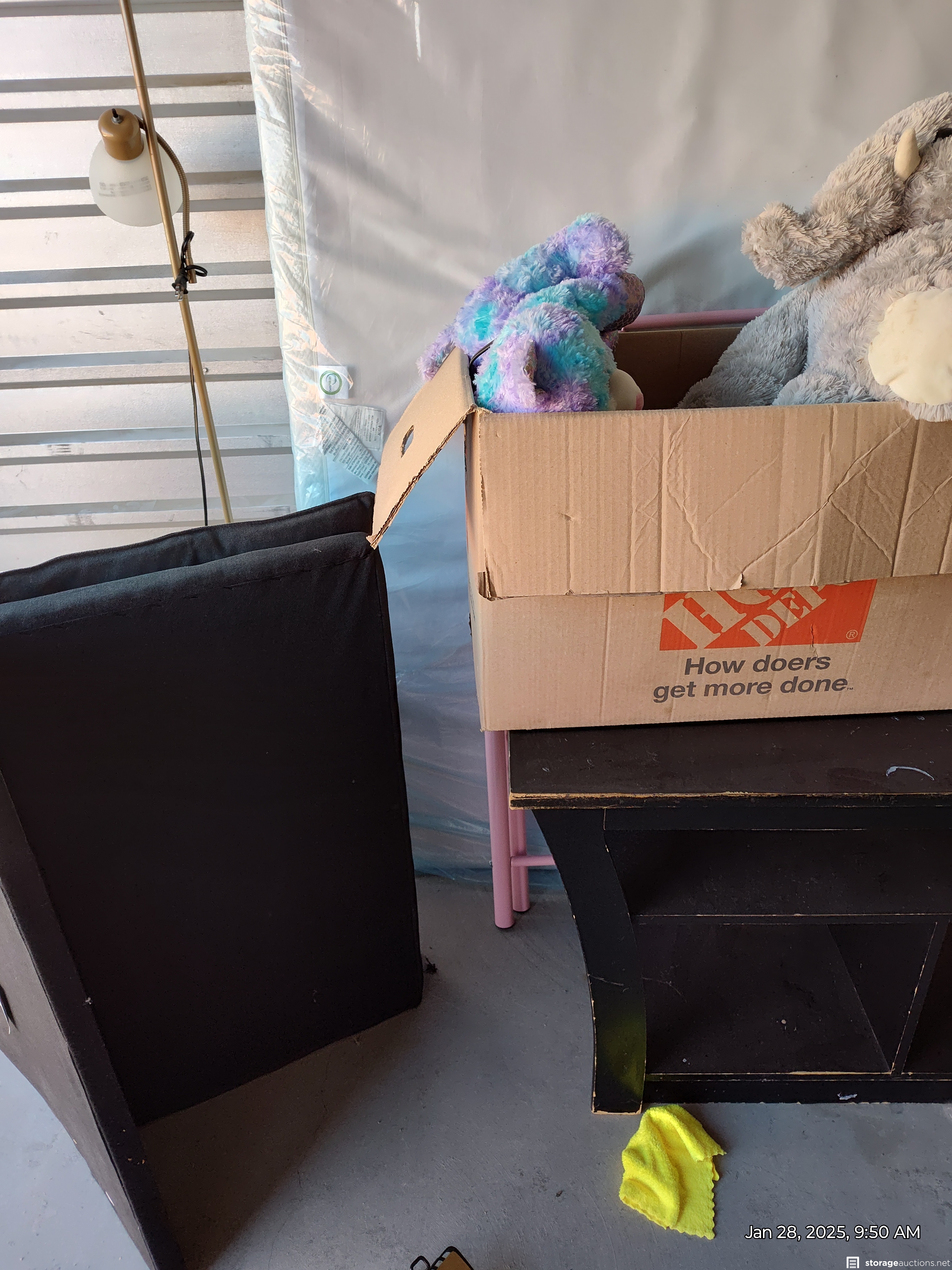 This unit has a stand, toys, mattress, art, chair, tv, boxes, totes, mirror