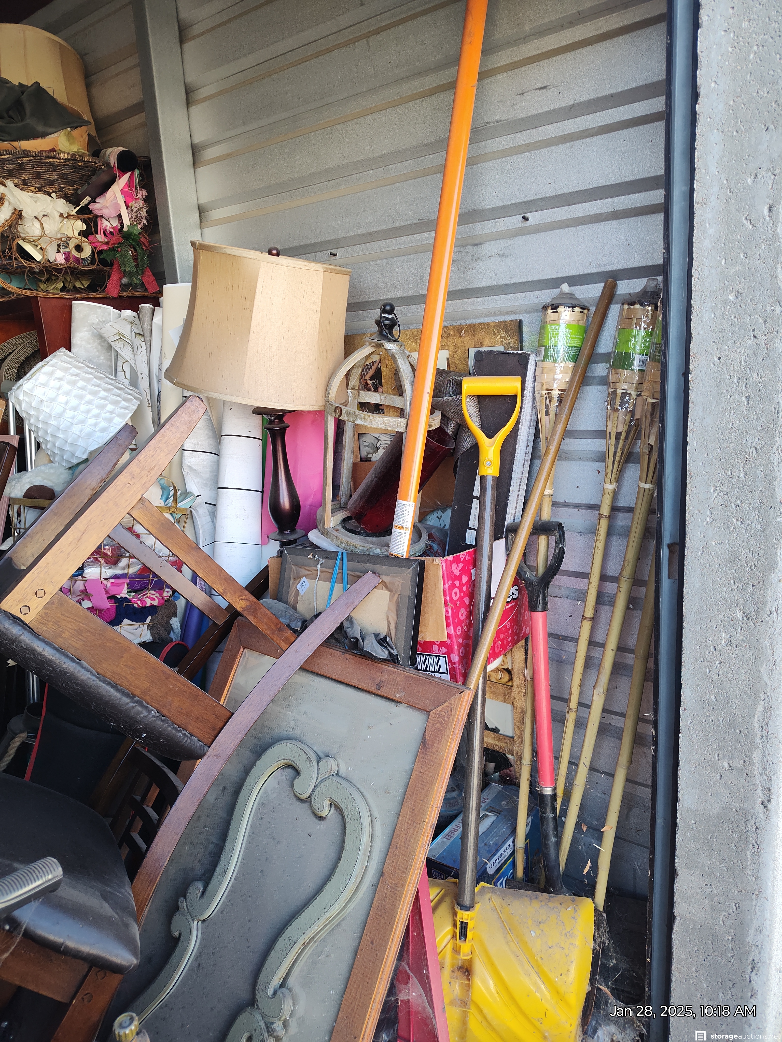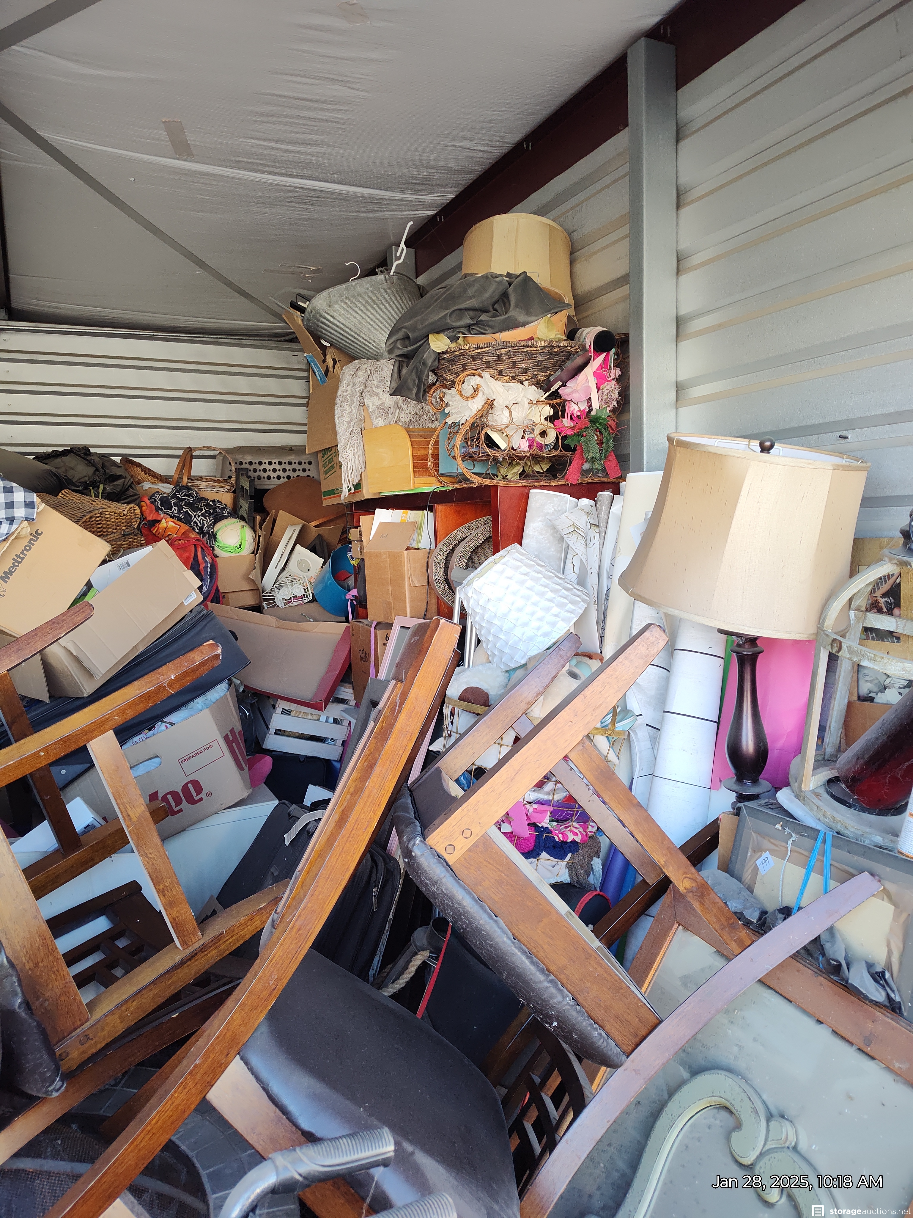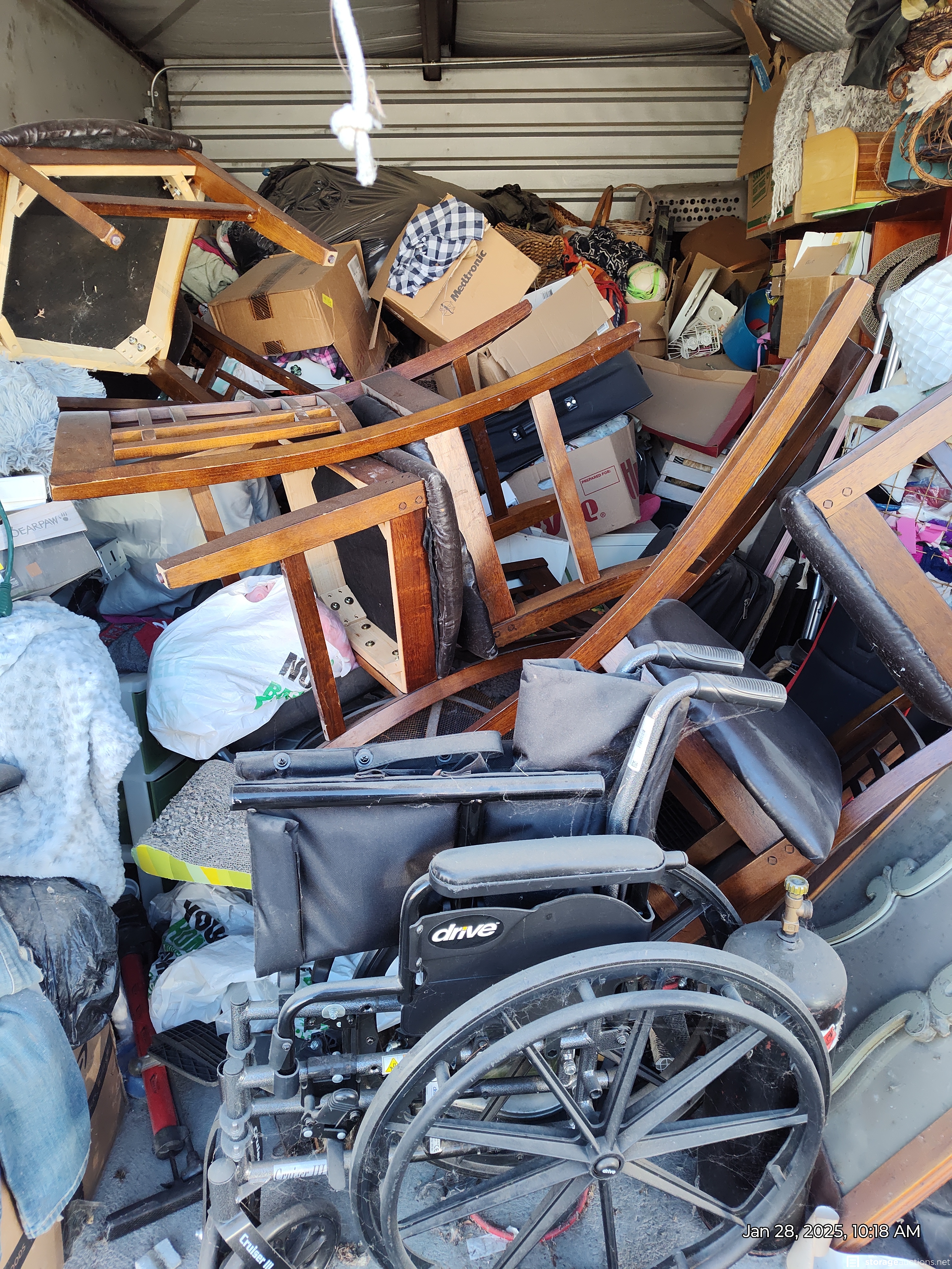 This unit has chairs, boxes, table, clothes, wheelchair,shovels, lamp