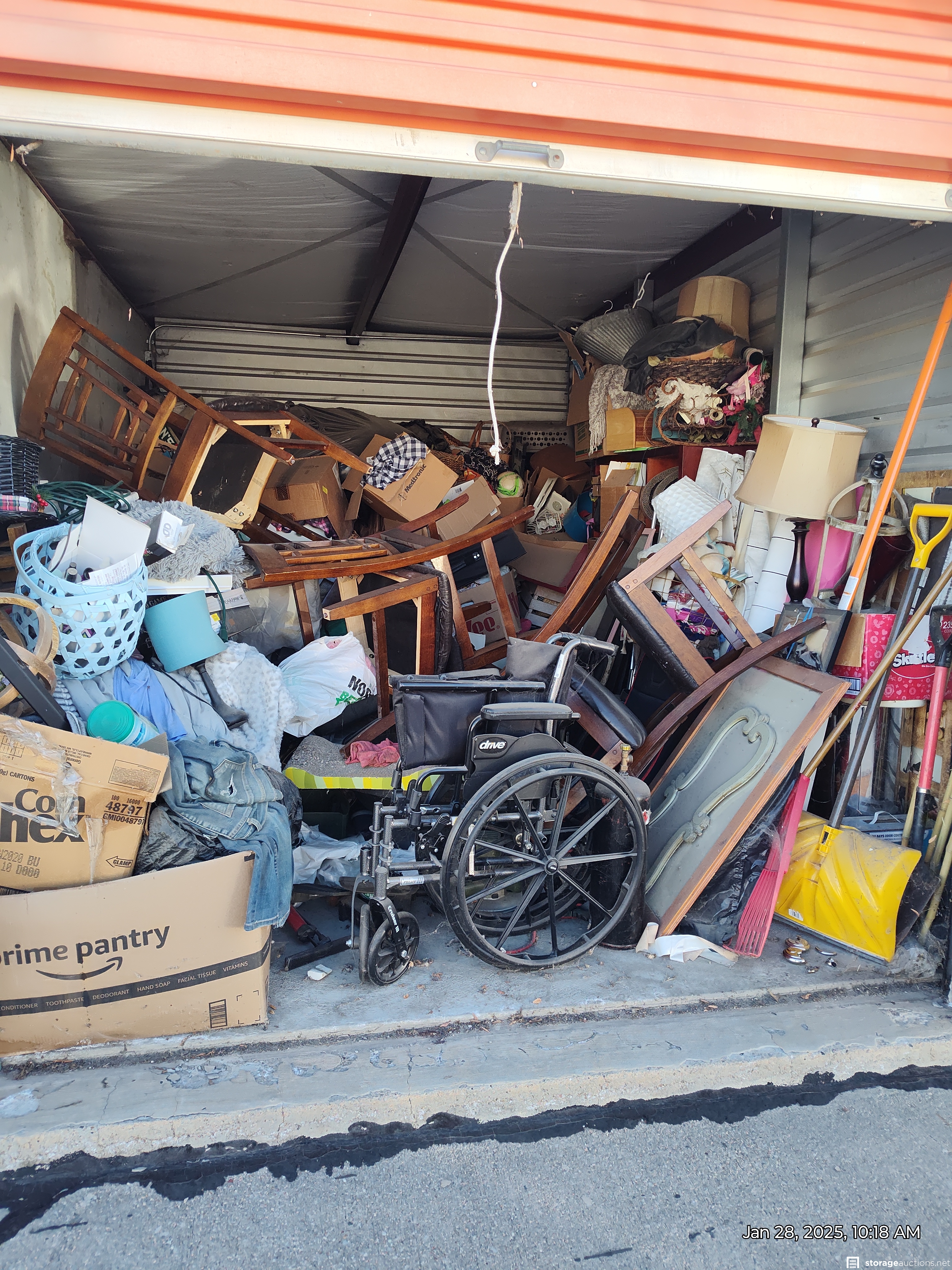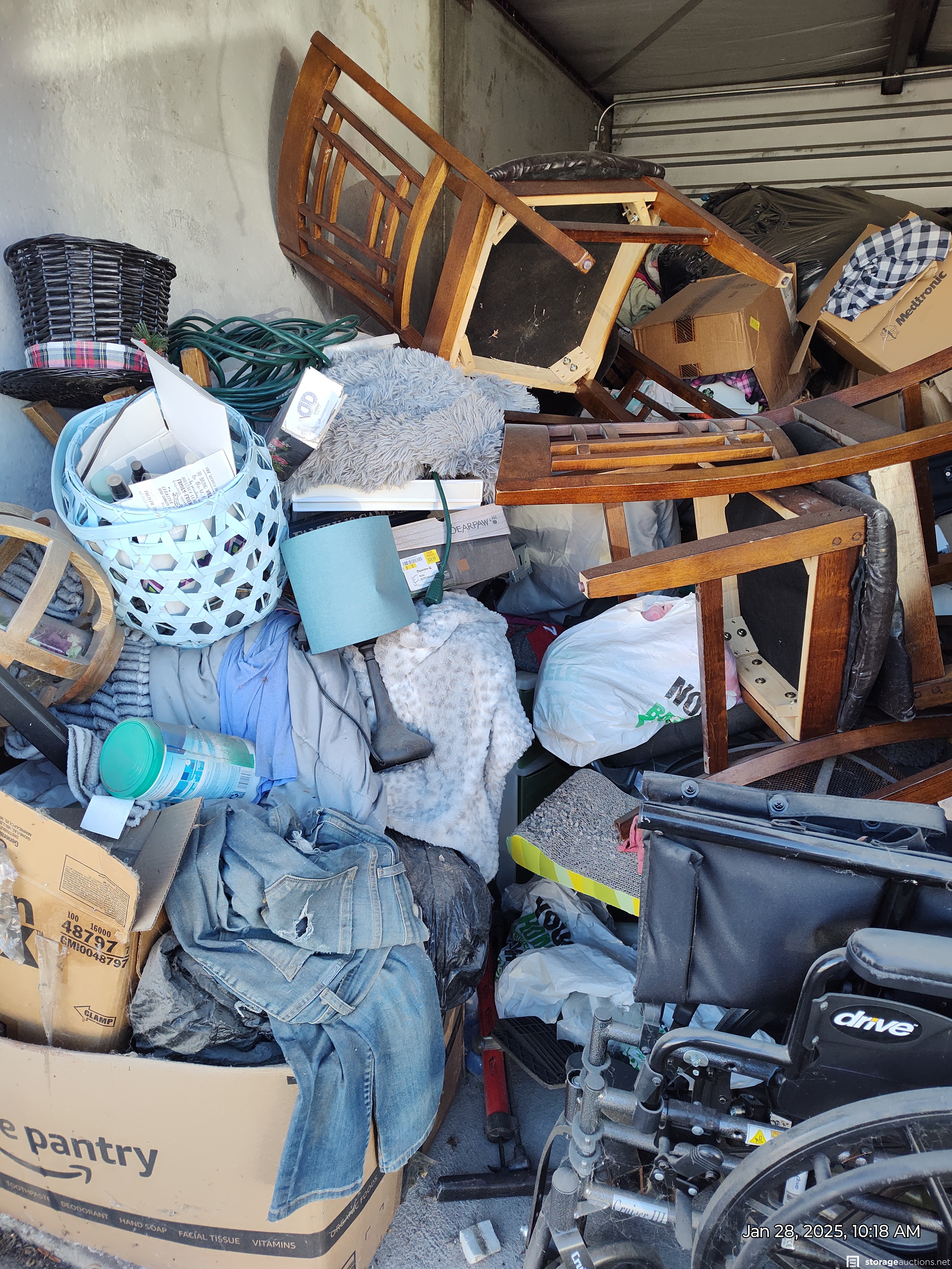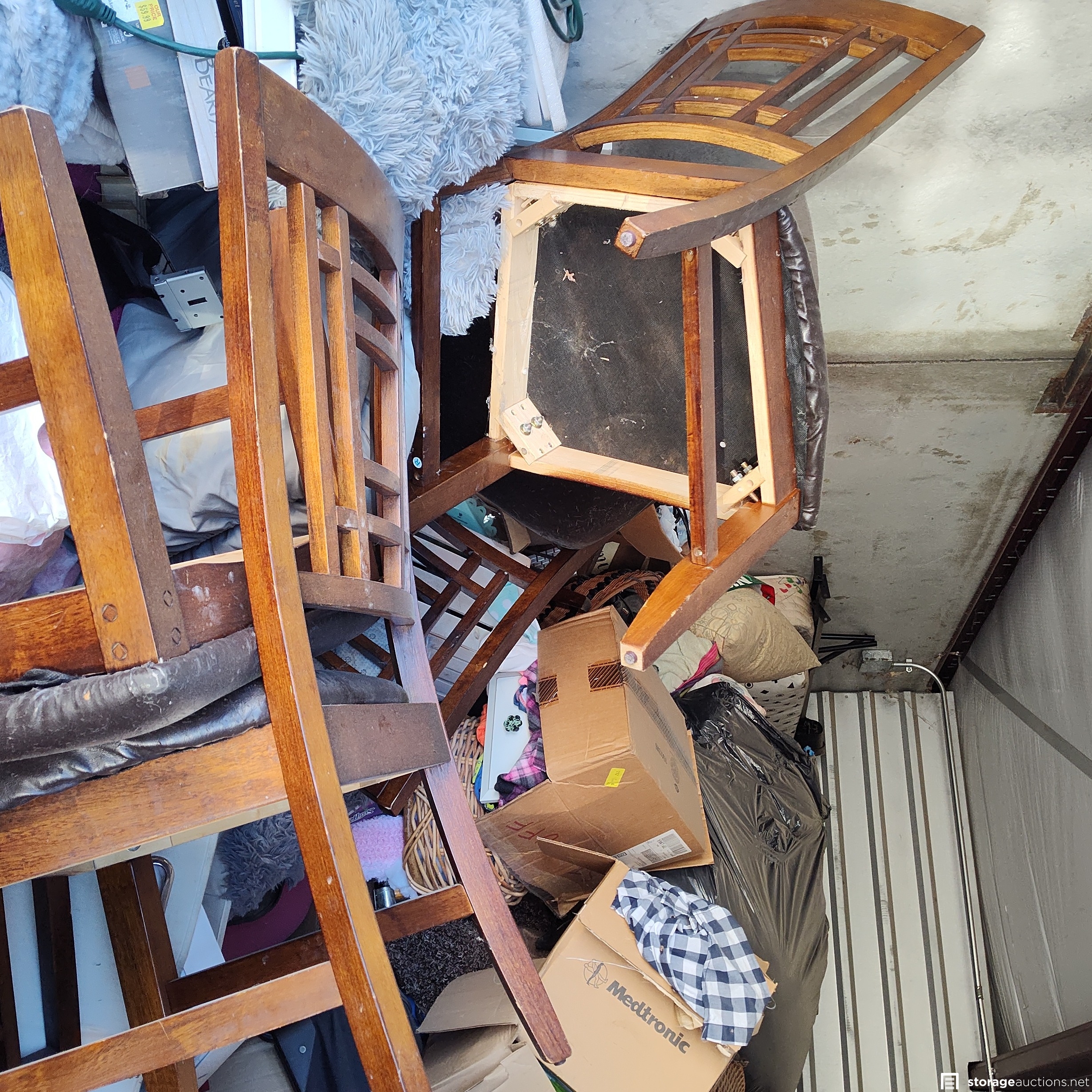 This unit has chairs, boxes, table, clothes, wheelchair,shovels, lamp