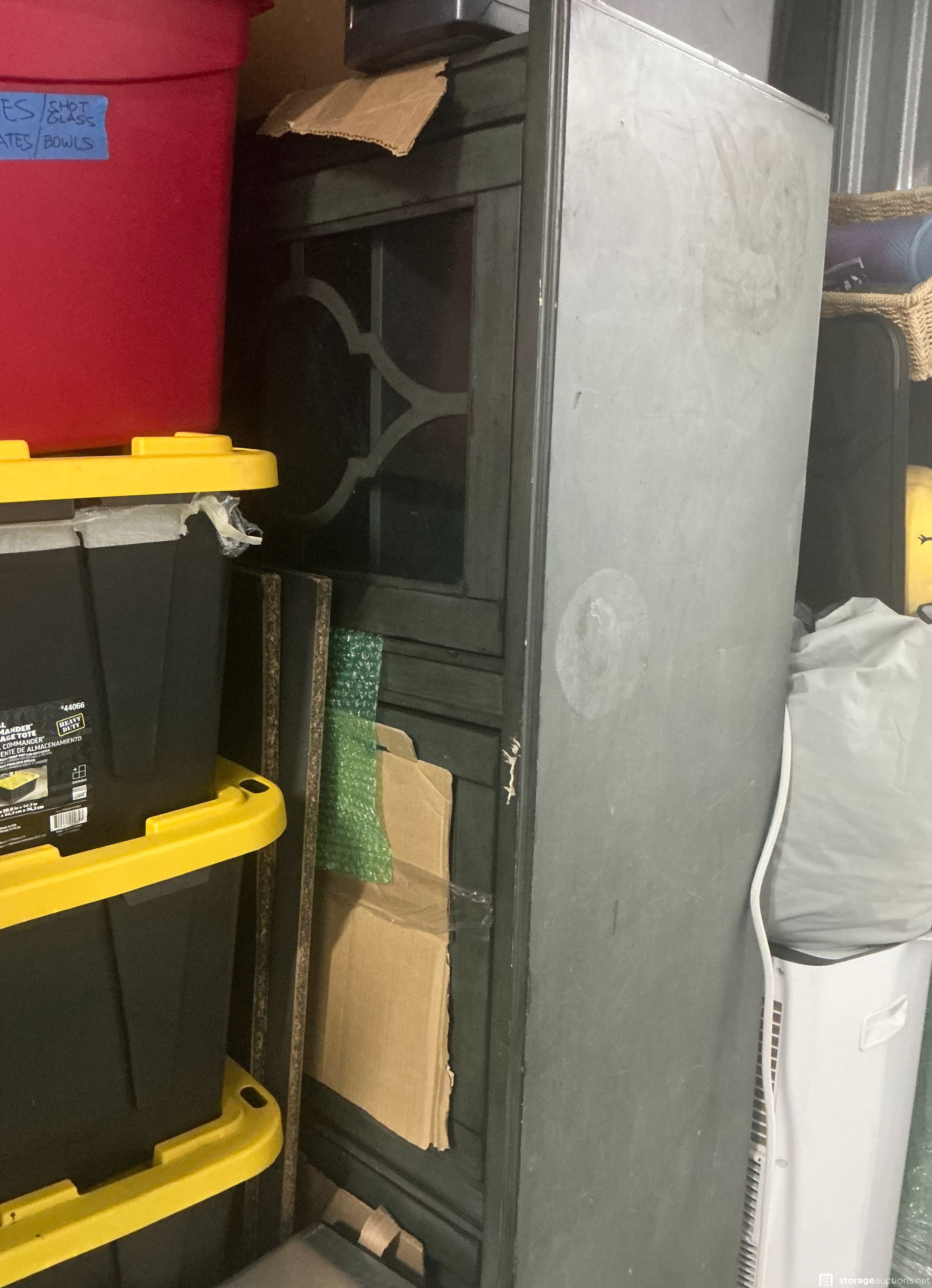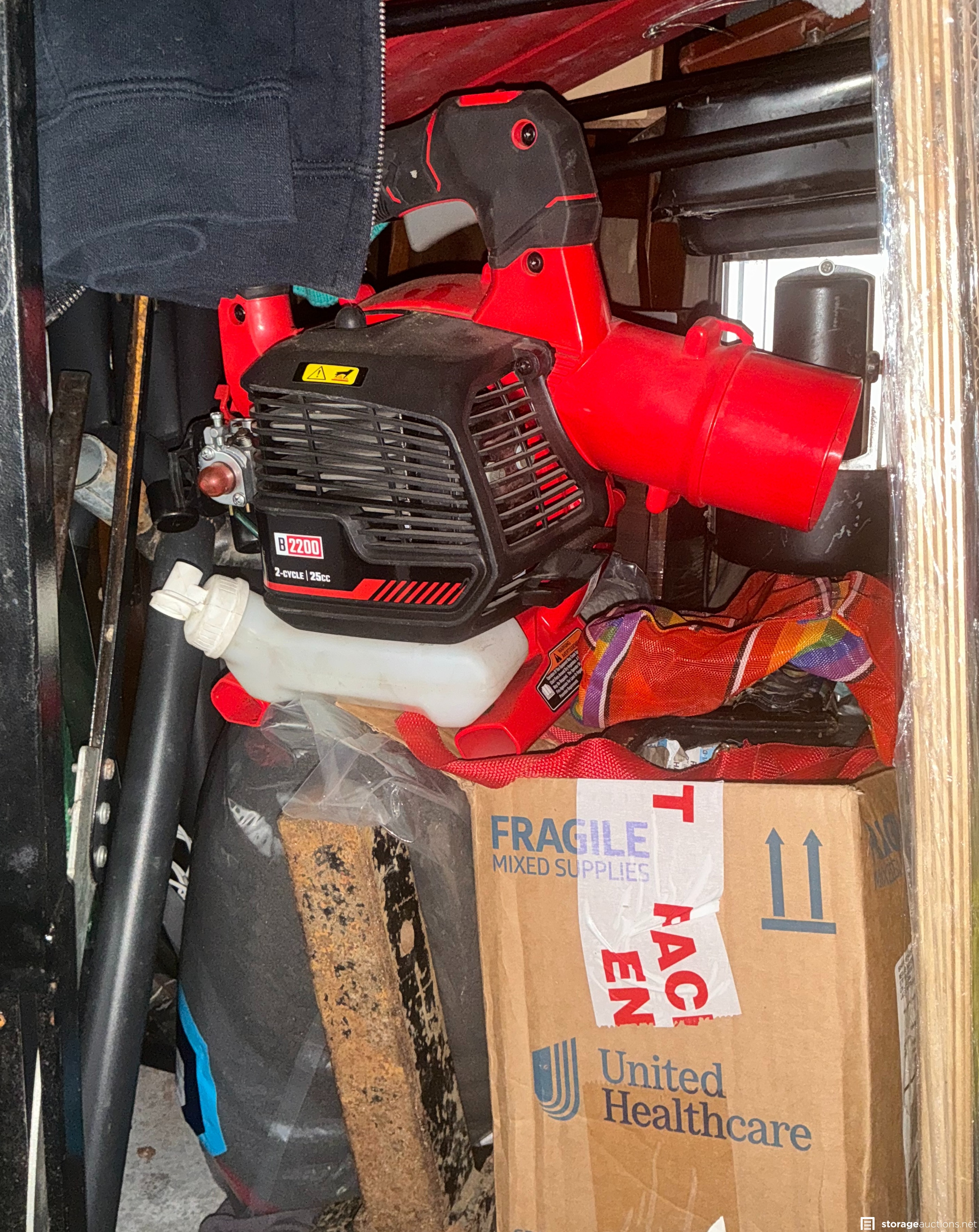 Very full unit, appears to have a cabinet, a gas powered leaf blower. Several totes, a portable AC unit, stools, suitcases and computer towers