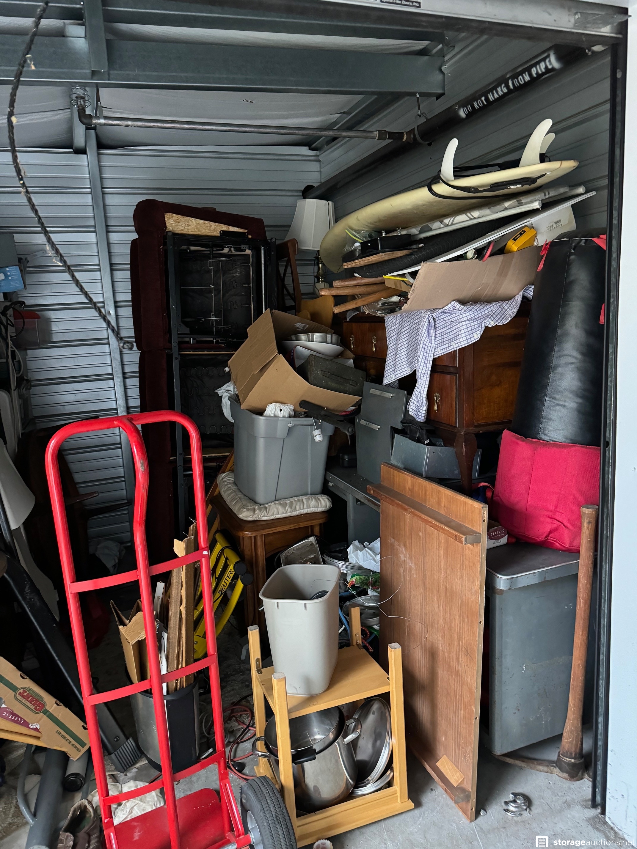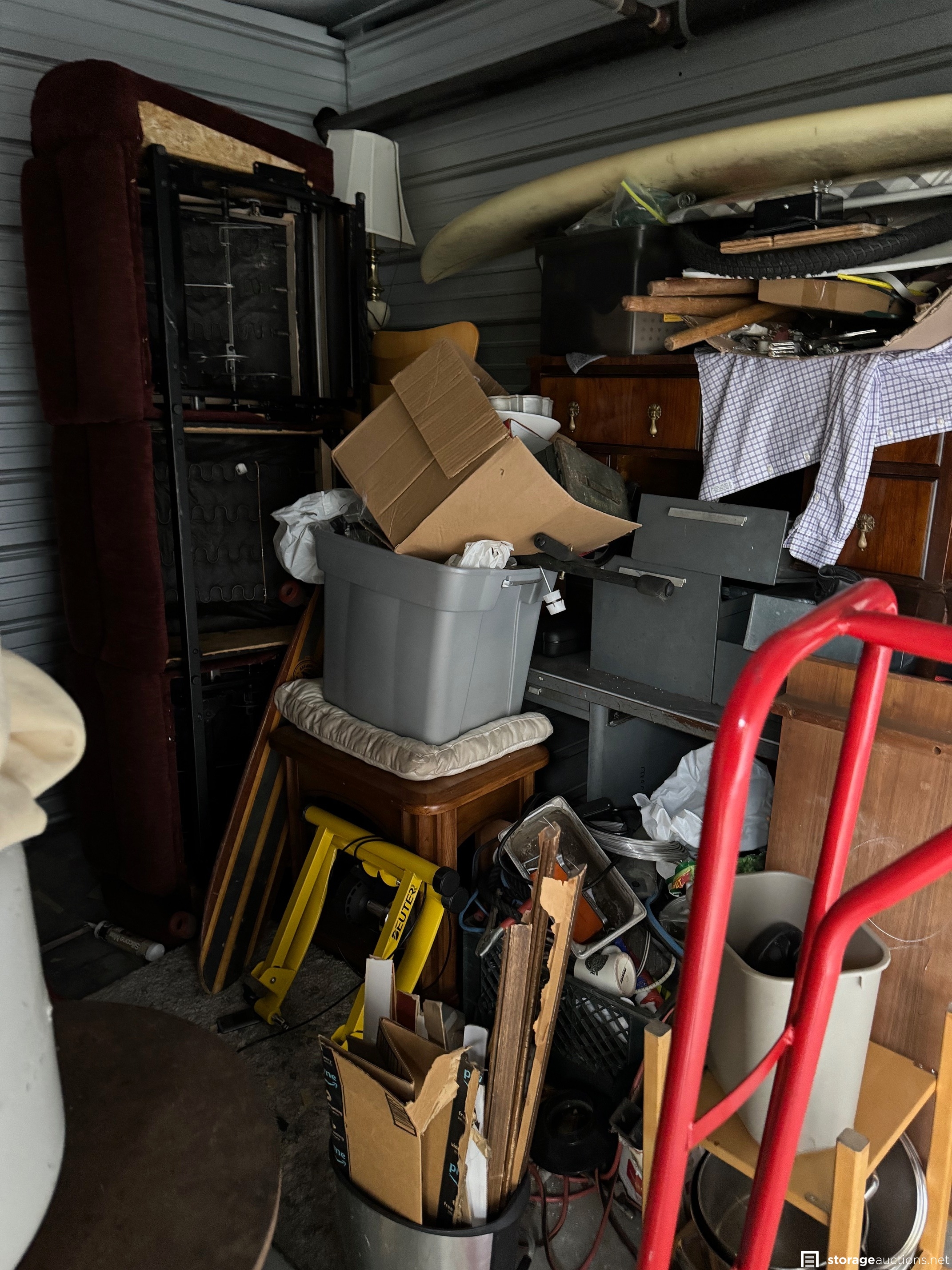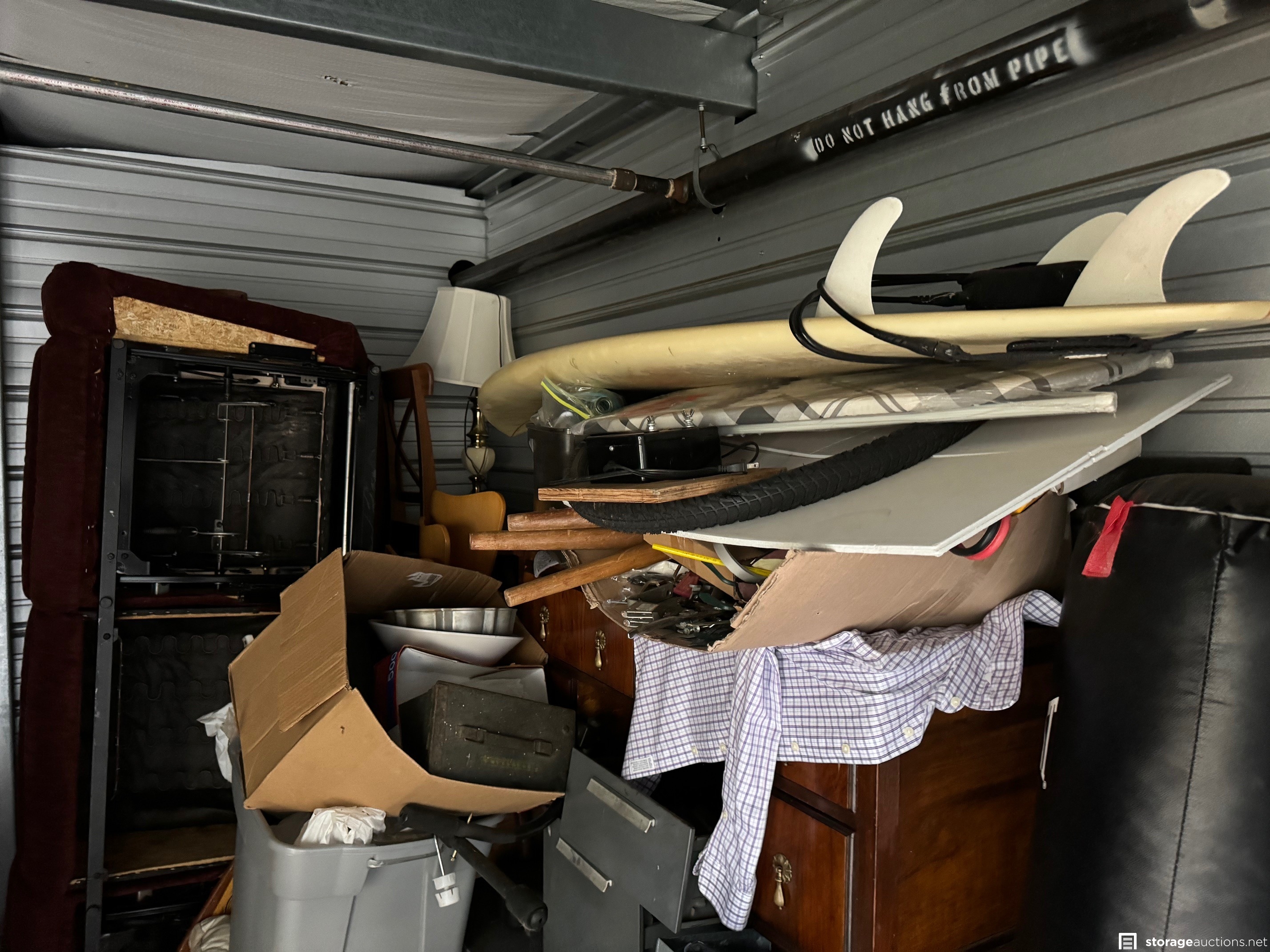 Surfboard, longboard skateboard, dolly, couch, tools, table, chairs, misc household