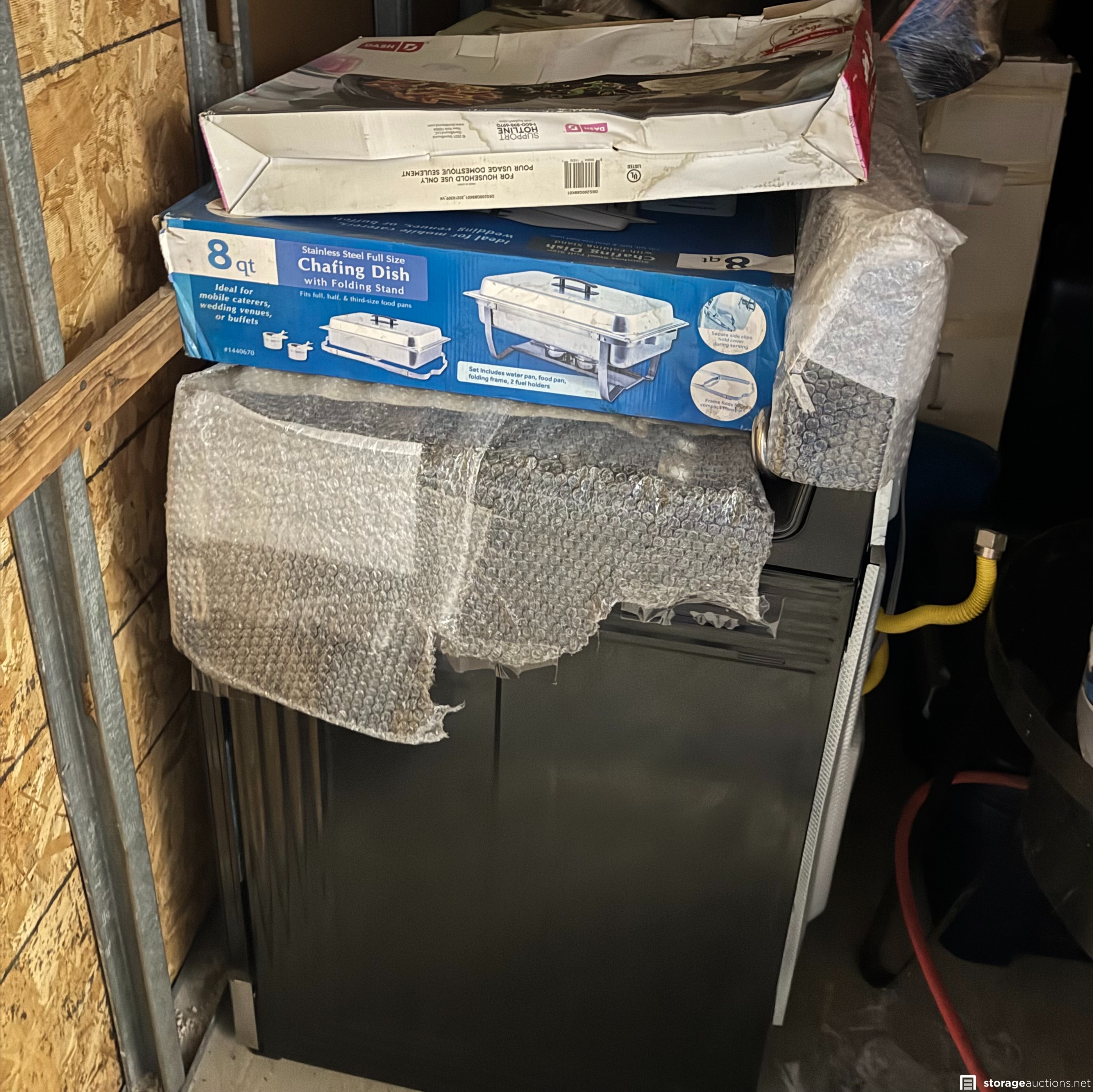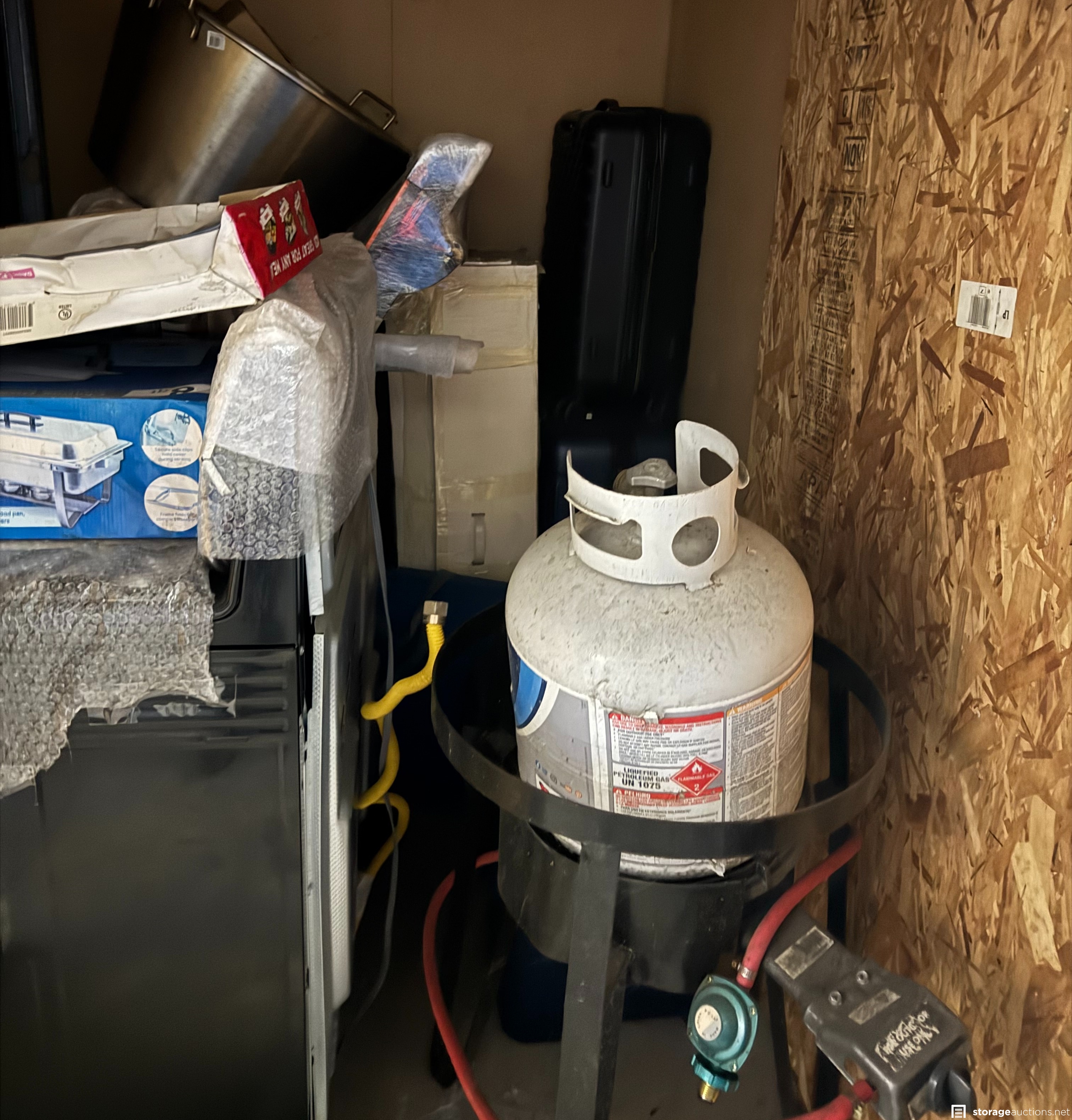 Oven, propane BBQ, Metal tube, boxes and suit cases