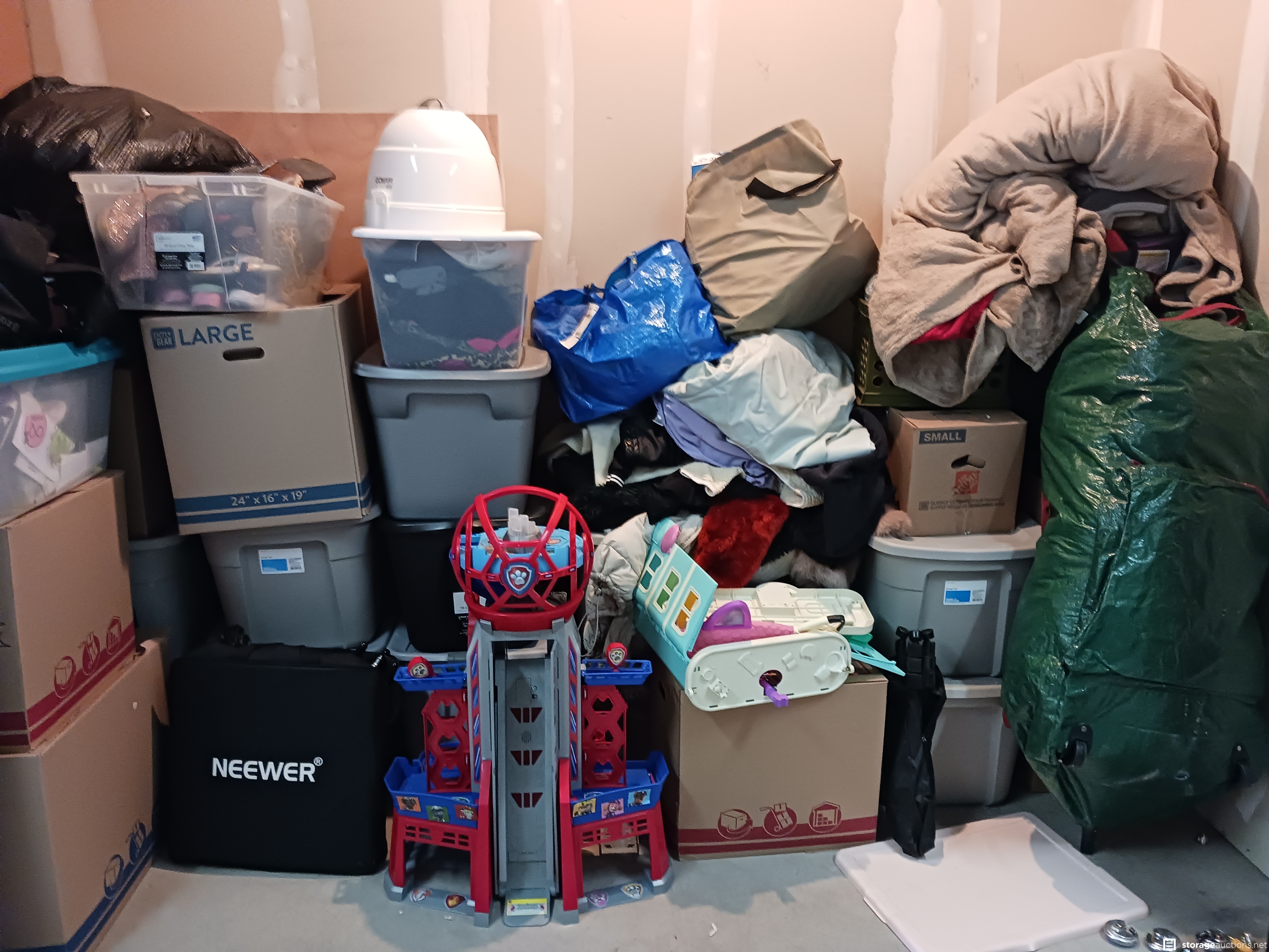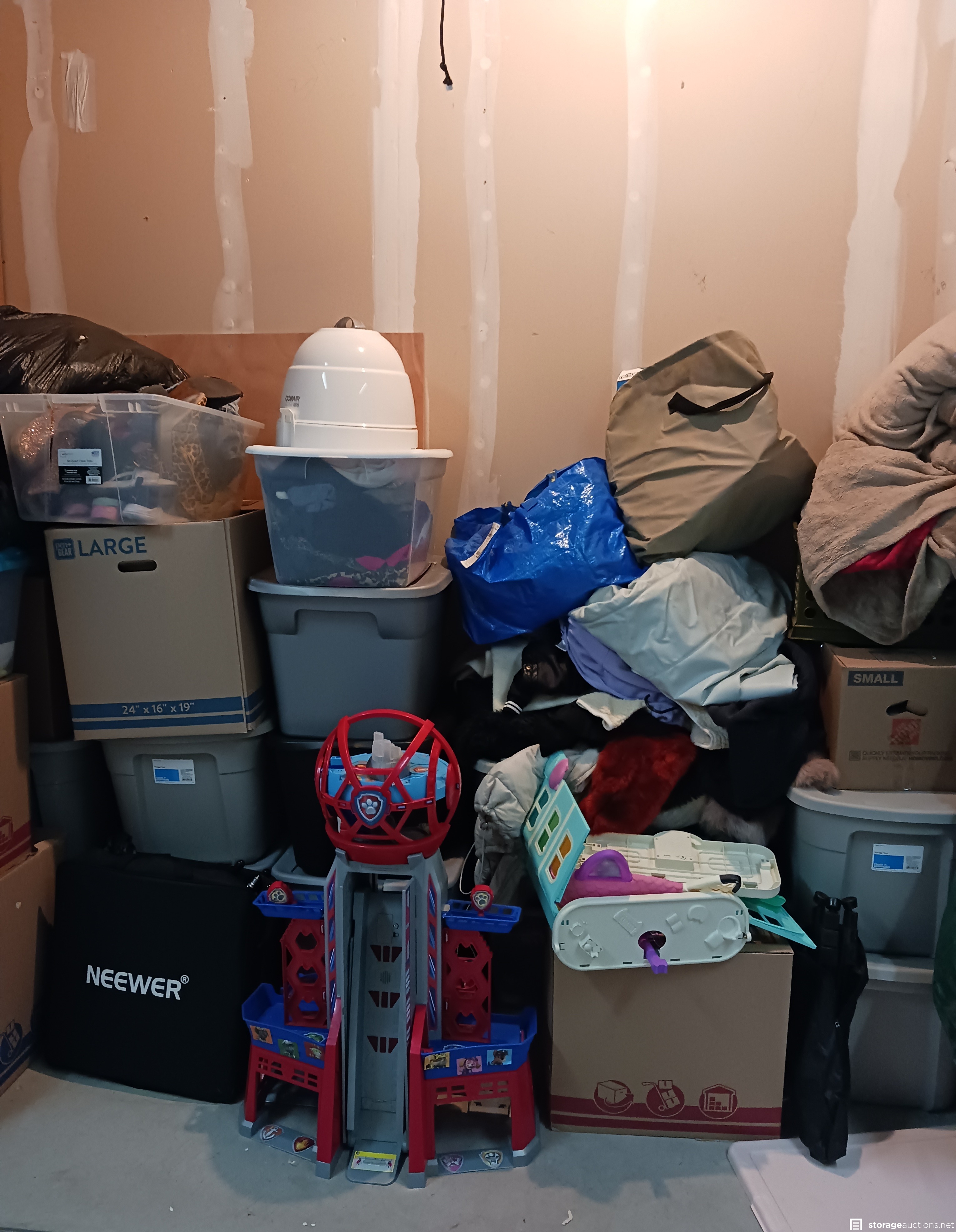 Totes, boxes, kids toys, shoes, neewer bag and misc clothing