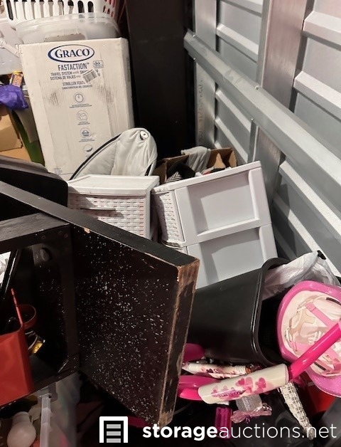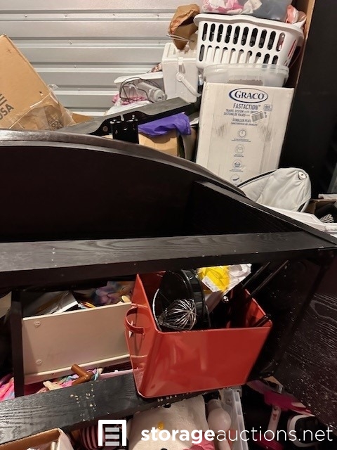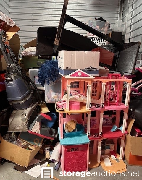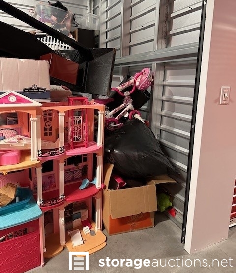 Unit appears to have a bike, toys, doll house, carpet cleaner, drawers, and much more! It looks like a lot of children's items.