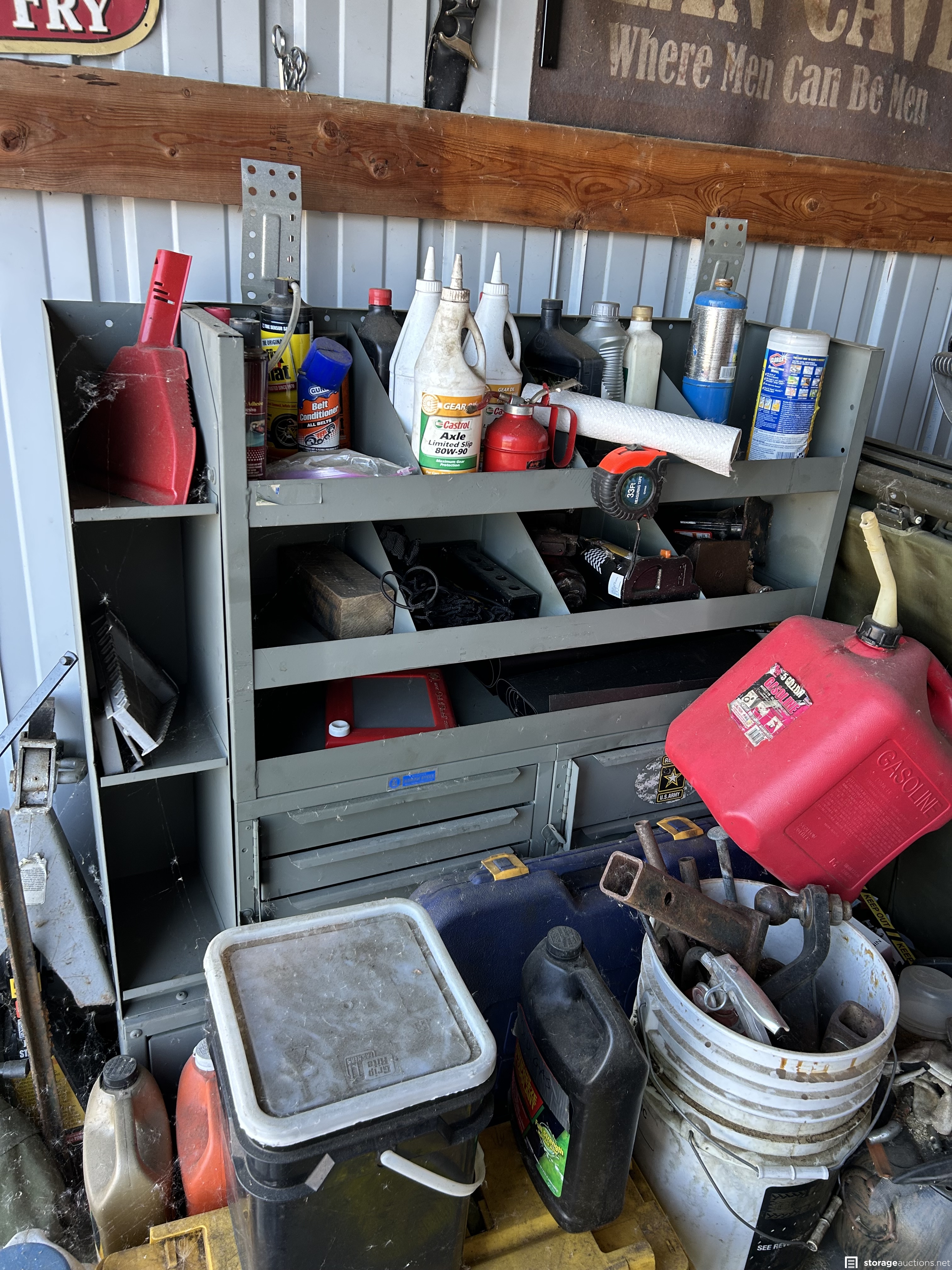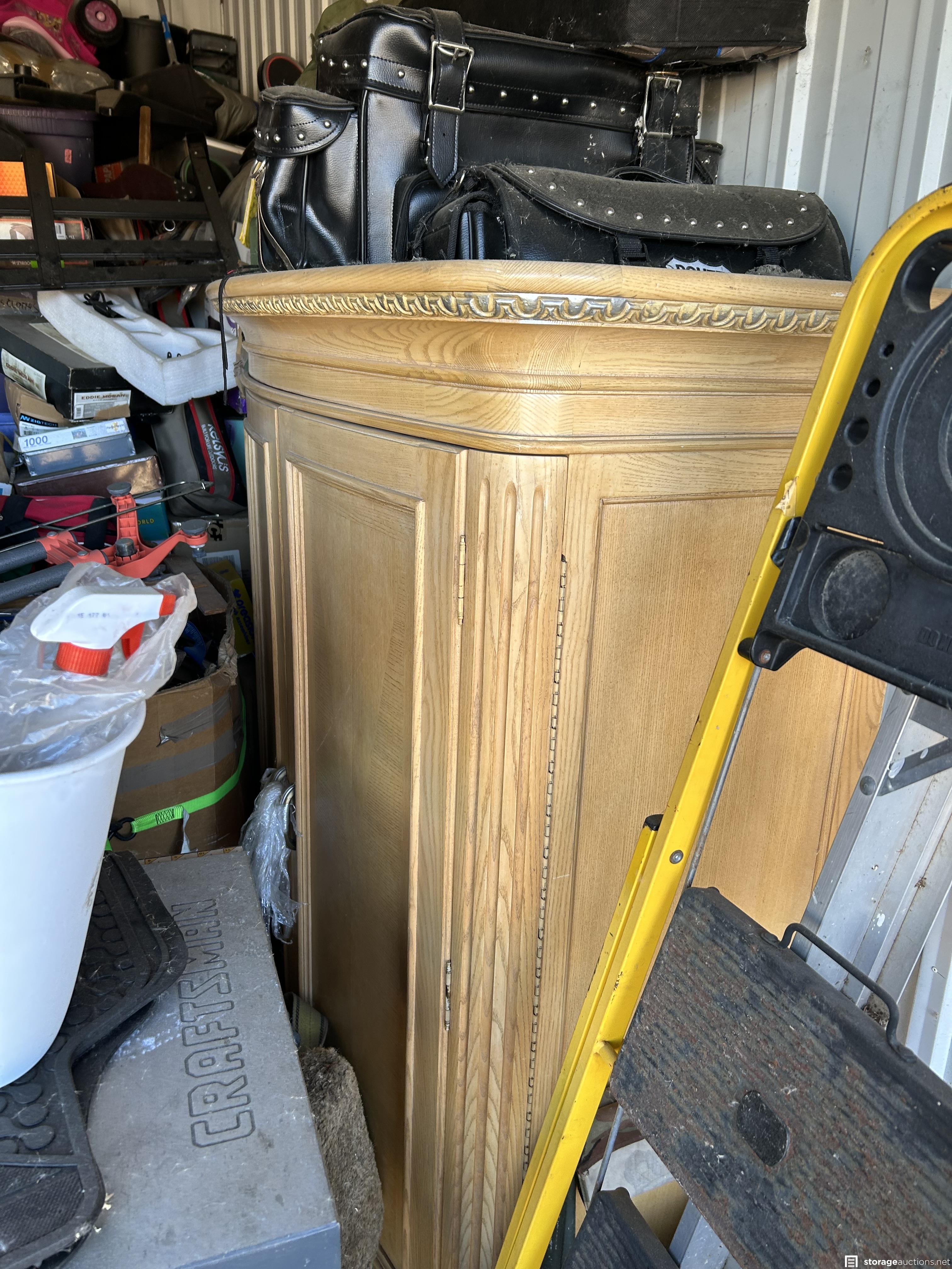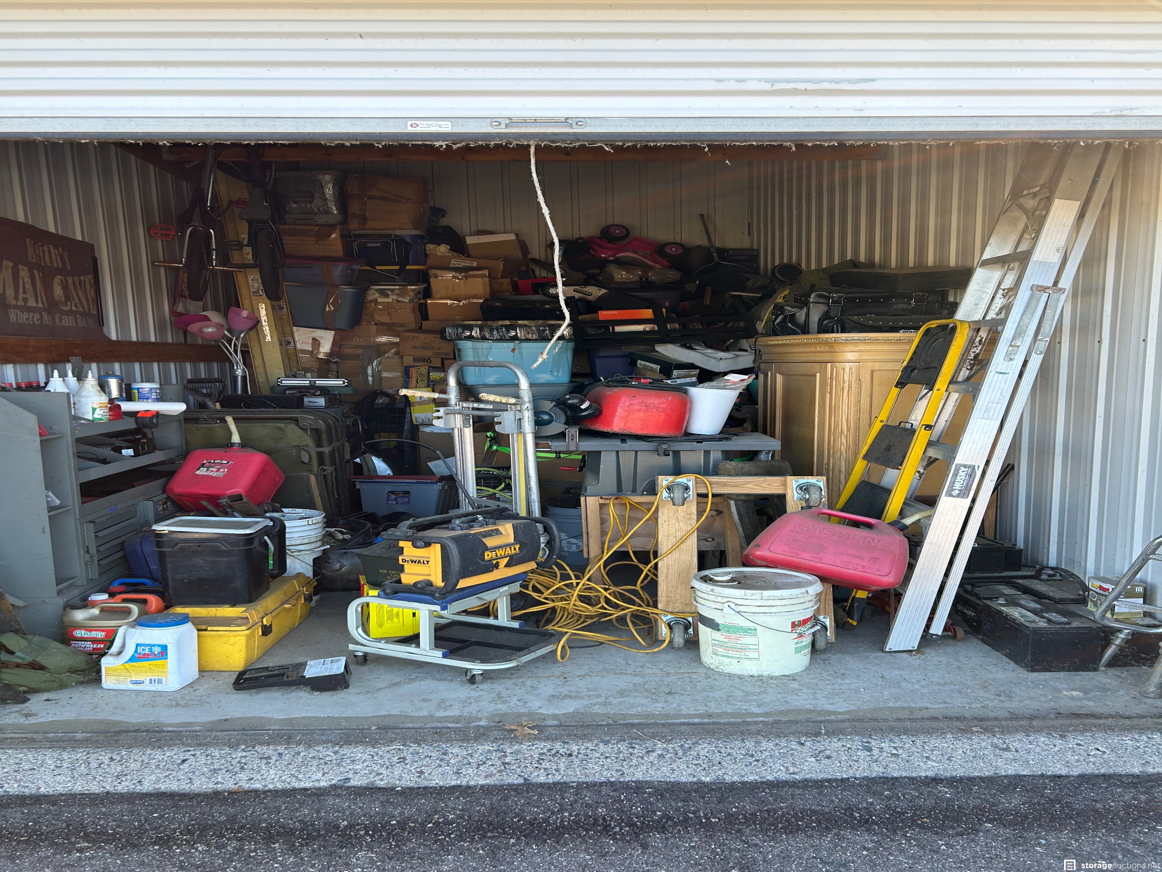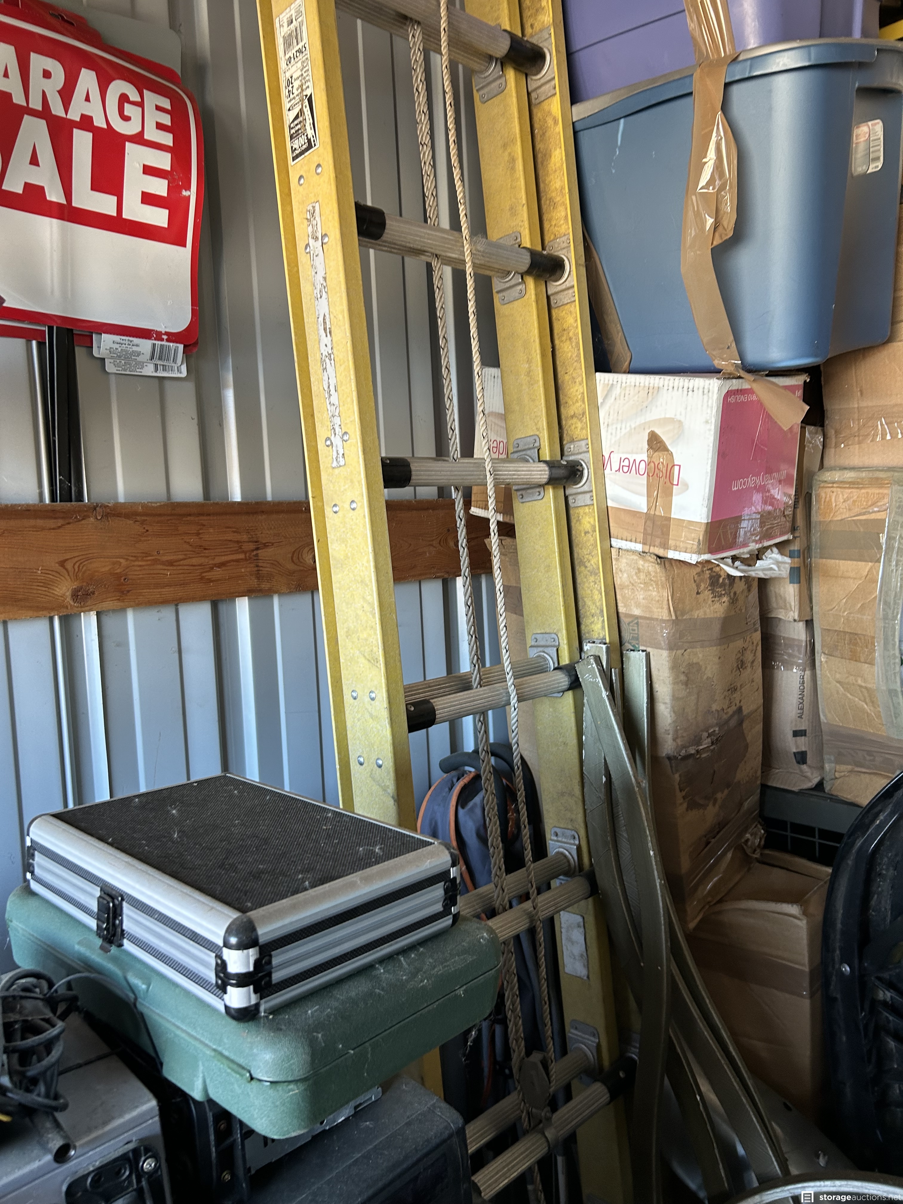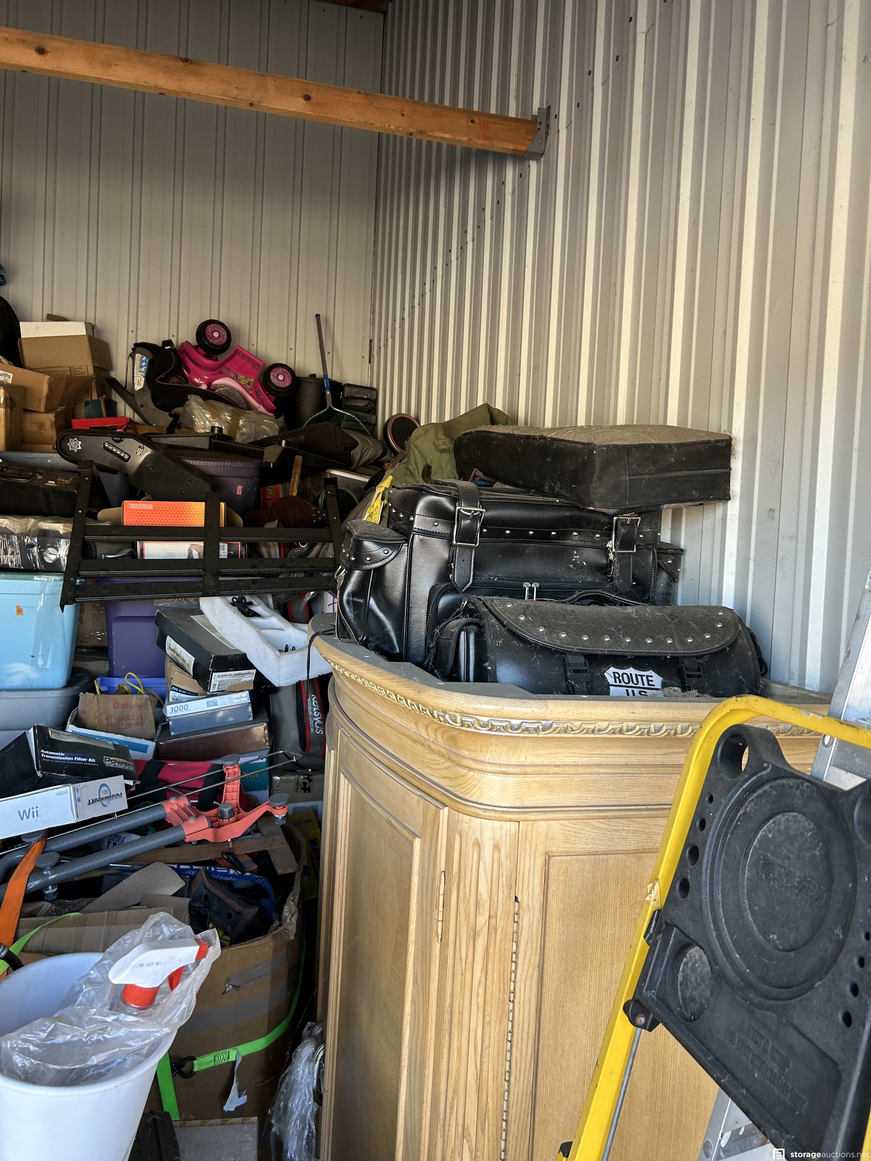 This unit appears to contain Stereo system, cots, fiberglass extension ladder, aluminum ladder, tool shelf, tools, air compressor, craftsman table saw with stand, wood armoire. Moving straps, motorcycle bag, drum set, boxes and tubs of unknown