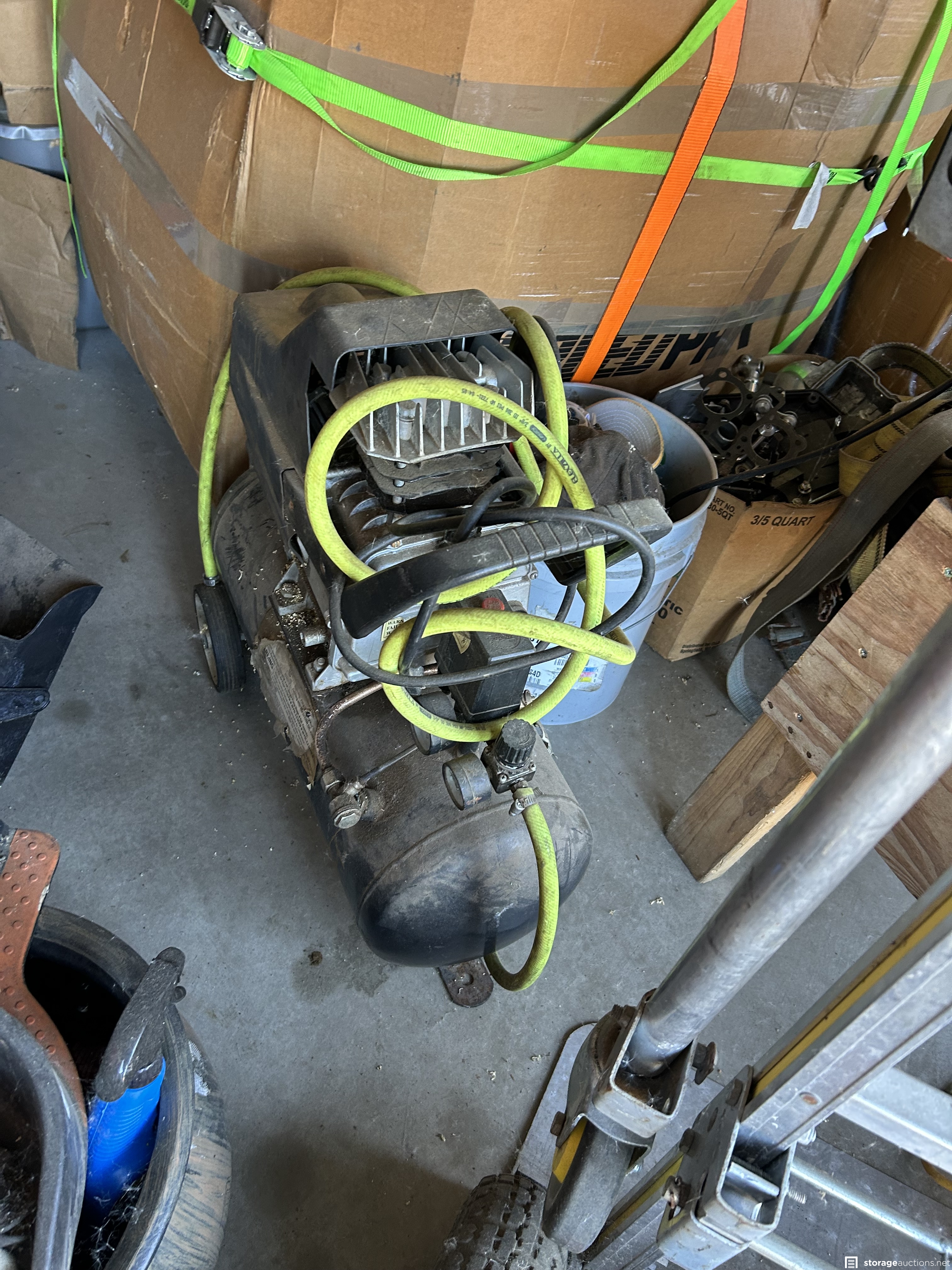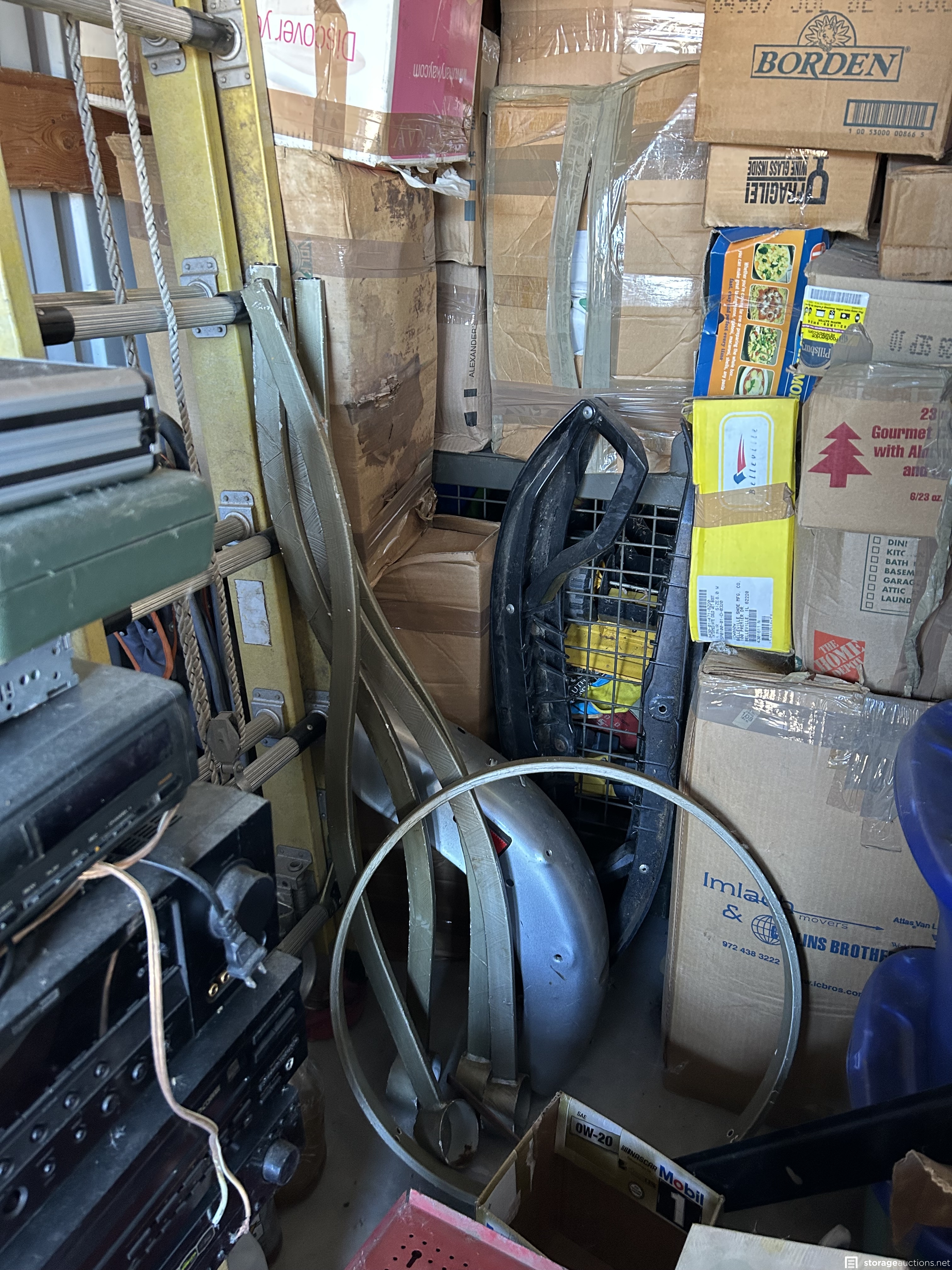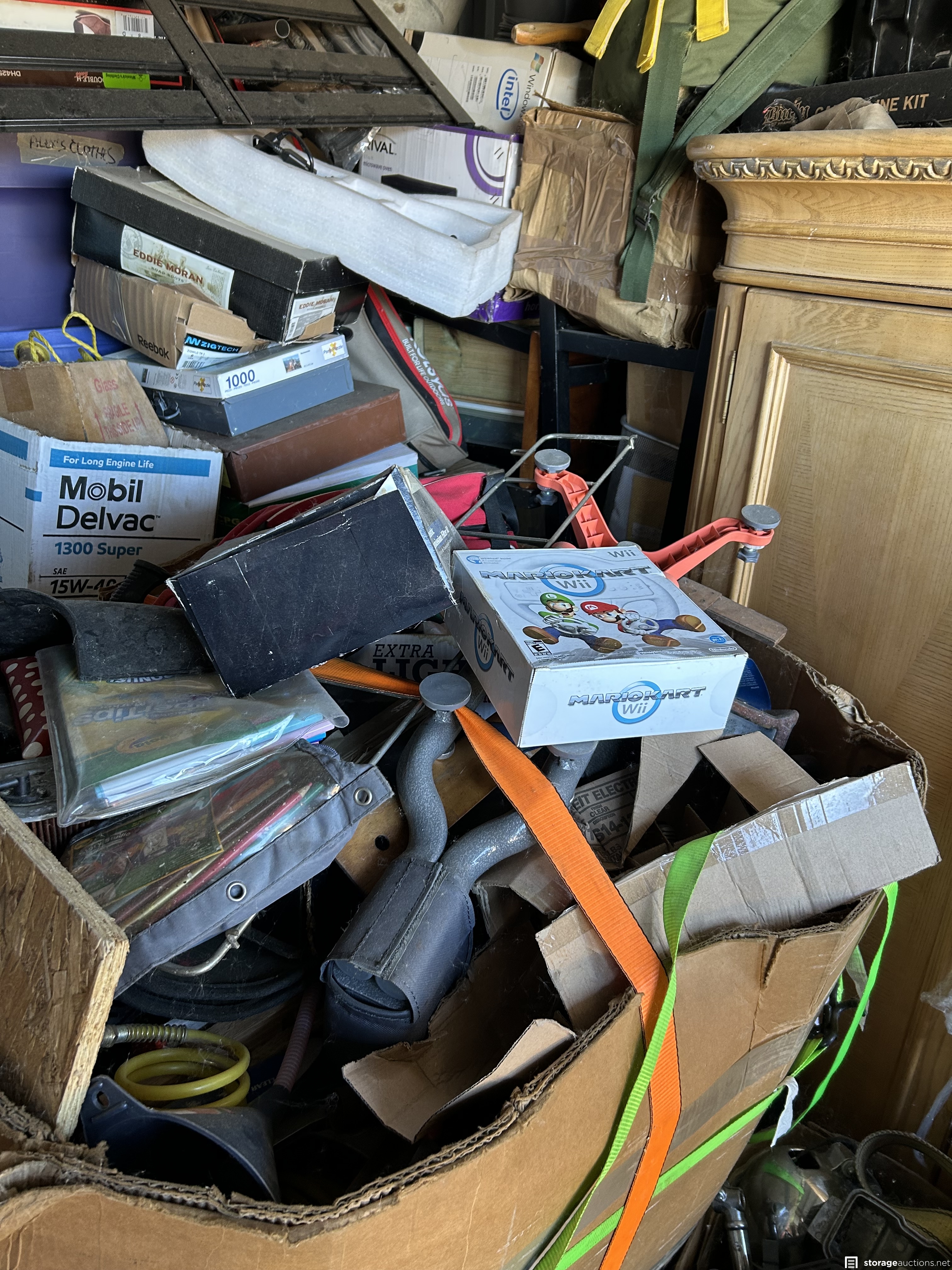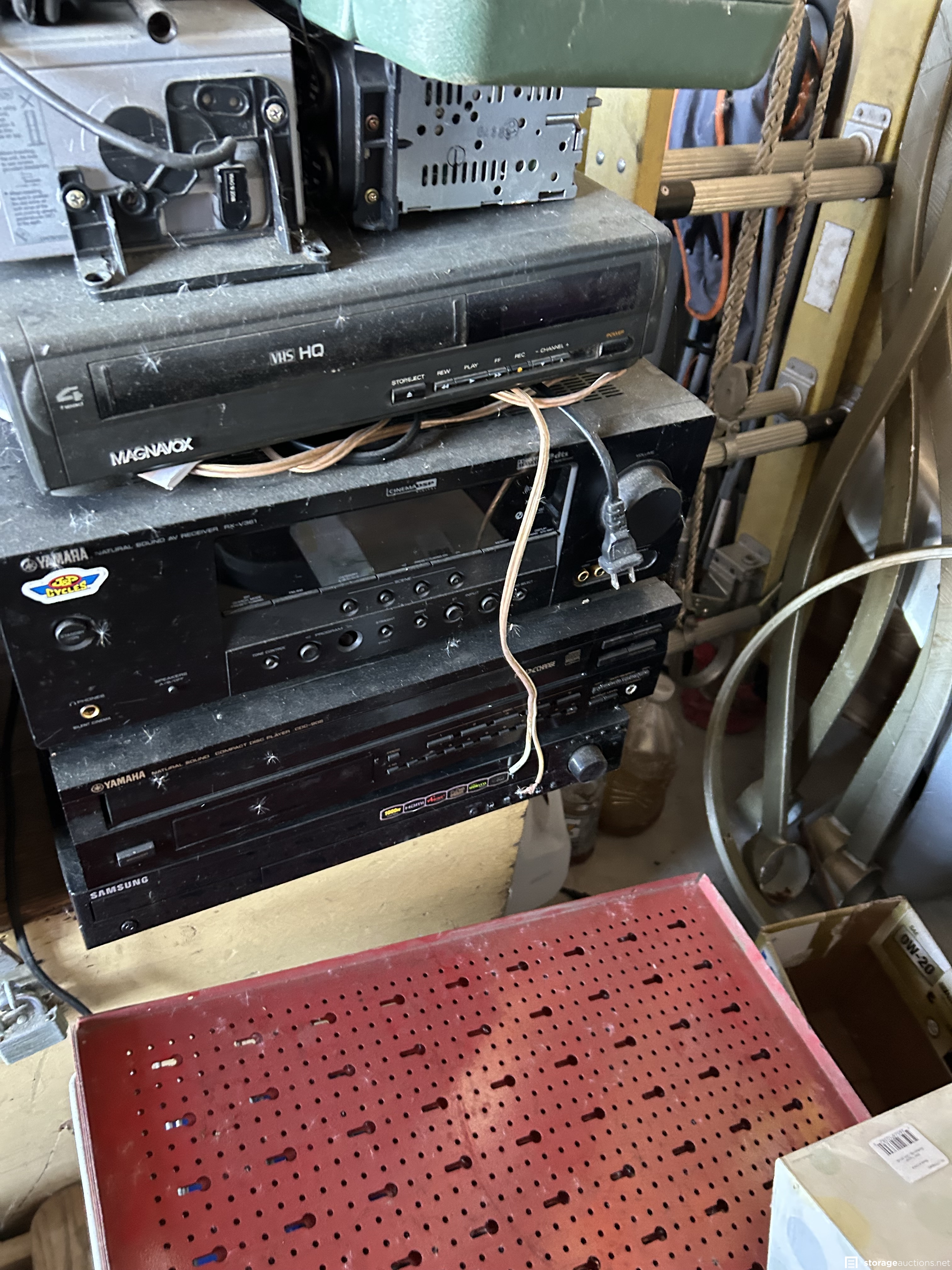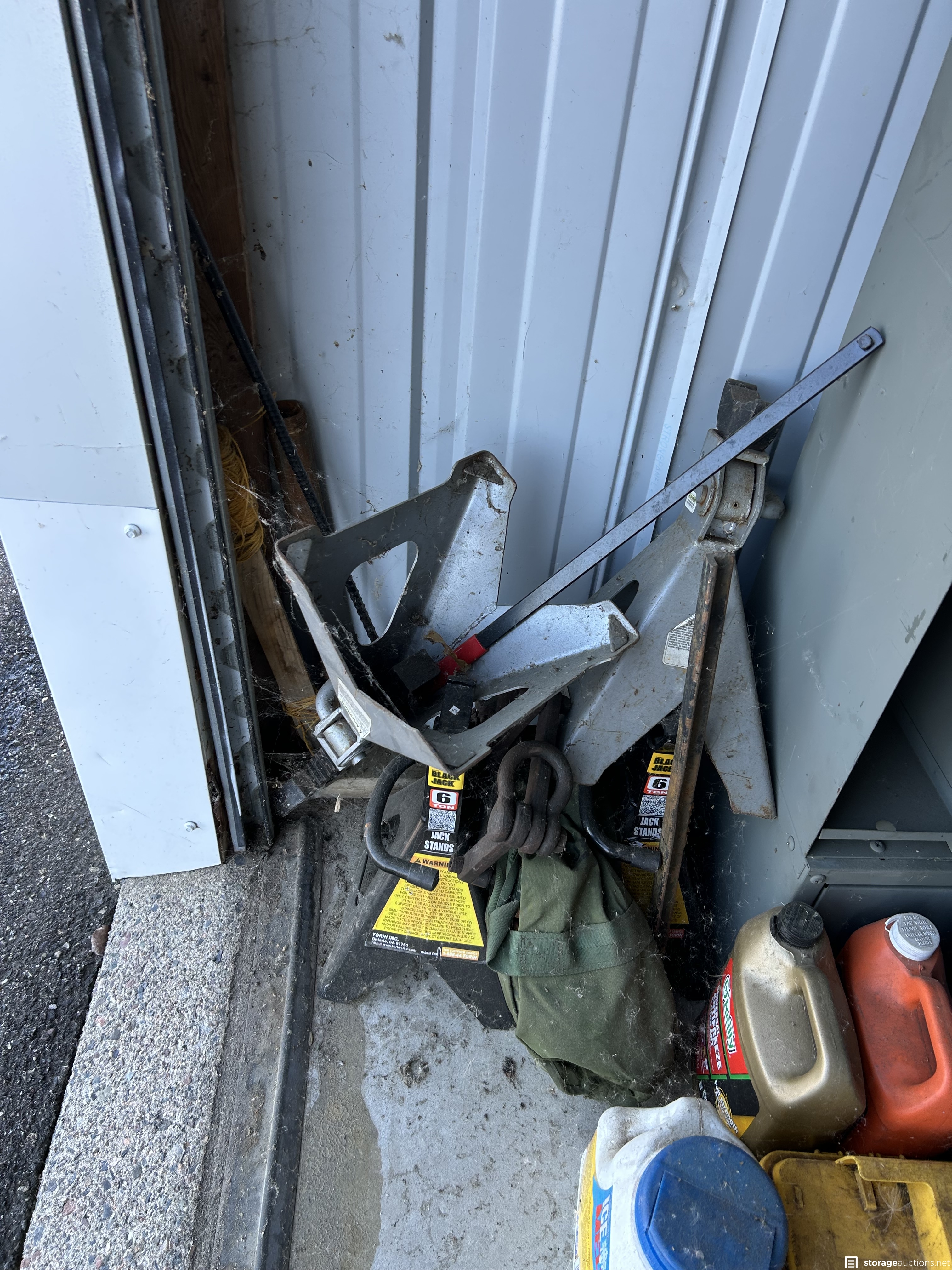 This unit appears to contain Stereo system, cots, fiberglass extension ladder, aluminum ladder, tool shelf, tools, air compressor, craftsman table saw with stand, wood armoire. Moving straps, motorcycle bag, drum set, boxes and tubs of unknown