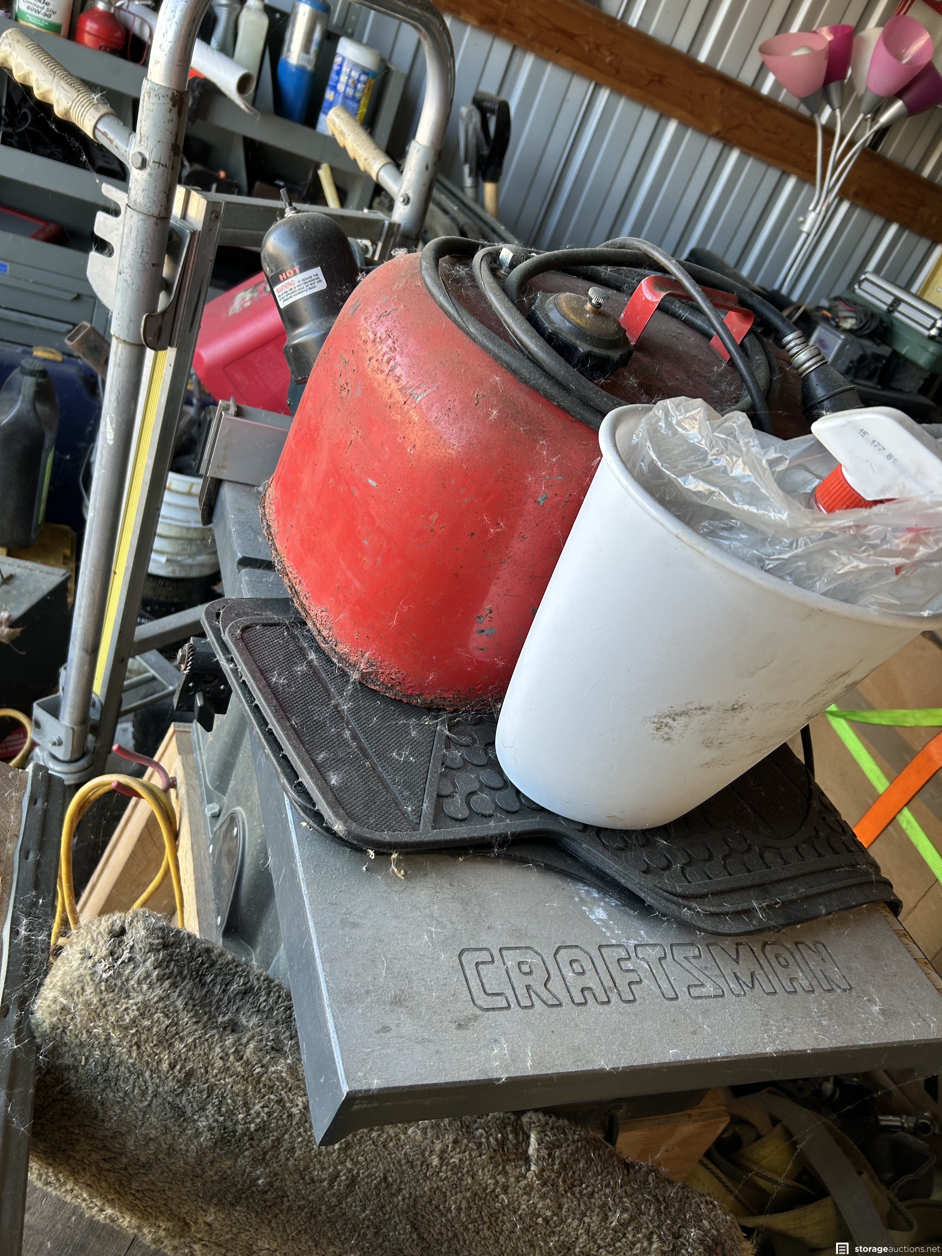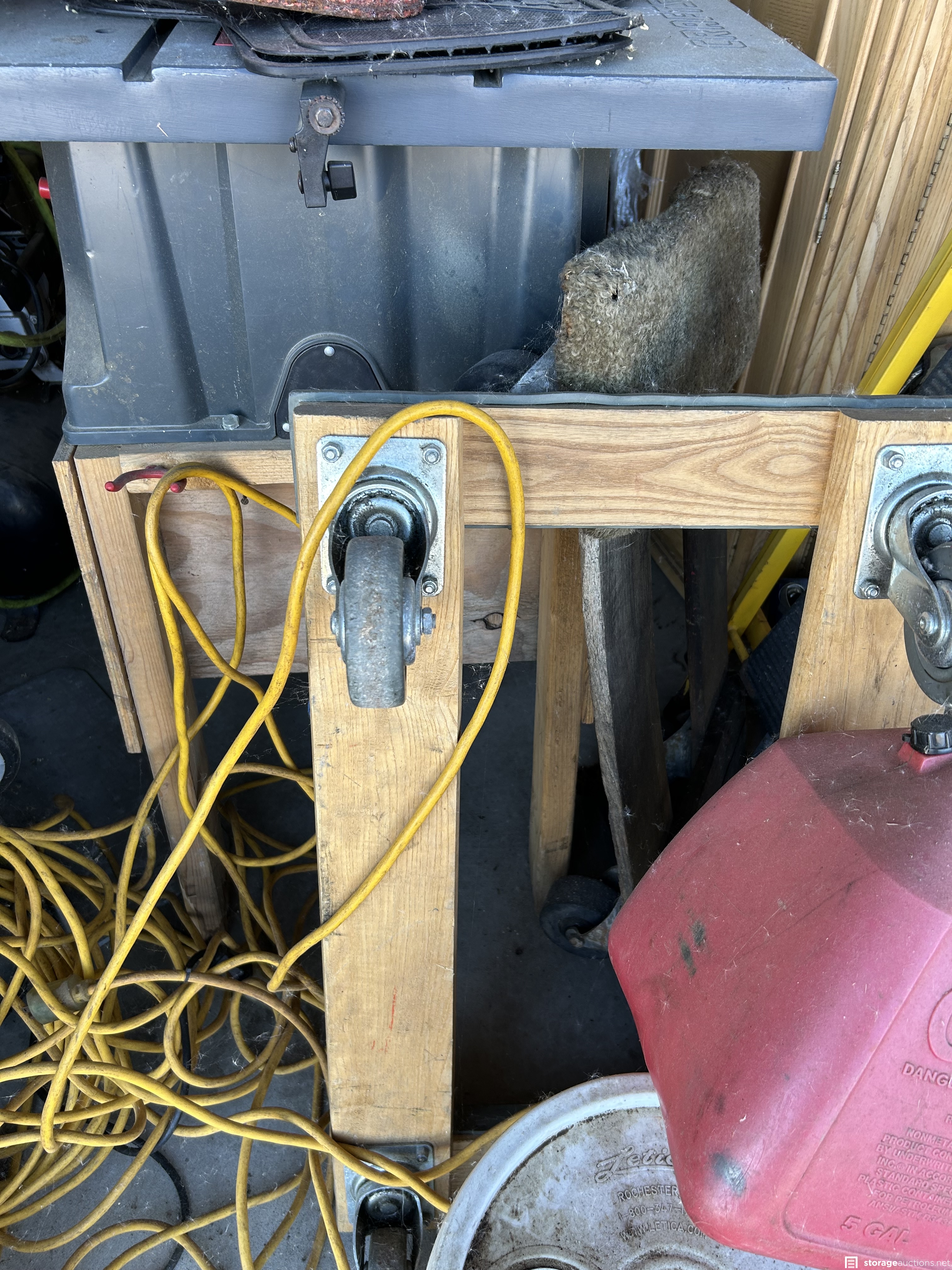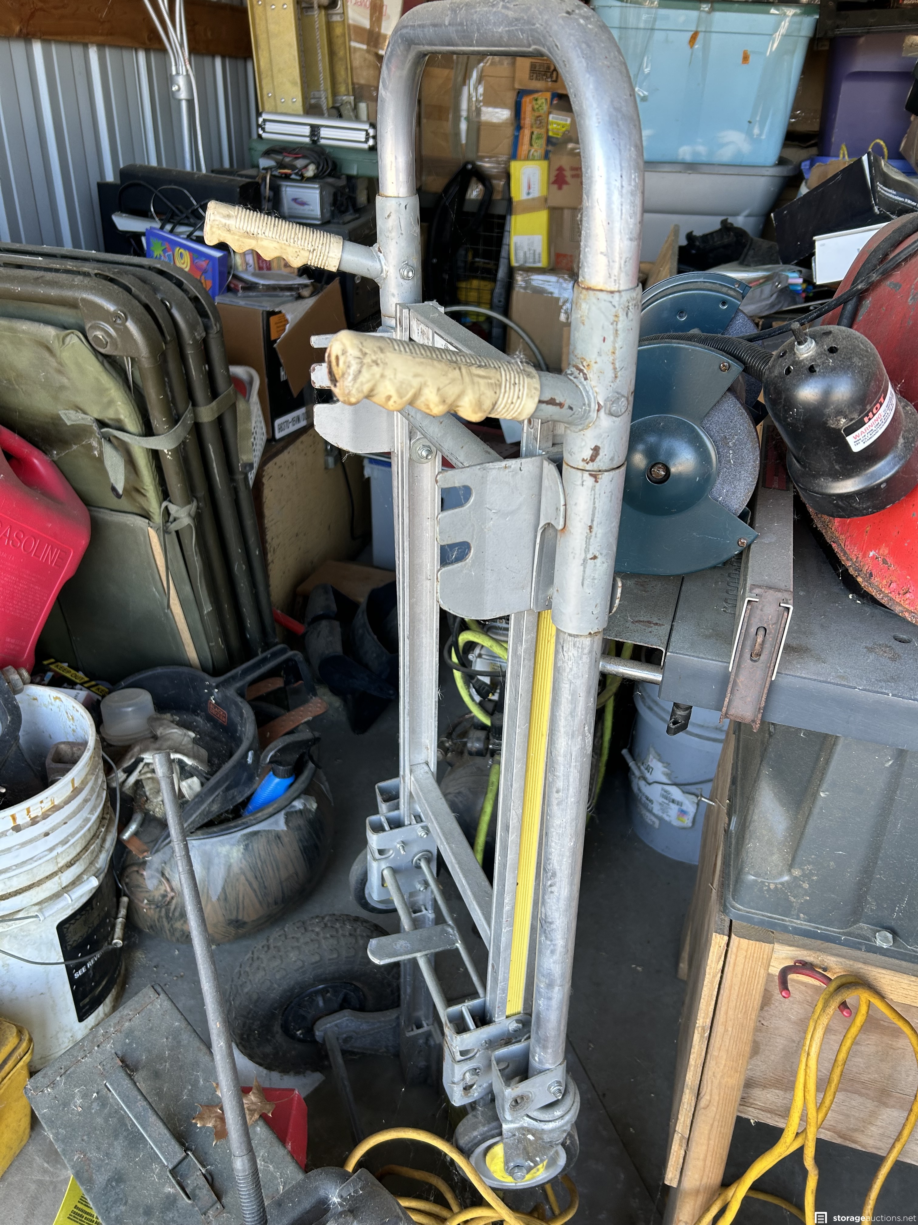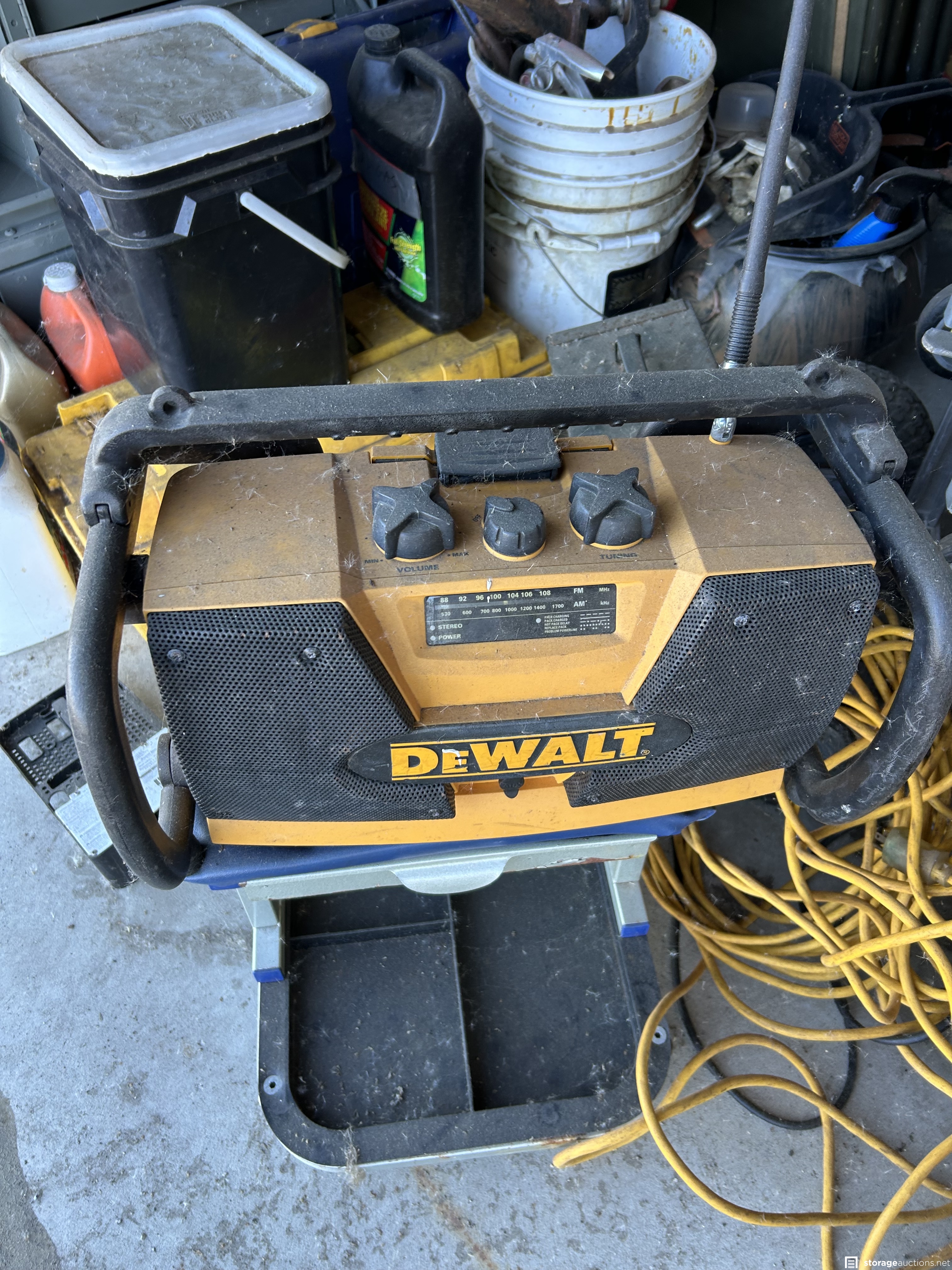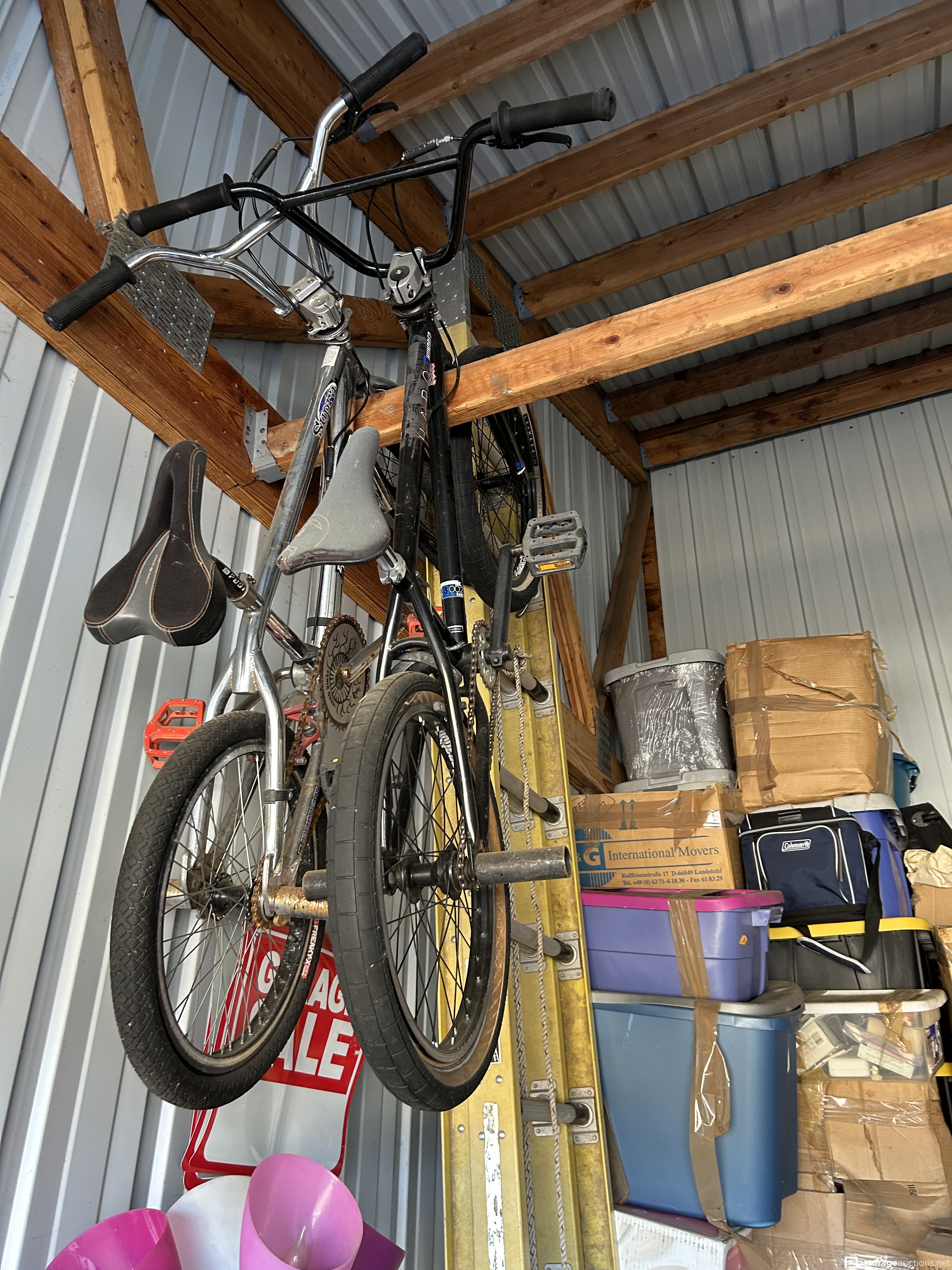This unit appears to contain Stereo system, cots, fiberglass extension ladder, aluminum ladder, tool shelf, tools, air compressor, craftsman table saw with stand, wood armoire. Moving straps, motorcycle bag, drum set, boxes and tubs of unknown