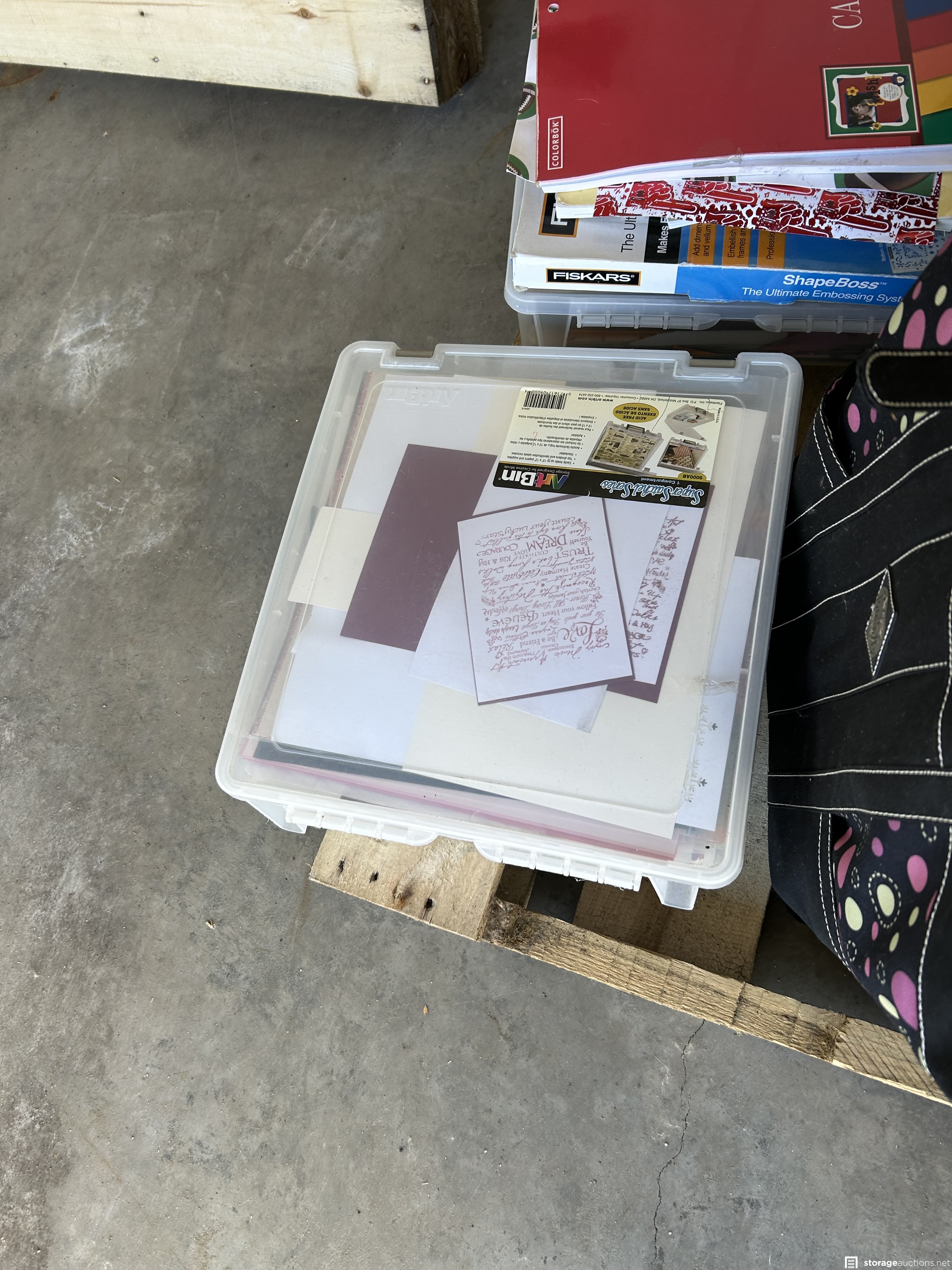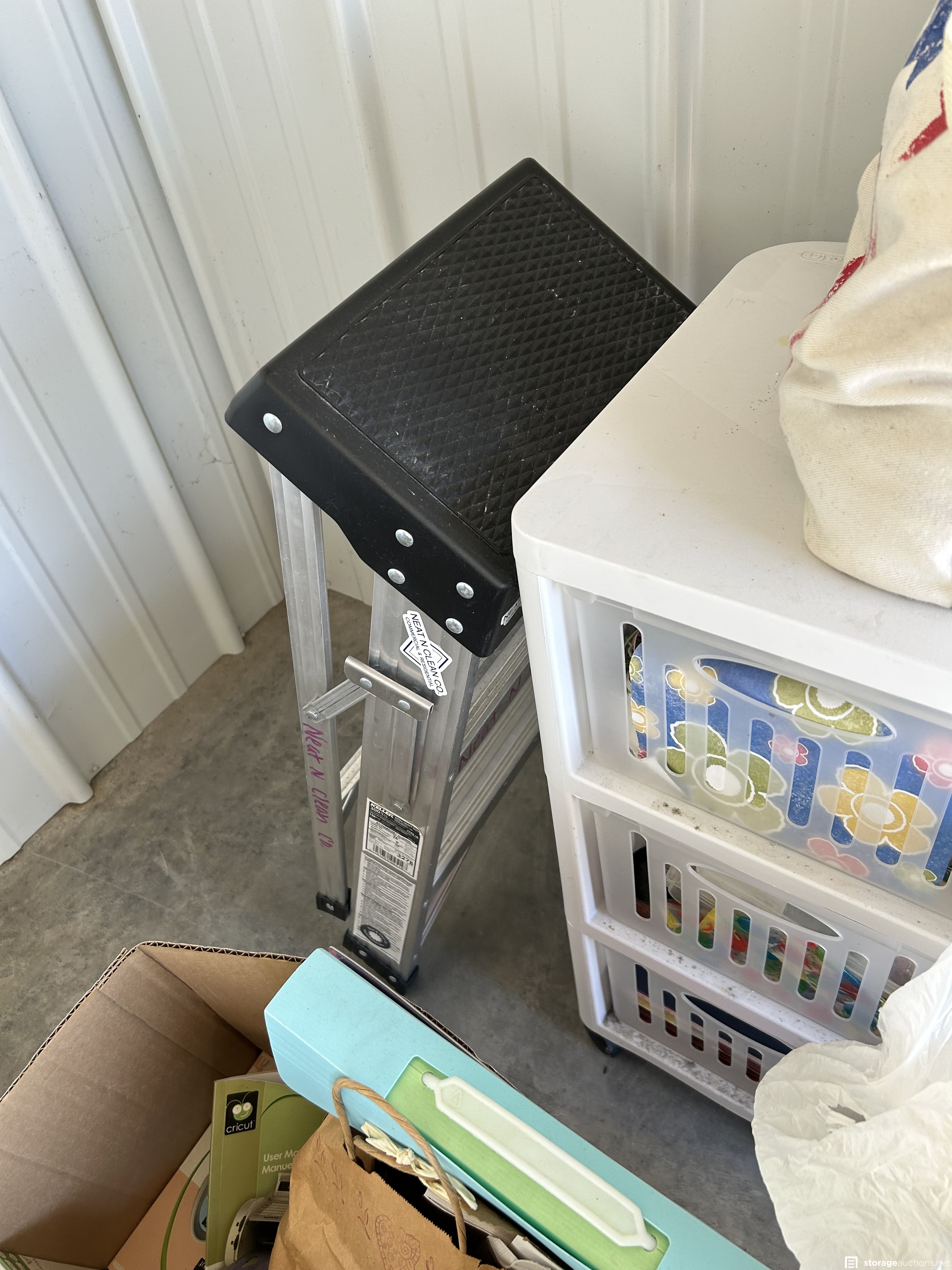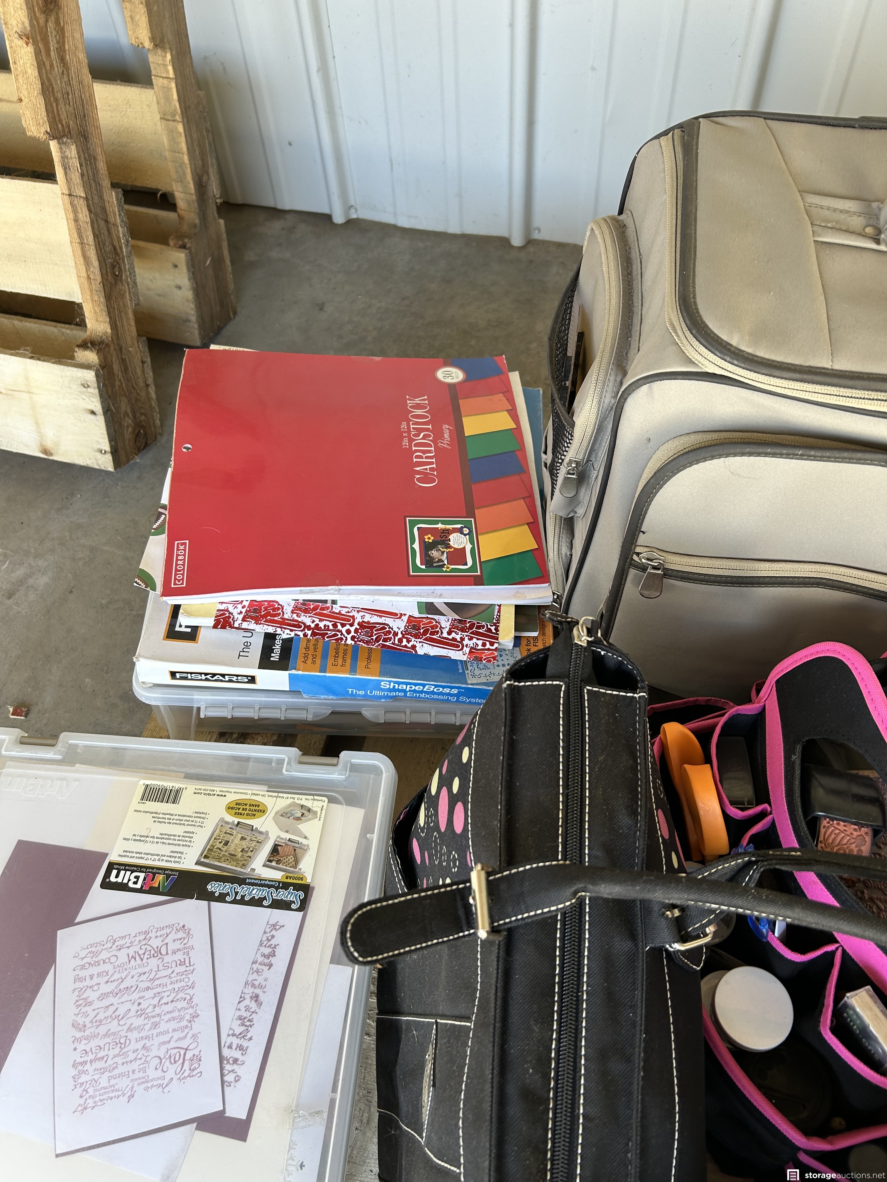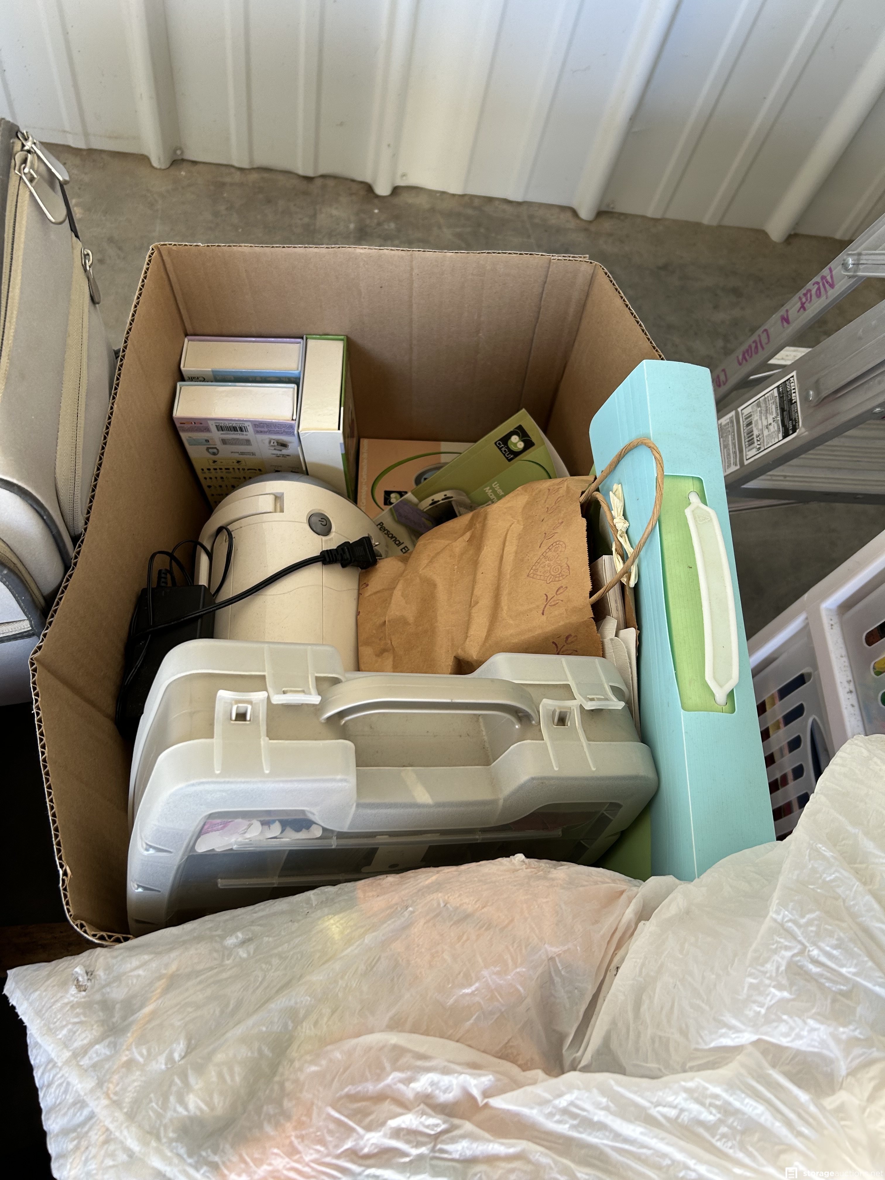 This unit appears to contain Scrapbook supplies, Cricut machine with cartridges, scrapbook bags. Stamps, scissors, bins, step ladder, craft supplies, kids beach toys