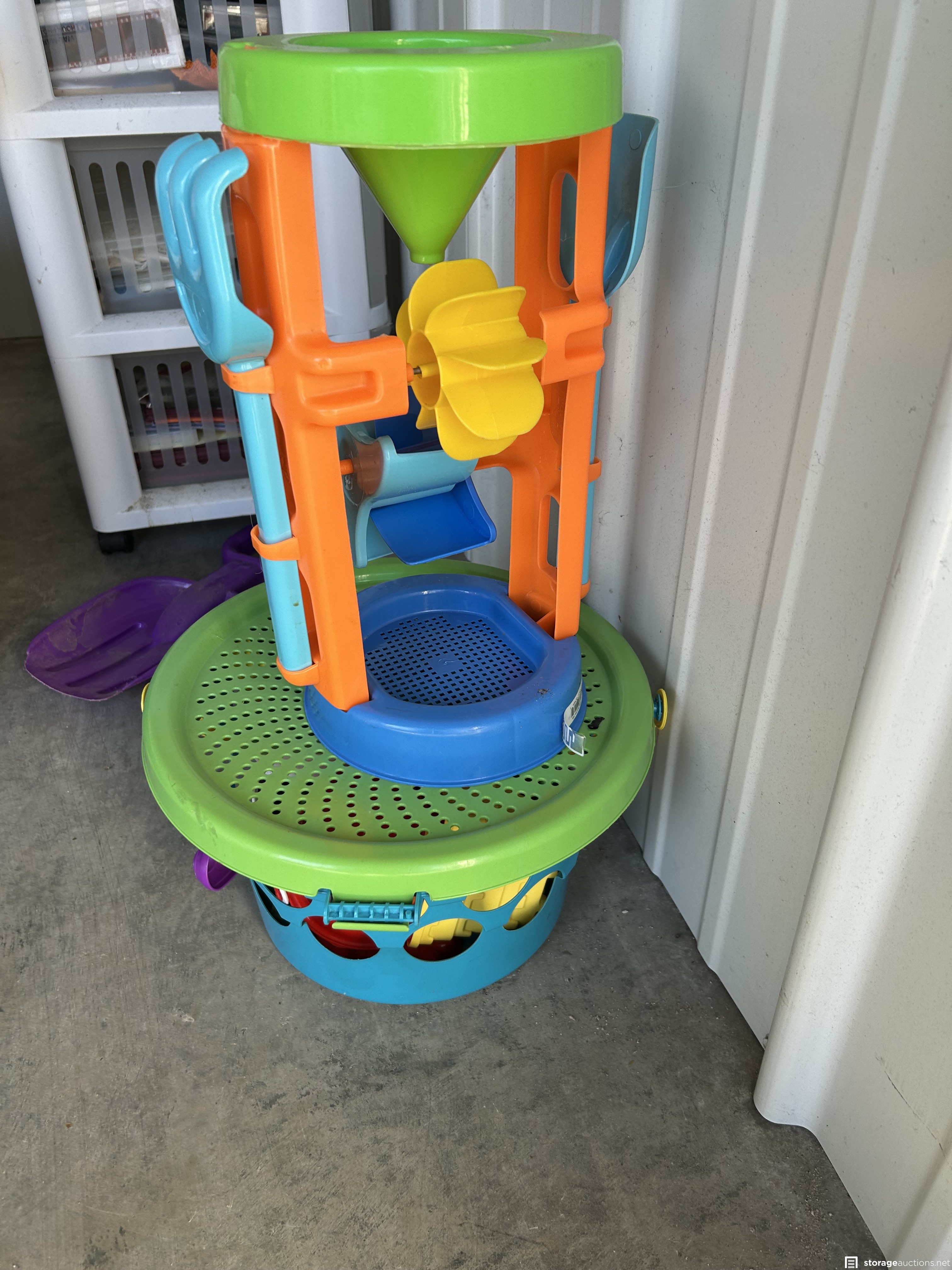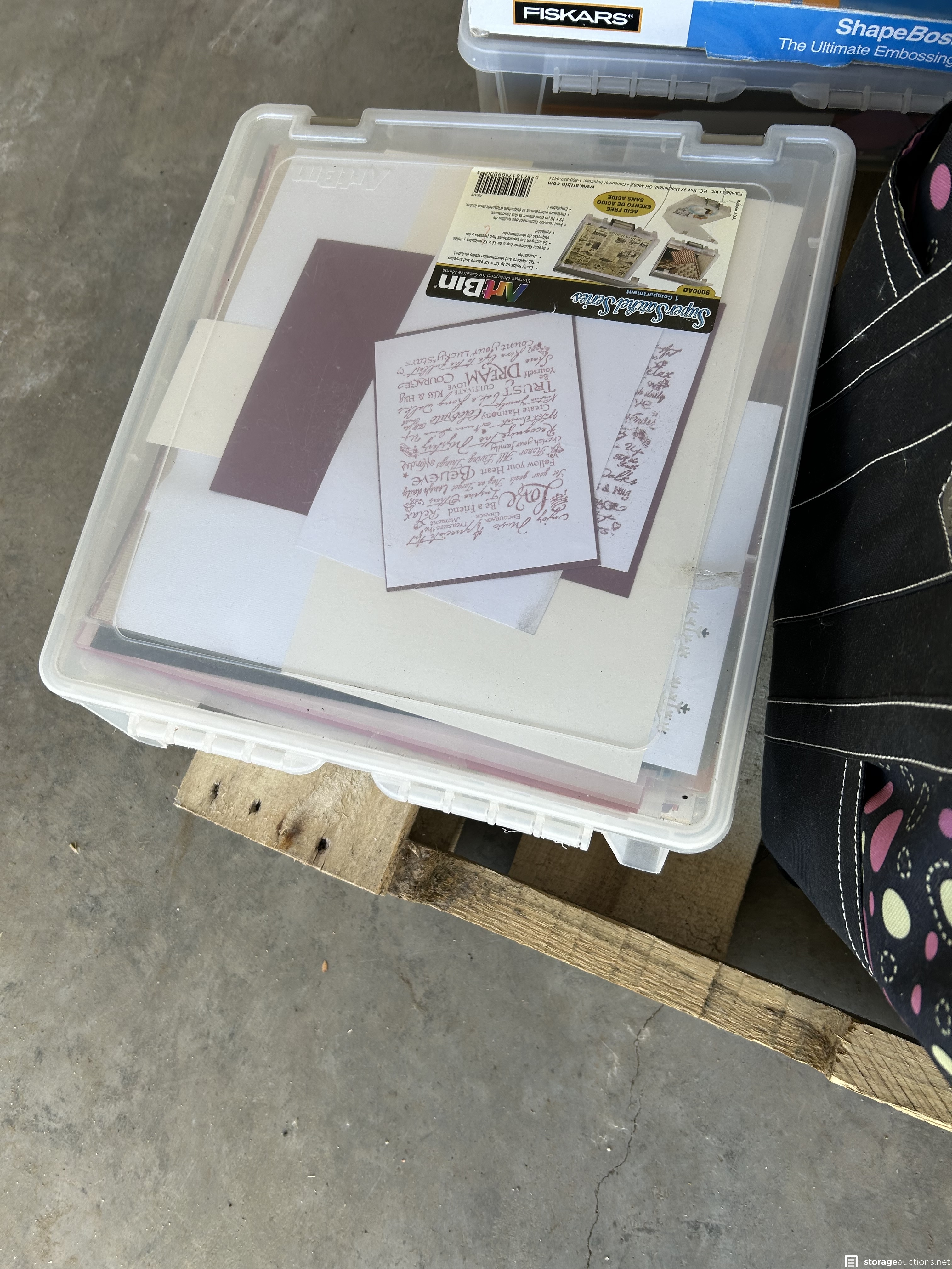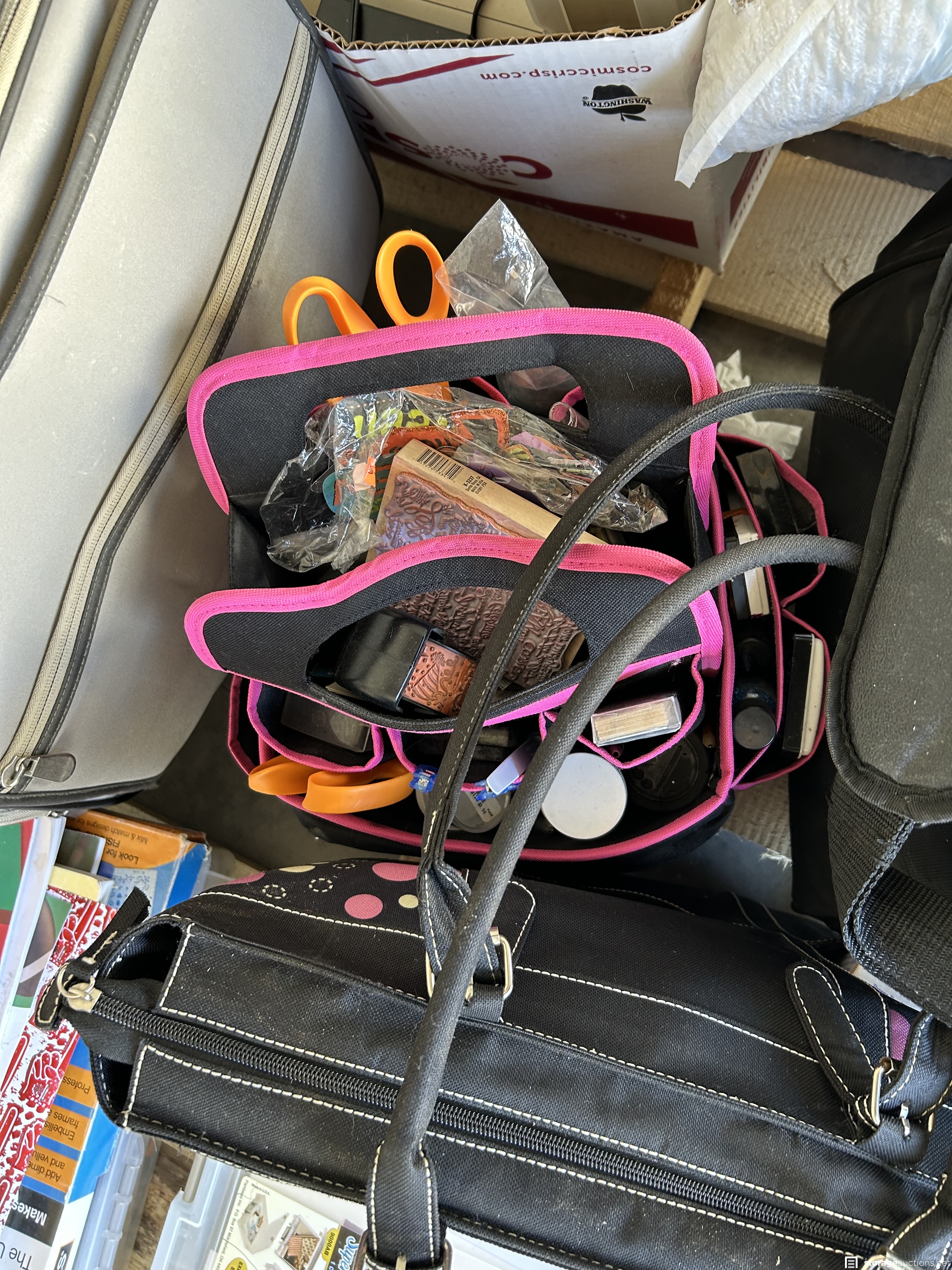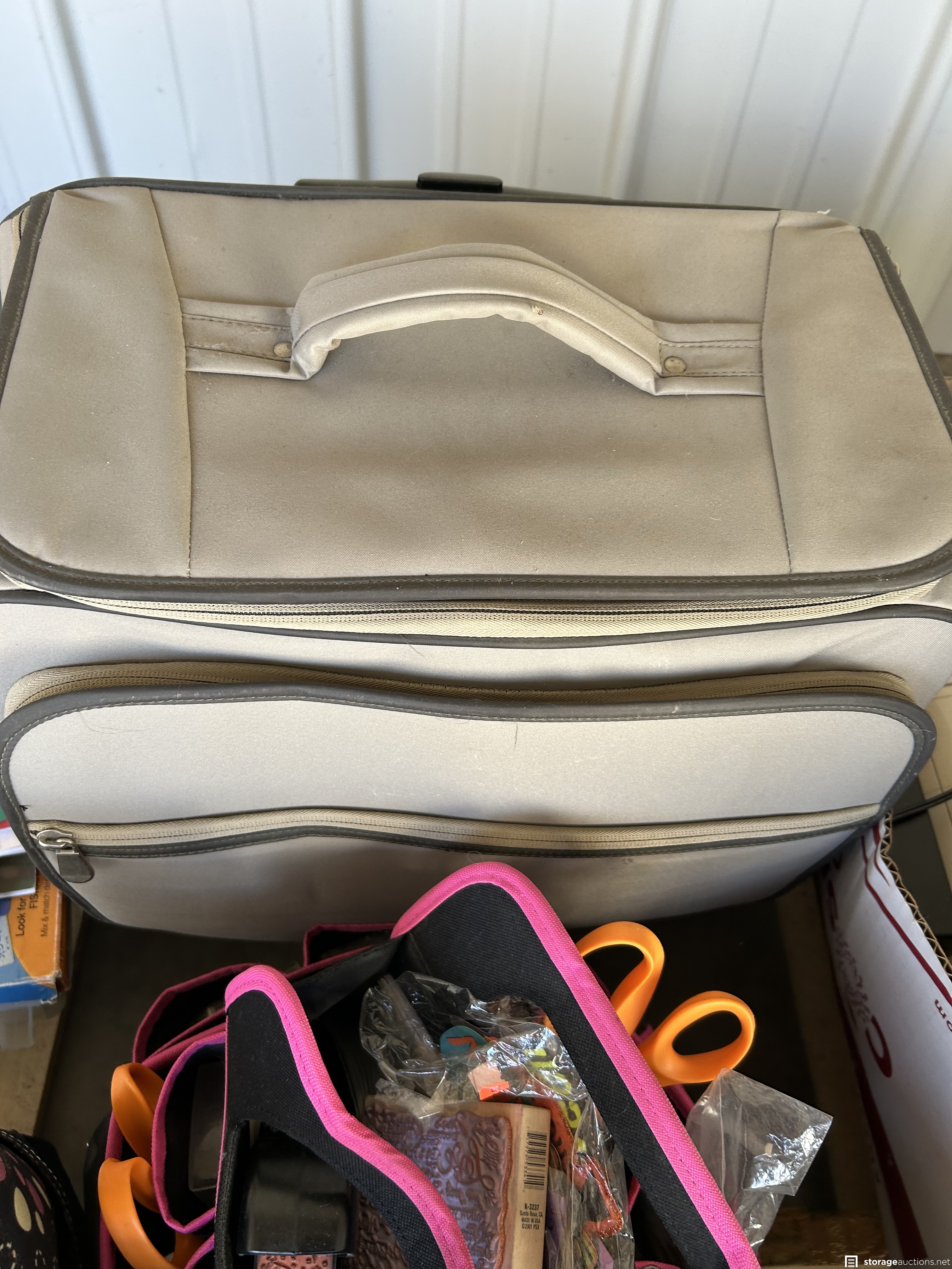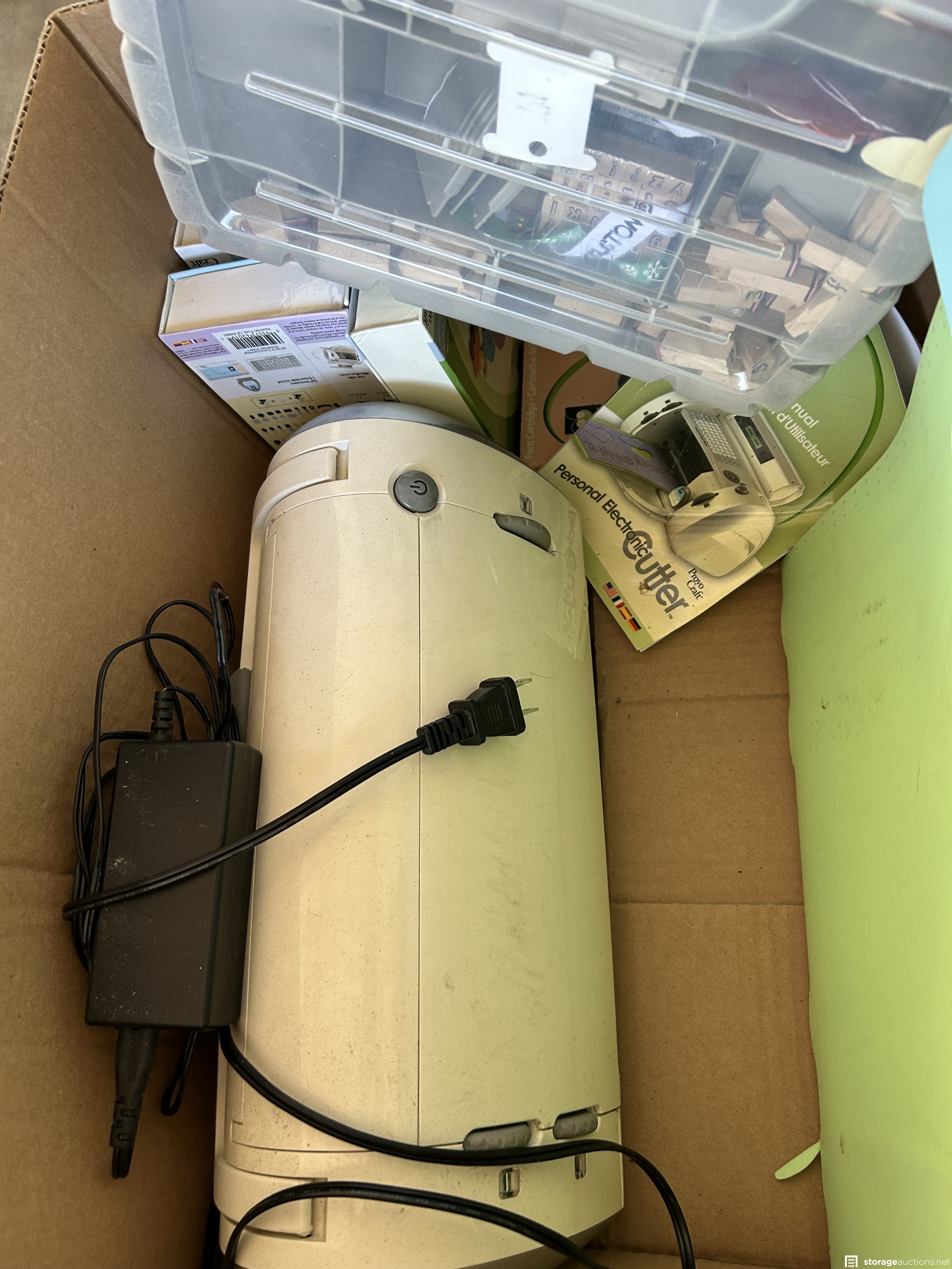 This unit appears to contain Scrapbook supplies, Cricut machine with cartridges, scrapbook bags. Stamps, scissors, bins, step ladder, craft supplies, kids beach toys