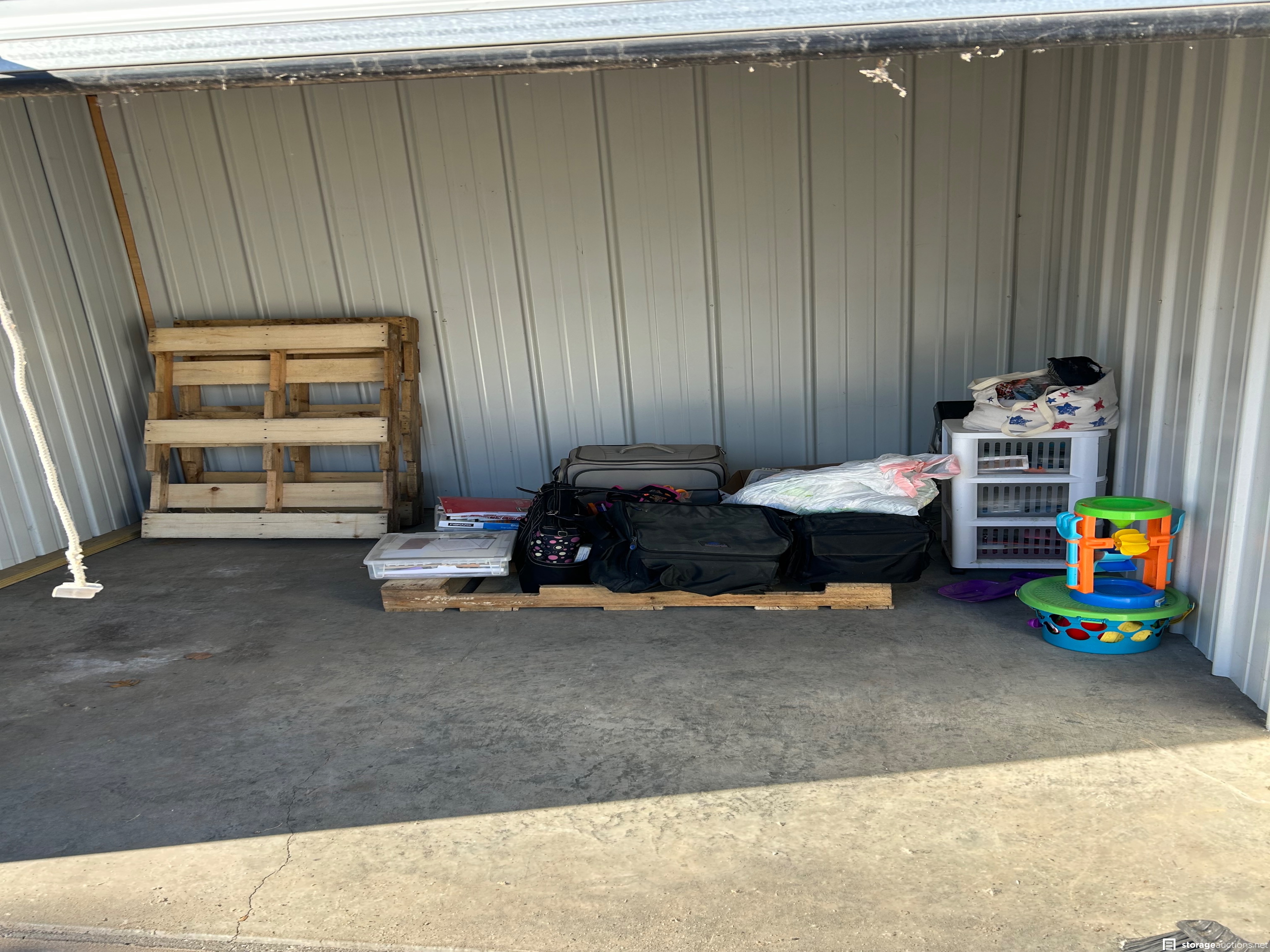 Additional Terms: Please call when auction closes to make payment. $100 deposit will be returned when unit is clean and empty. Complete Clean out within 24 hours of auction. Pallets belong to the facility and can be left inside the unit.