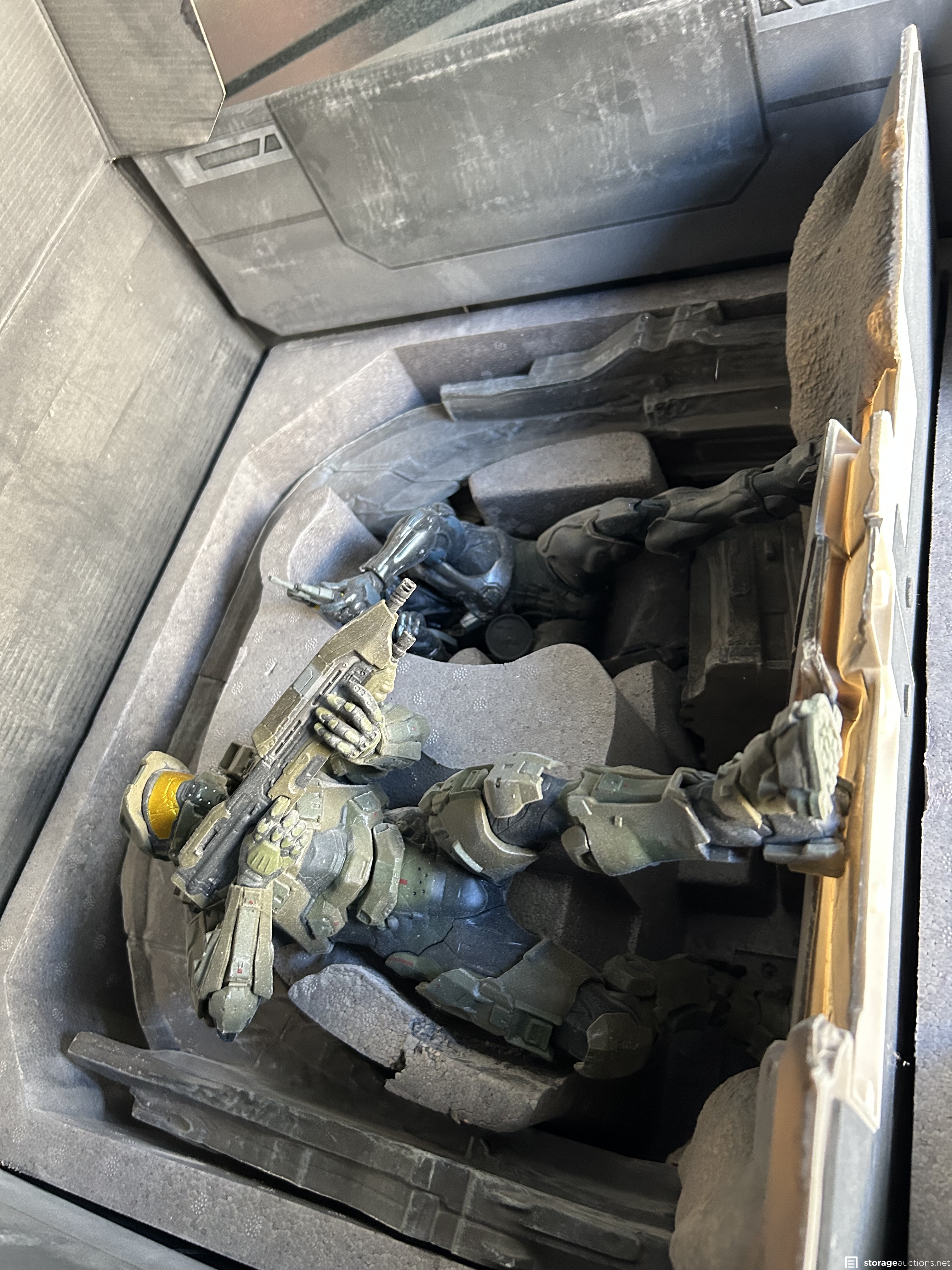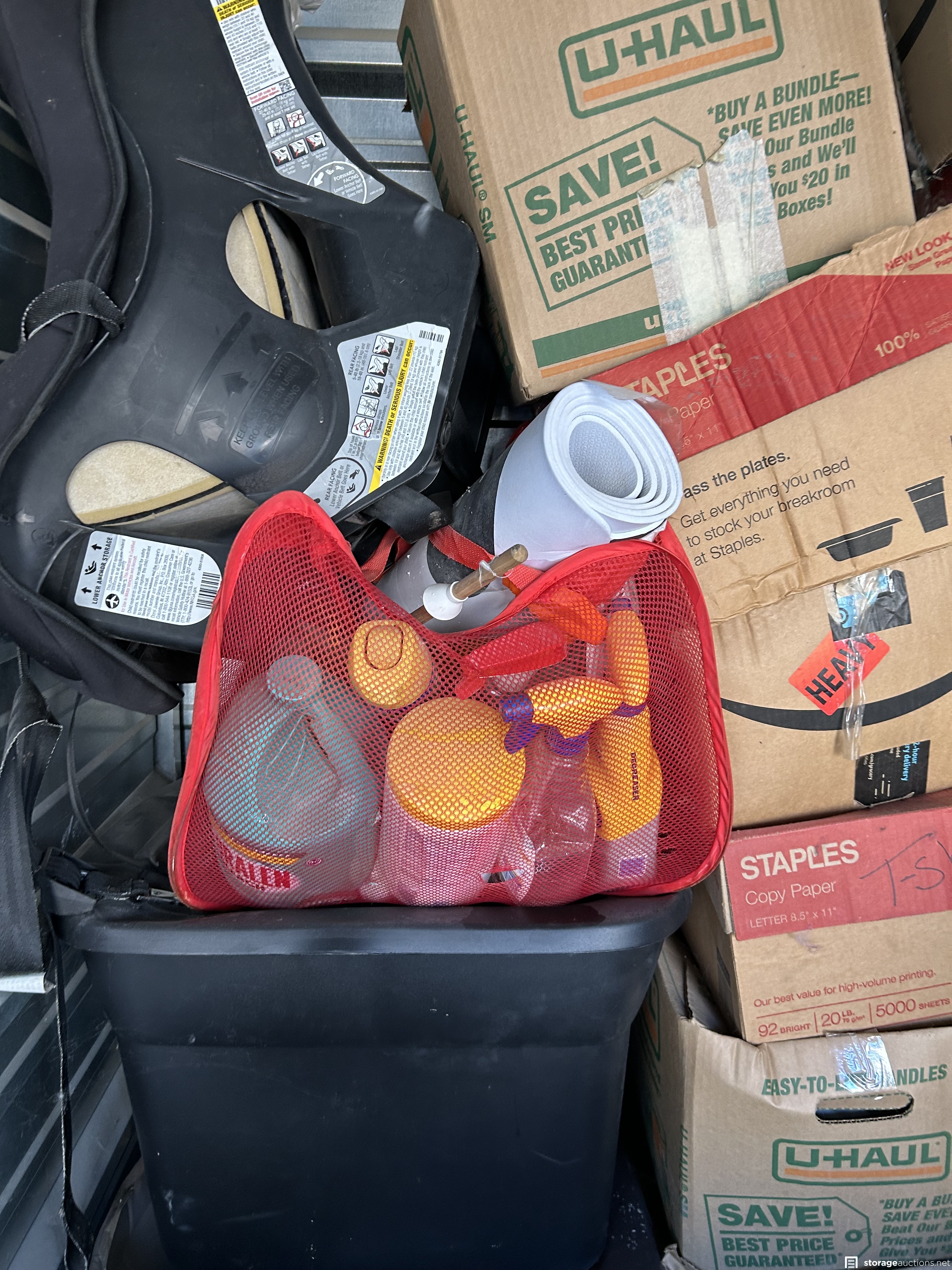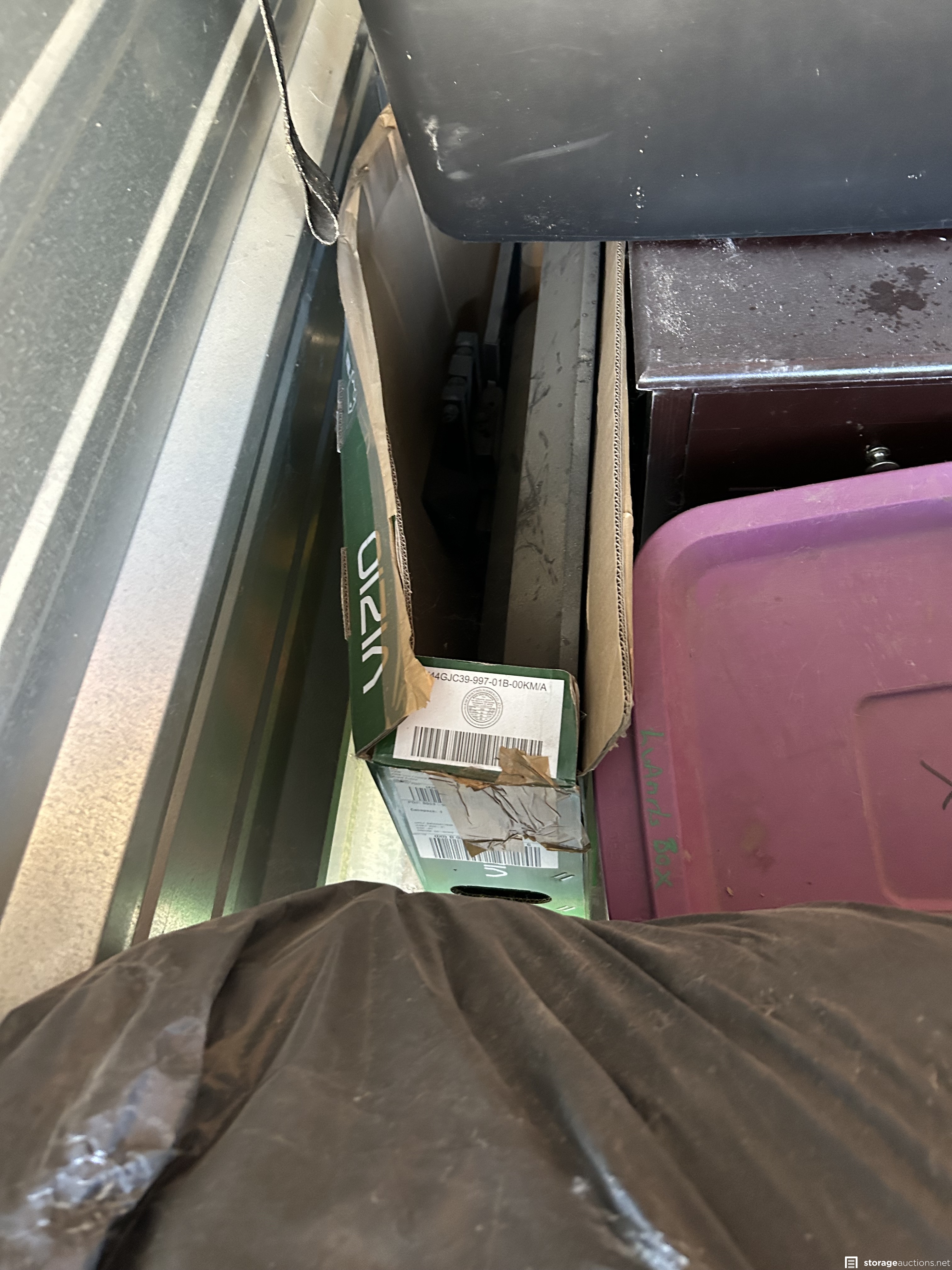 This unit appears to contain Linsc Action figures, Vizio TV, books, cleaning supplies, clothing, boxes of unknown