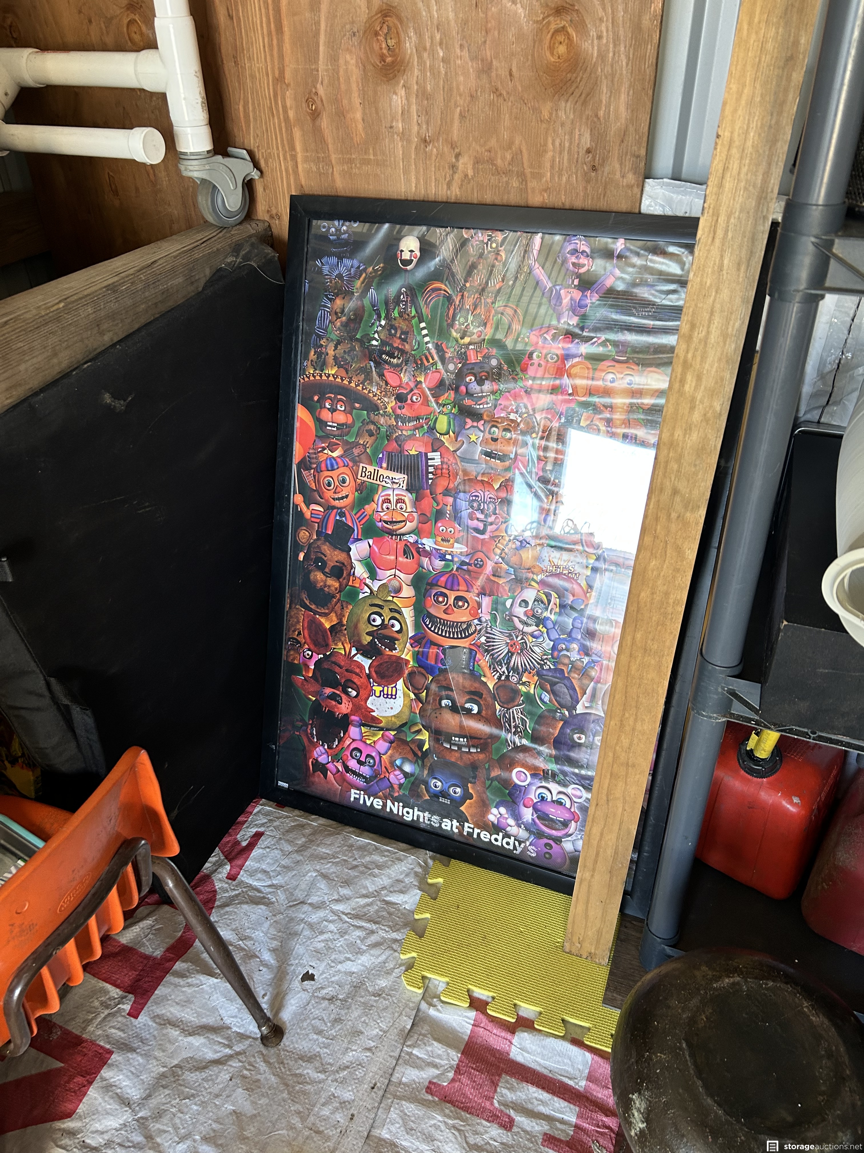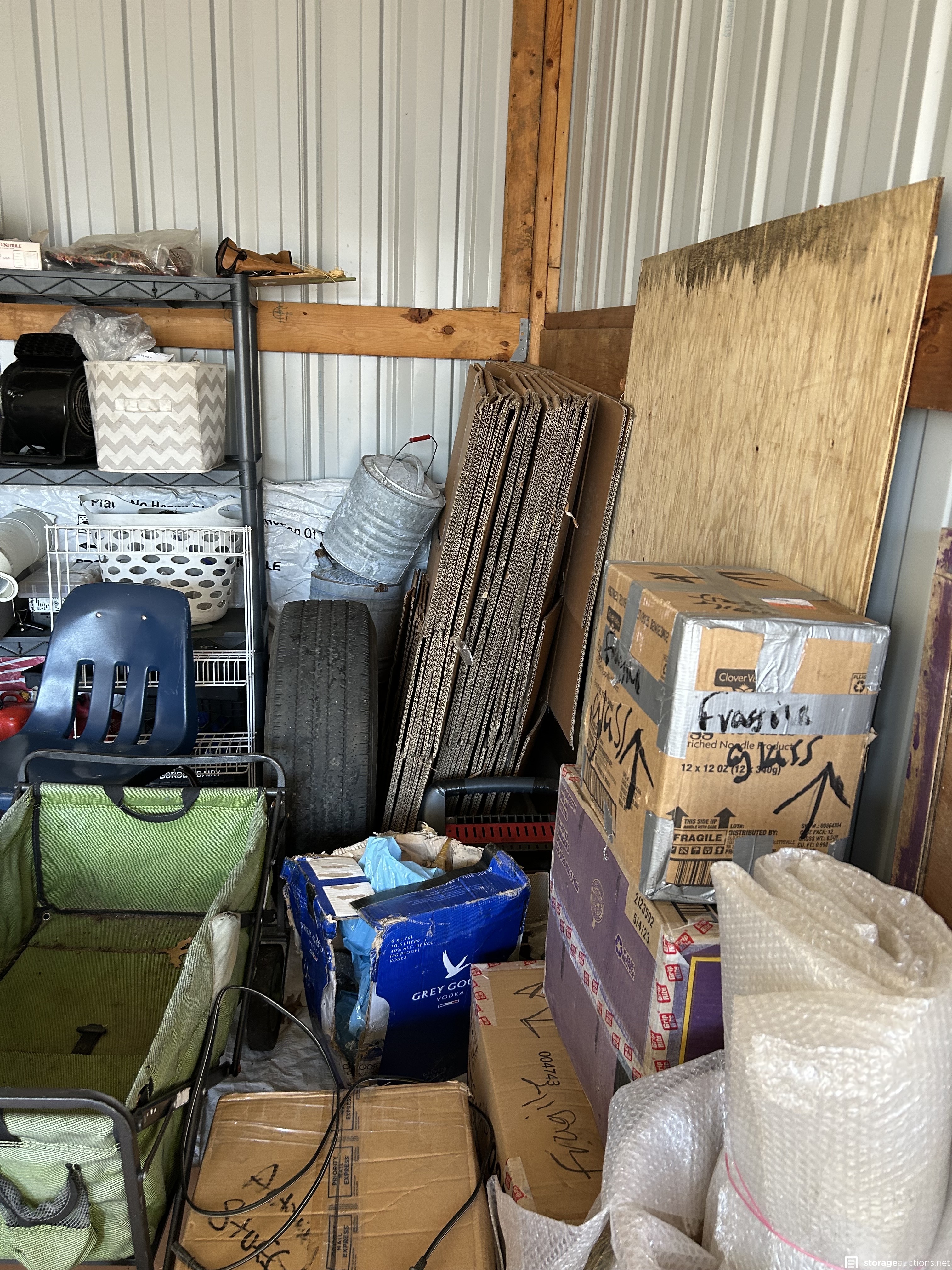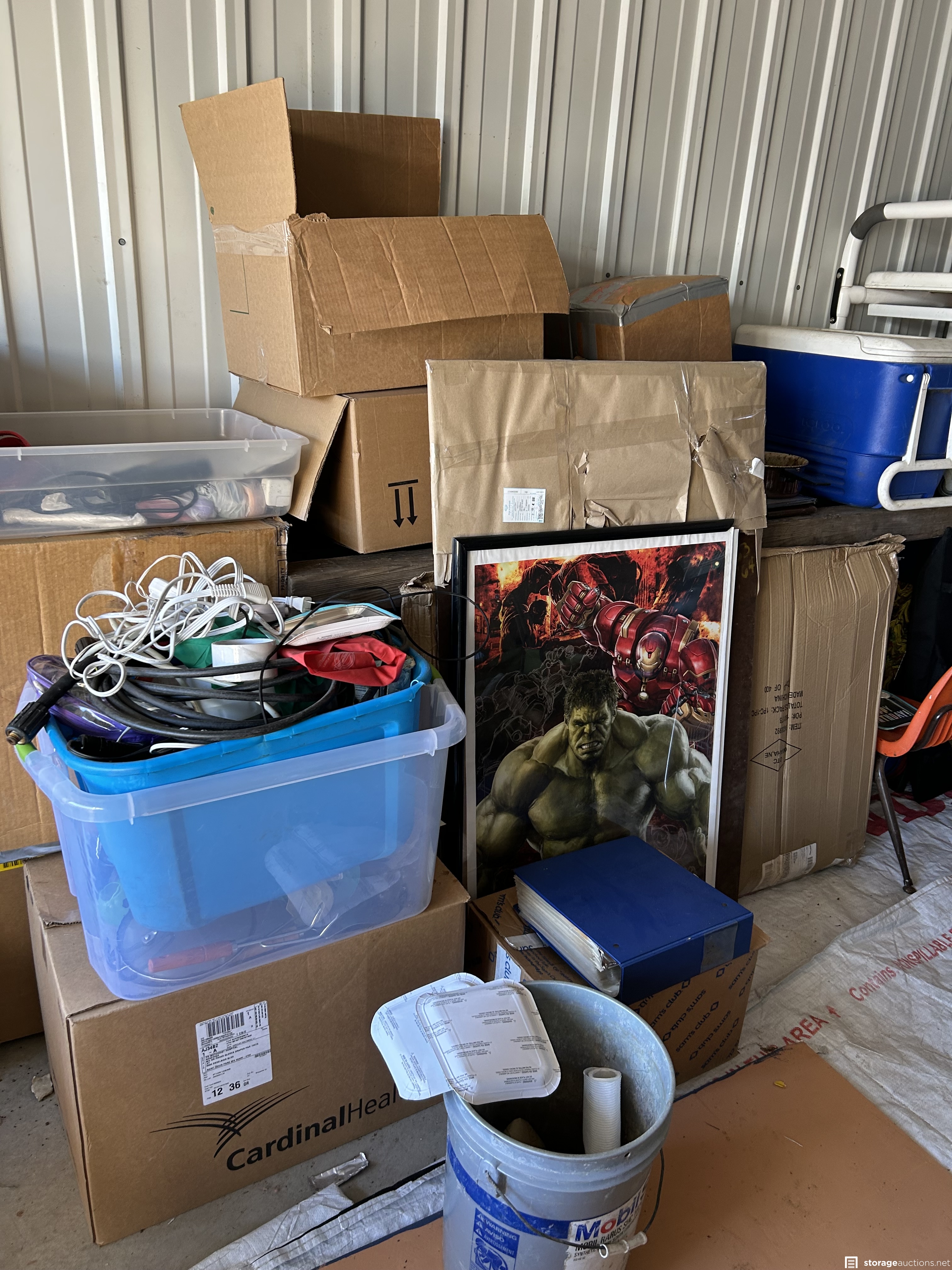This unit appears to contain Gymnastics Matt, Elite carpet cleaner, 2 under bed drawer, posters, plastic shelf, pool chair, boxes, watering can, decor, and more