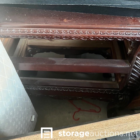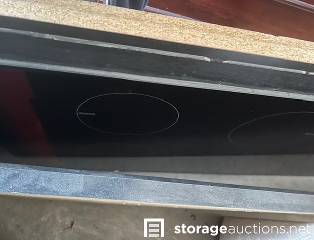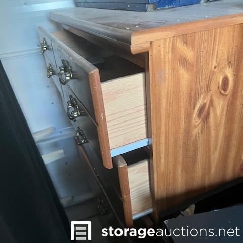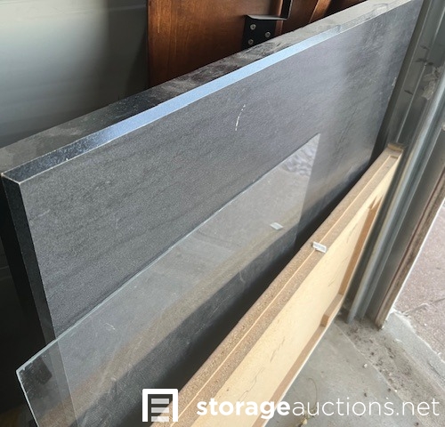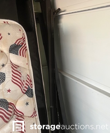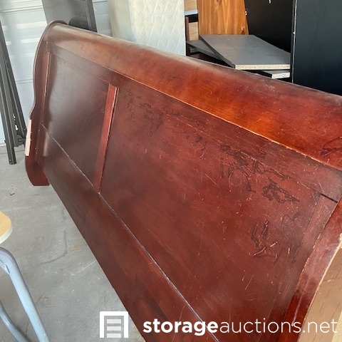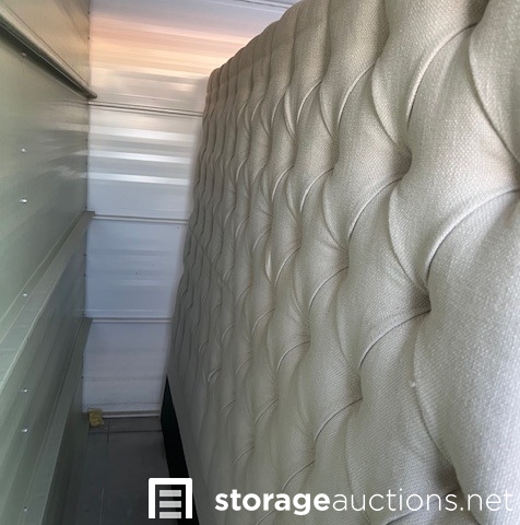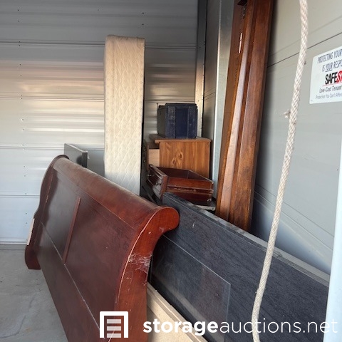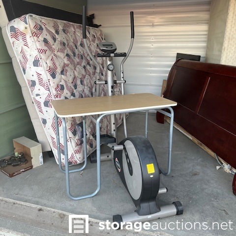 This unit has a nice fabric headboard for a bed, dresser, night stand, 2 long counter tops one has a inset glass top range. 2 bed frames one is metal and the other is wood. Also has 1 piece of exercise equipment.