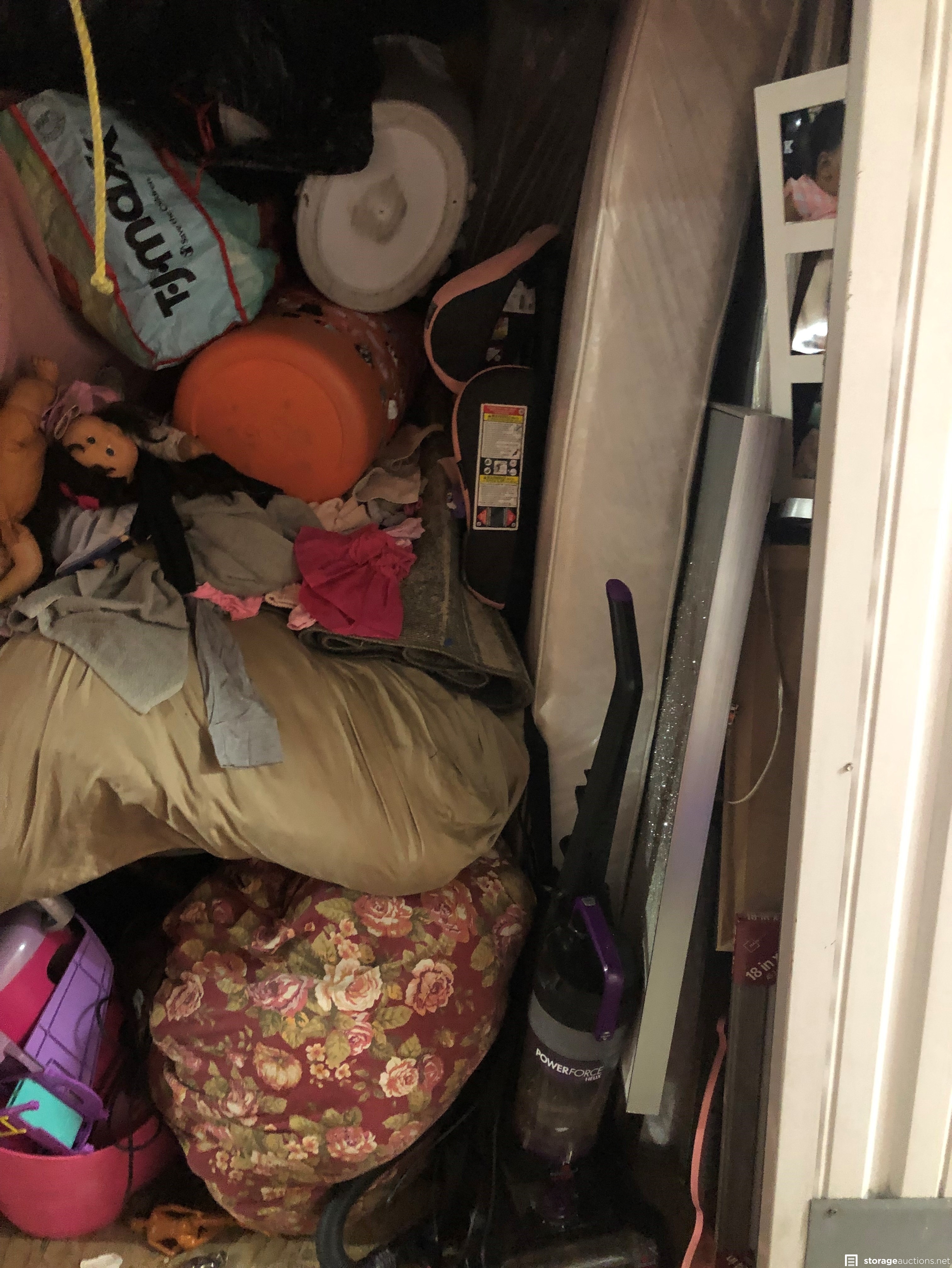 UNIT APPEARS TO CONTAIN: Vacuum, Mattress, Artwork, Rug, Lots of containers, Largely obstructed view