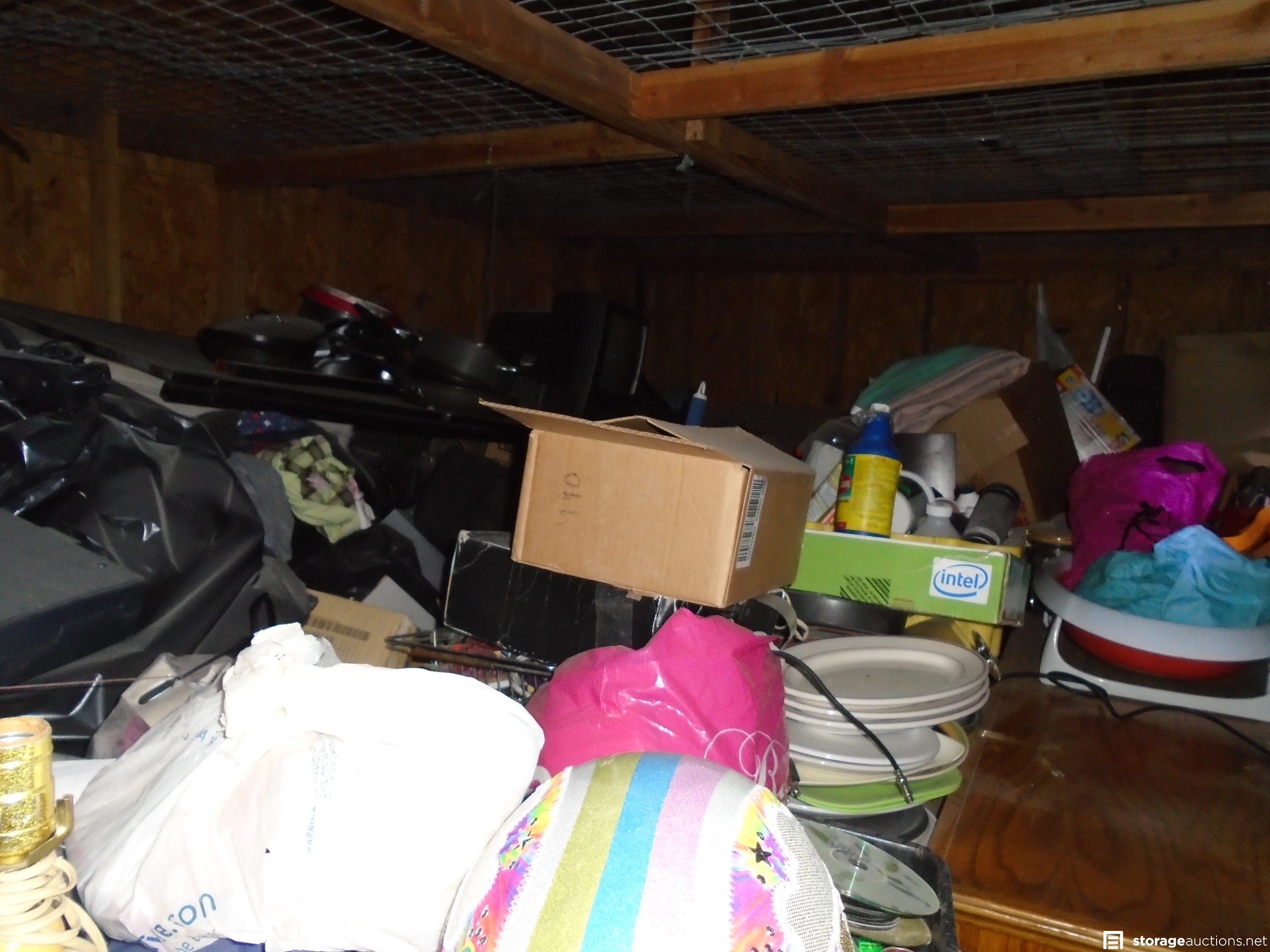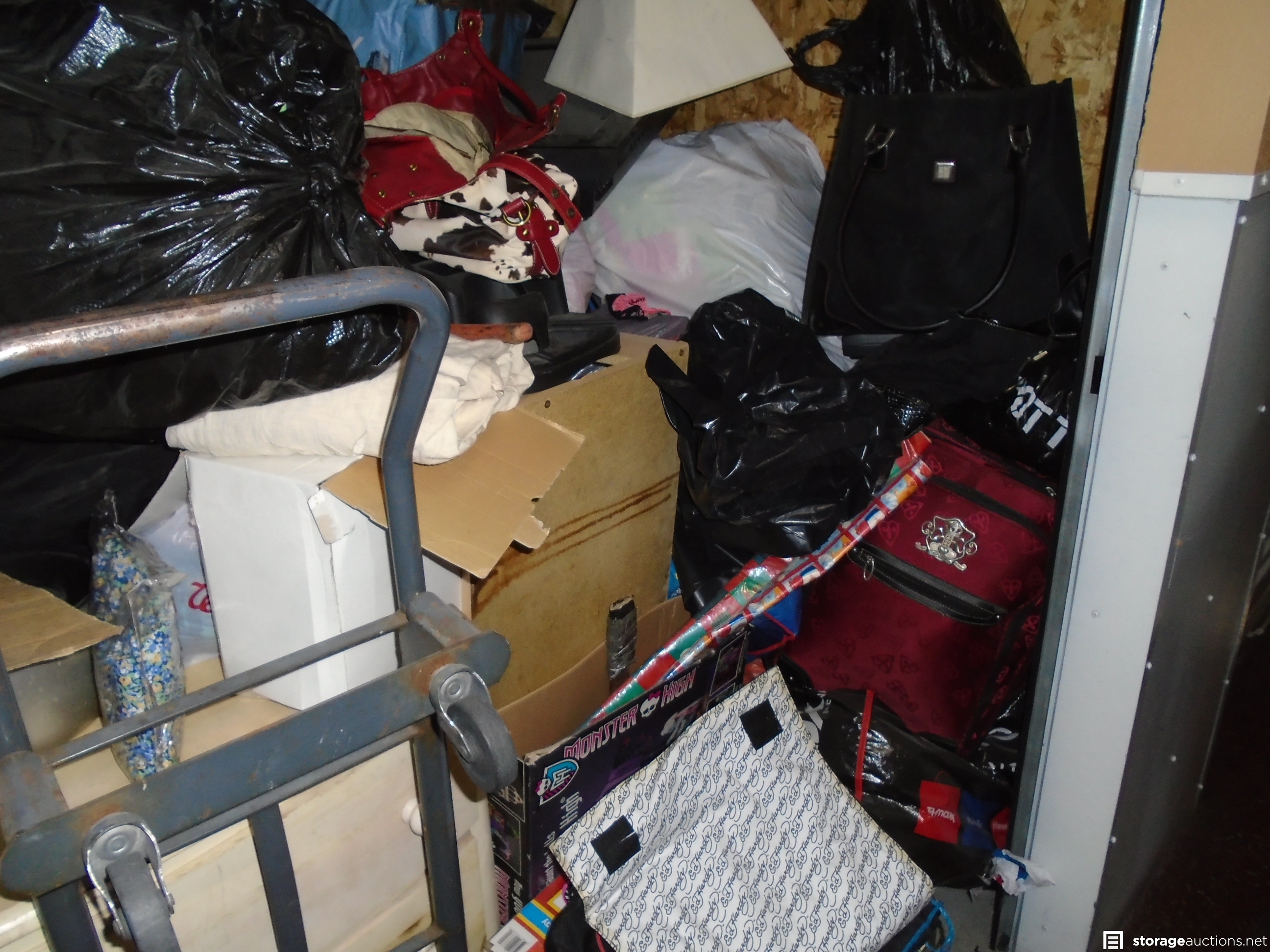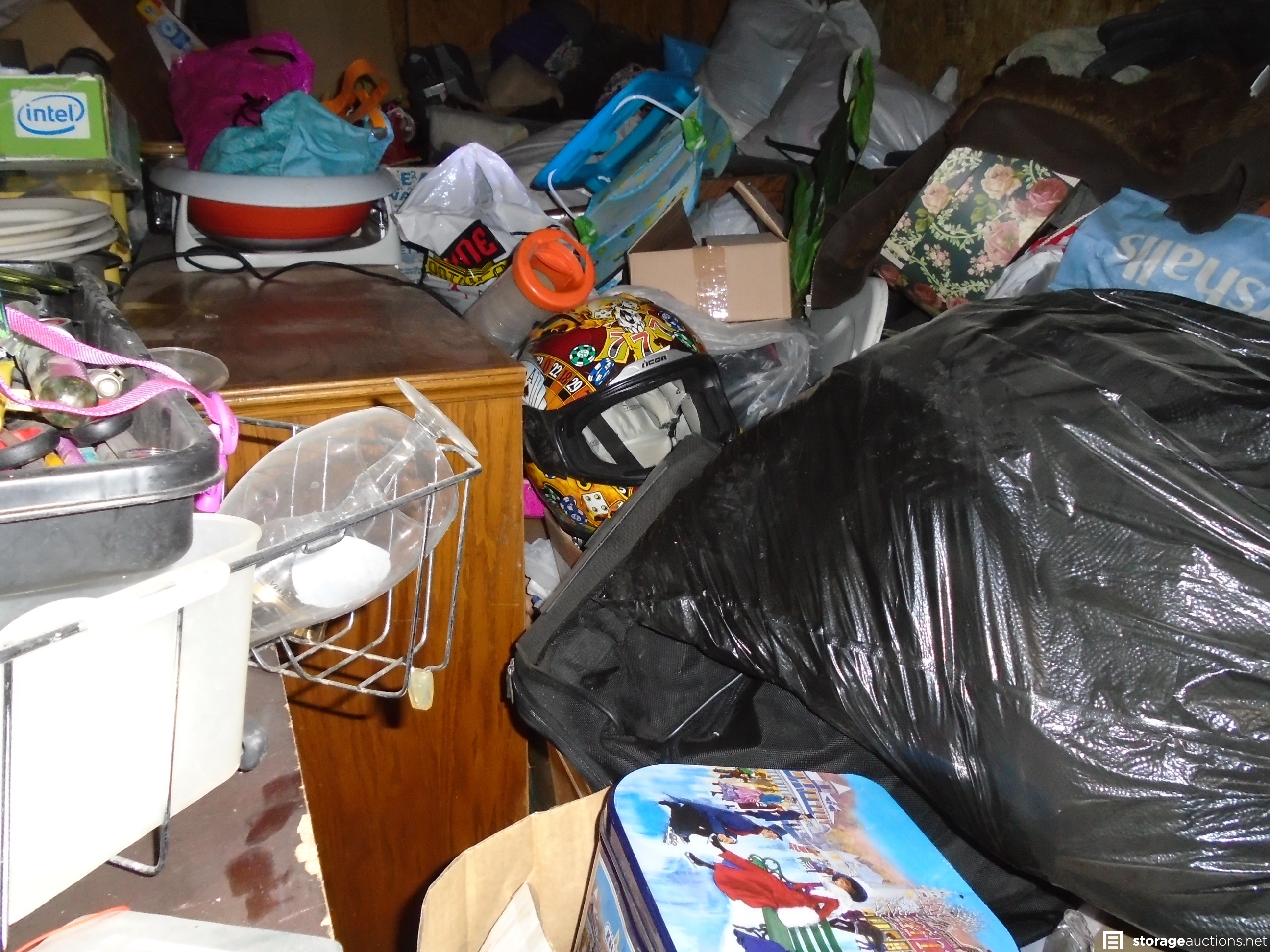 Unit appears to contain dressers, bags, boxes, grinder, dishes, pots & pans, TVs, night stand. Very obstructed view.