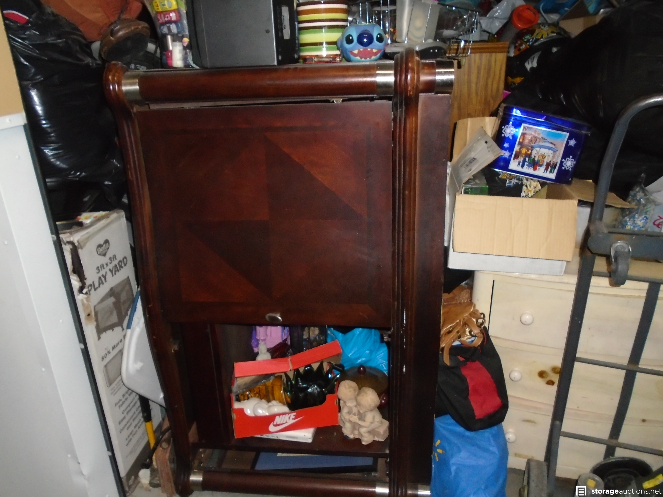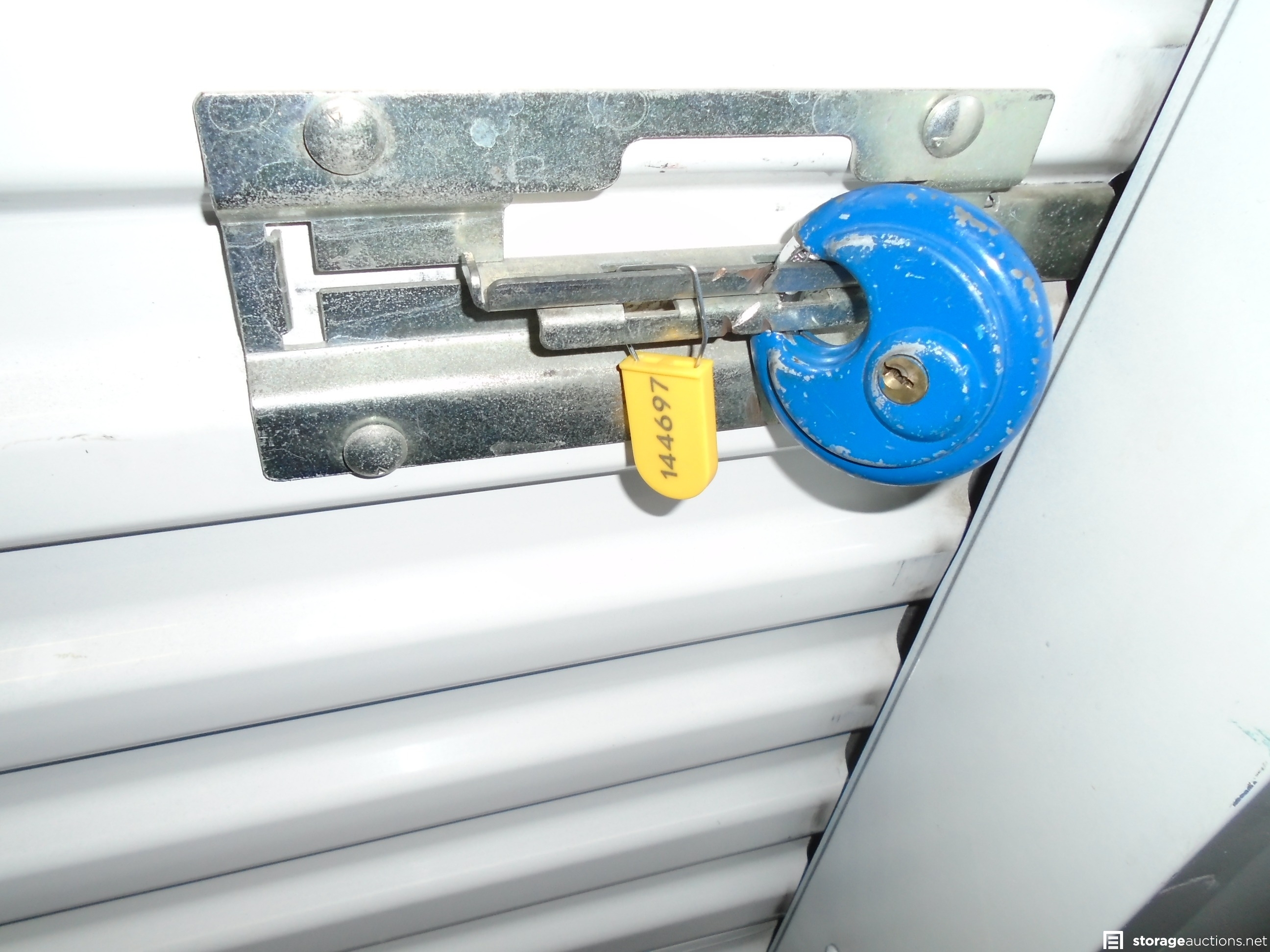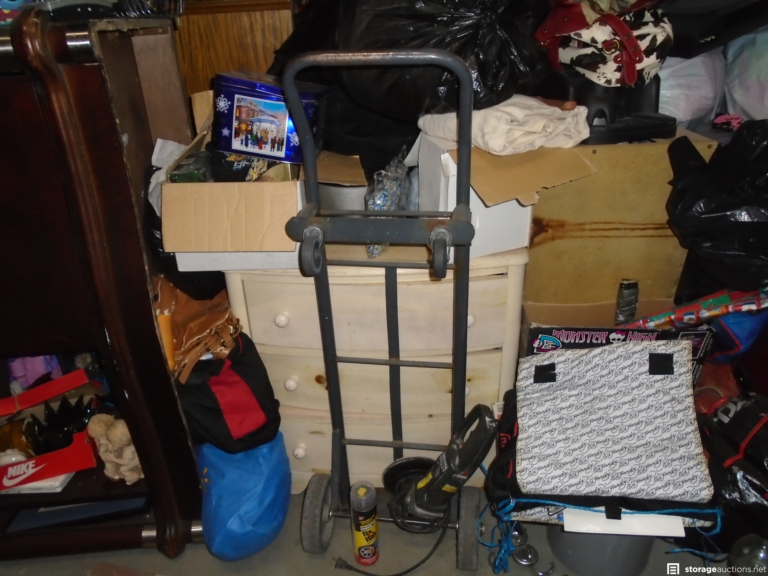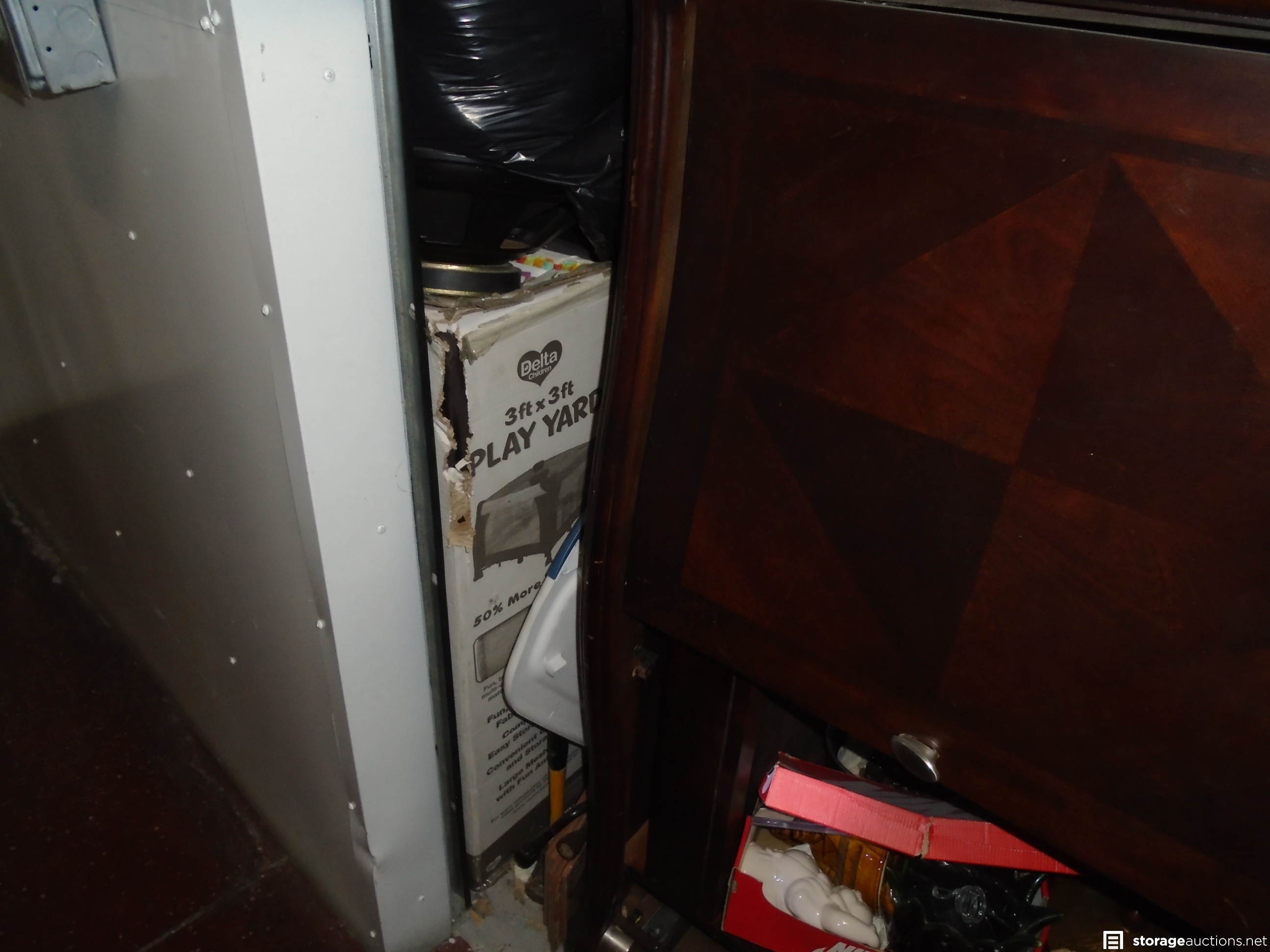 Unit appears to contain dressers, bags, boxes, grinder, dishes, pots & pans, TVs, night stand. Very obstructed view.