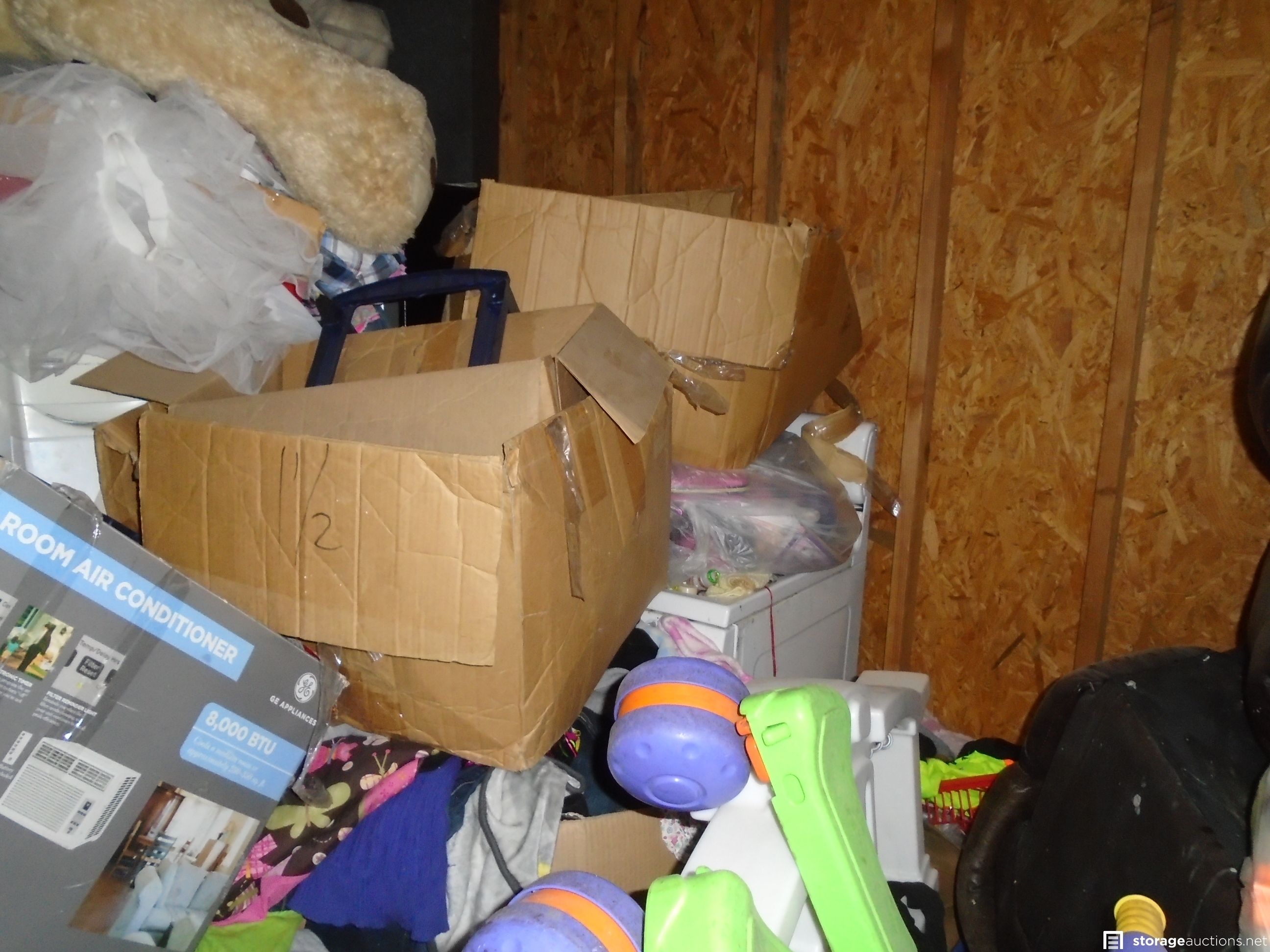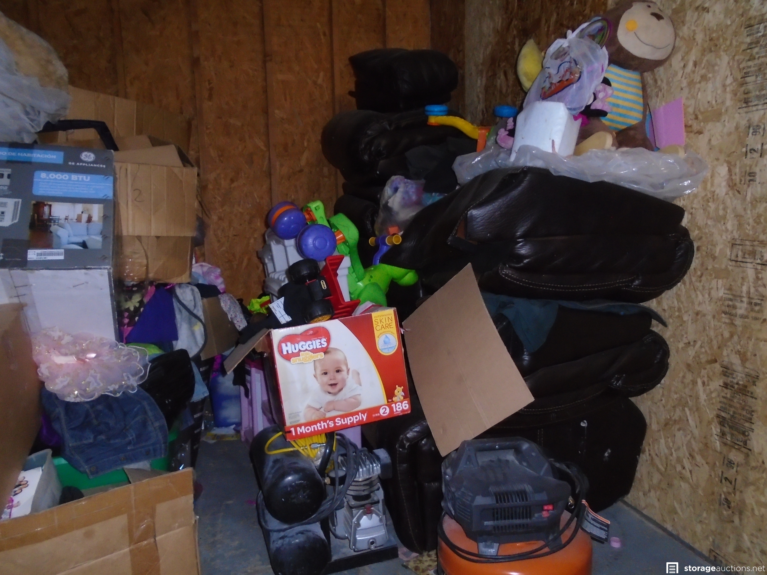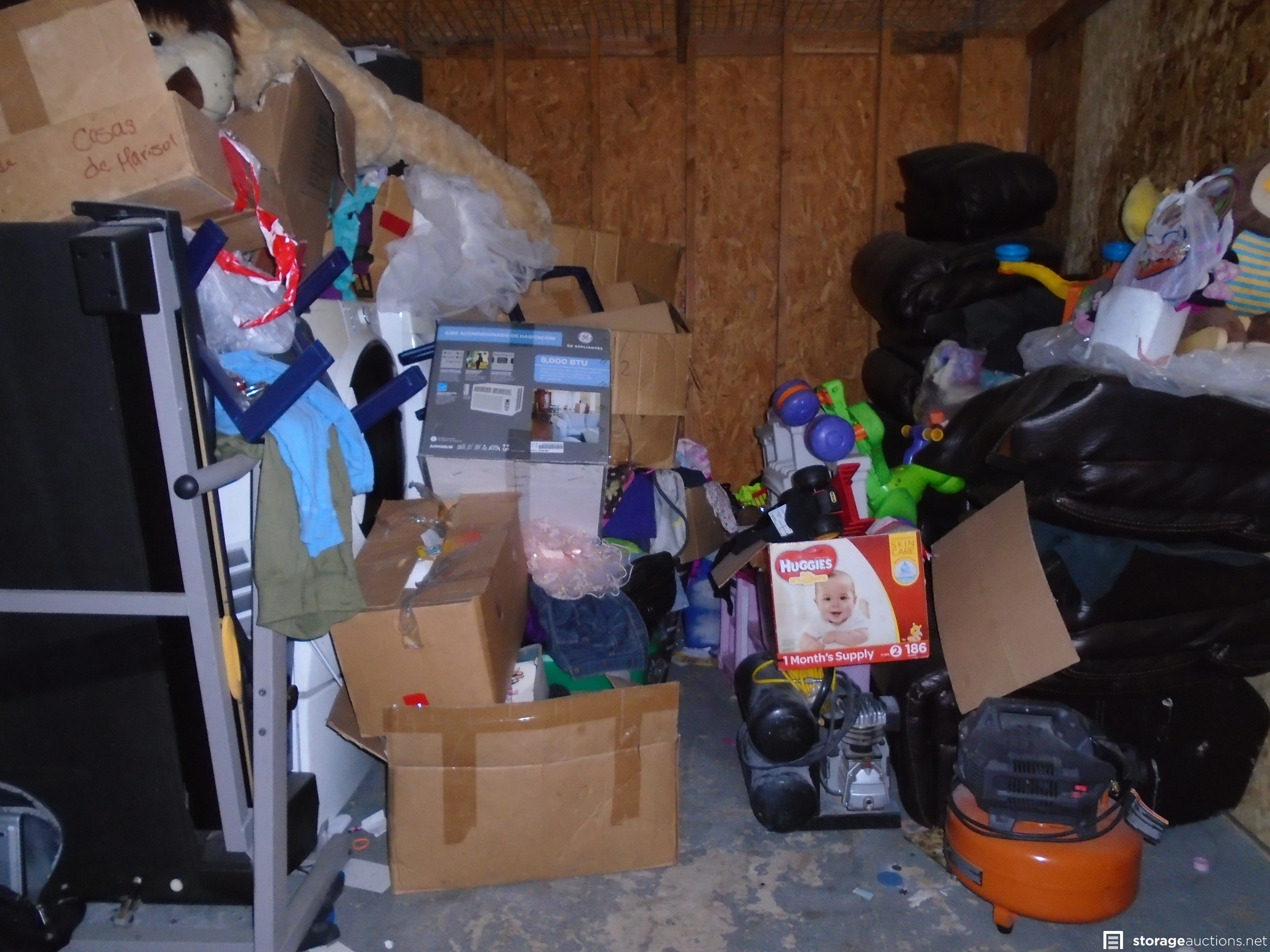 Unit appears to contain: Front Load Washer and Dryer ,boxes, toys, compressors, stove, speakers, tread Mill, sofa